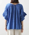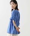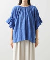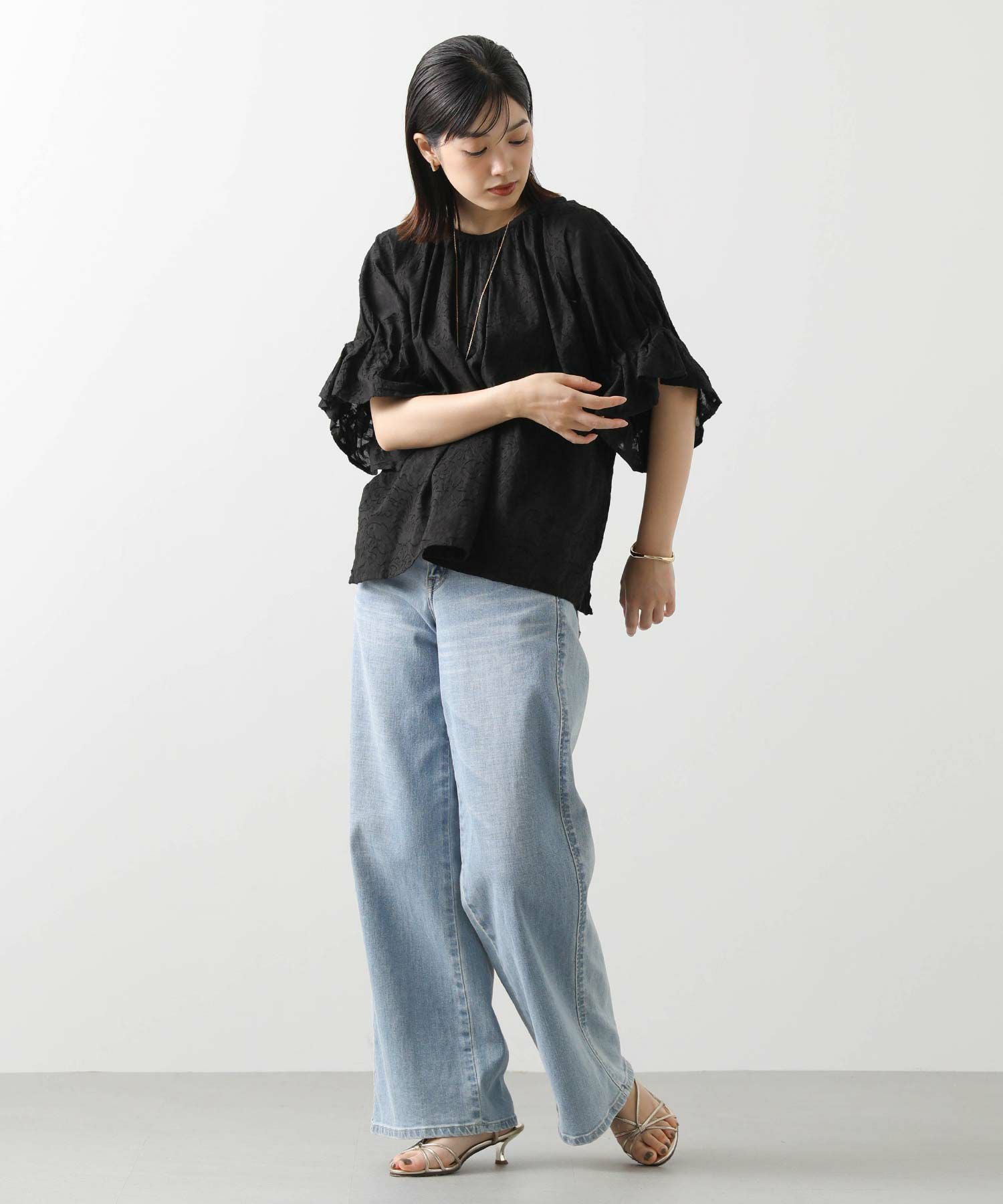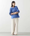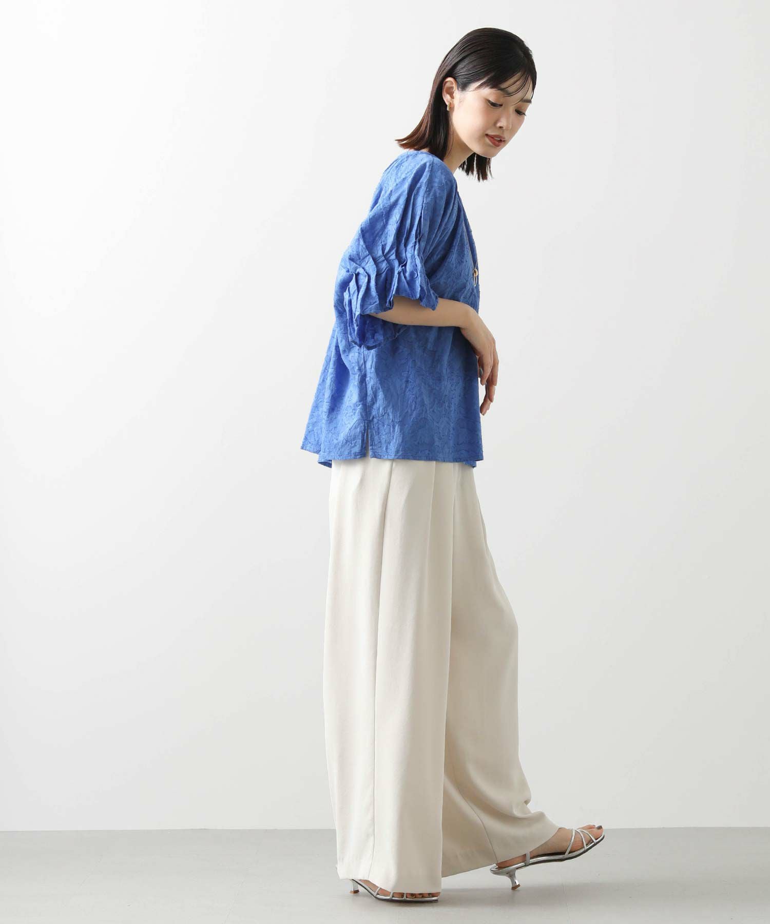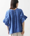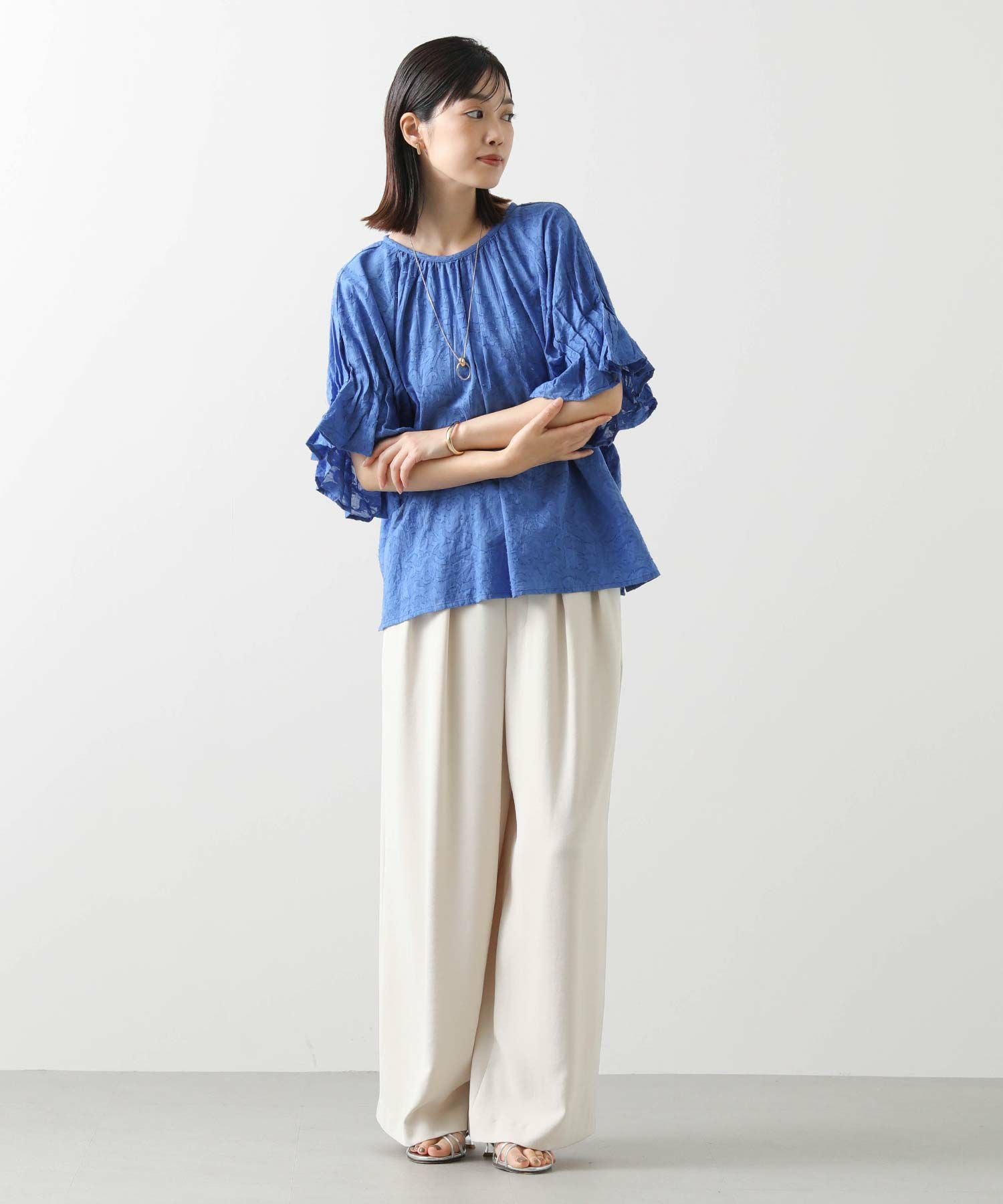 袖の内側にゴムを入れてギャザーをよせたデザイン、程よいボリューム感があり二の腕をカバーしてくれます。