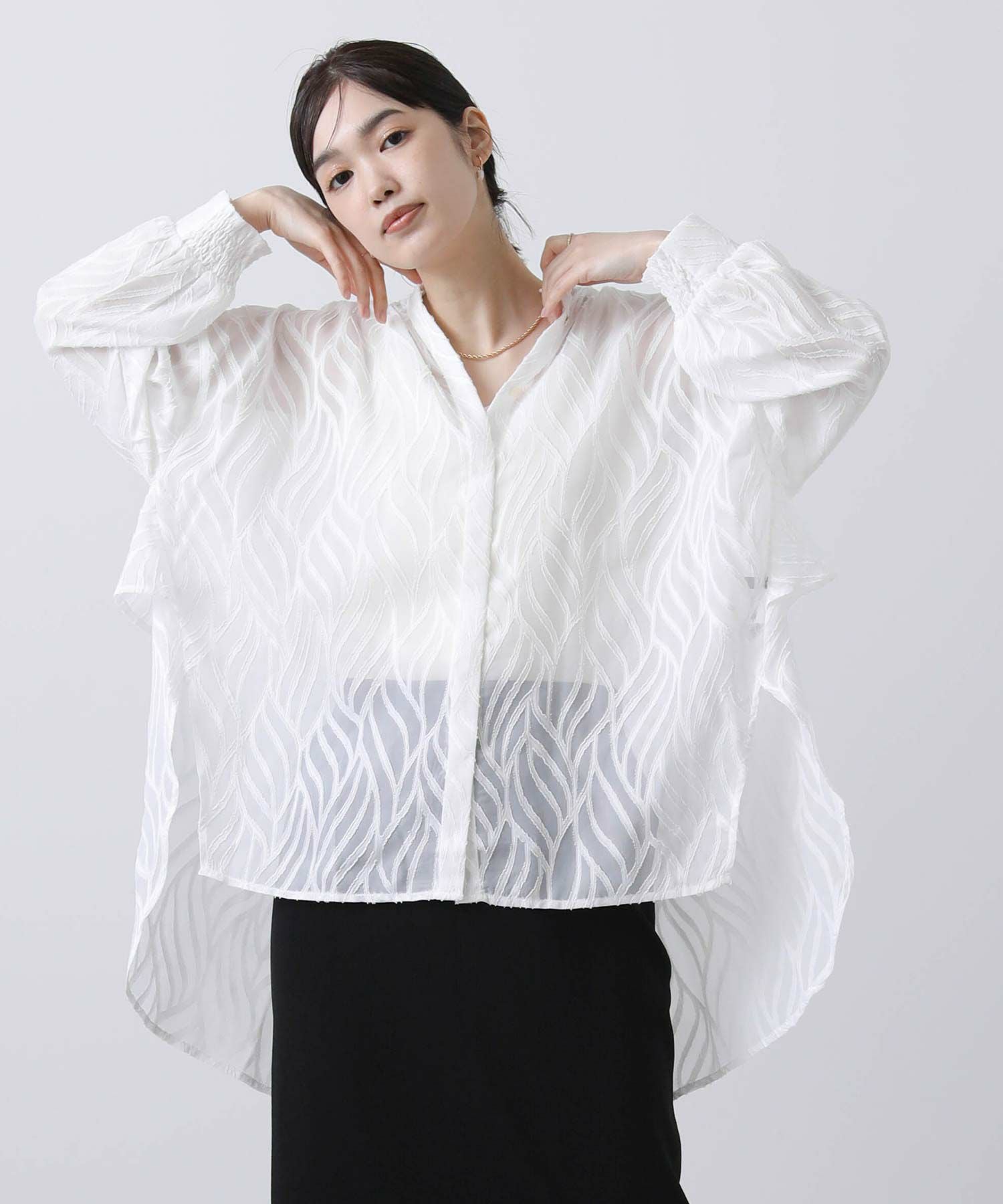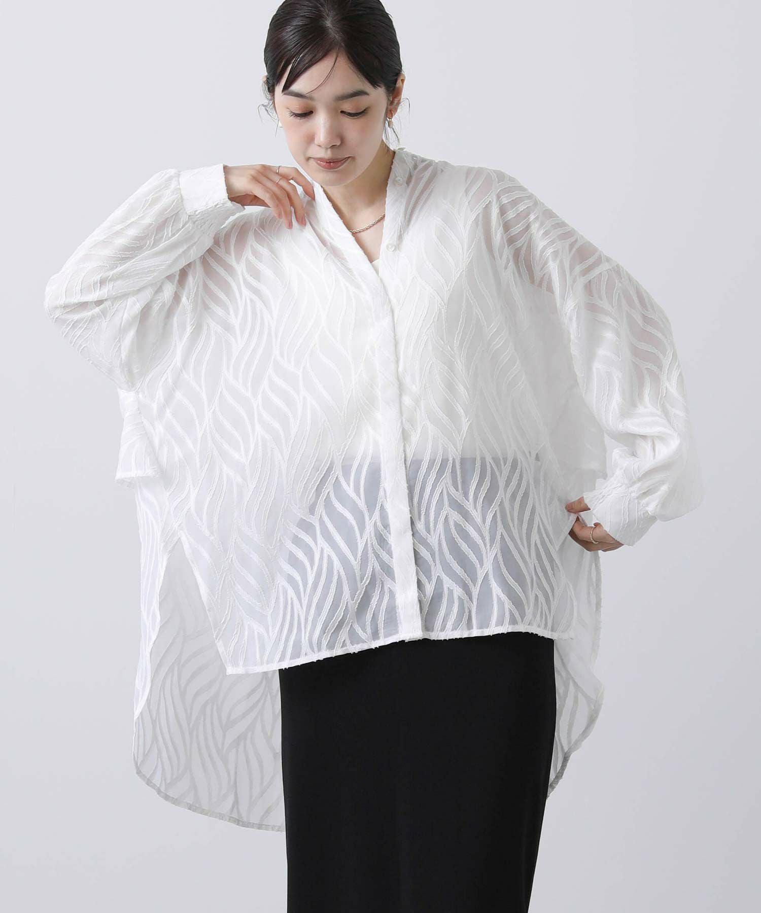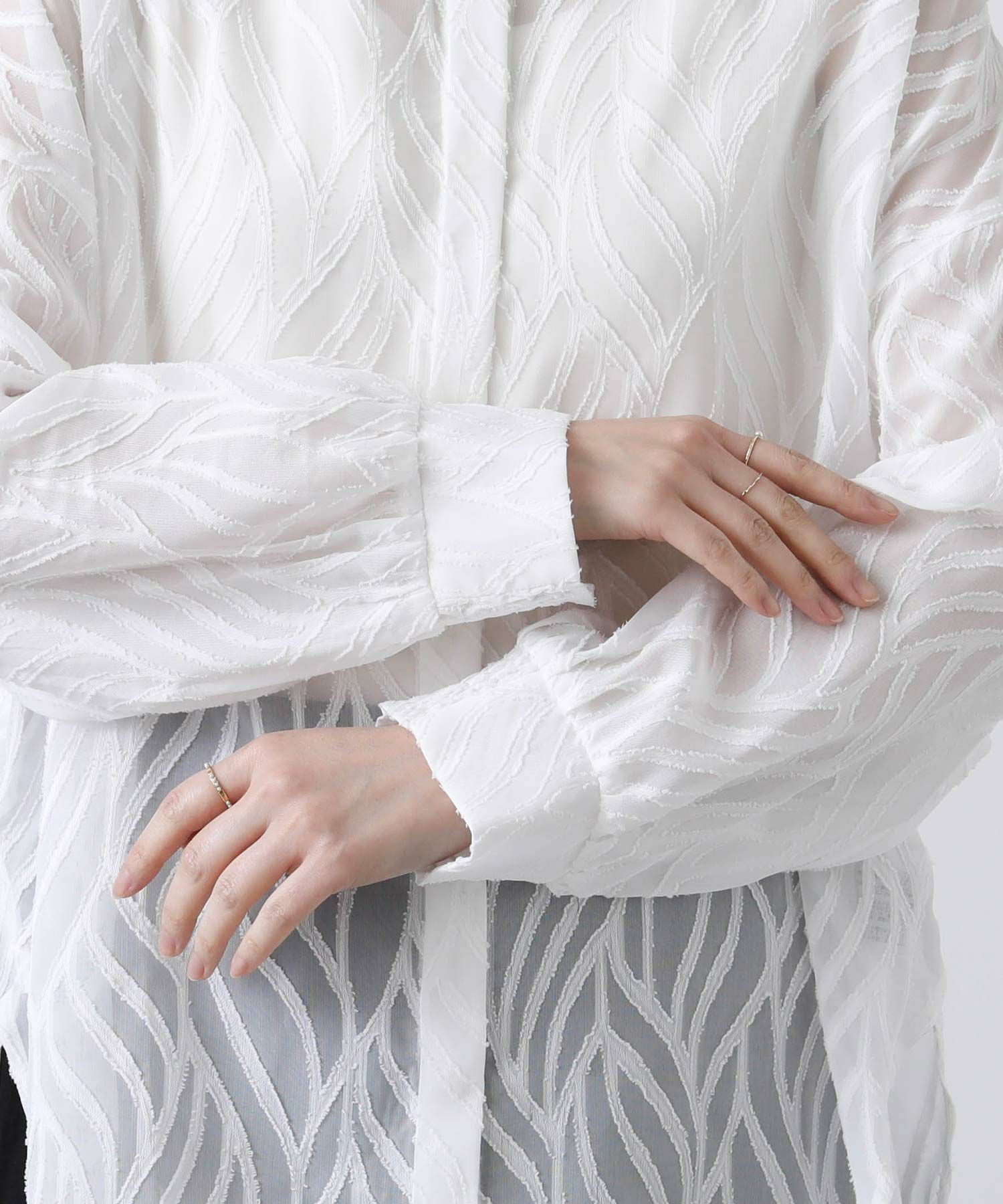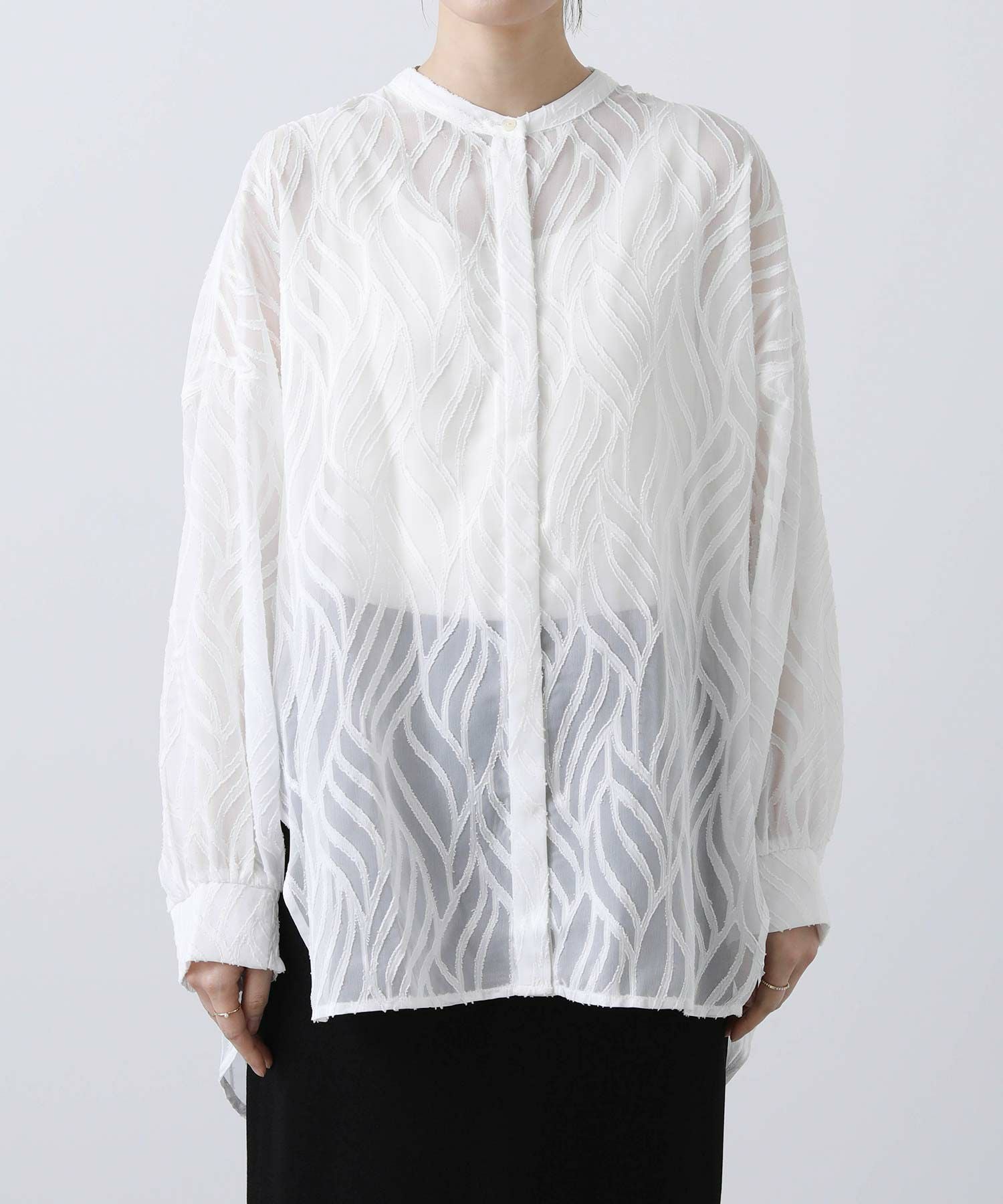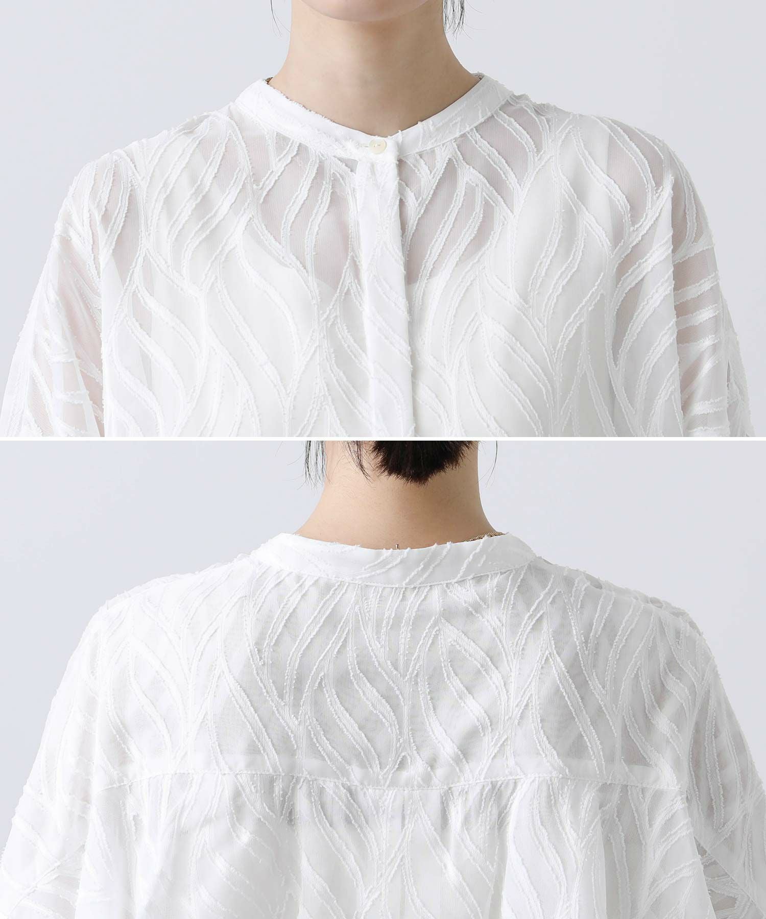 程よい透け感のリーフ柄ジャガードが上品な印象のバンドカラーブラウス。