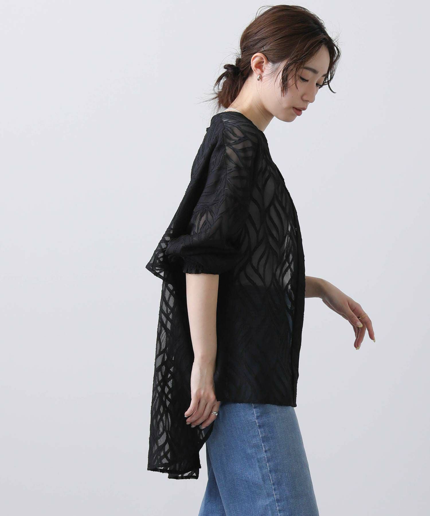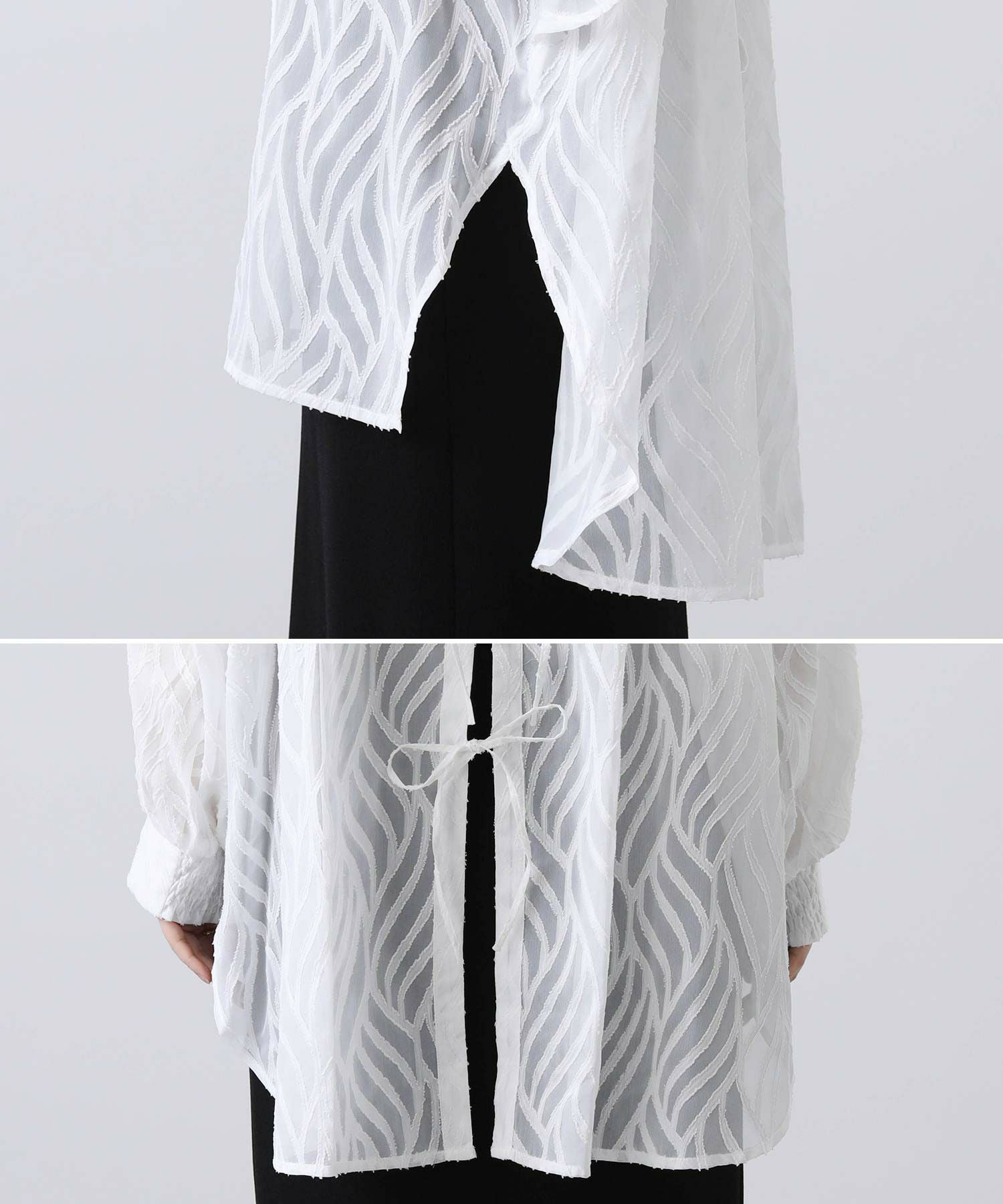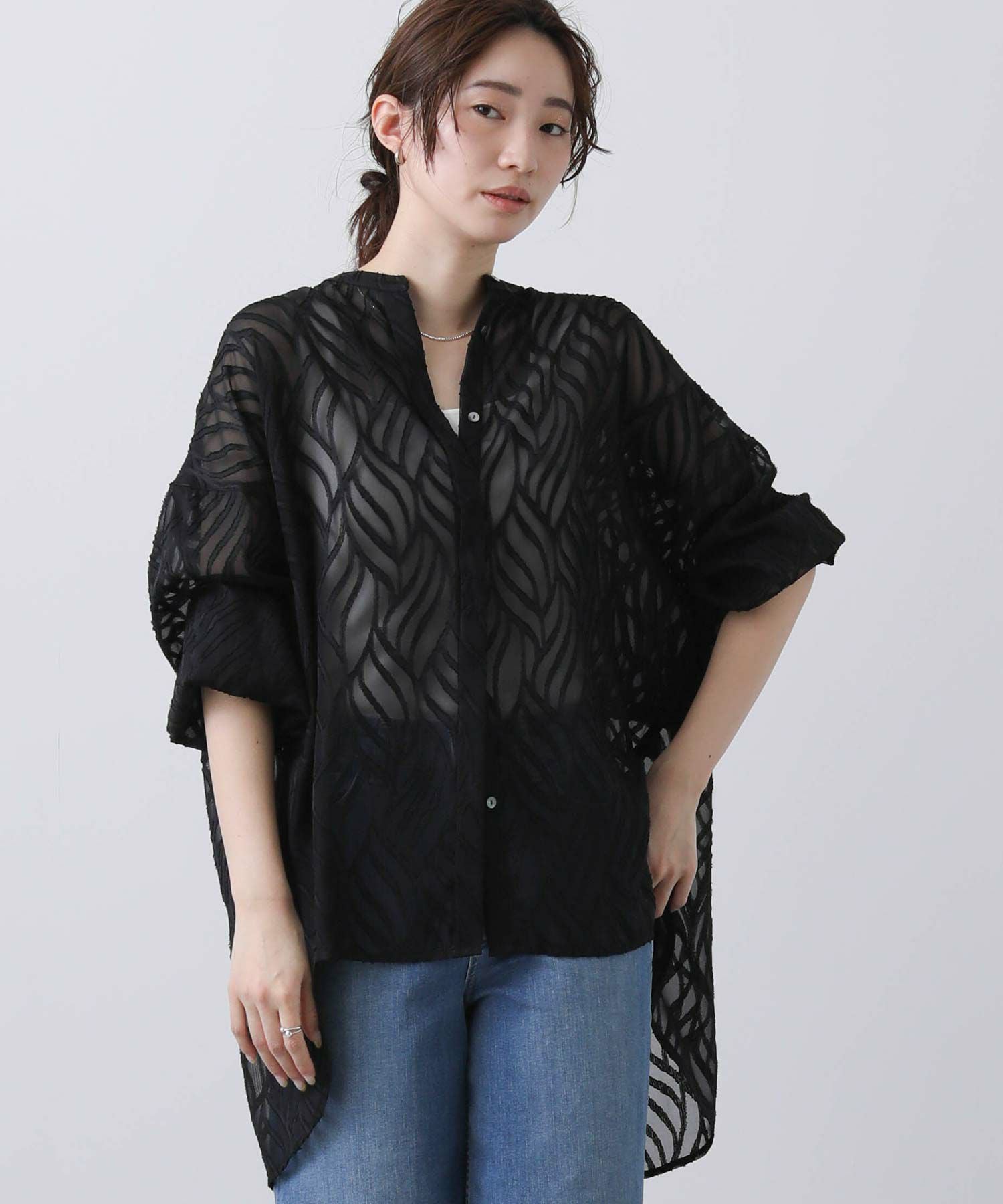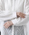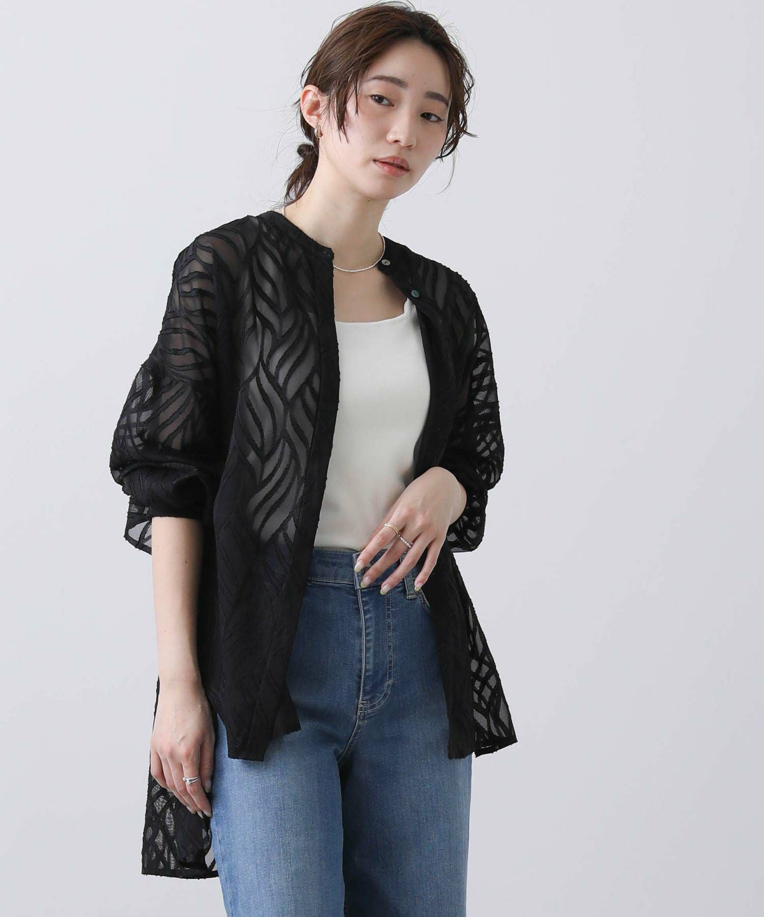 程よい透け感のリーフ柄ジャガードが上品な印象のバンドカラーブラウス。