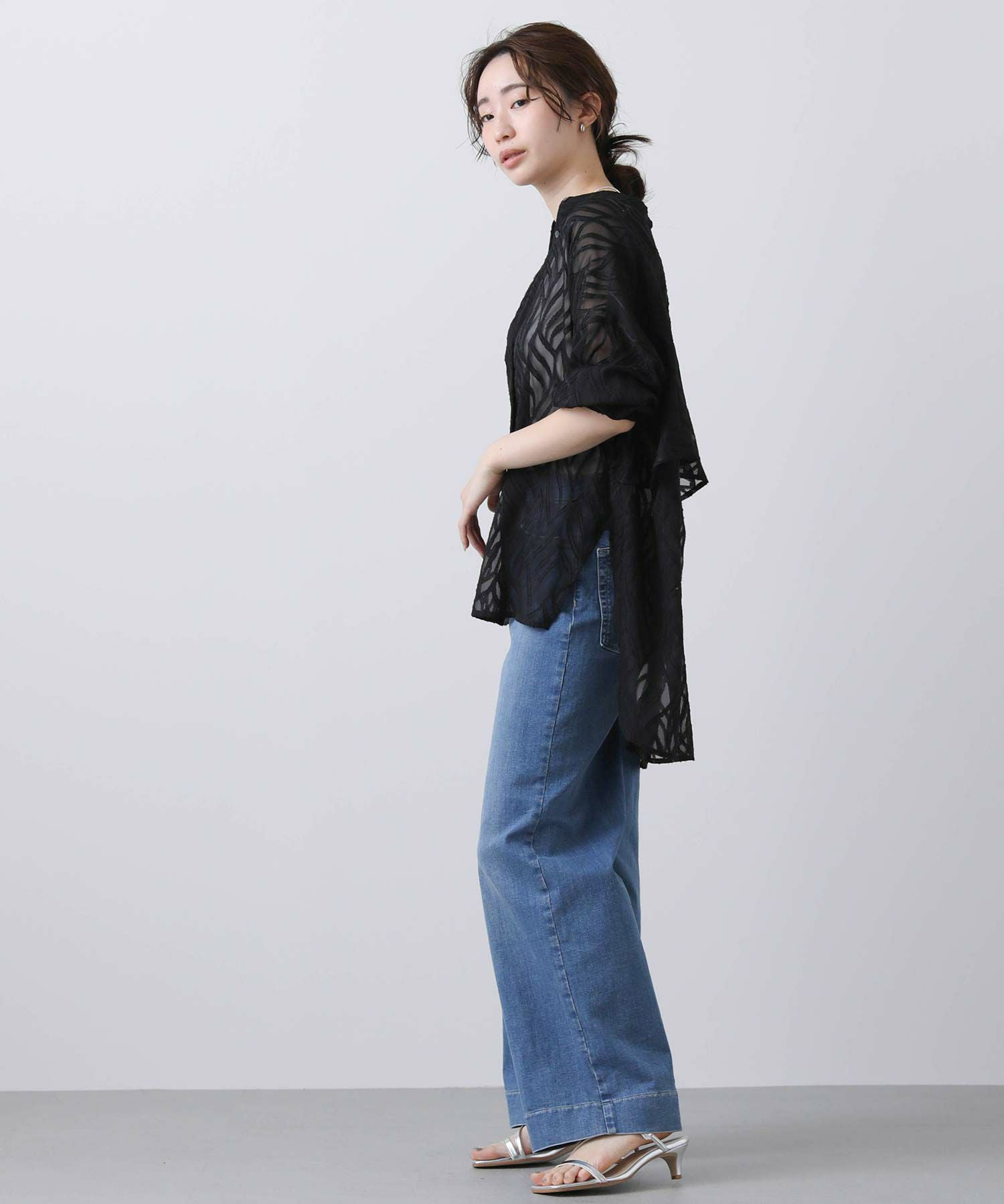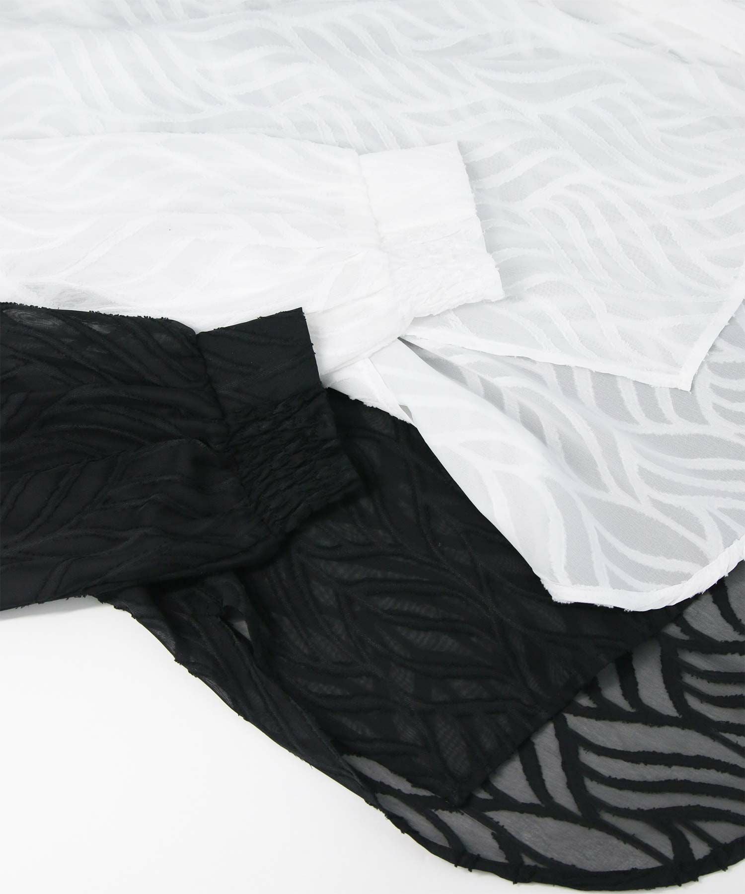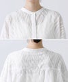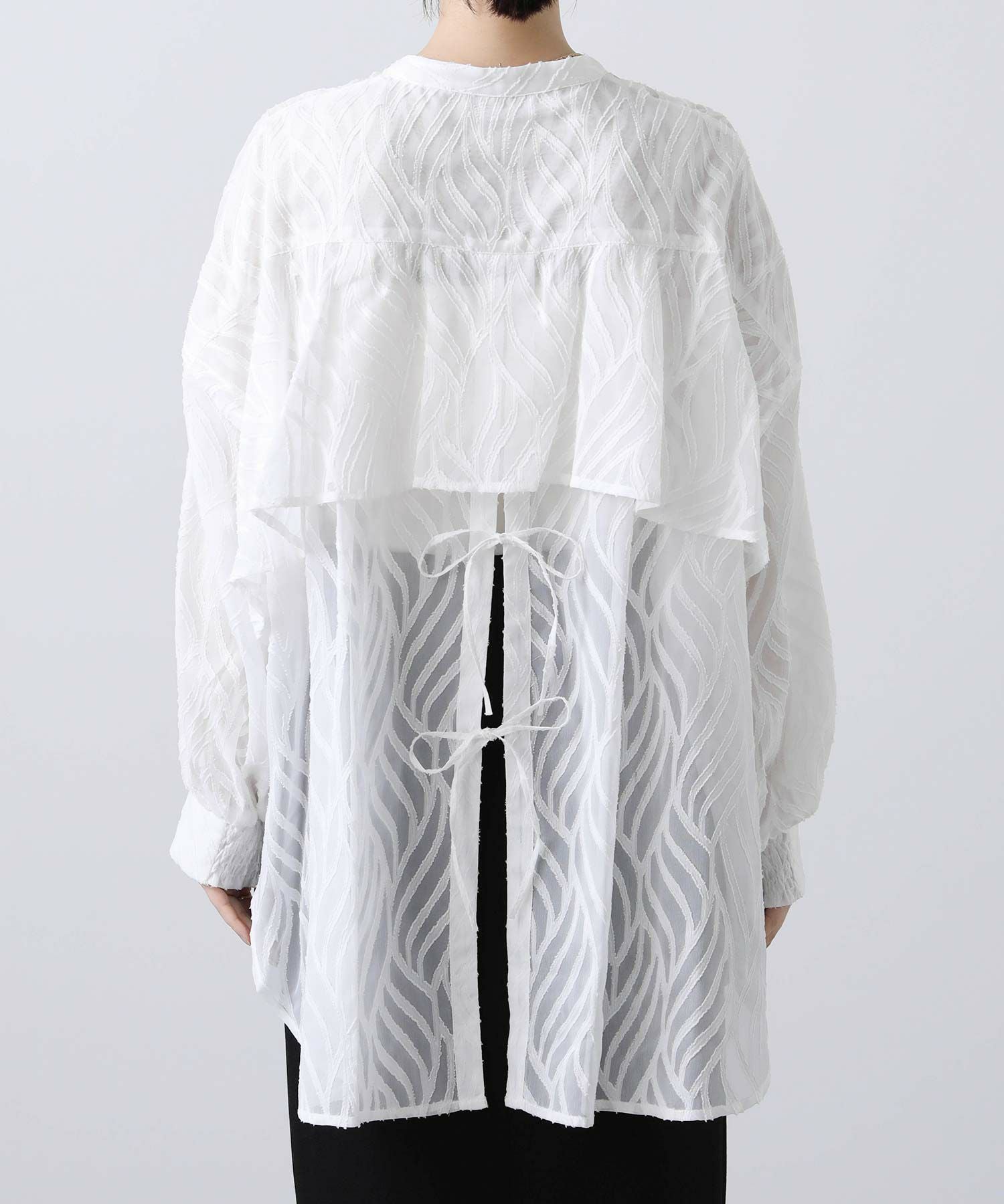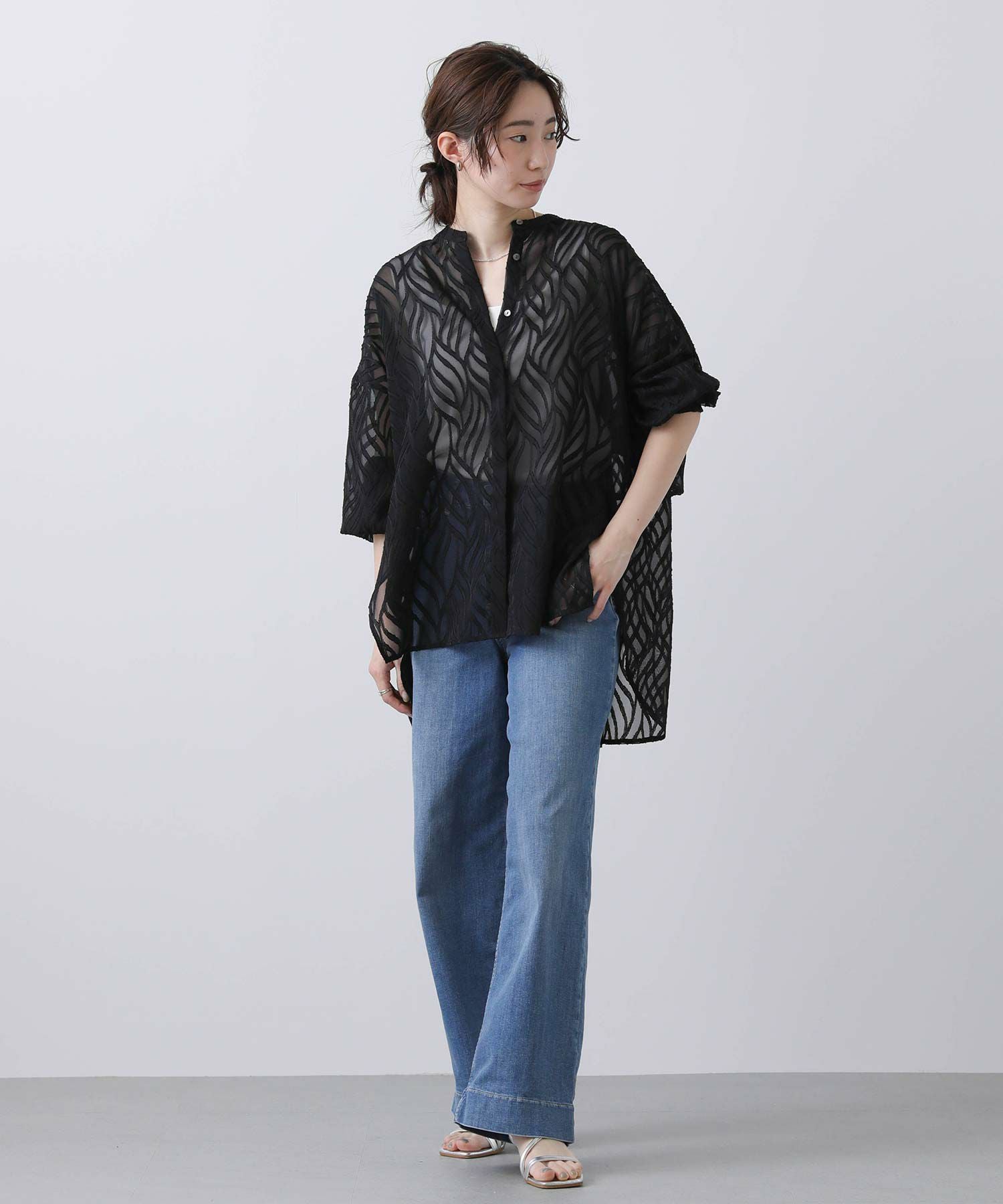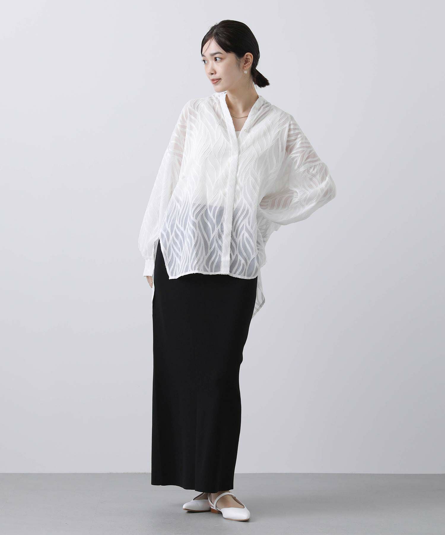 程よい透け感のリーフ柄ジャガードが上品な印象のバンドカラーブラウス。
