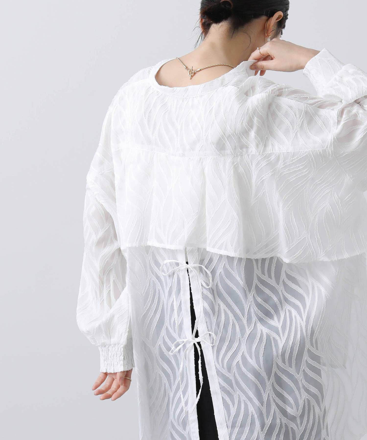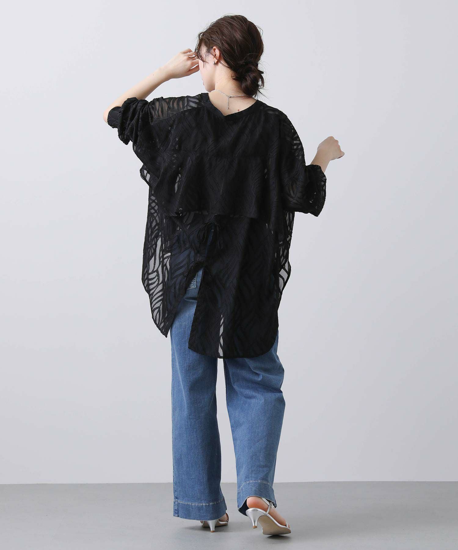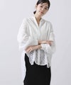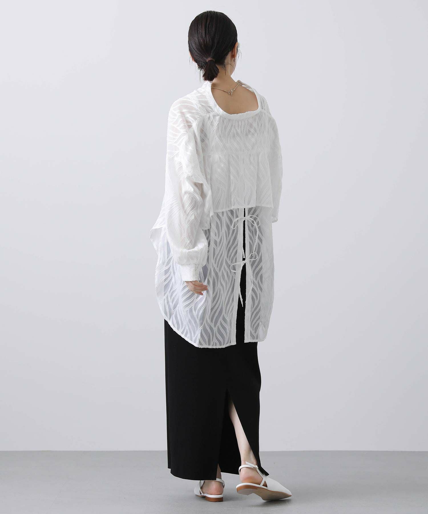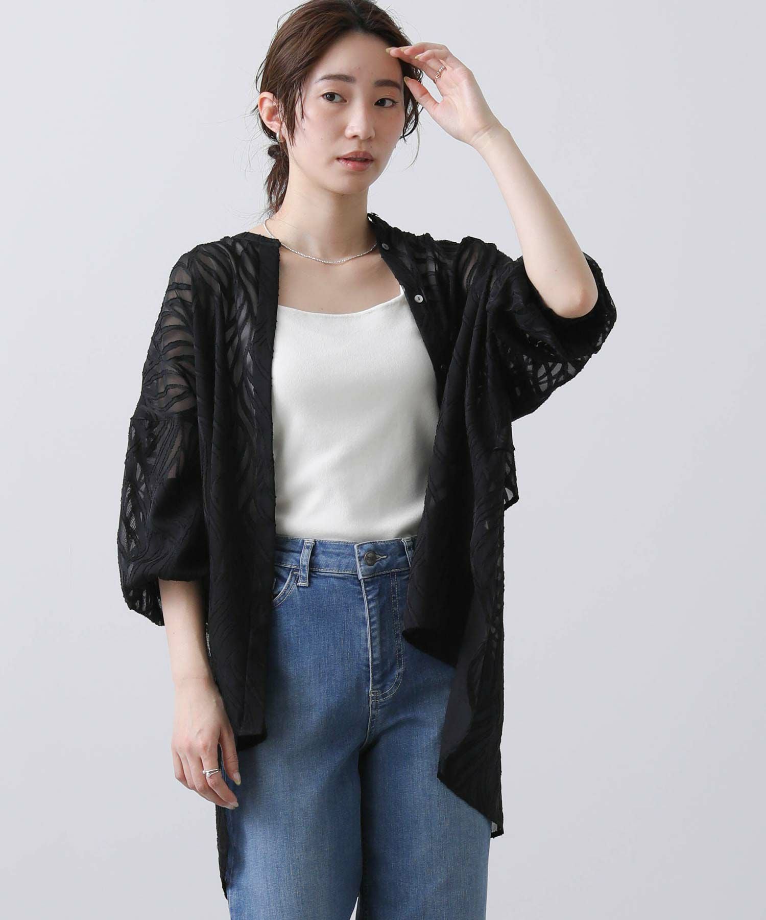 程よい透け感のリーフ柄ジャガードが上品な印象のバンドカラーブラウス。