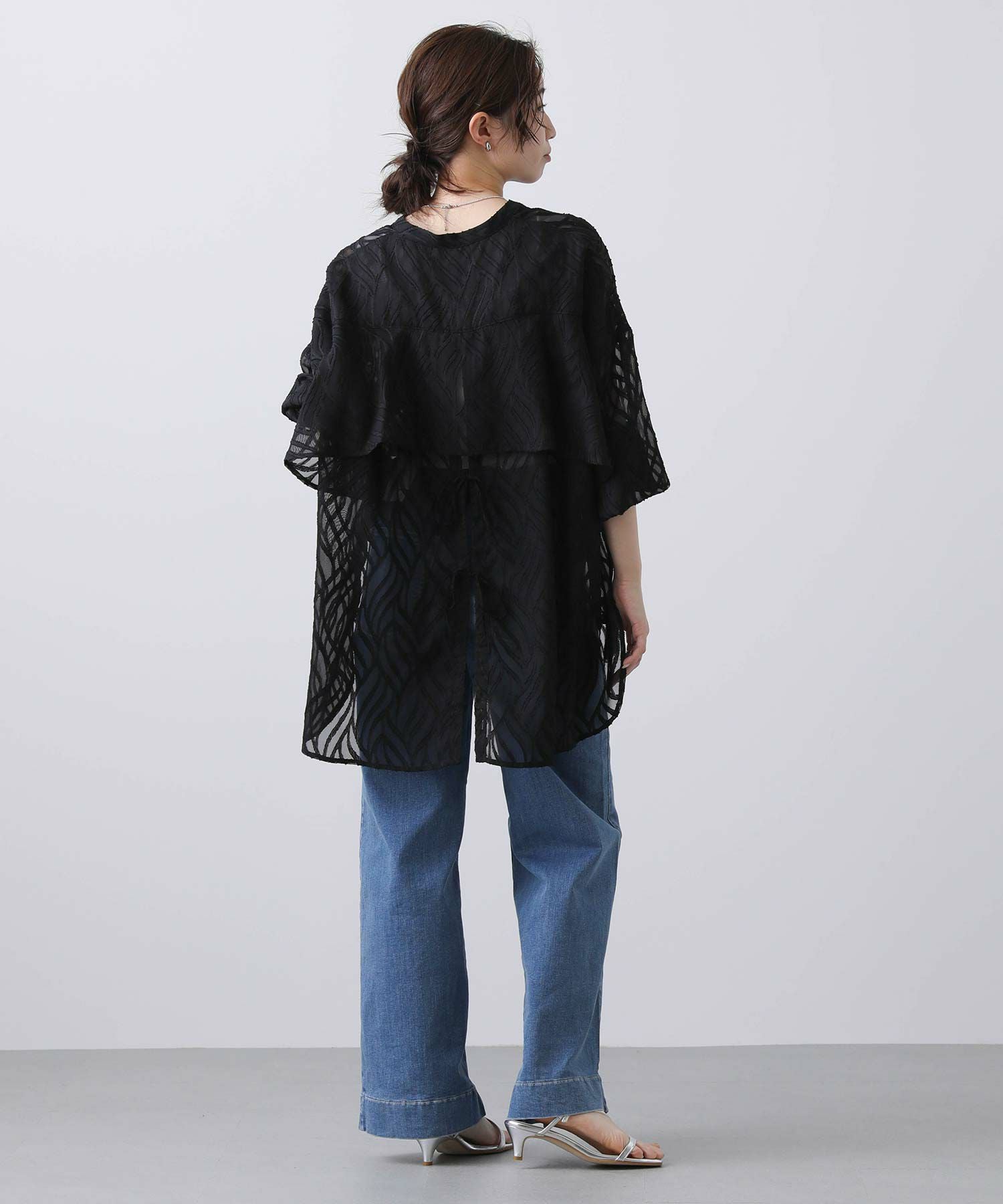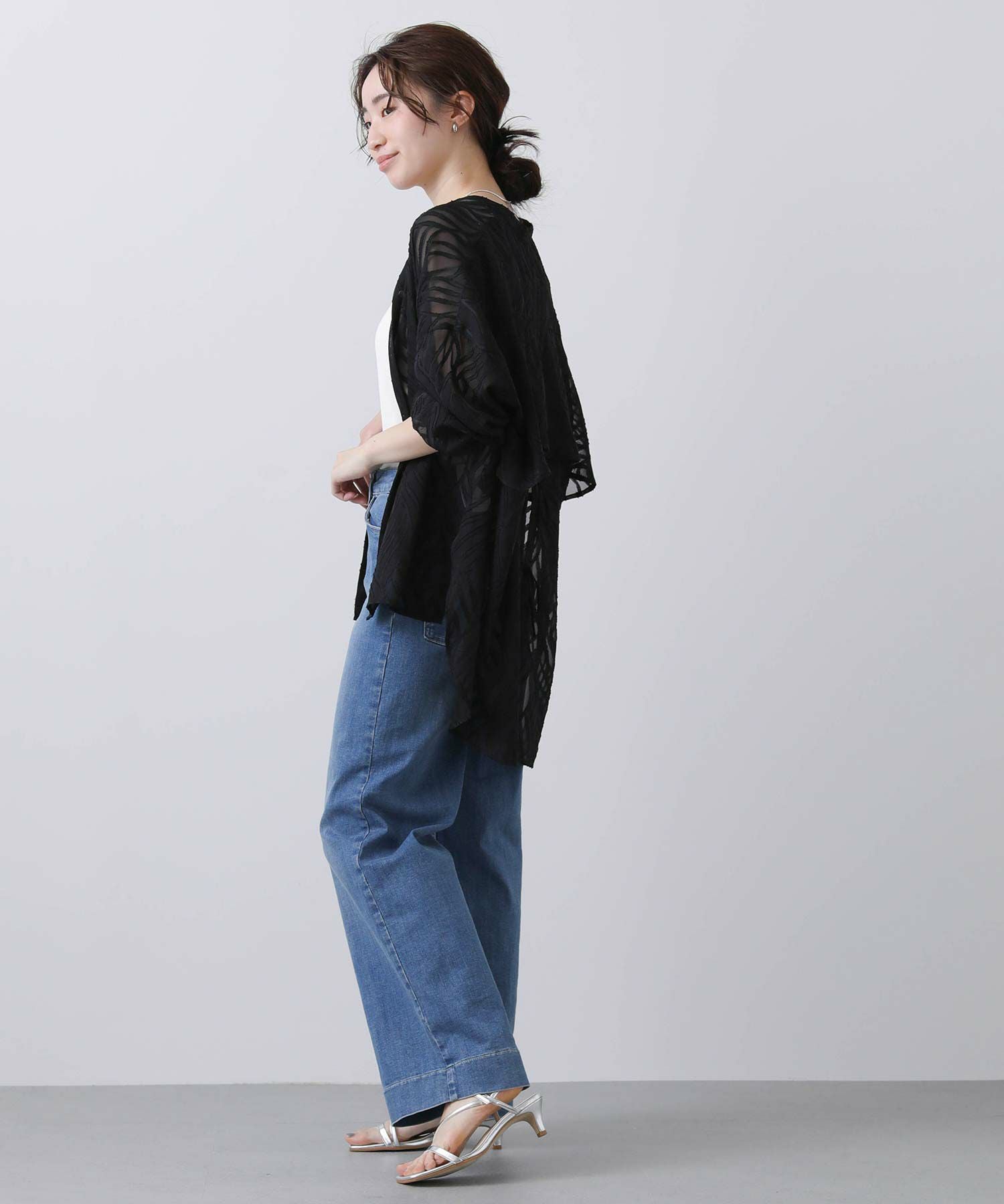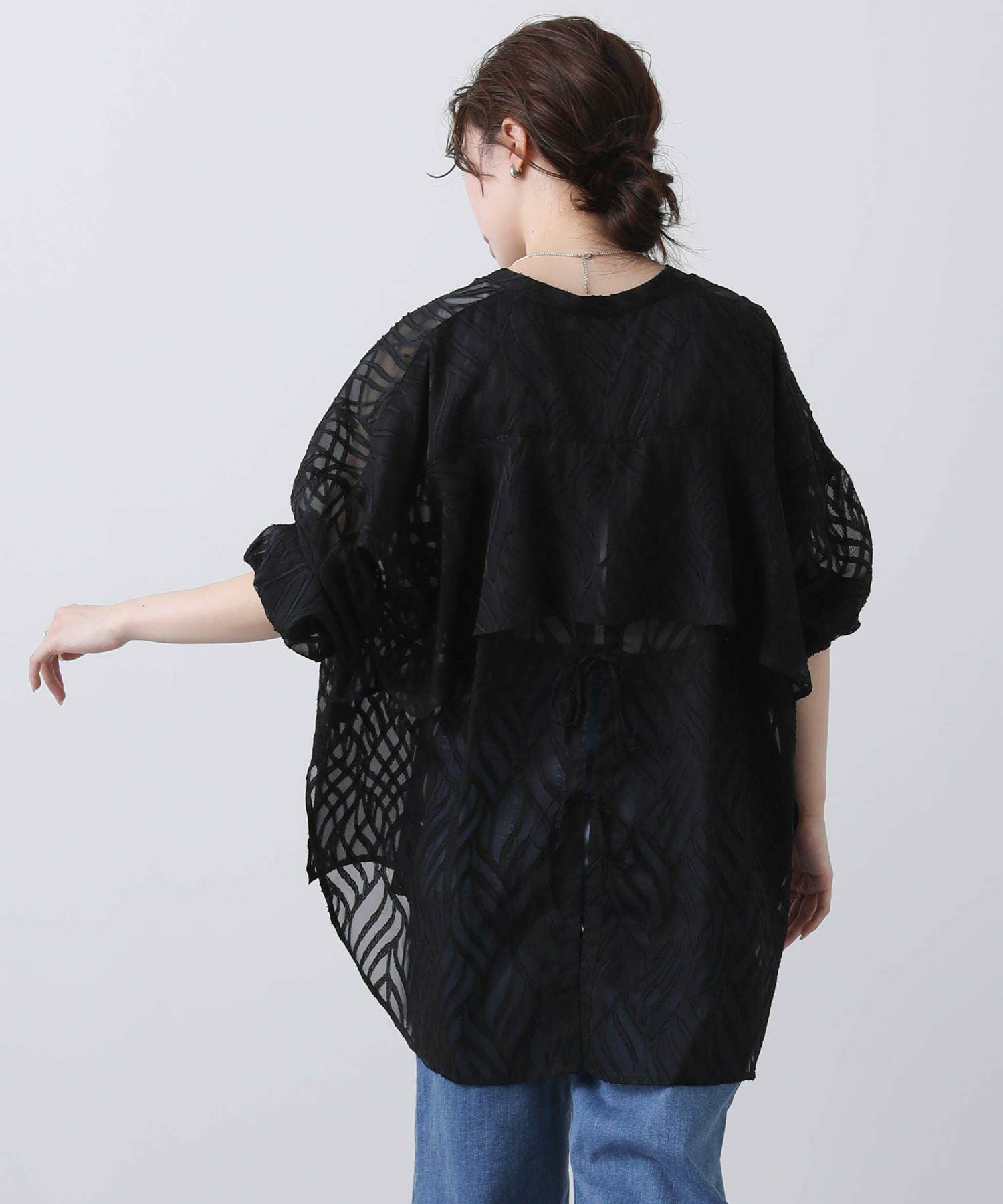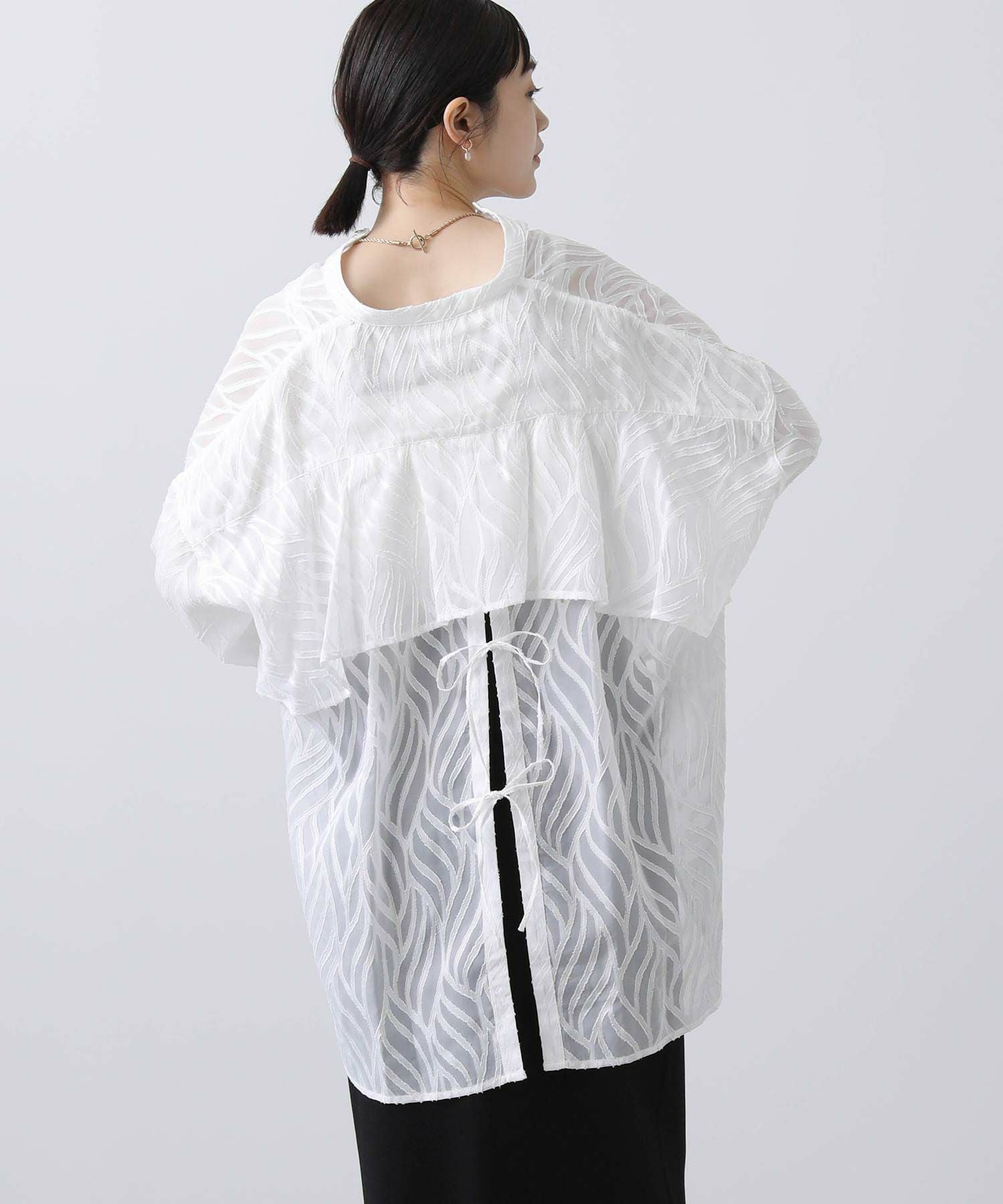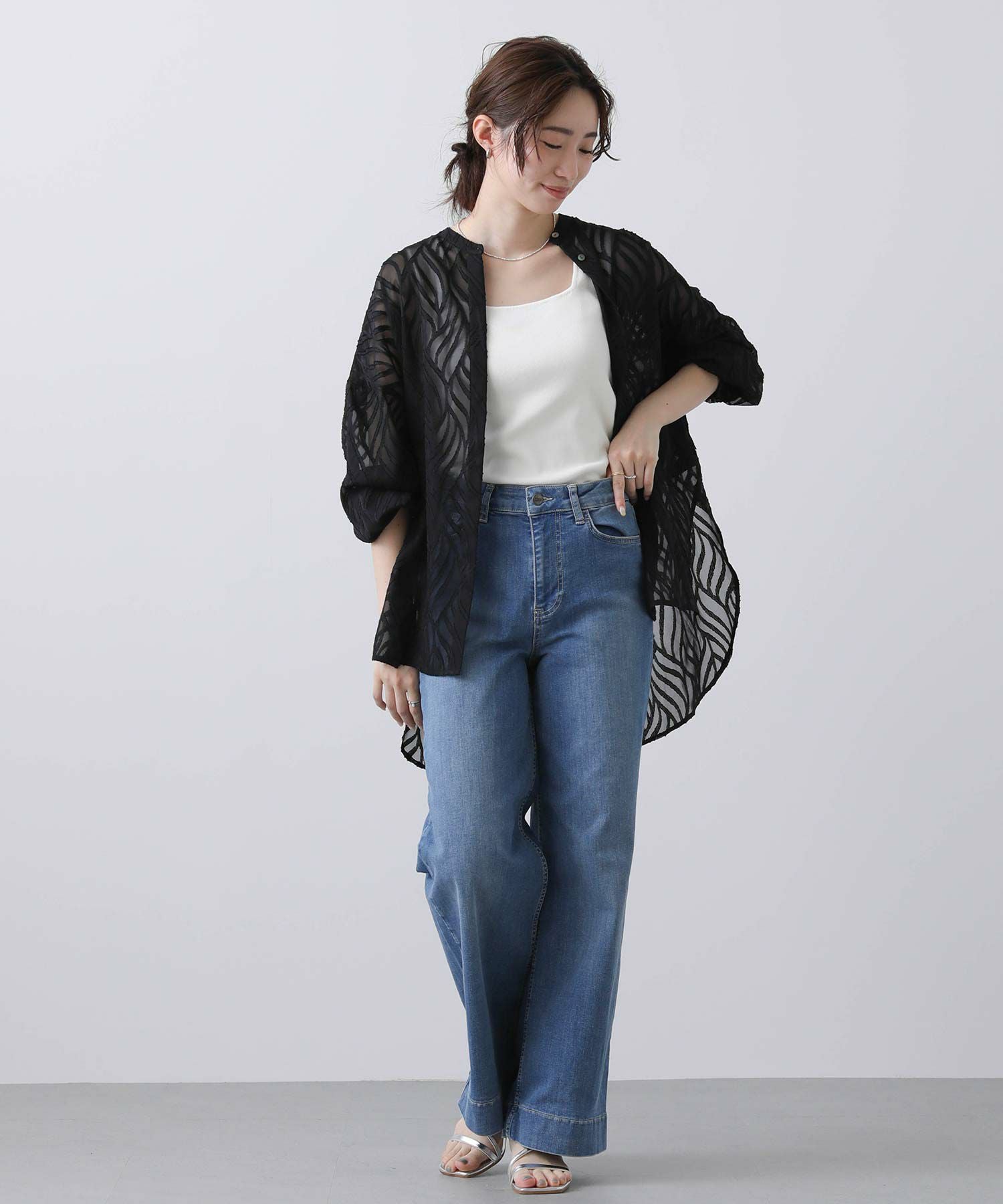 程よい透け感のリーフ柄ジャガードが上品な印象のバンドカラーブラウス。
