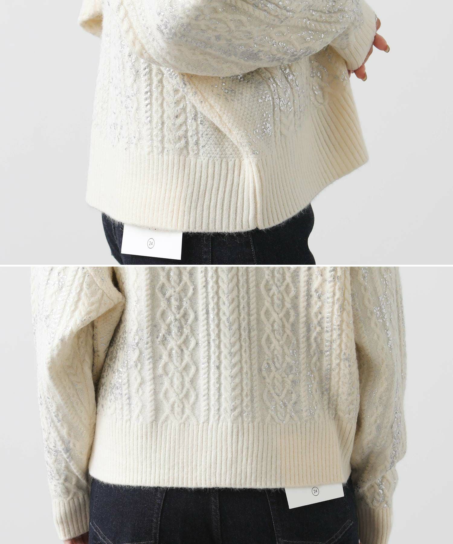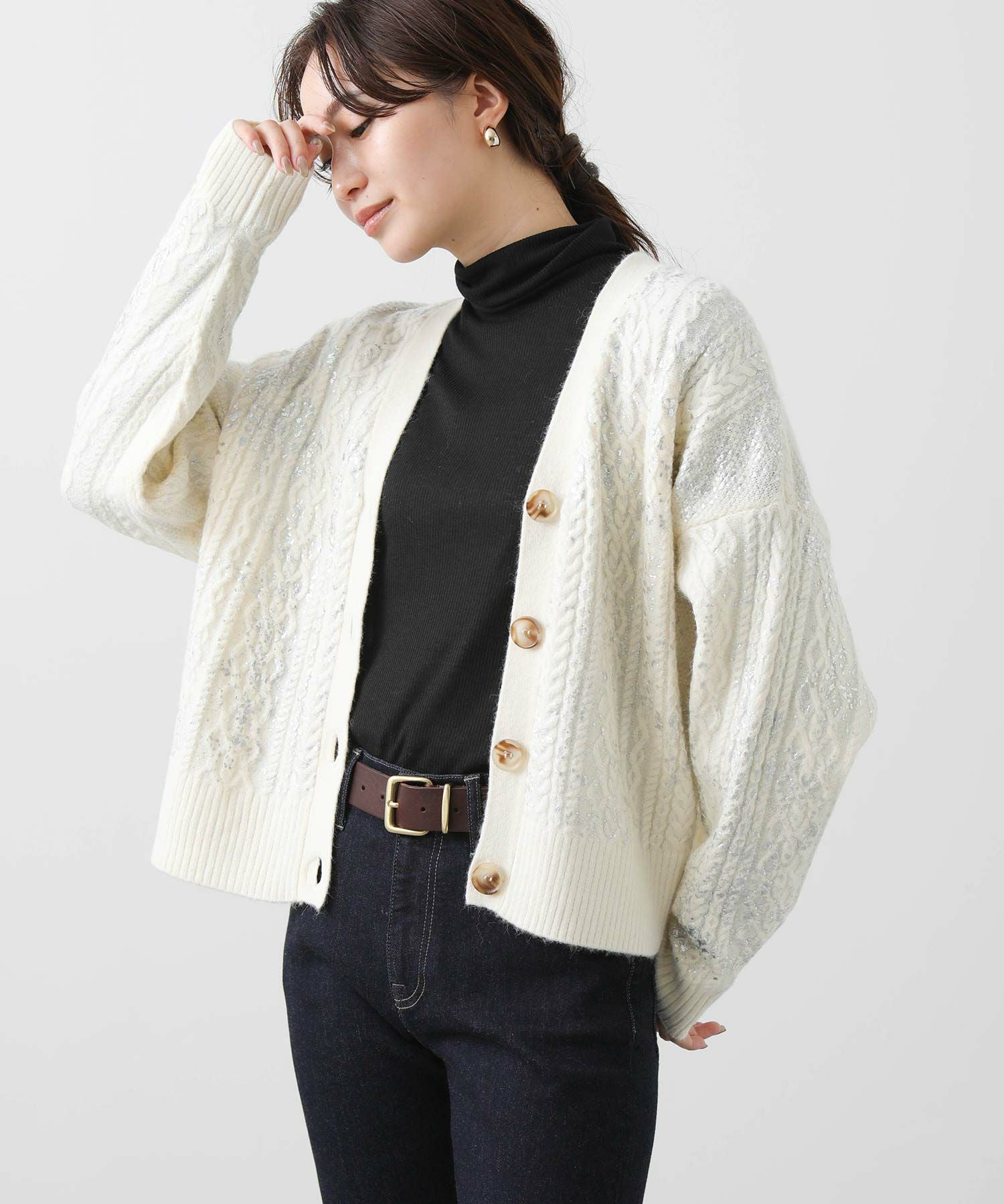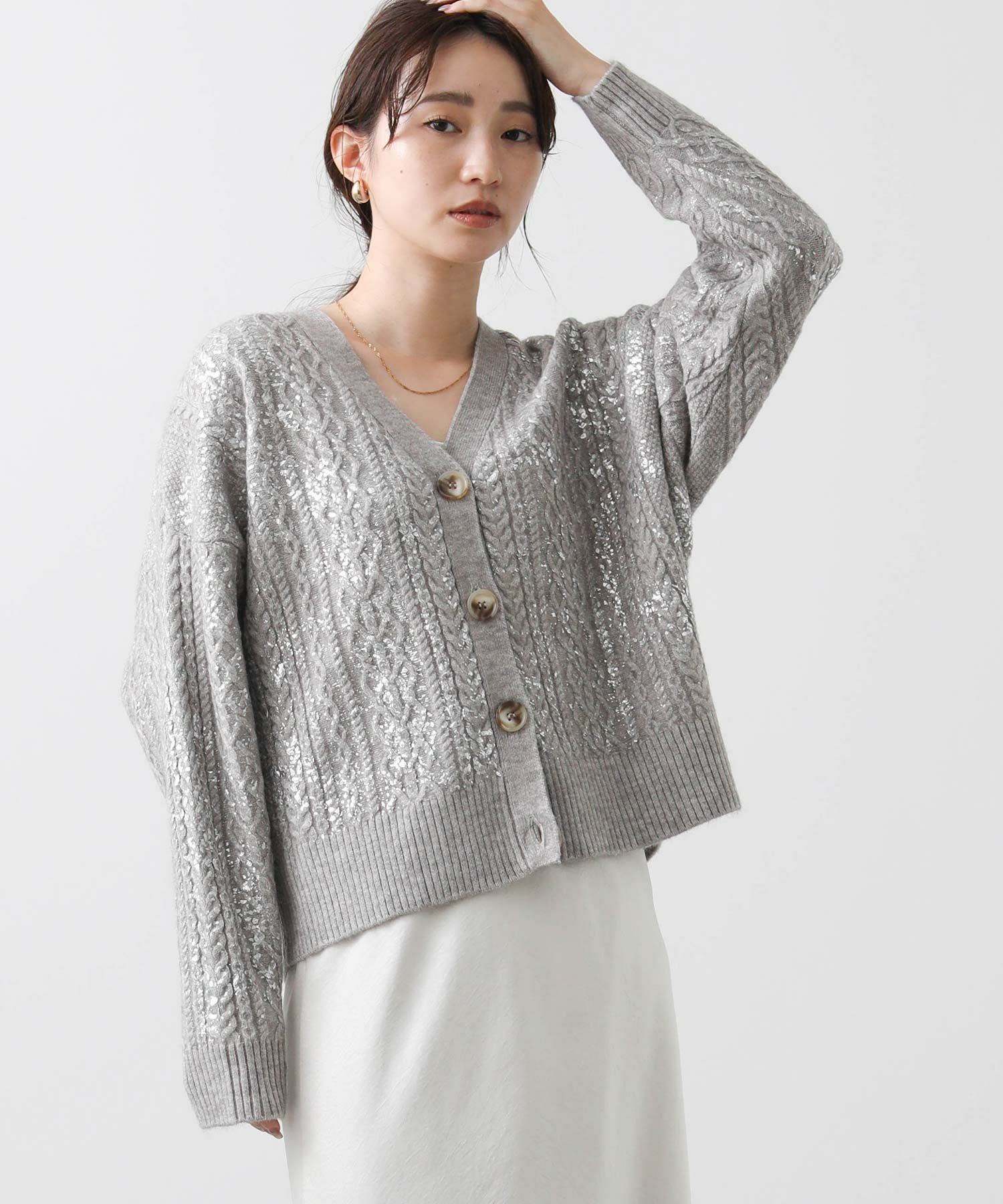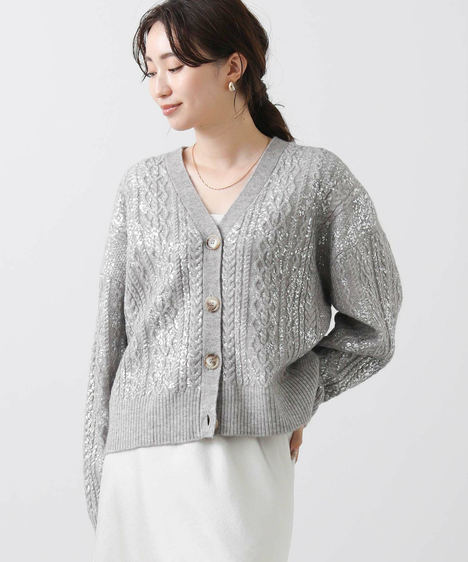 使いやすいベーシックなデザインのケーブルカーデに今年のトレンド“箔プリント”を施しました。