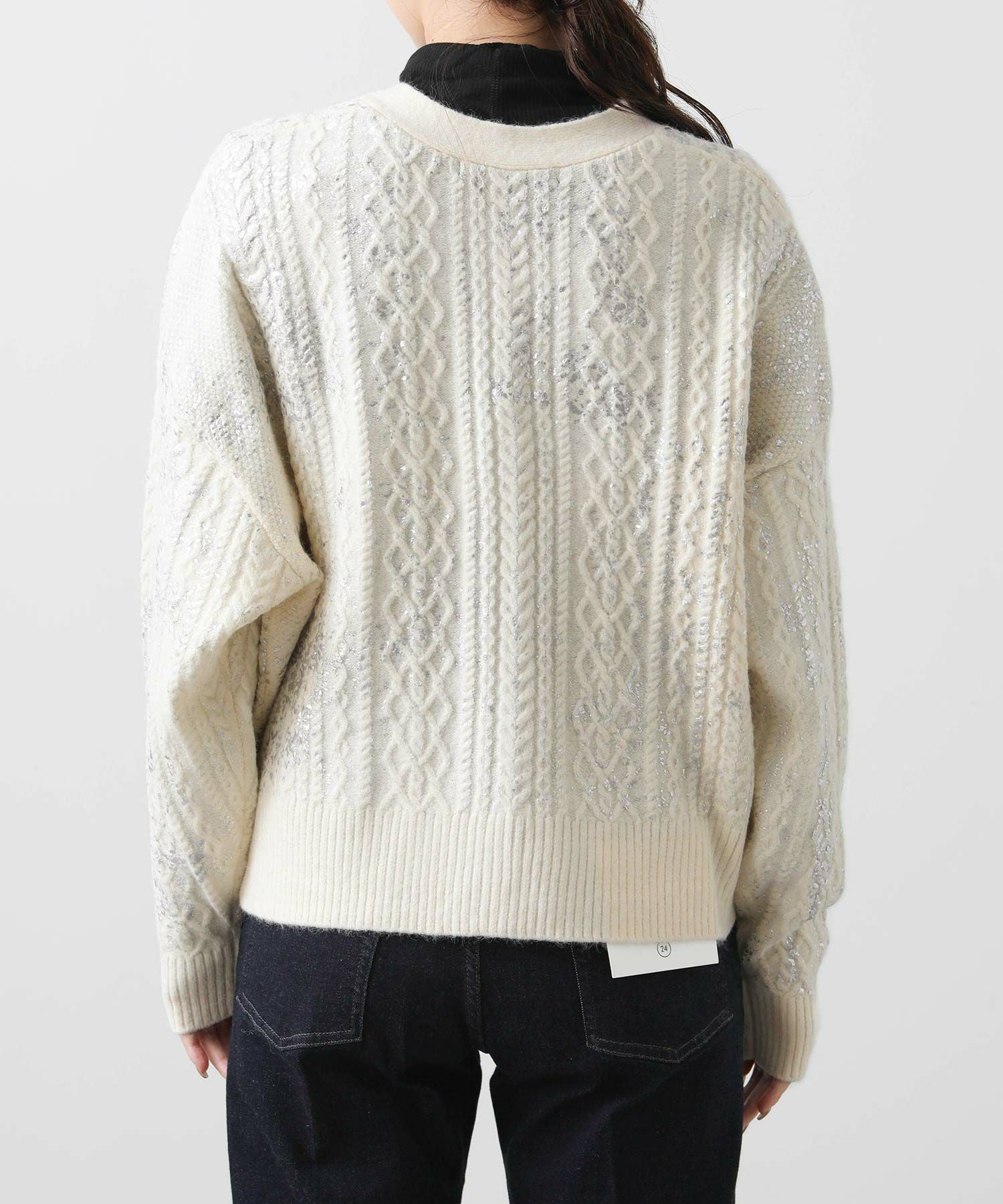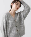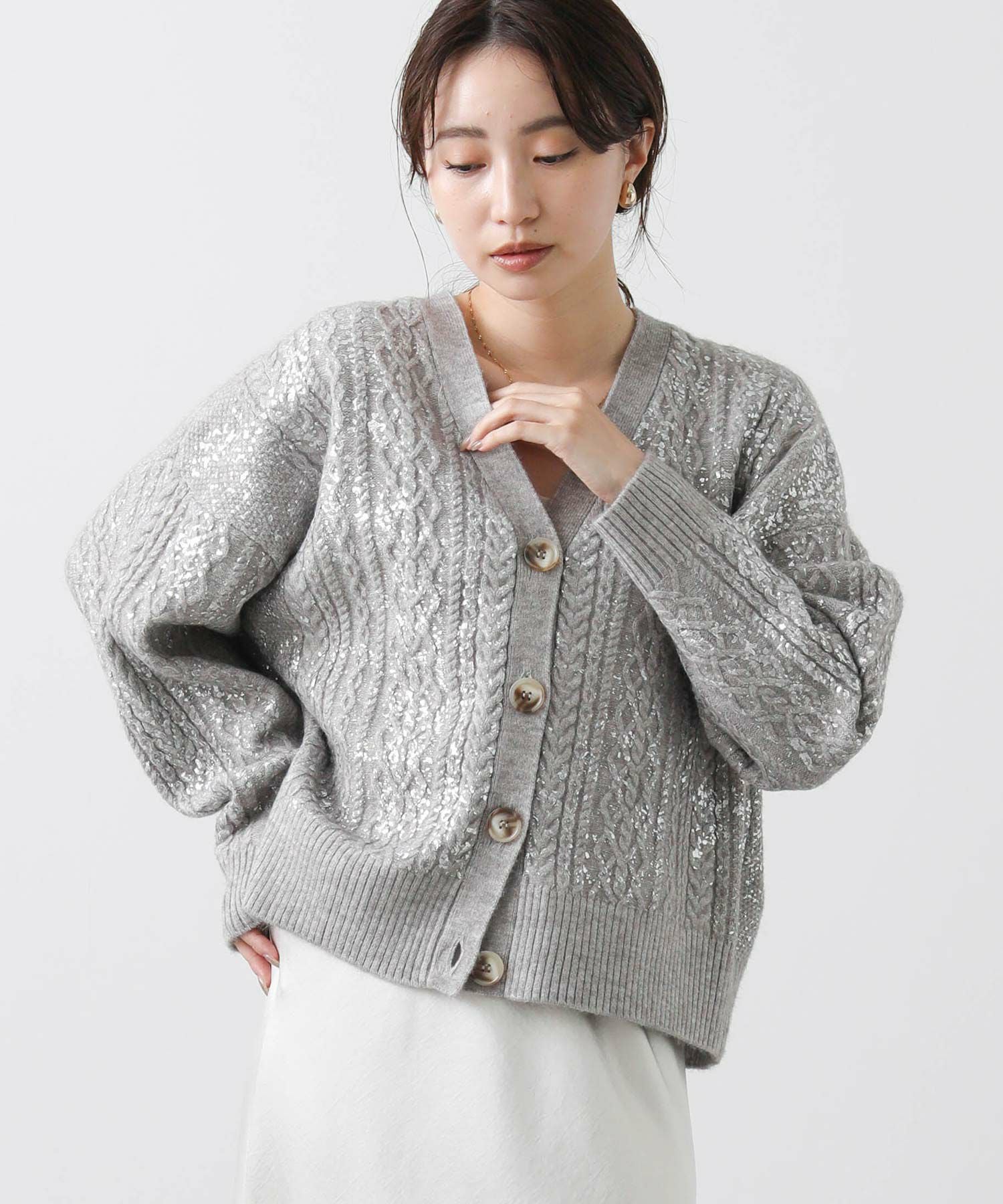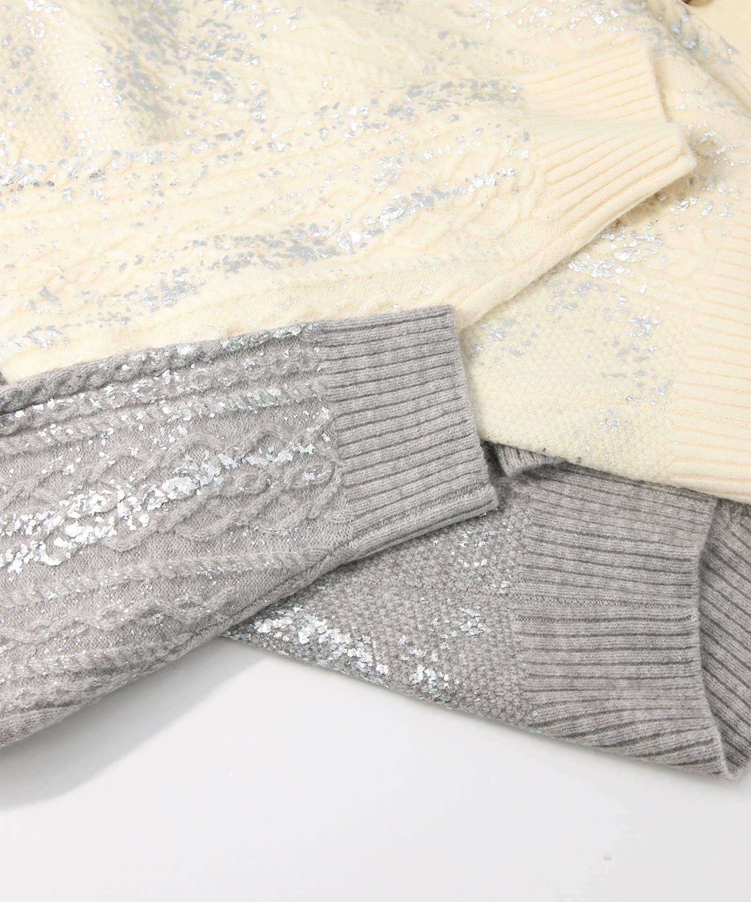 使いやすいベーシックなデザインのケーブルカーデに今年のトレンド“箔プリント”を施しました。