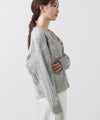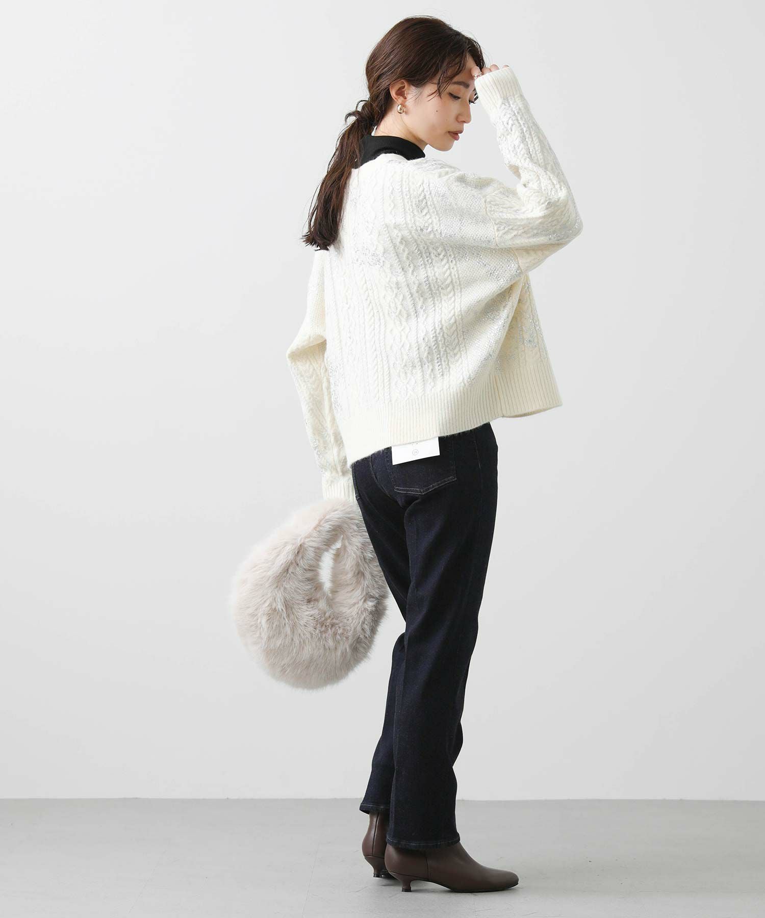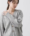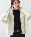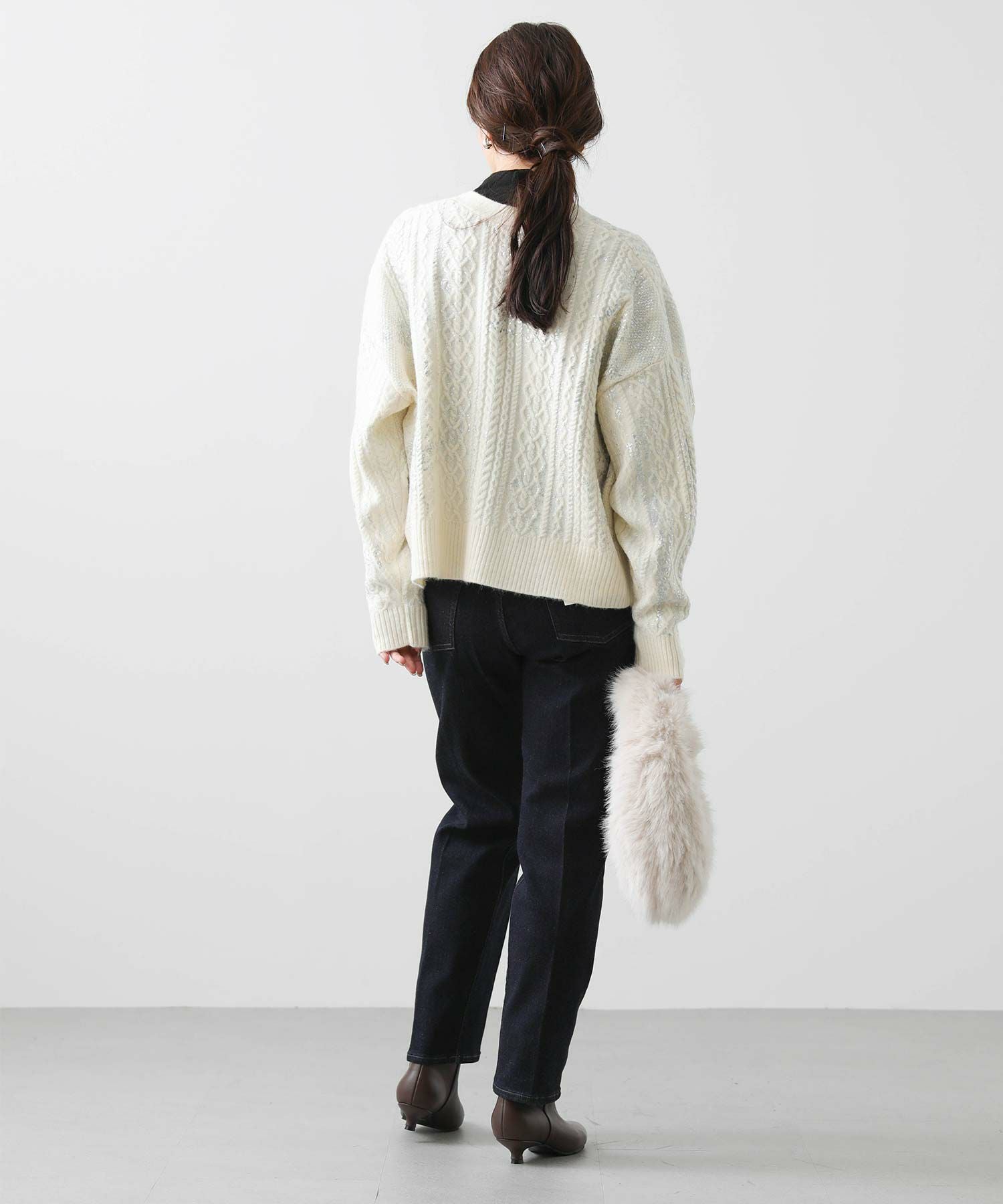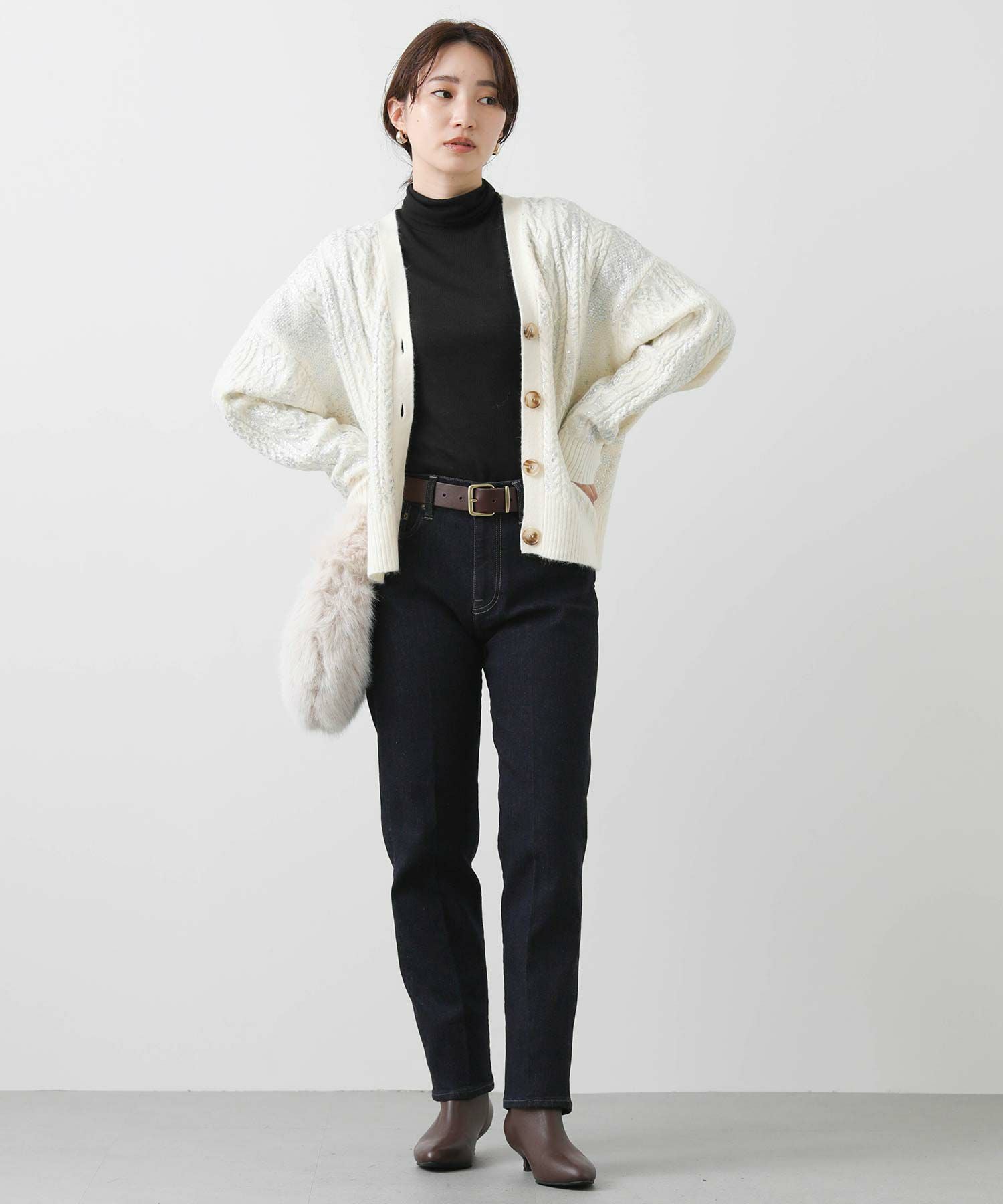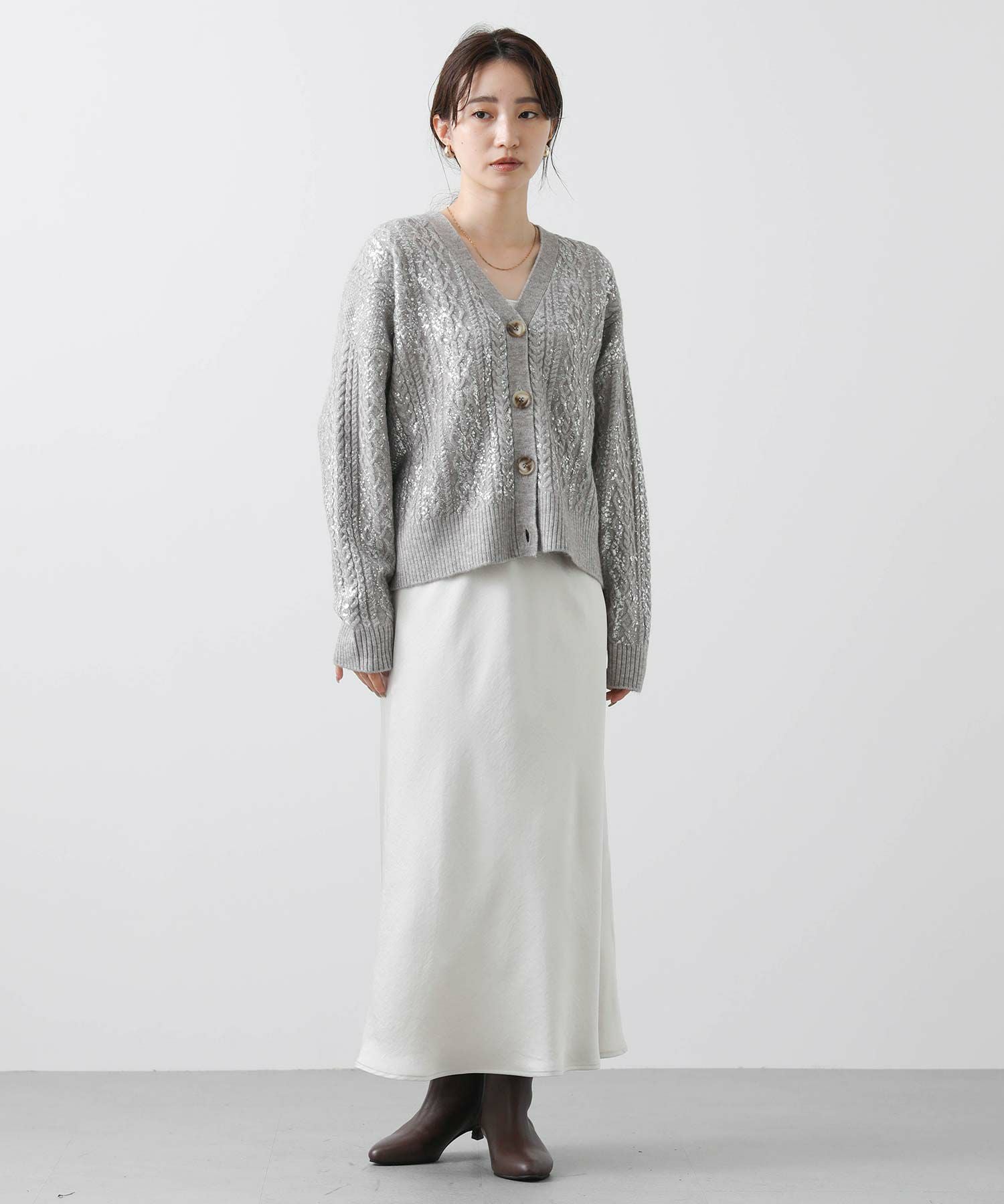 使いやすいベーシックなデザインのケーブルカーデに今年のトレンド“箔プリント”を施しました。