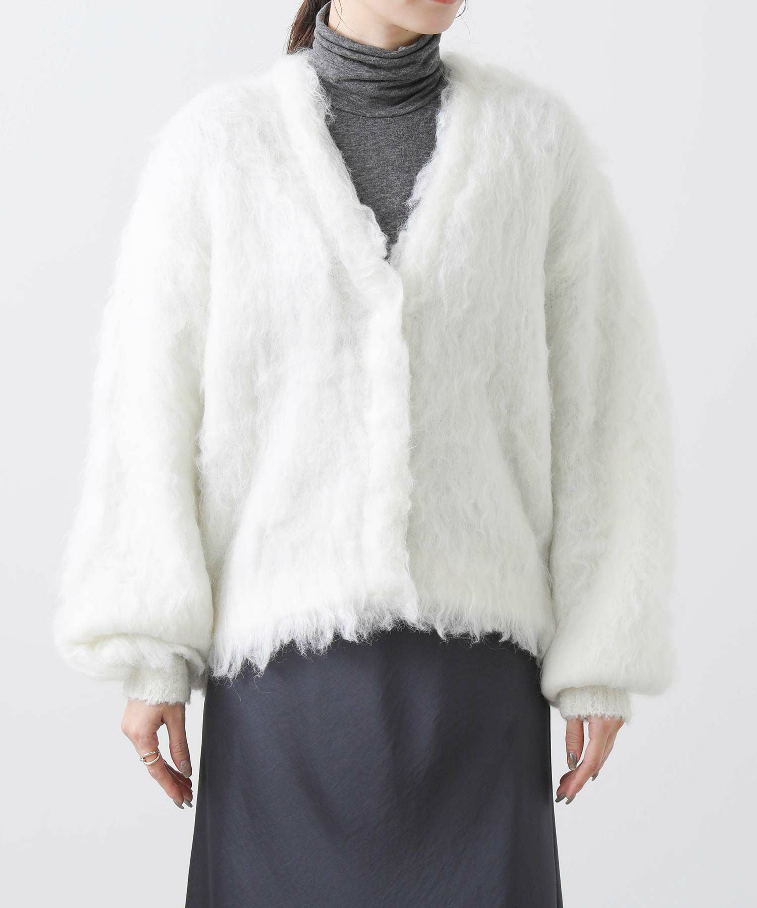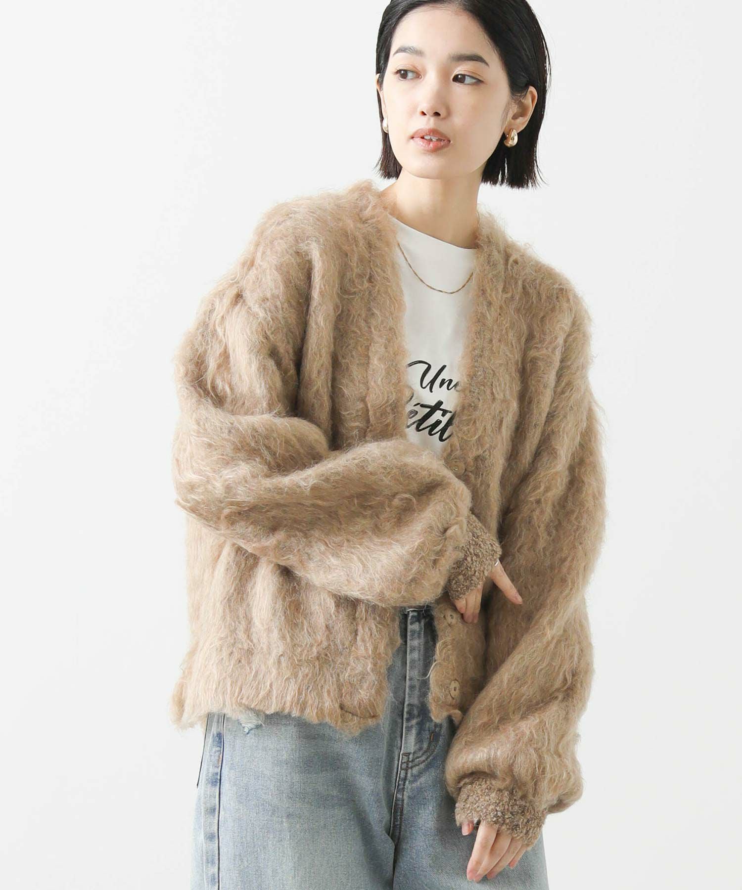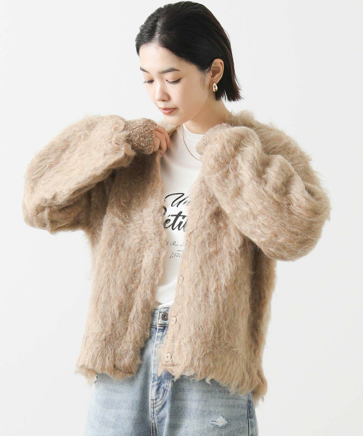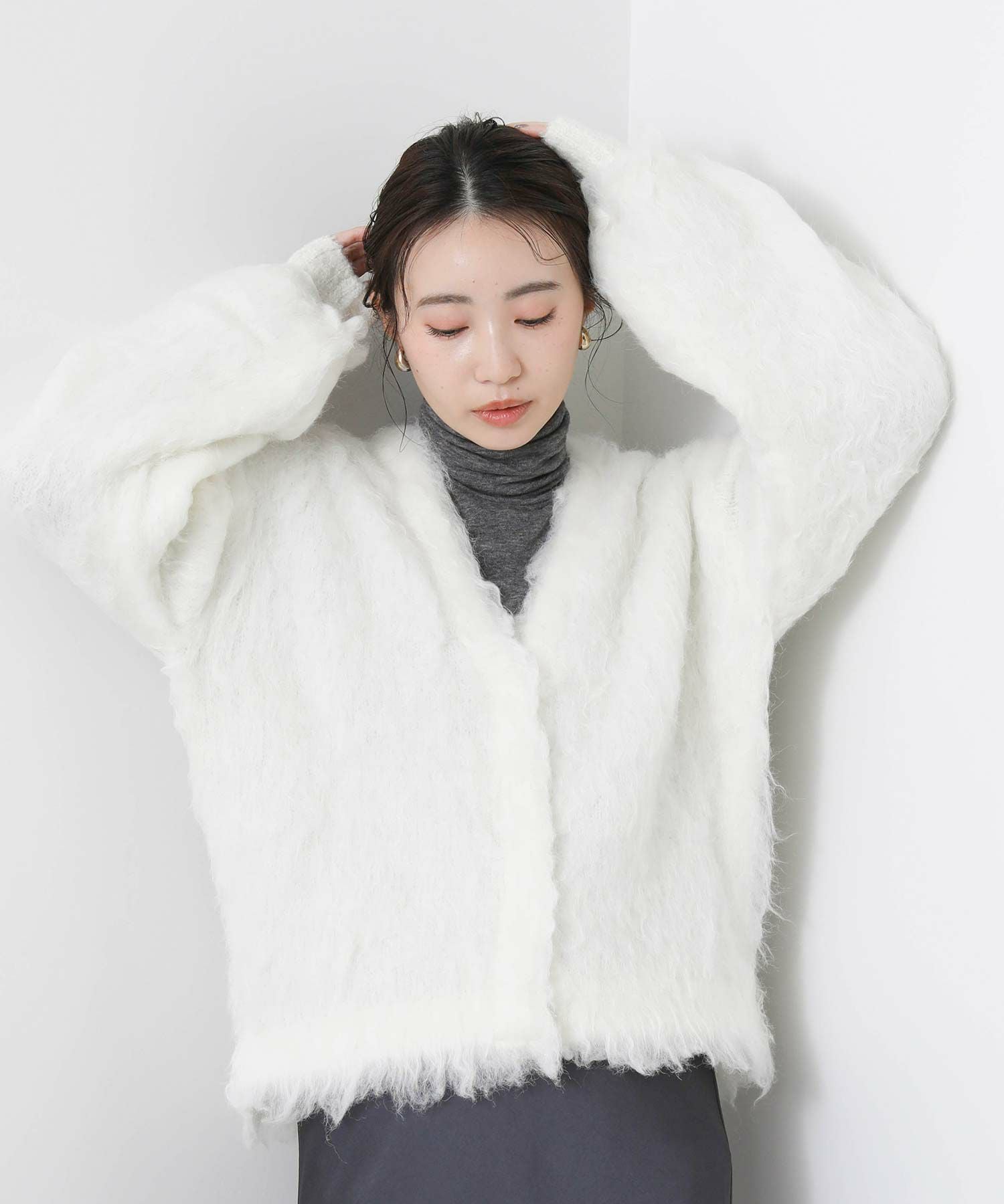 思わず触りたくなるふわふわの毛足が目を惹く、起毛加工のシャギーニットカーディガン。