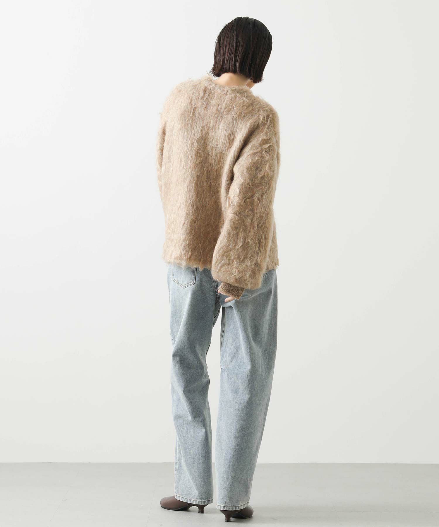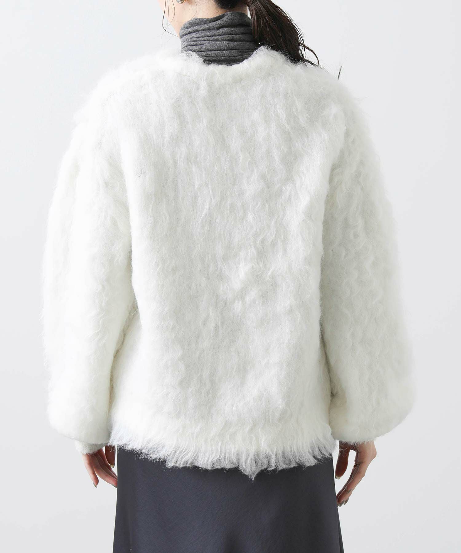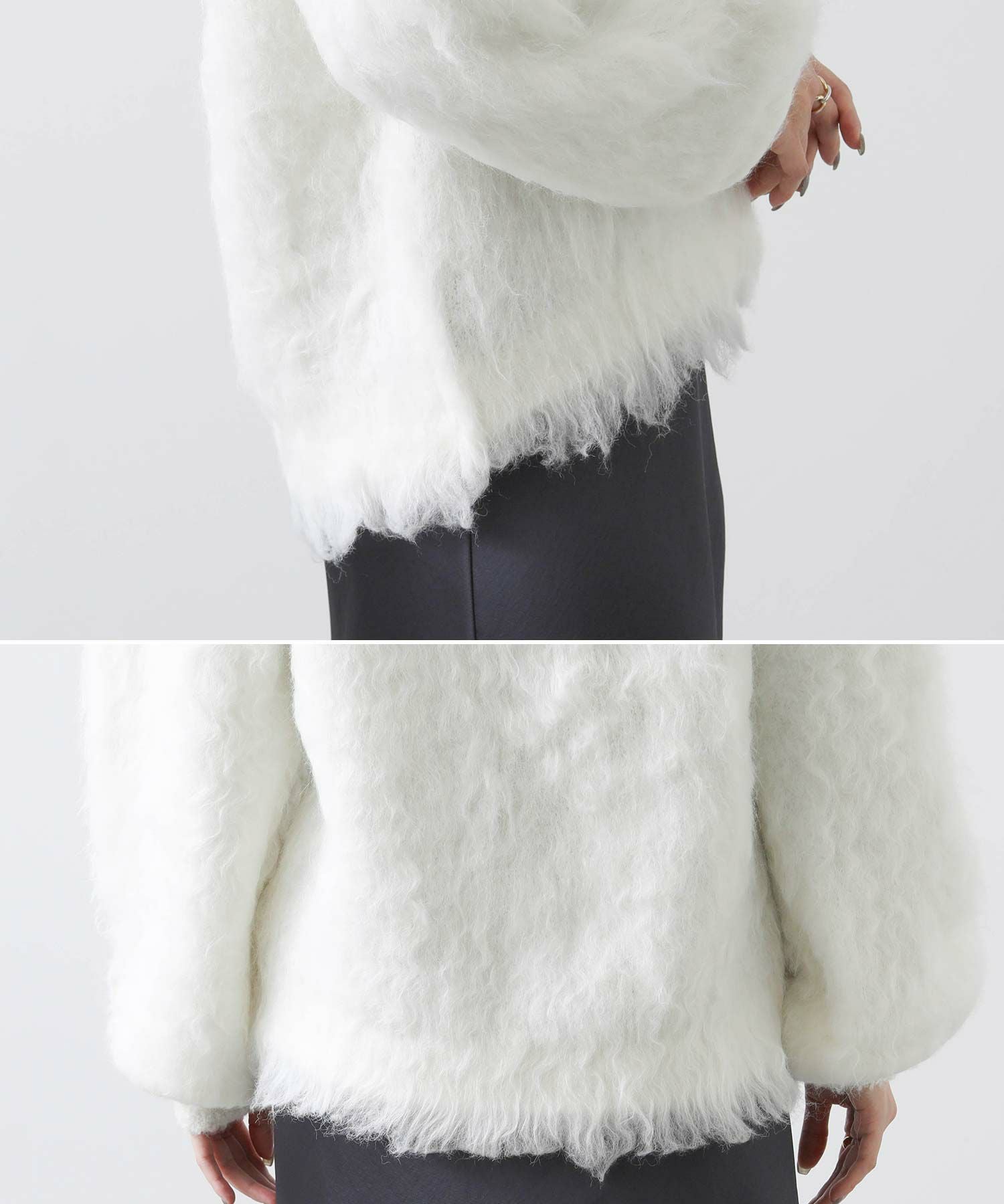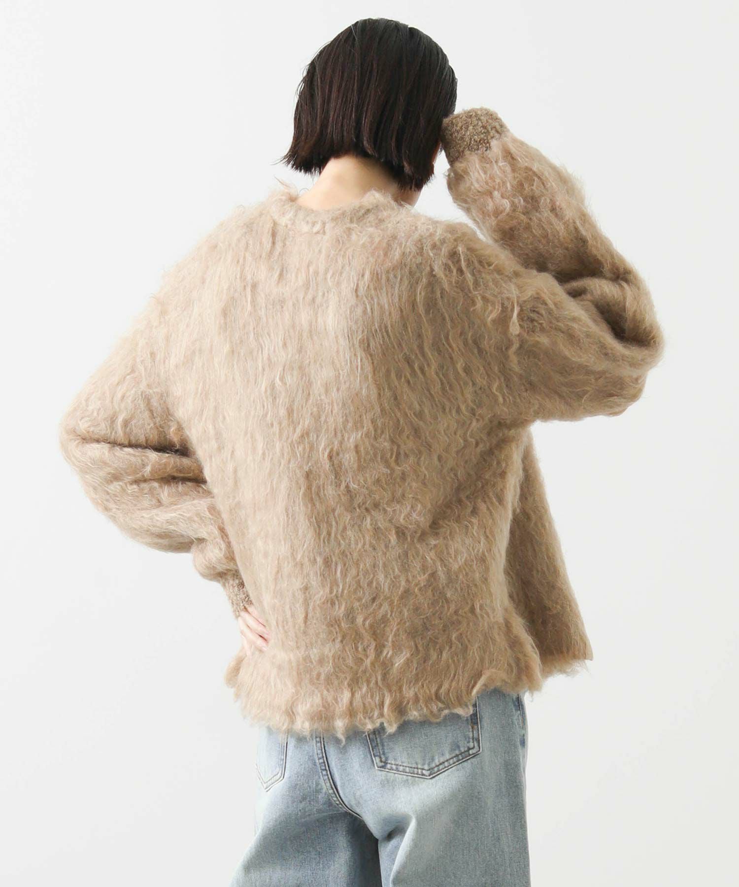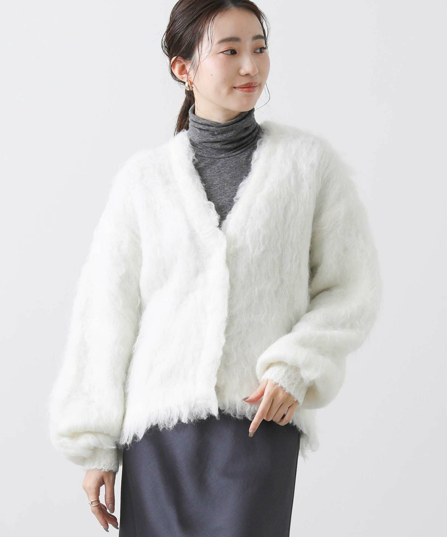 思わず触りたくなるふわふわの毛足が目を惹く、起毛加工のシャギーニットカーディガン。