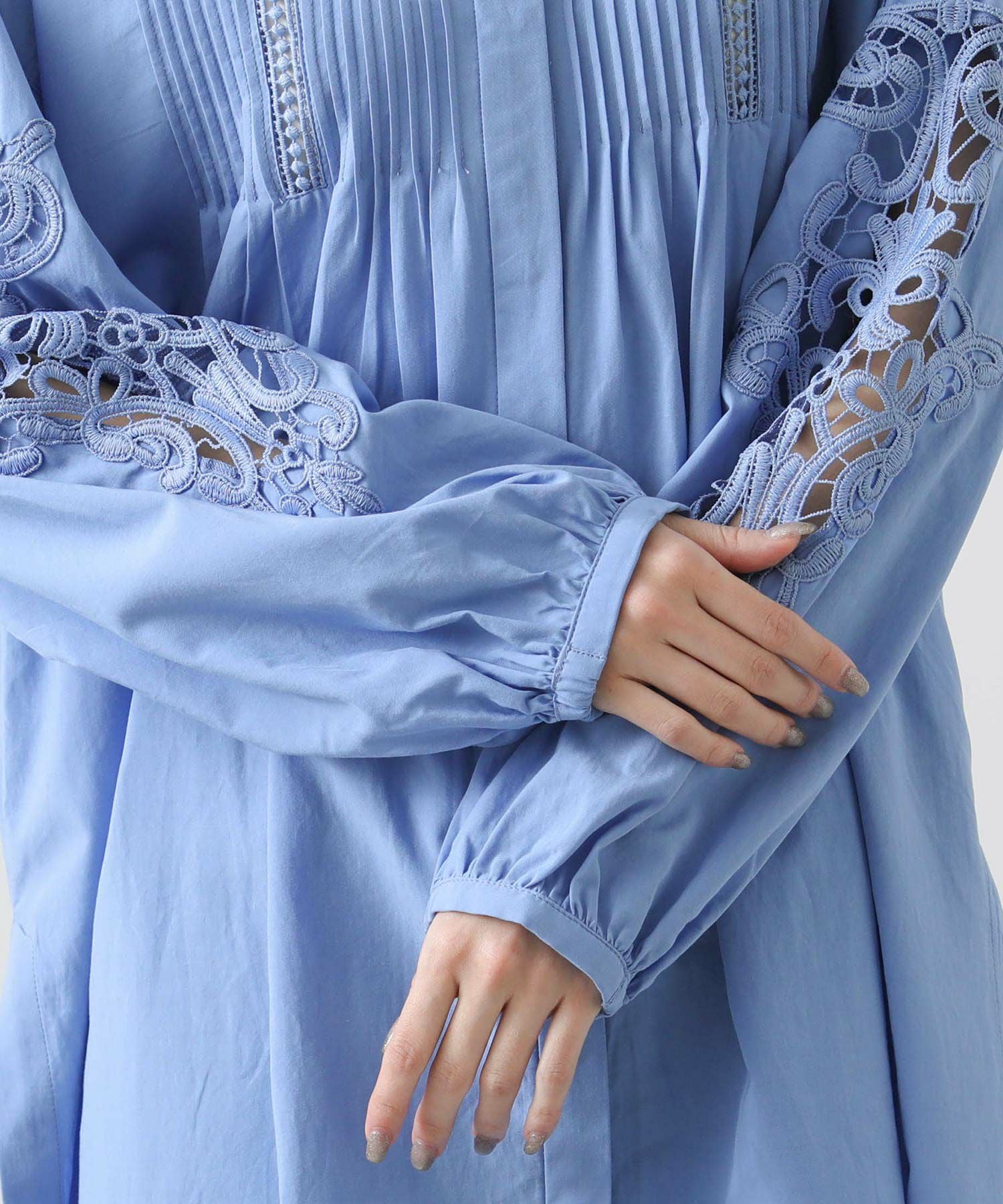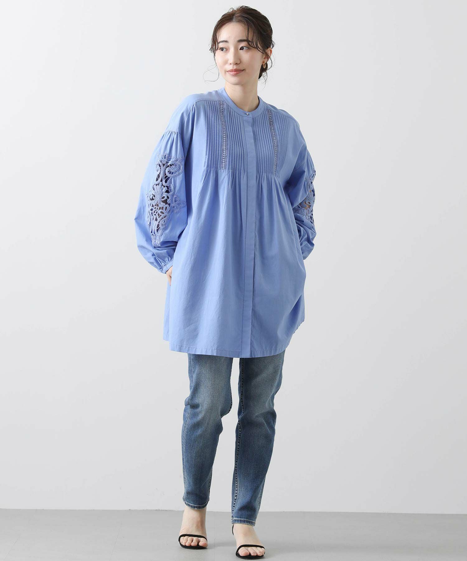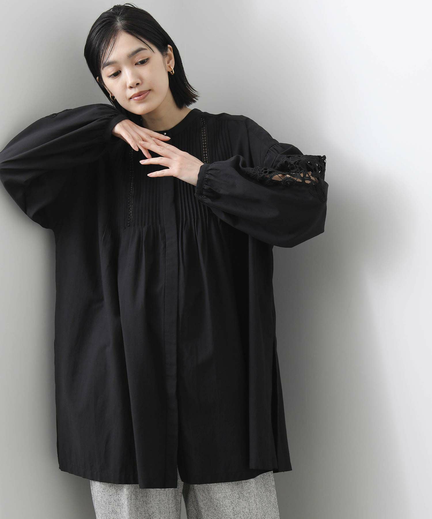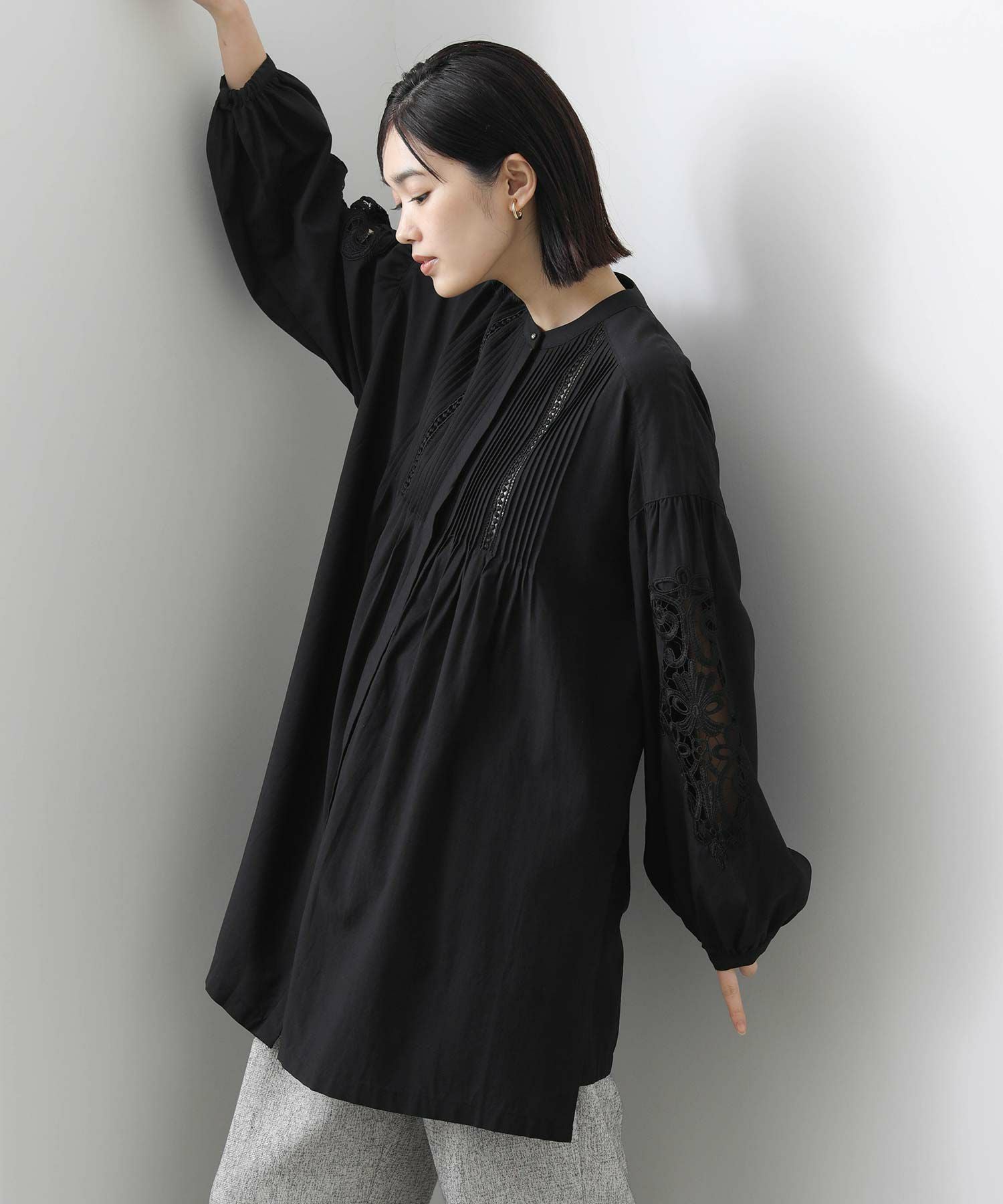 ぽわんとしたボリュームの袖に、程よい肌見せが叶う上品なモチーフレースをあしらったチュニックブラウス。