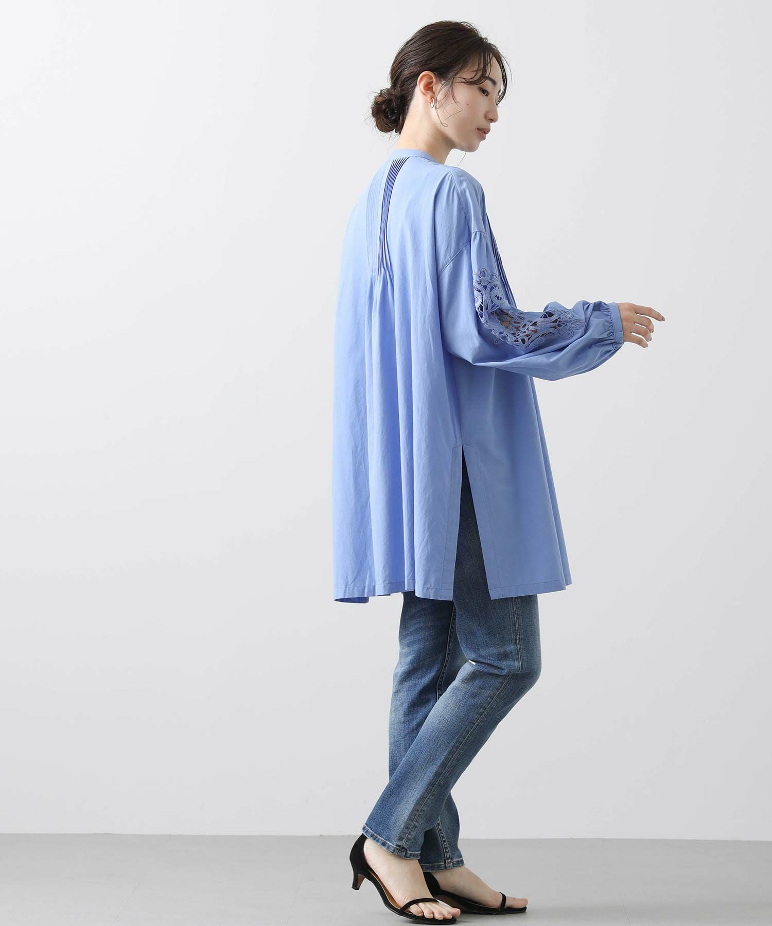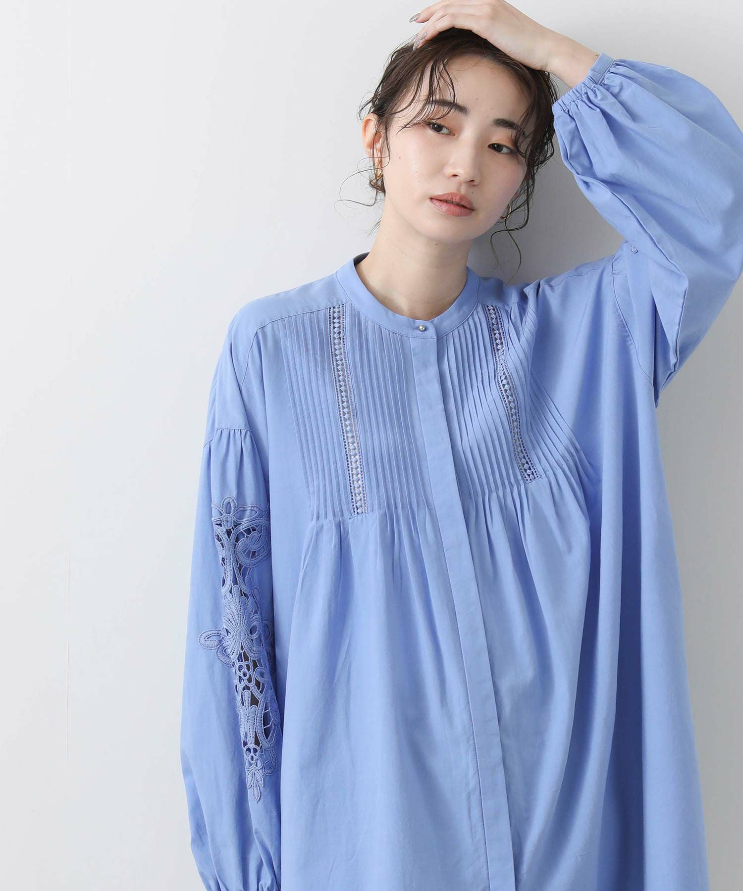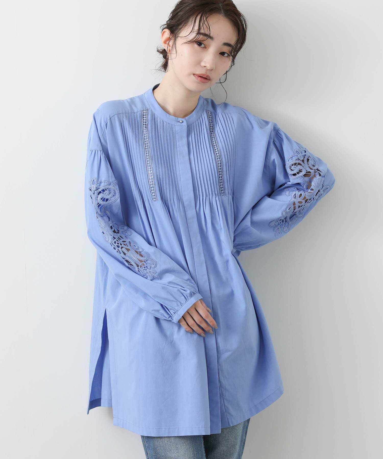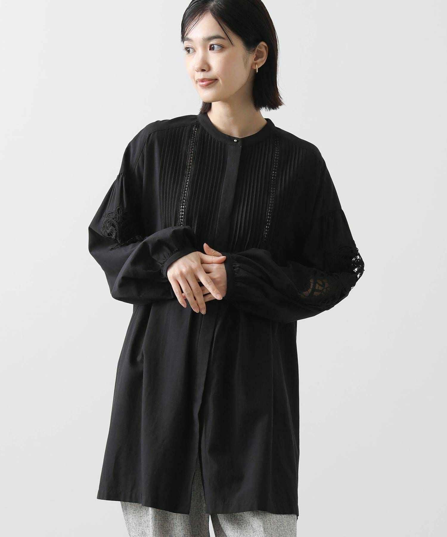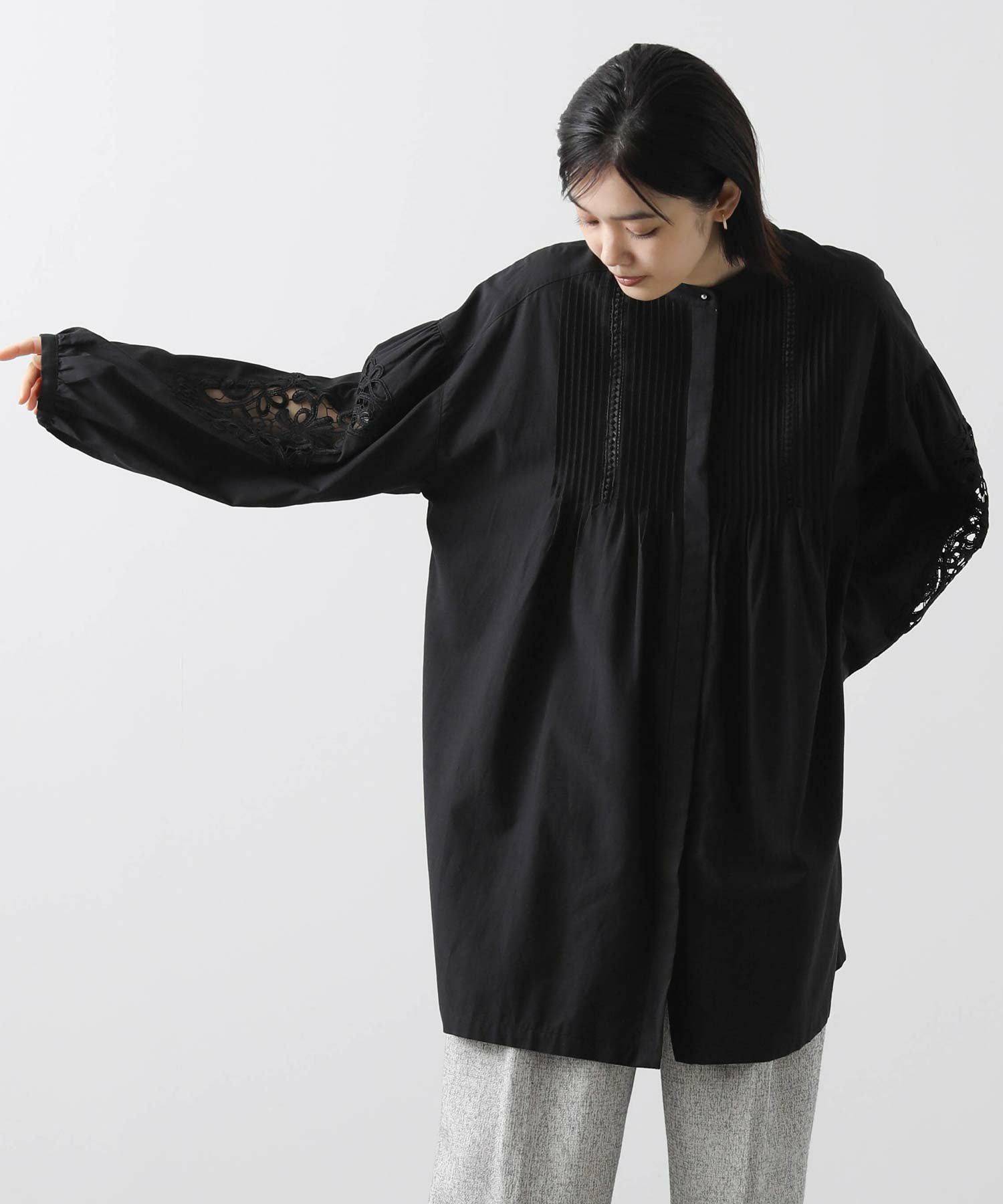 ぽわんとしたボリュームの袖に、程よい肌見せが叶う上品なモチーフレースをあしらったチュニックブラウス。