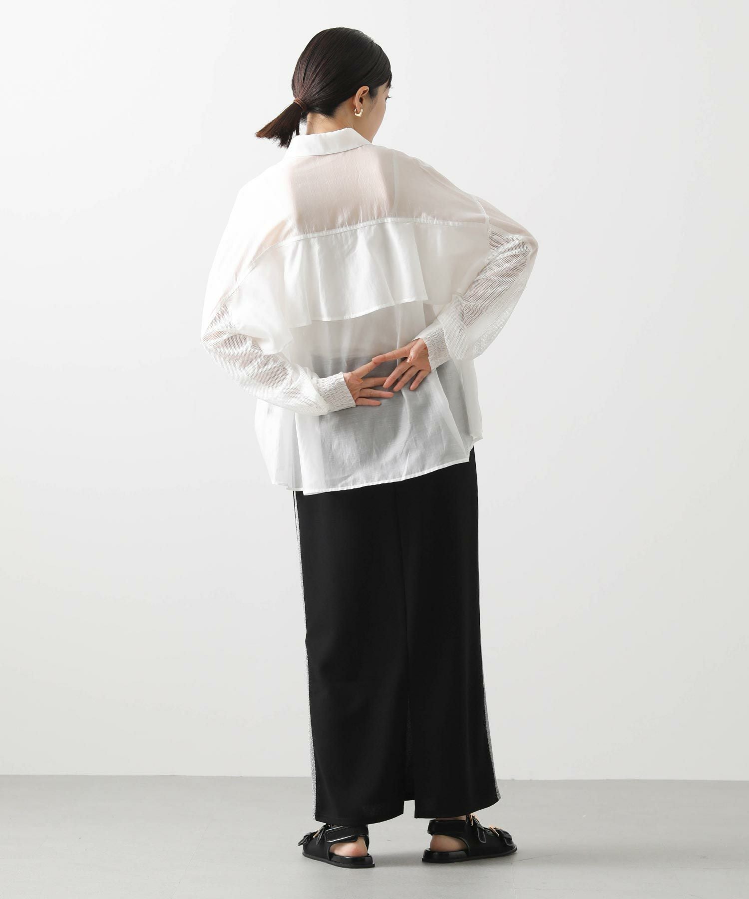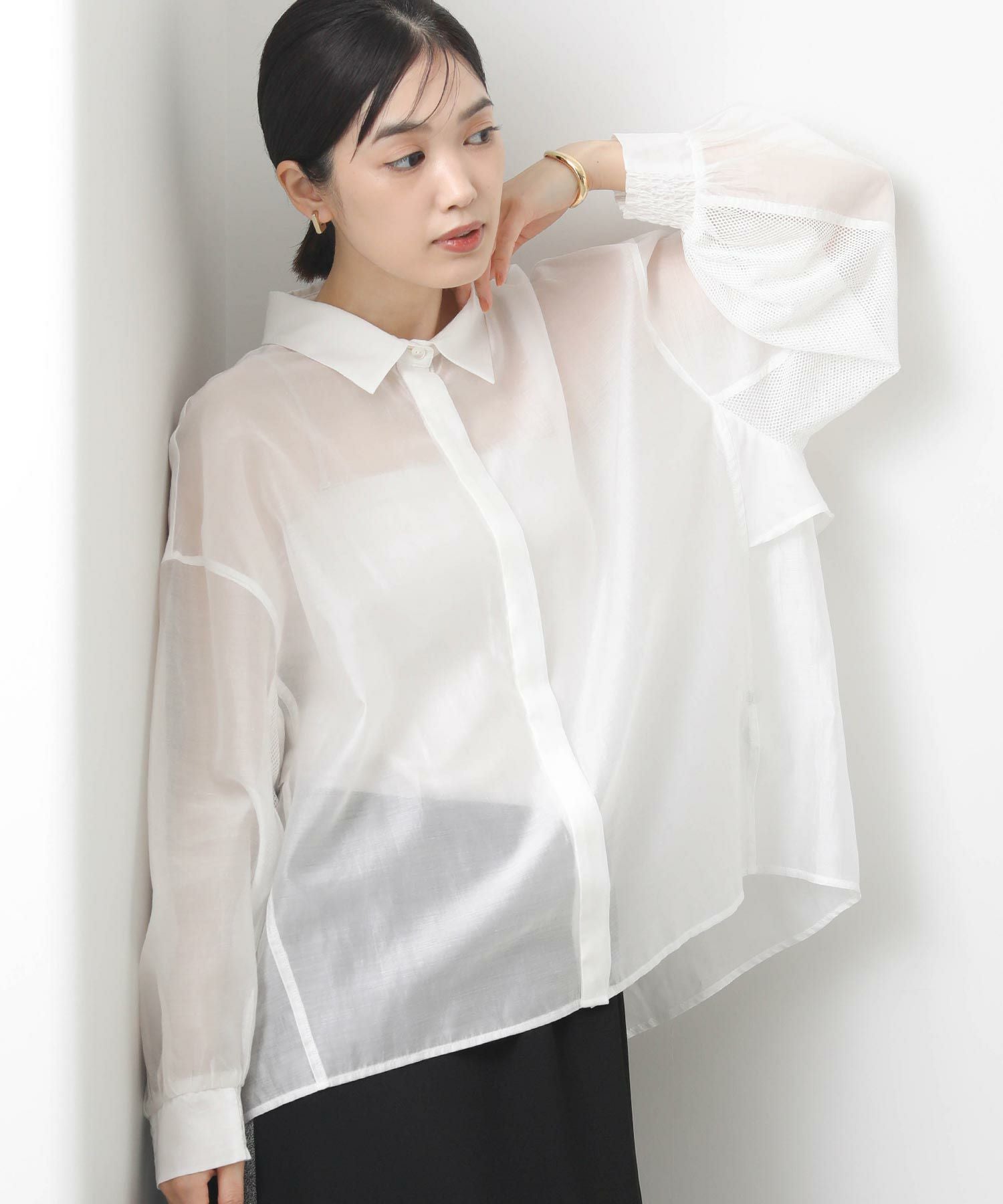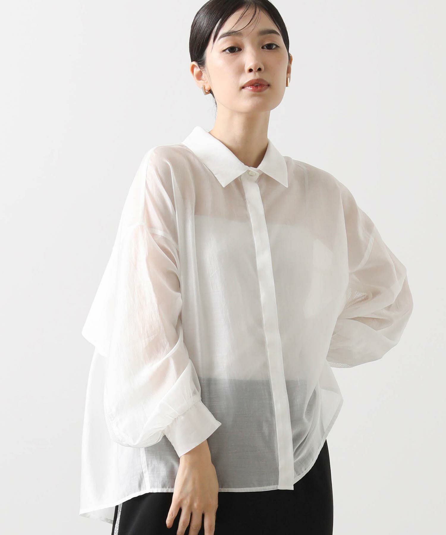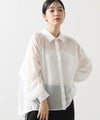 しなやかで光沢感のあり、程よい透け感のあるシアー素材のブラウス。
