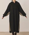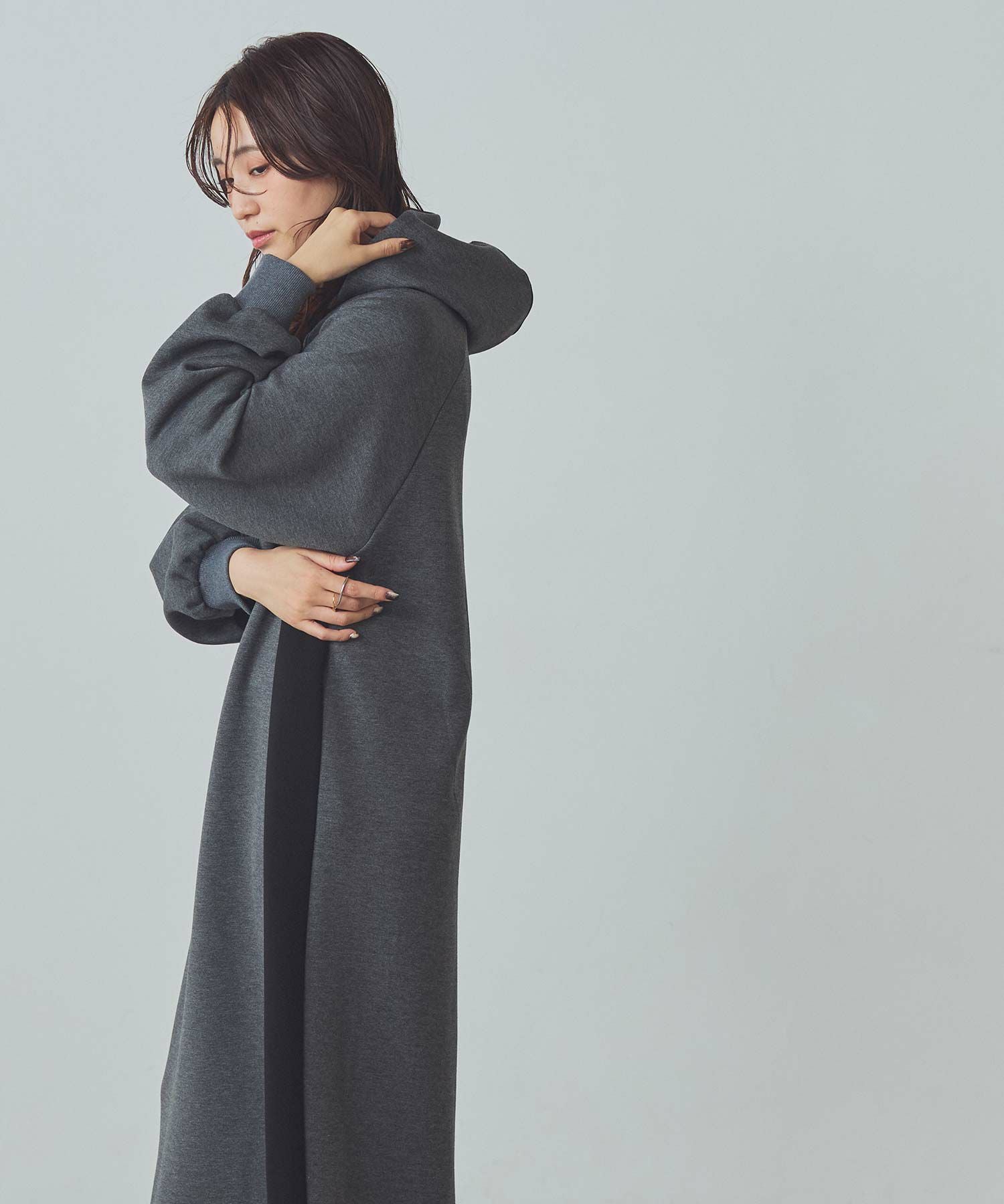 サイドラインから袖下のバイカラーがポイントのフーディワンピース。