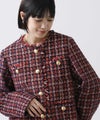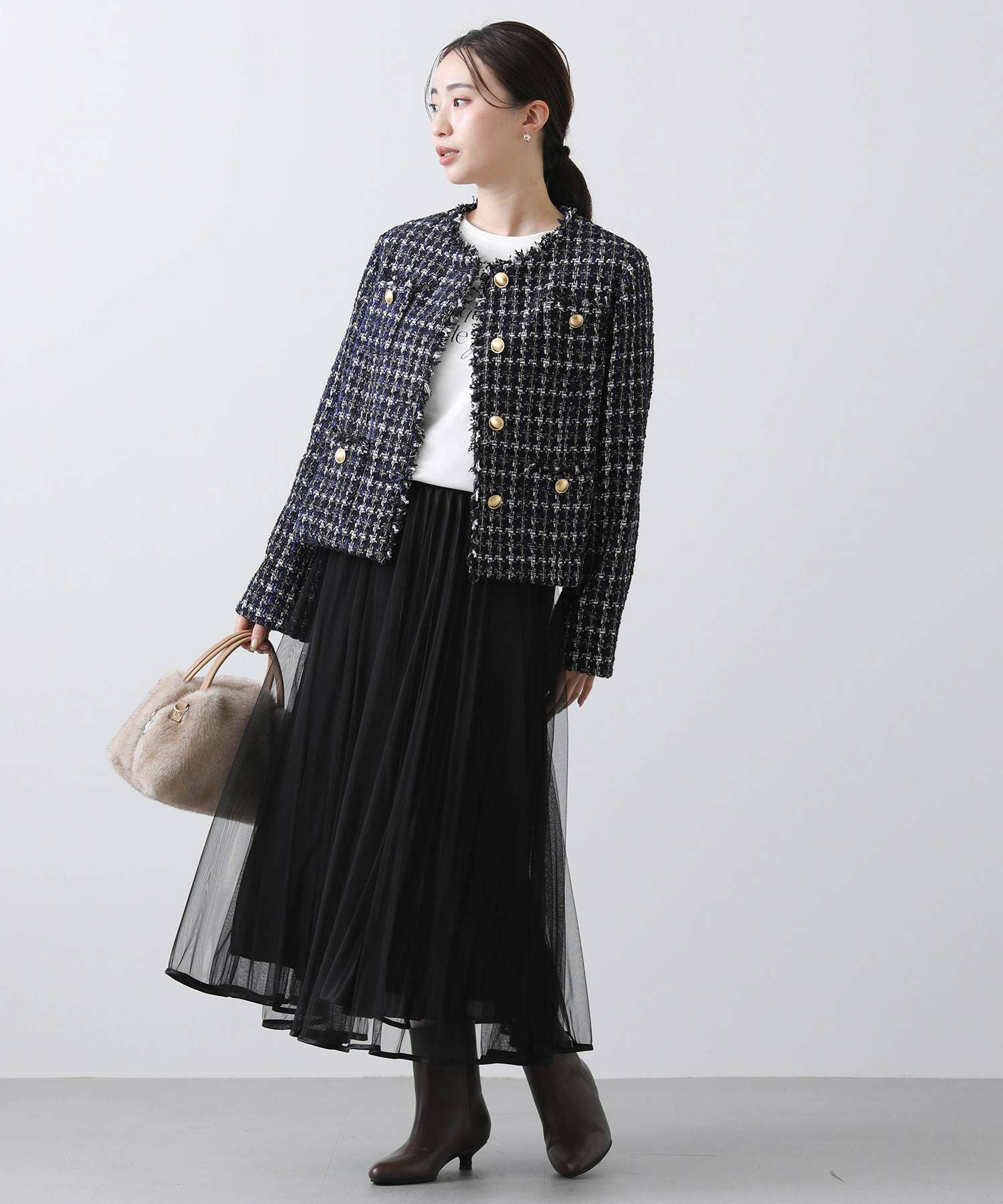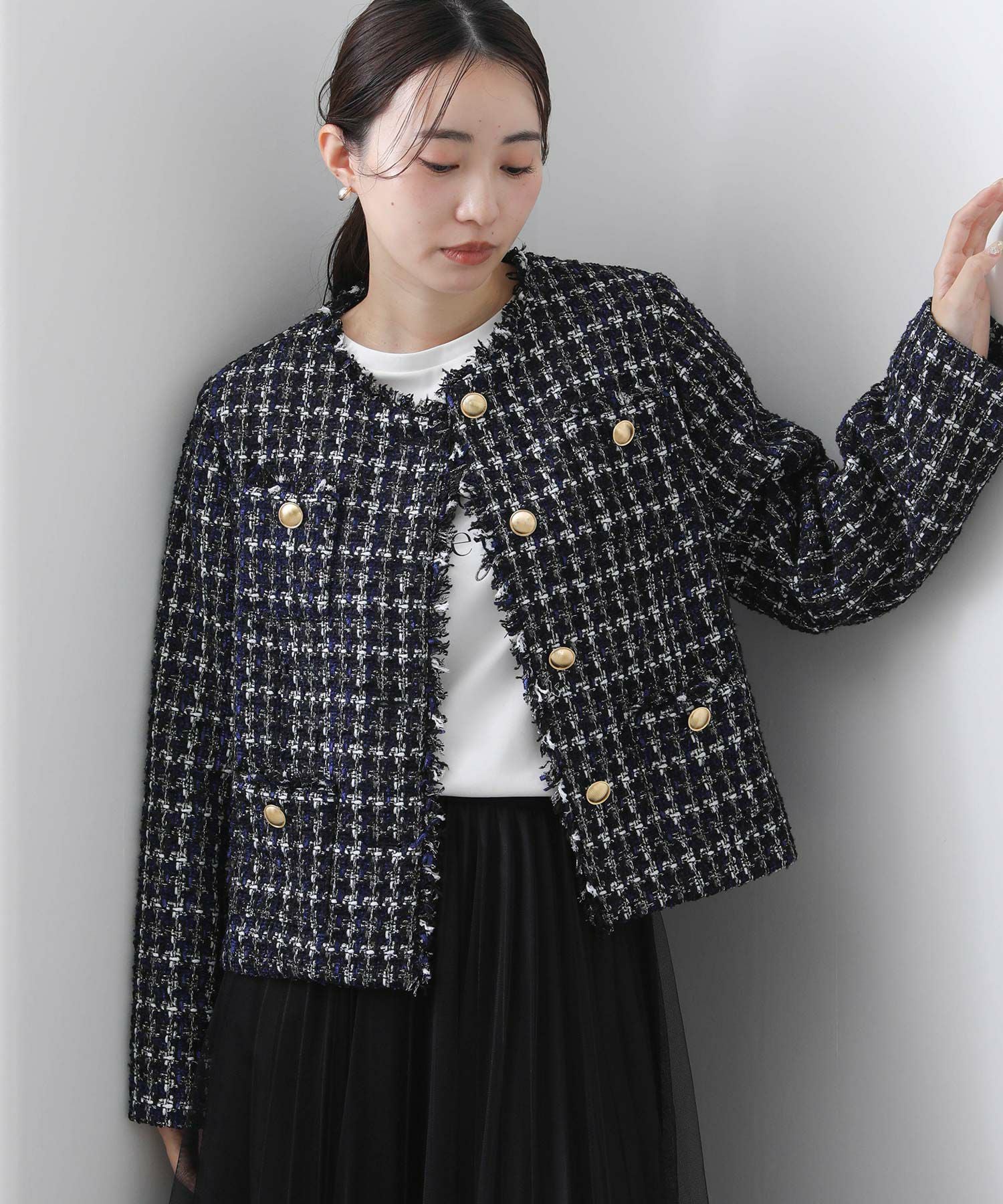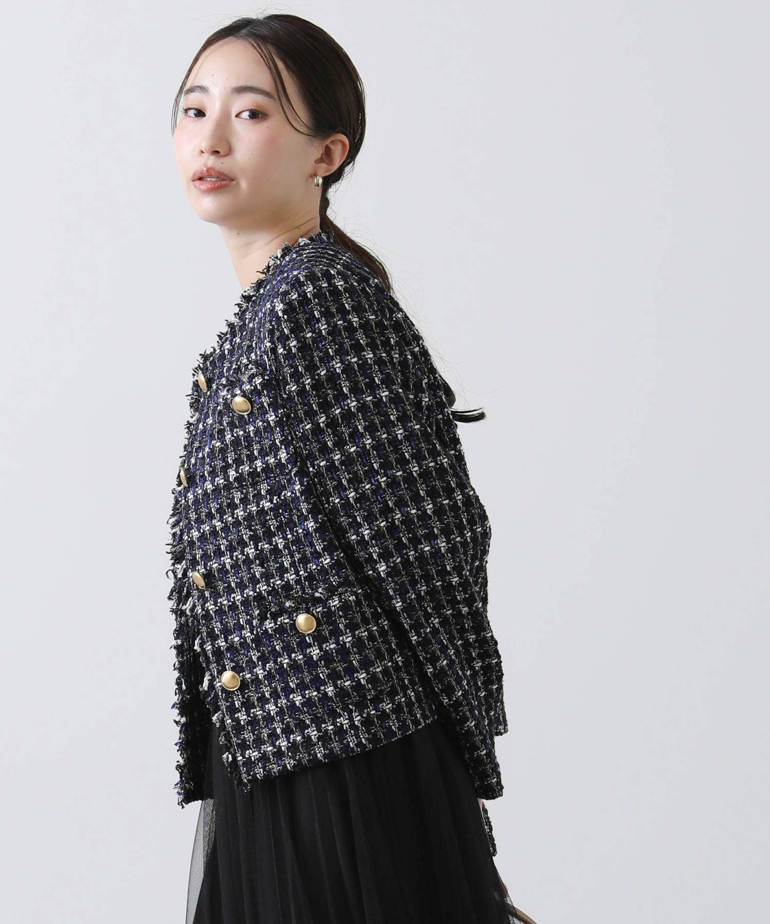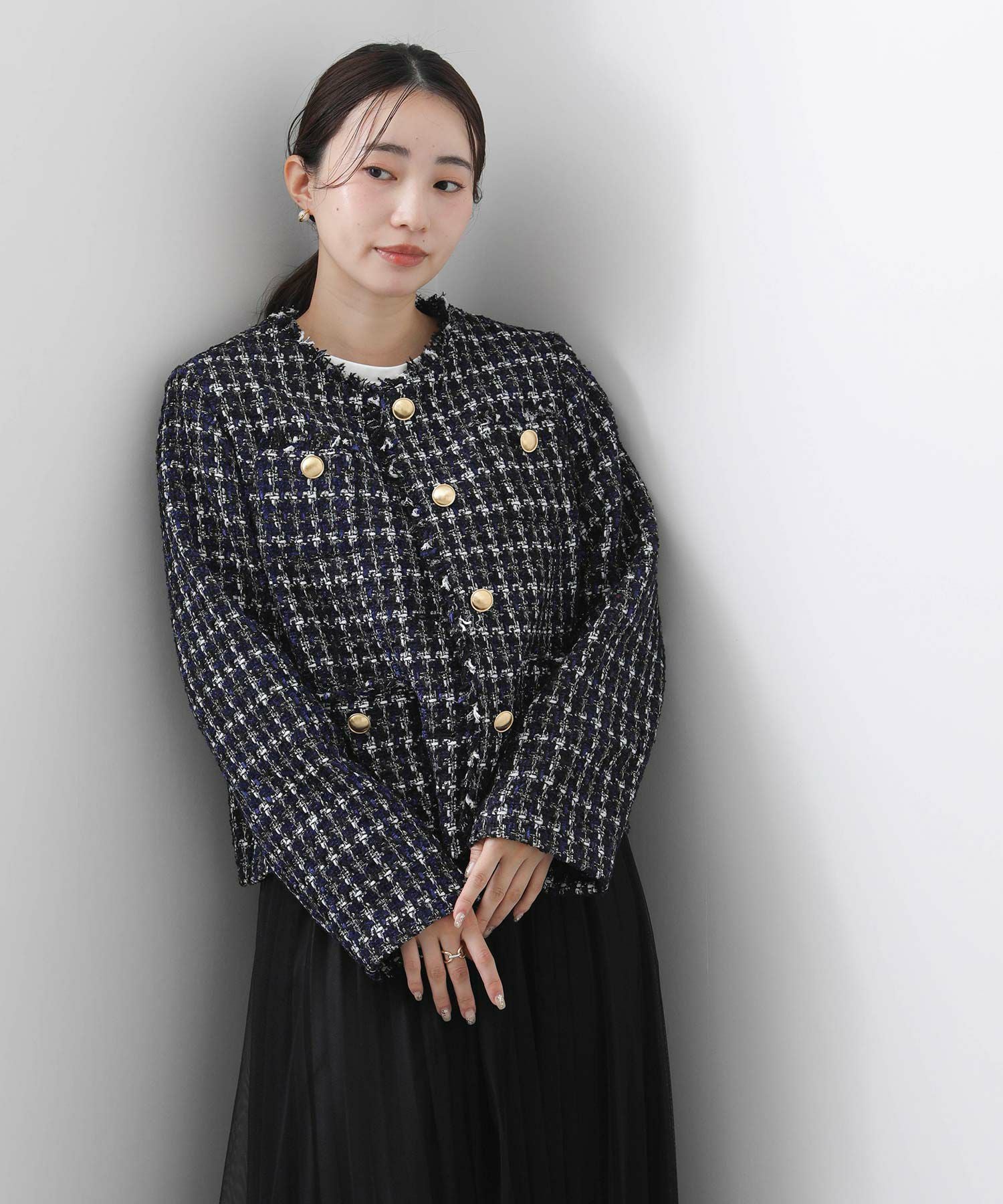 ラメ糸を一緒に織り込んだ華やかな素材に、金ボタンがクラス感をアップ。
