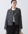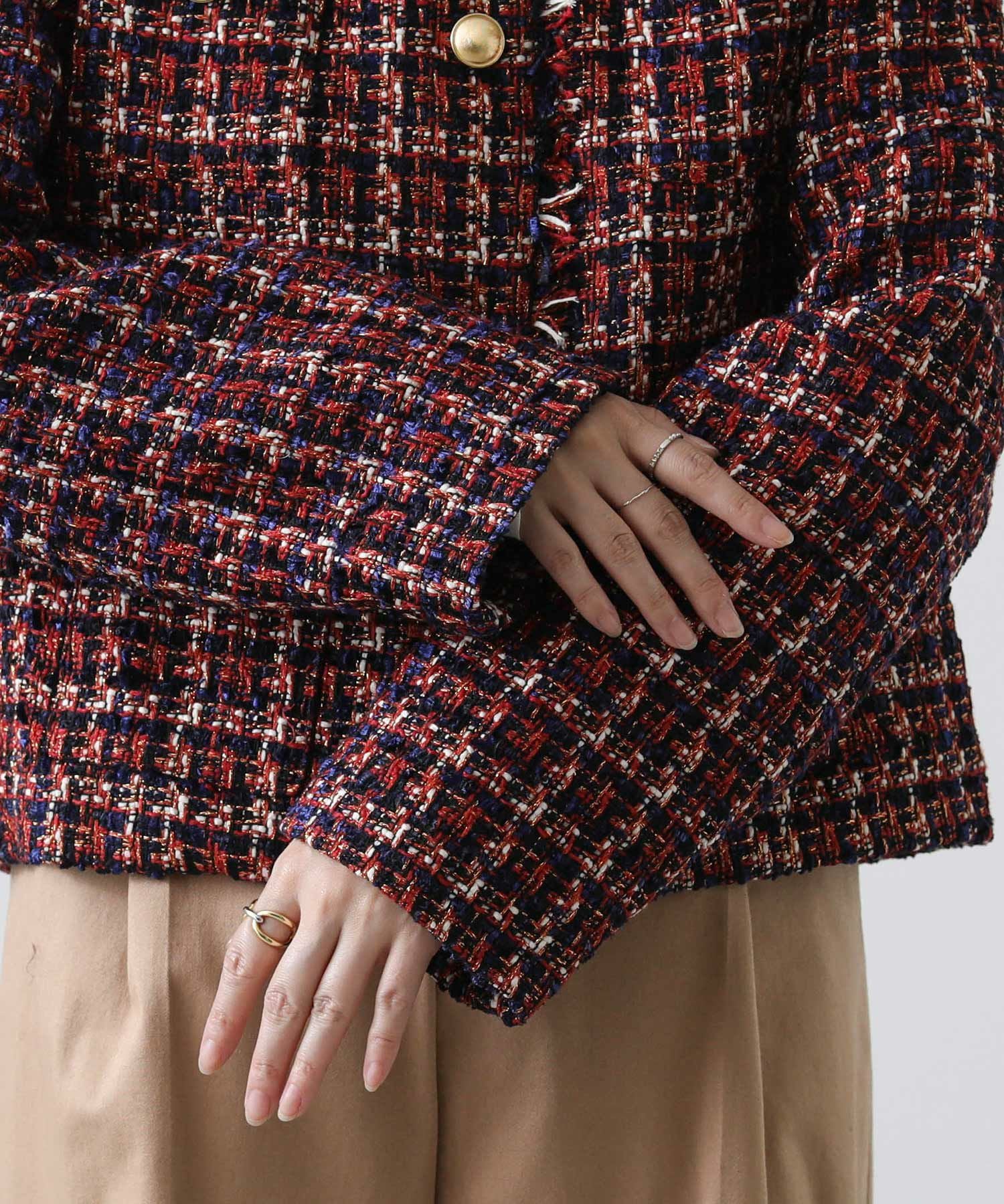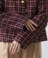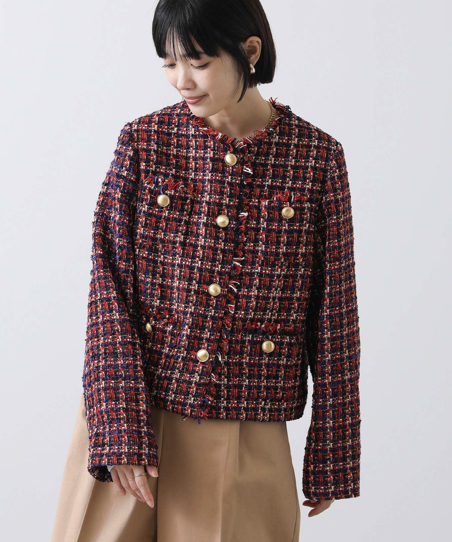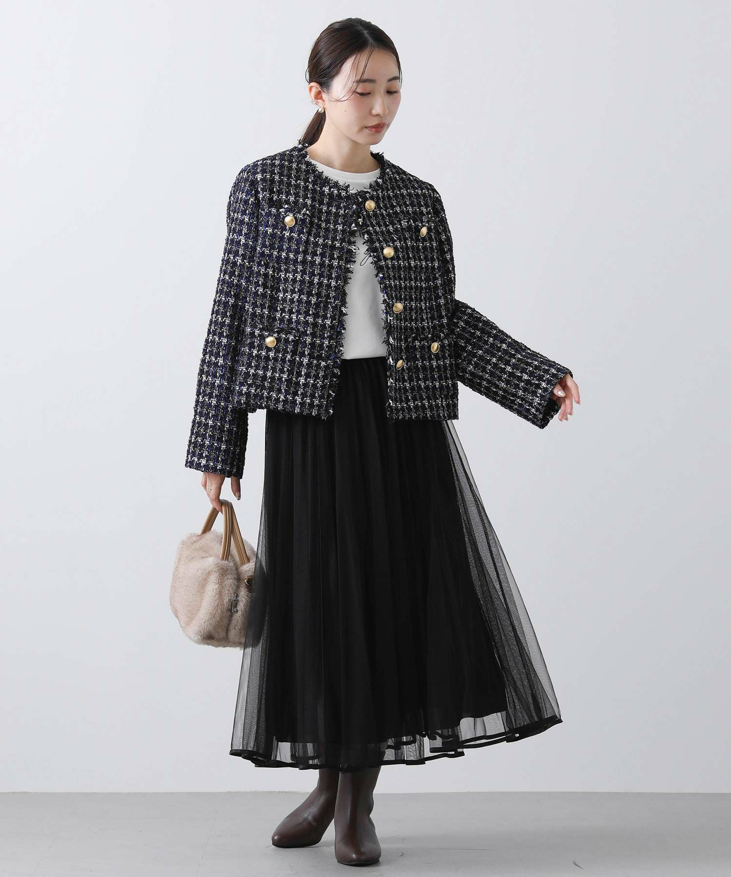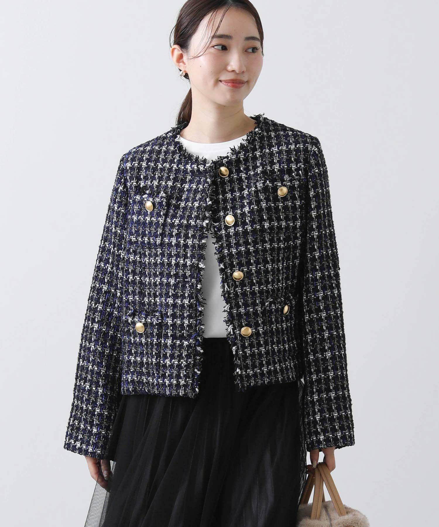 ラメ糸を一緒に織り込んだ華やかな素材に、金ボタンがクラス感をアップ。