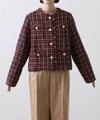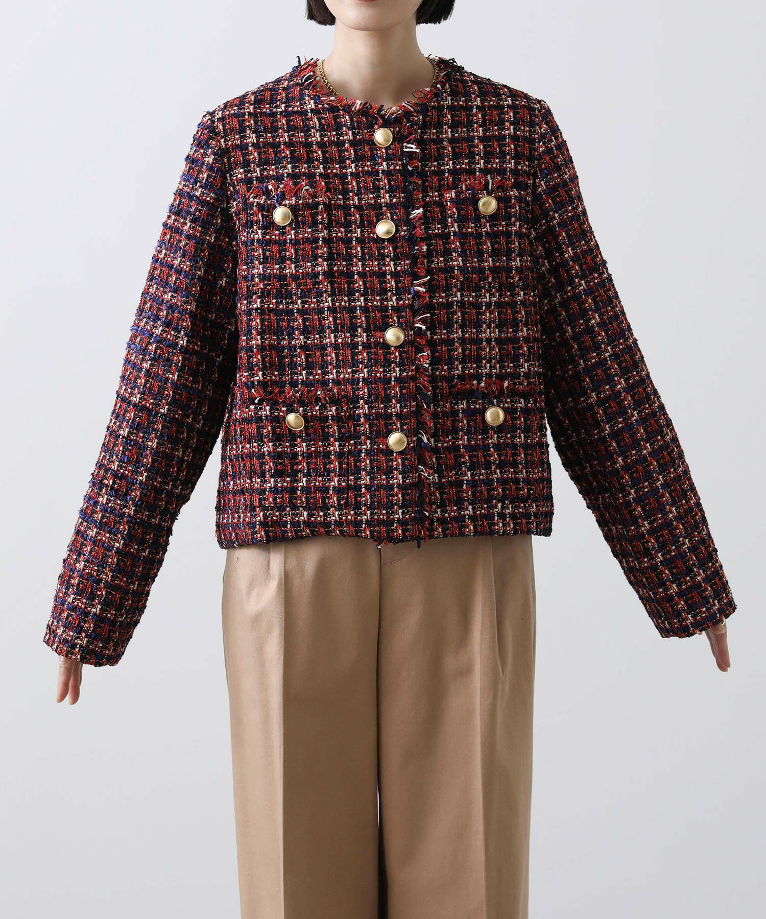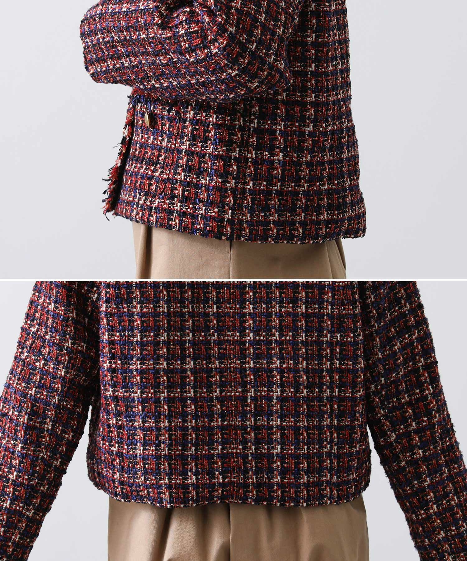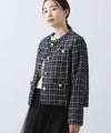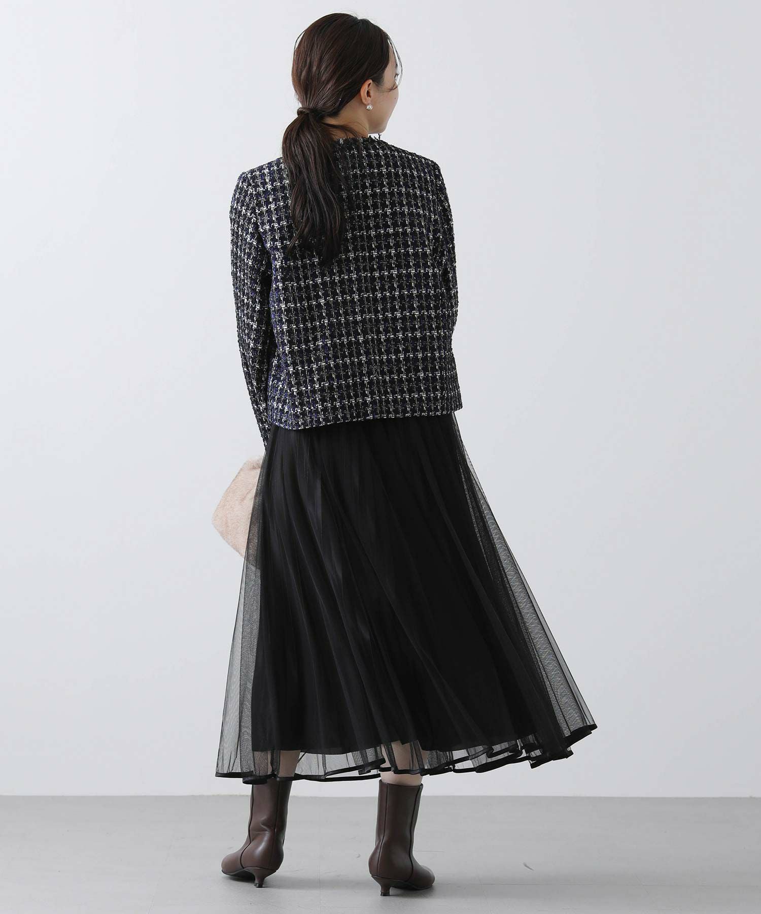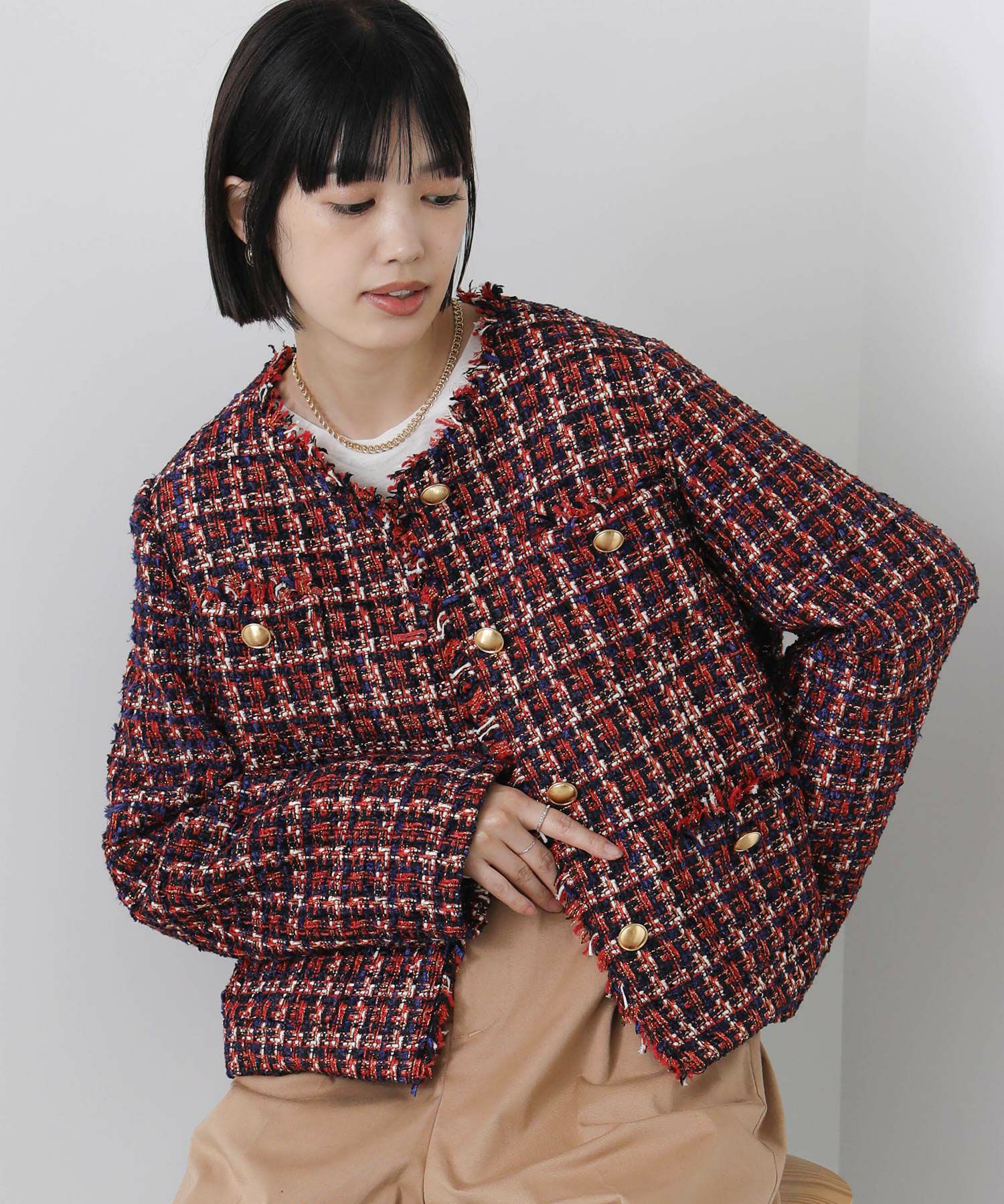 ラメ糸を一緒に織り込んだ華やかな素材に、金ボタンがクラス感をアップ。