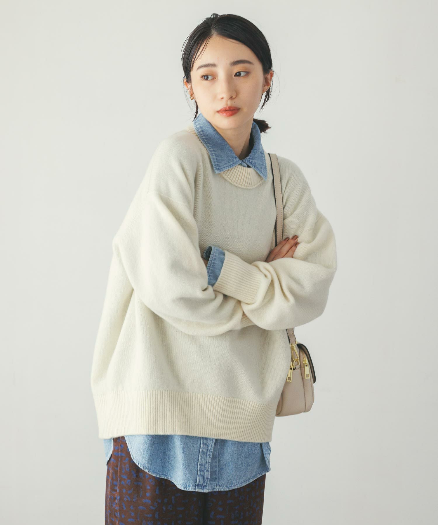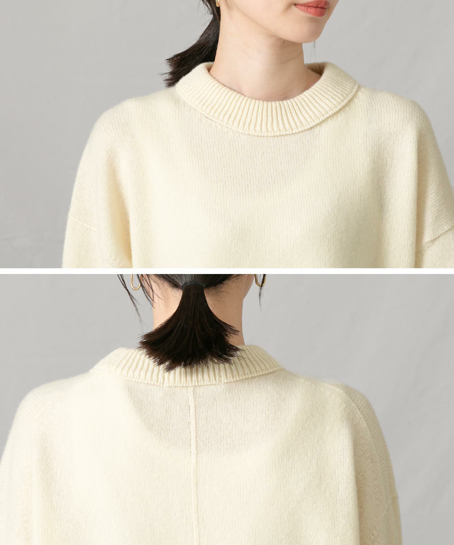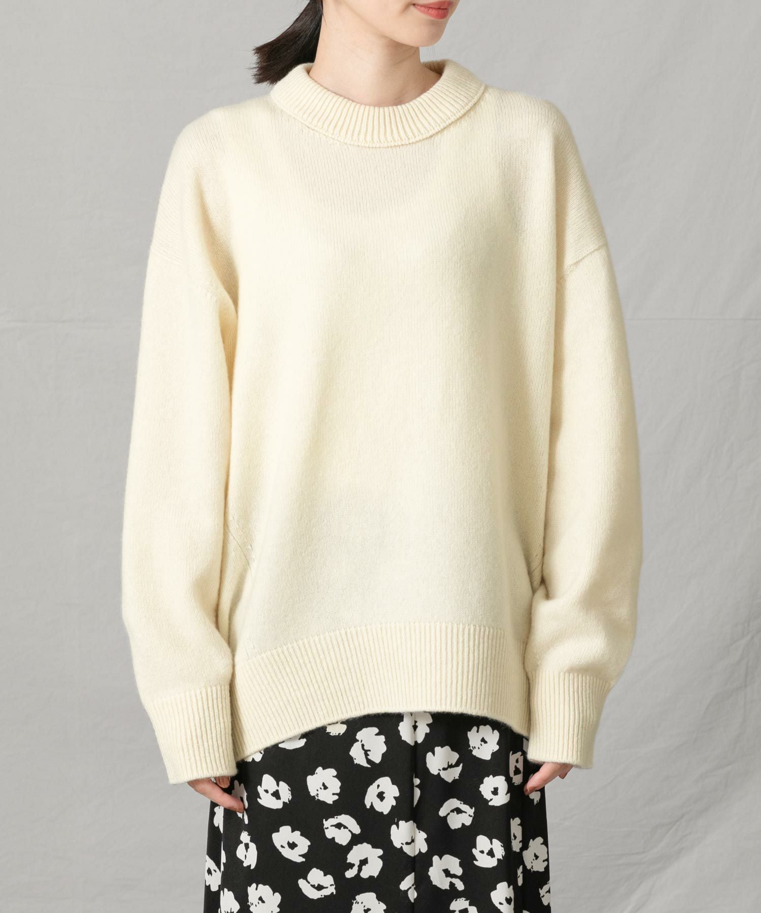 ホールガーメントニットは縫い目が無いので着心地が良く、膨らみのあるシルエットが魅力です。ベーシックなデザインですが、立体感のあるクルーネックのリブがポイントに。