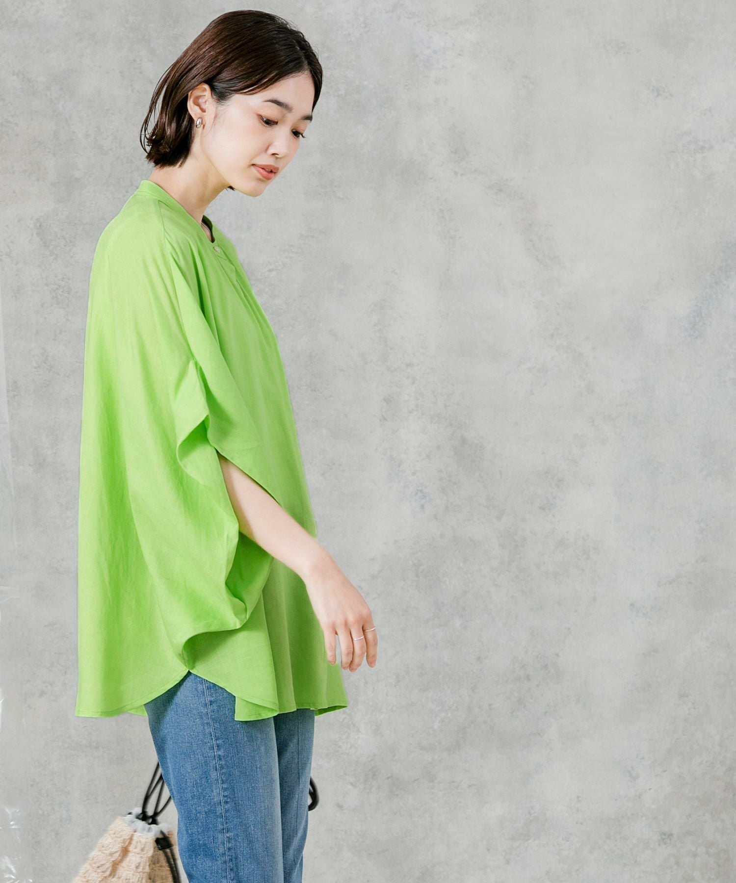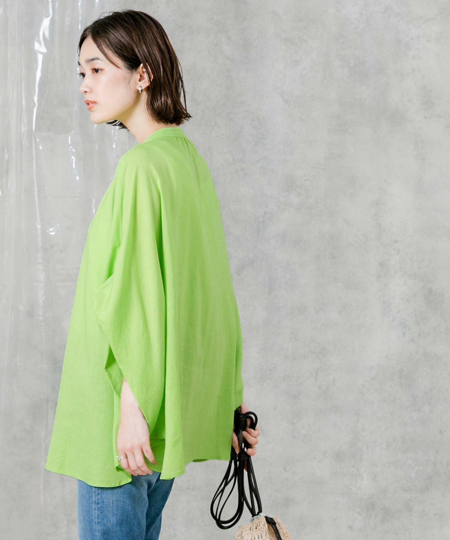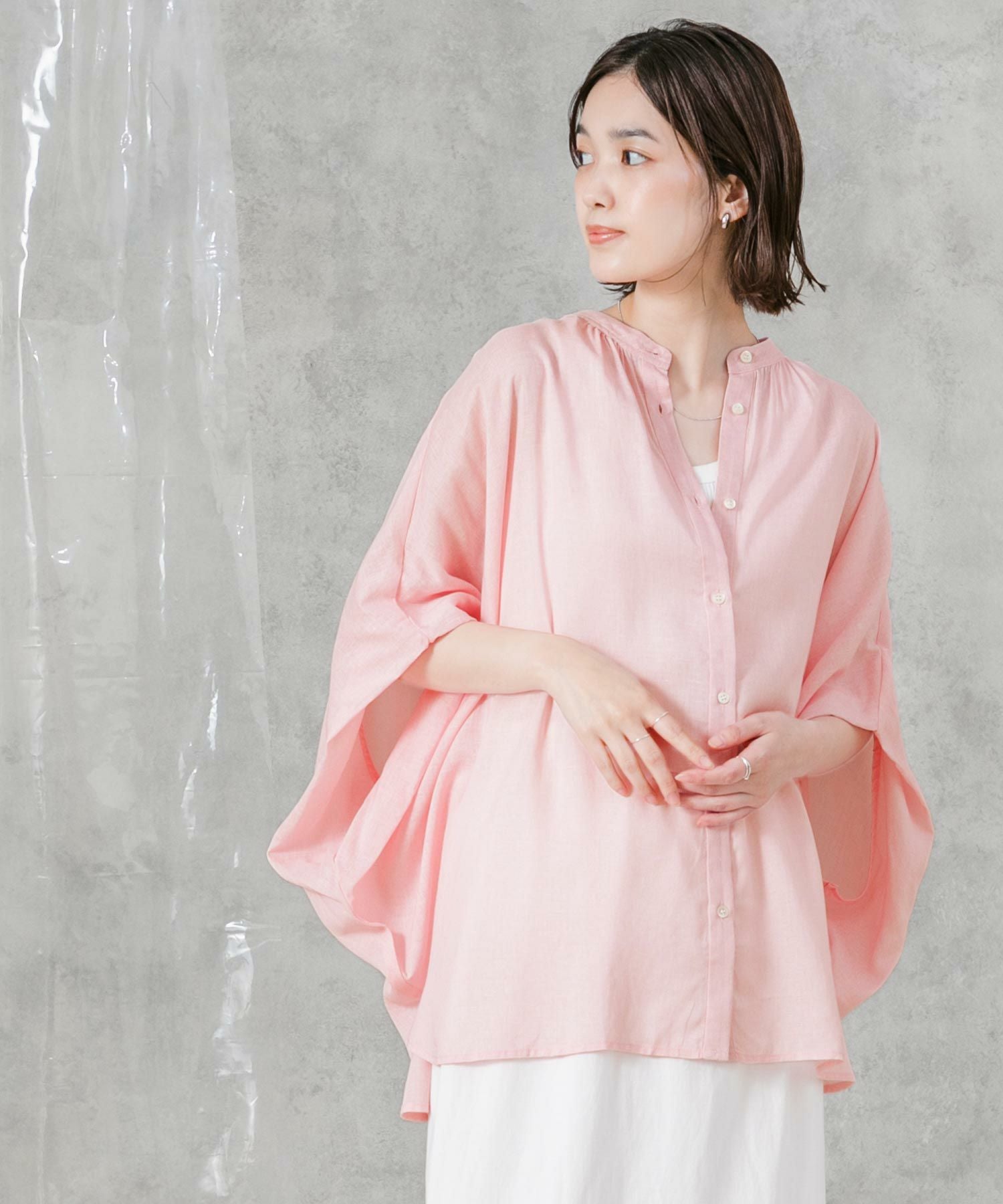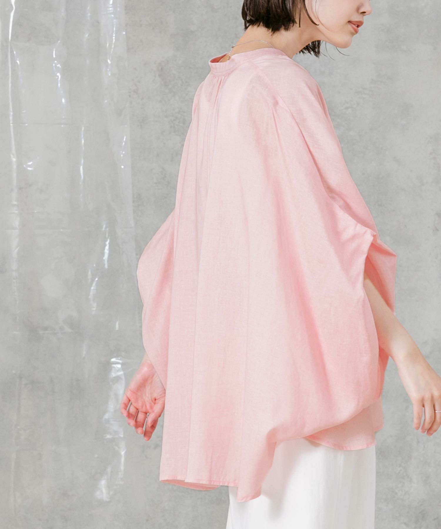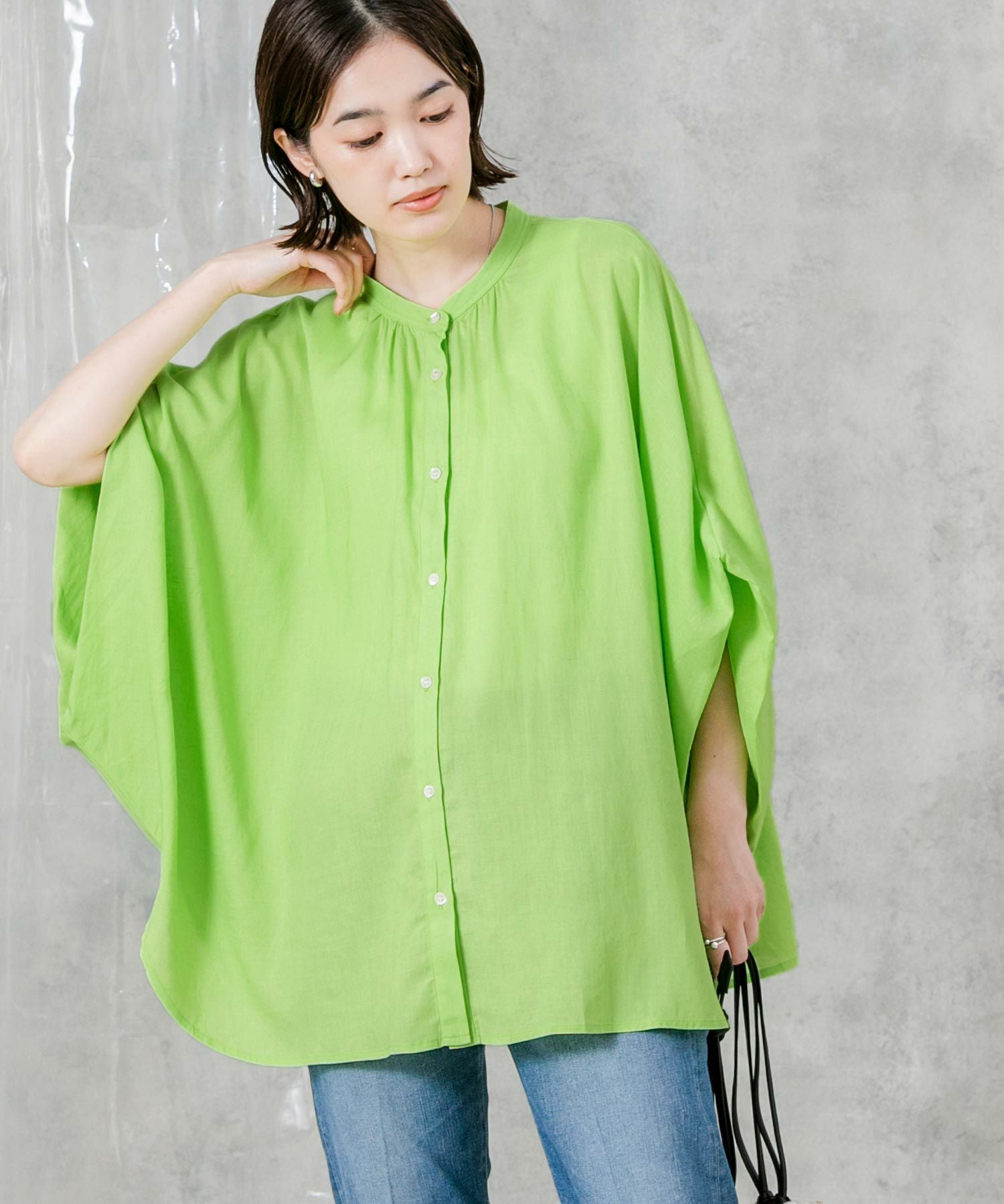 柔らかいカラーでゆったりしたサイズ感が魅力のポンチョシルエットシャツ。大人のリラックススタイルにぴったりなアイテムです。