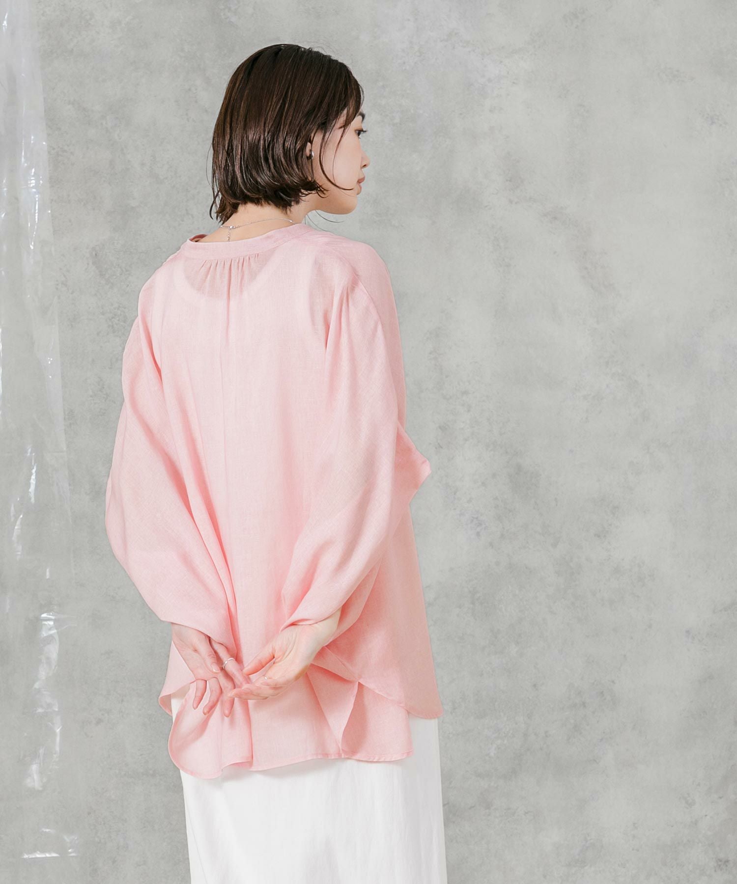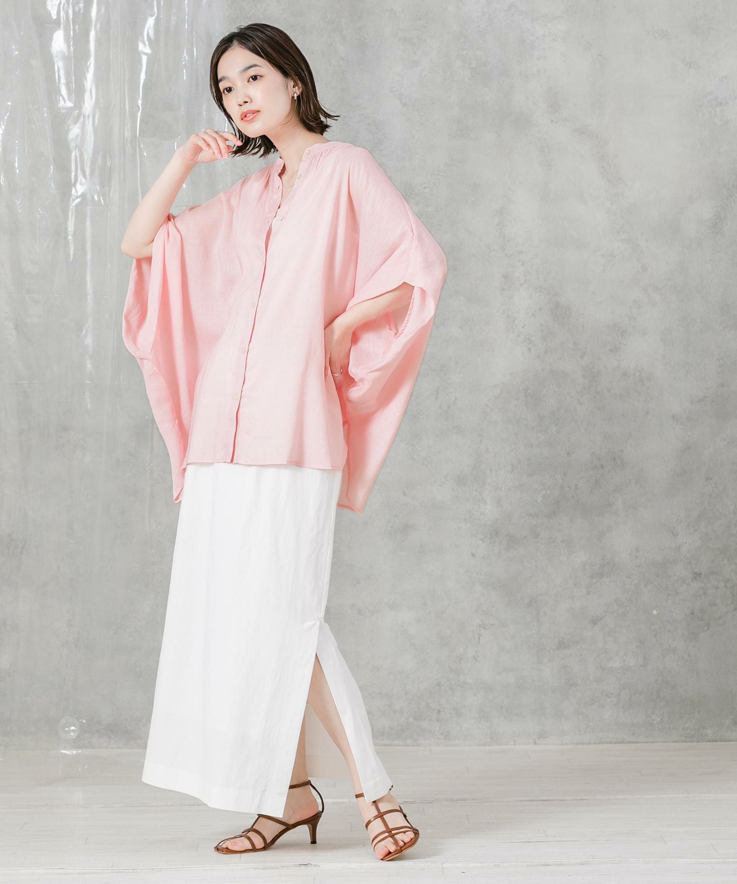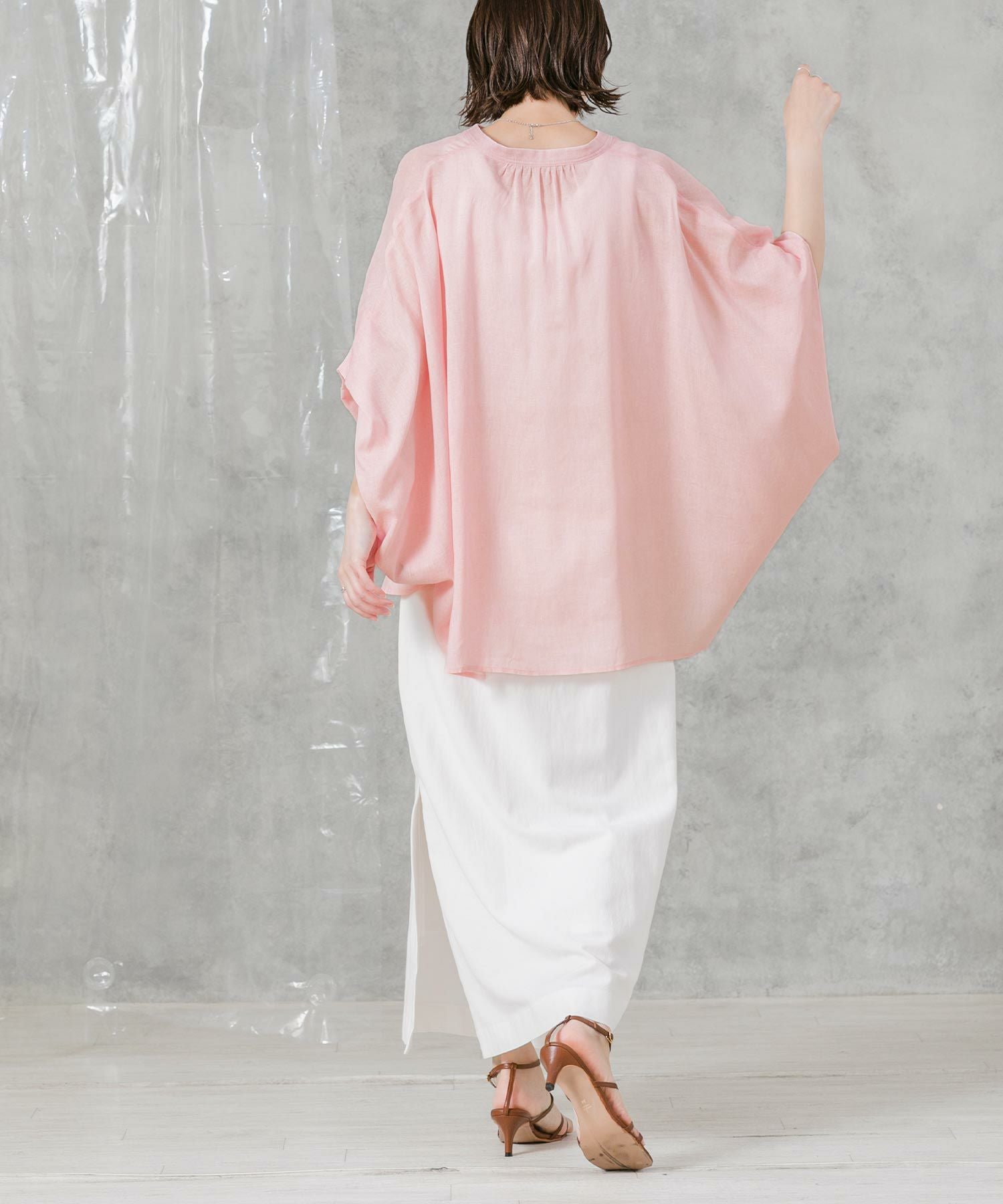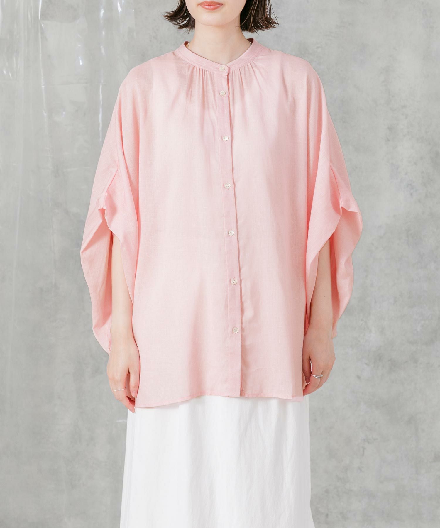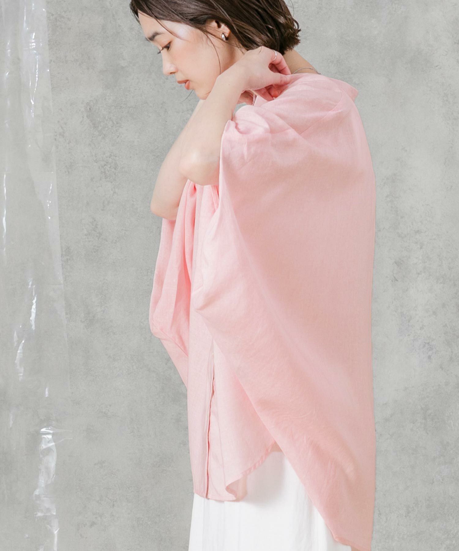 柔らかいカラーでゆったりしたサイズ感が魅力のポンチョシルエットシャツ。大人のリラックススタイルにぴったりなアイテムです。