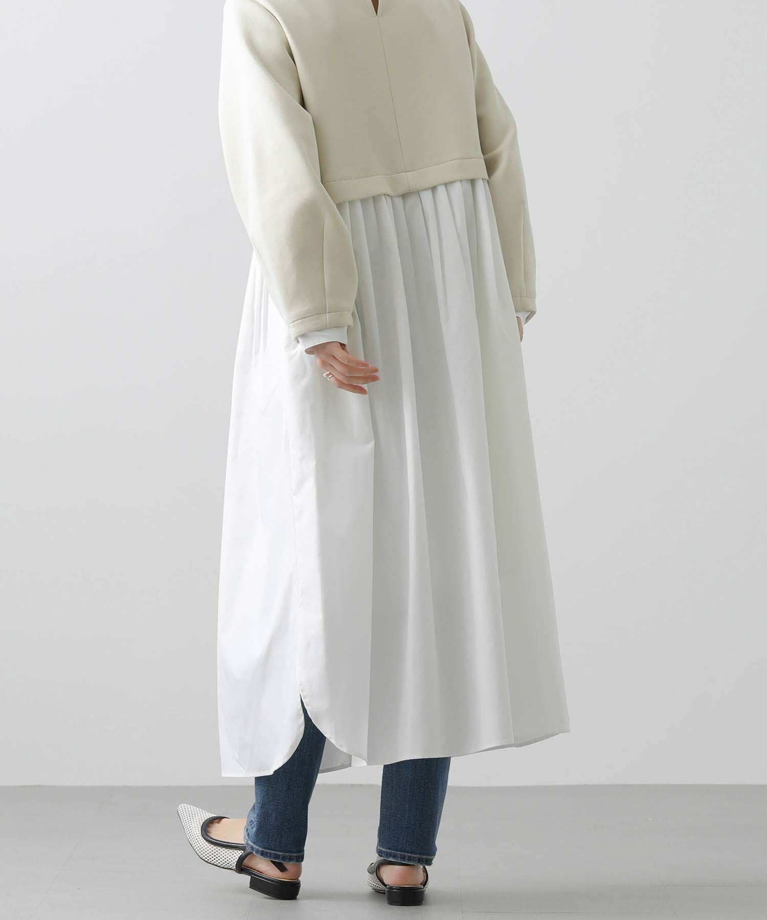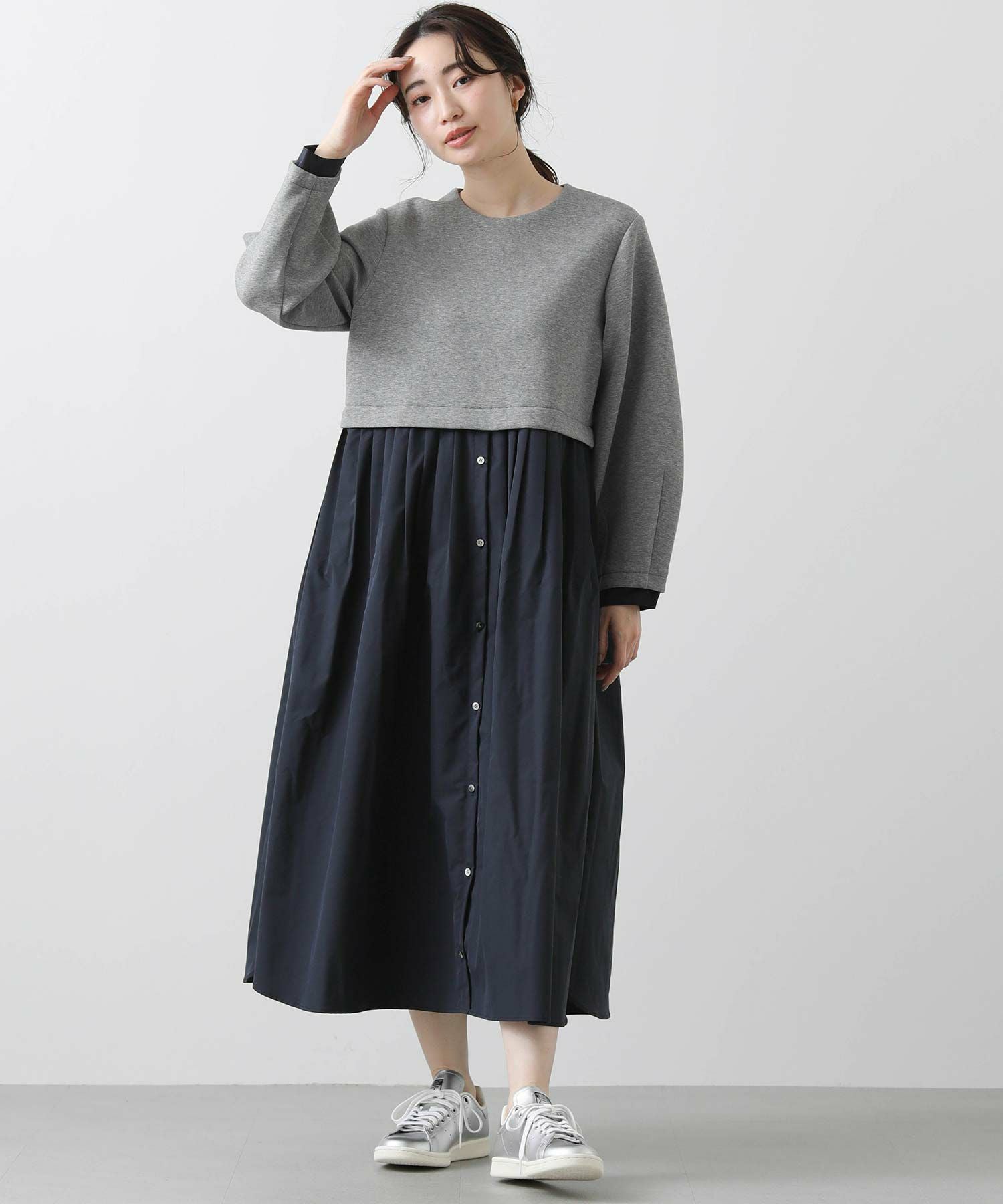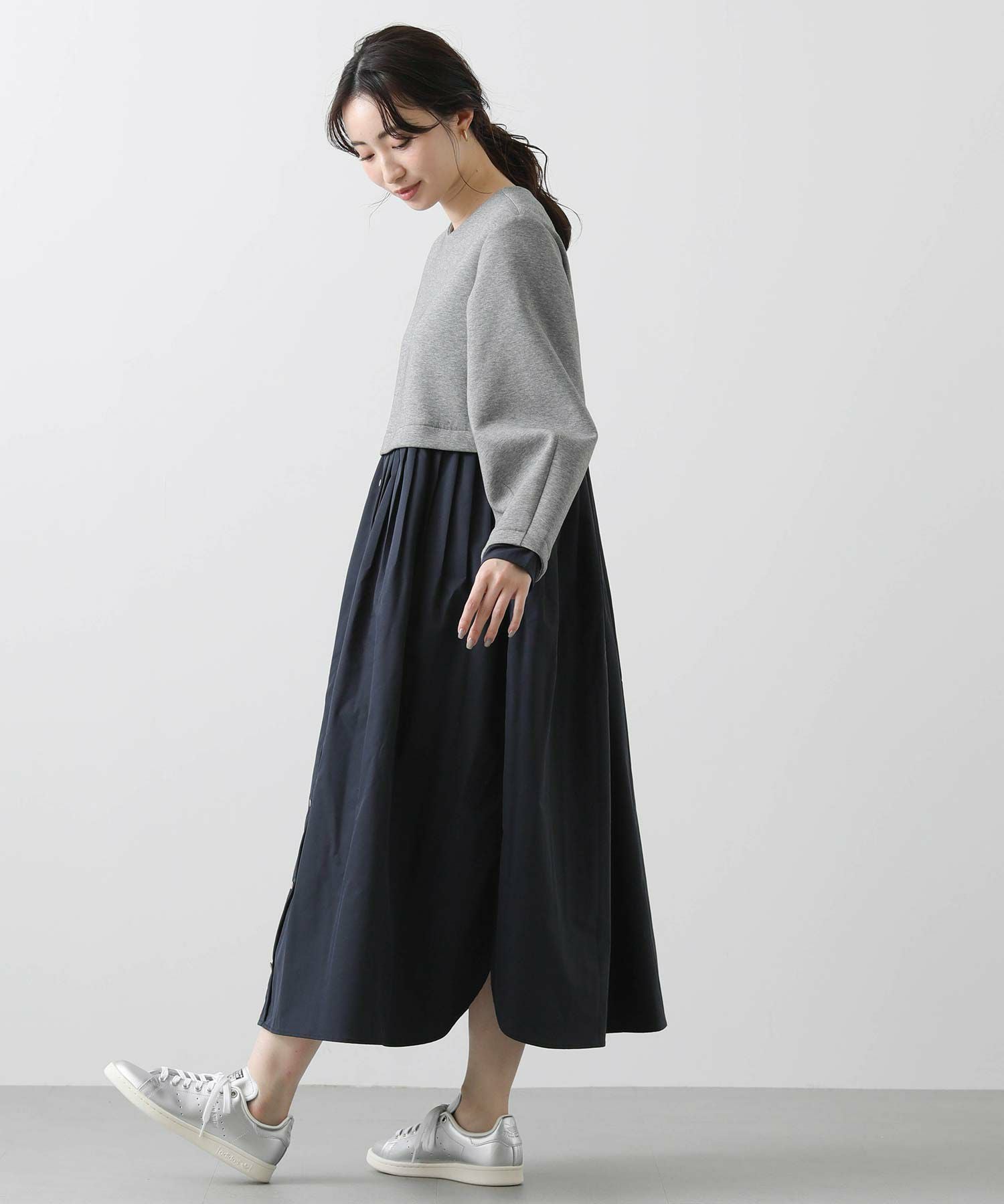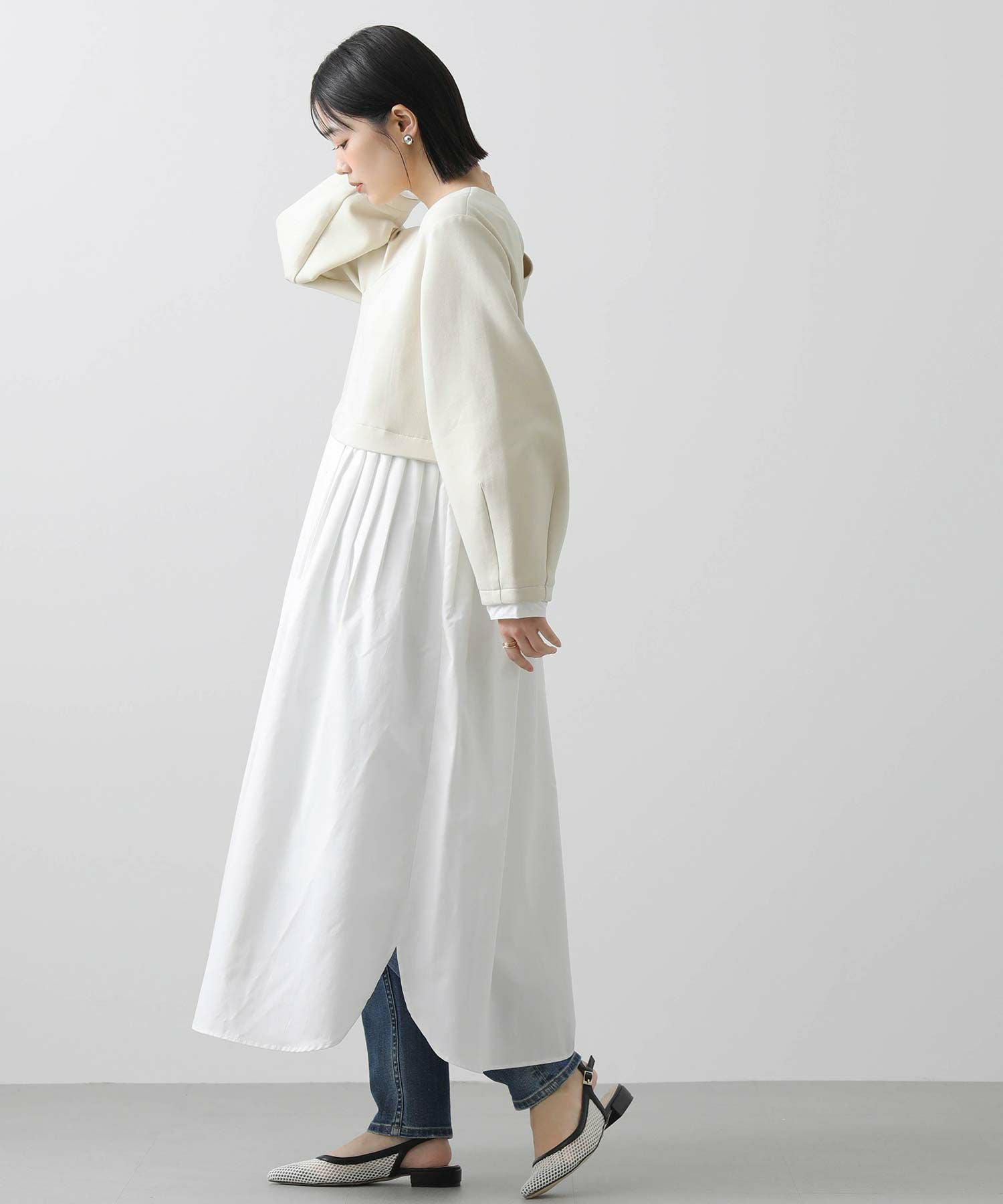 ウエストを少し高めの位置で切り替えて、スタイルアップして見えるバランスに仕上げました。