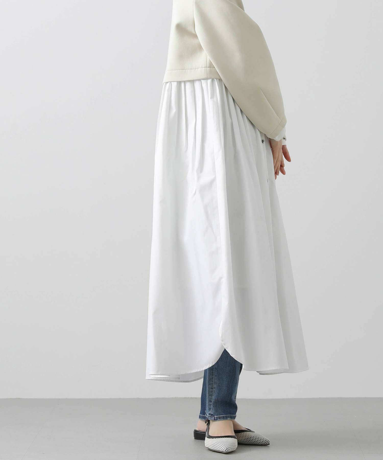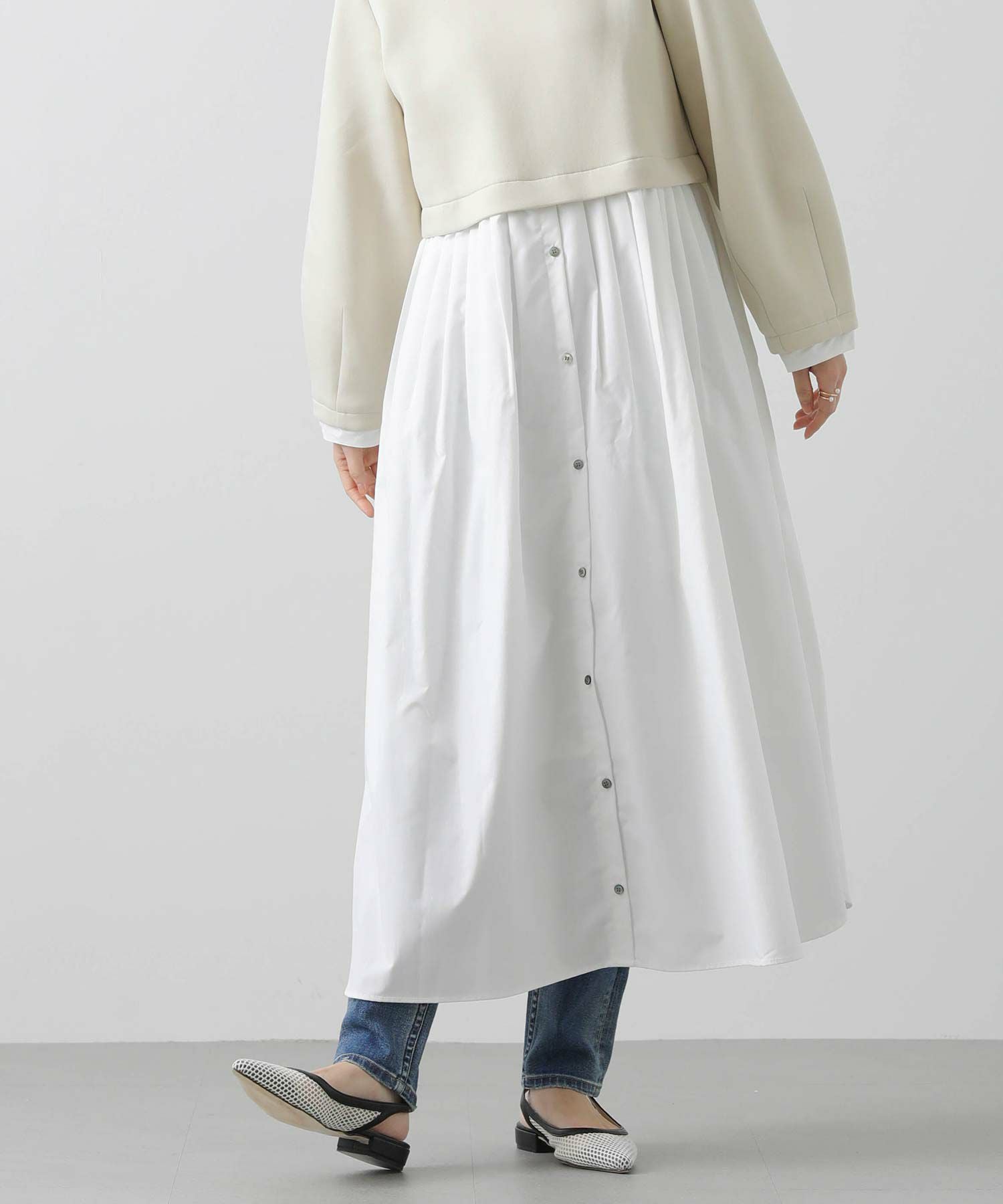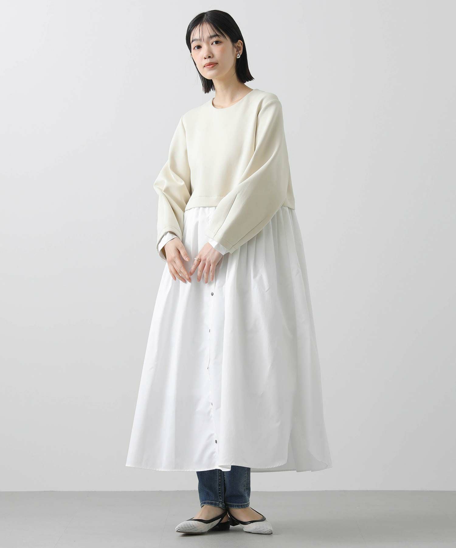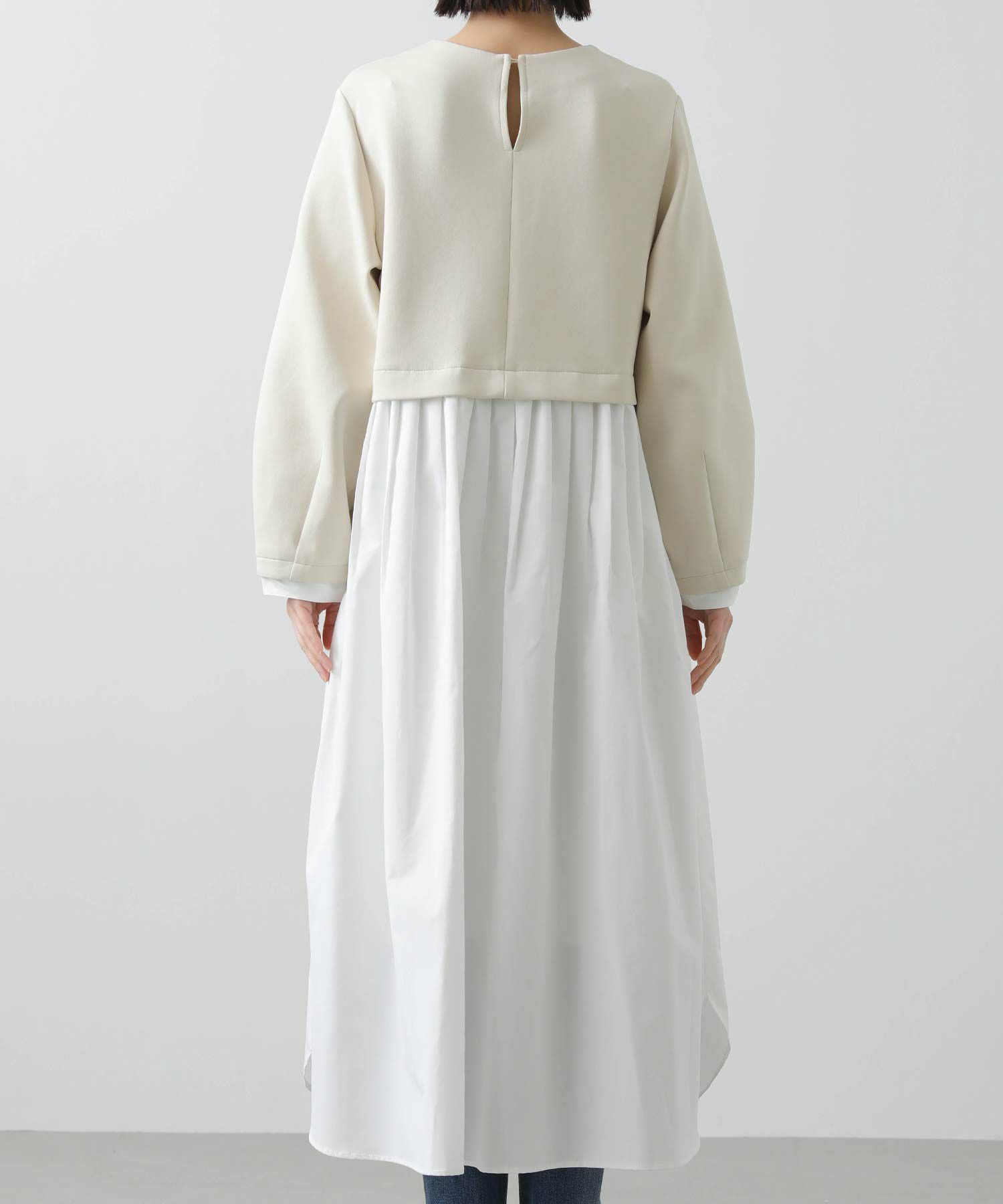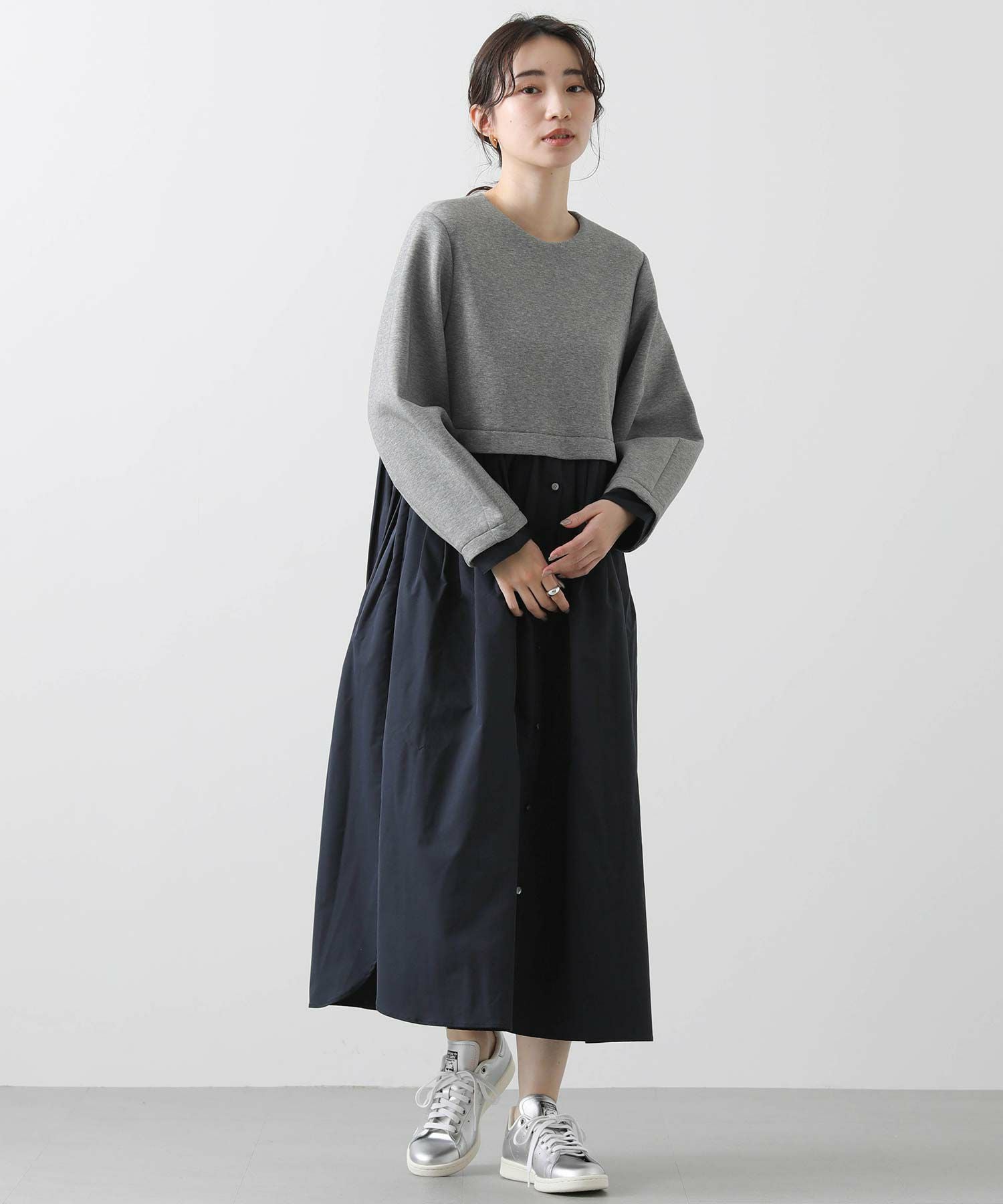 ウエストを少し高めの位置で切り替えて、スタイルアップして見えるバランスに仕上げました。