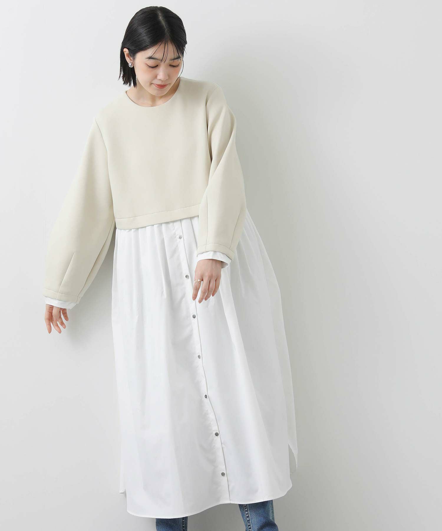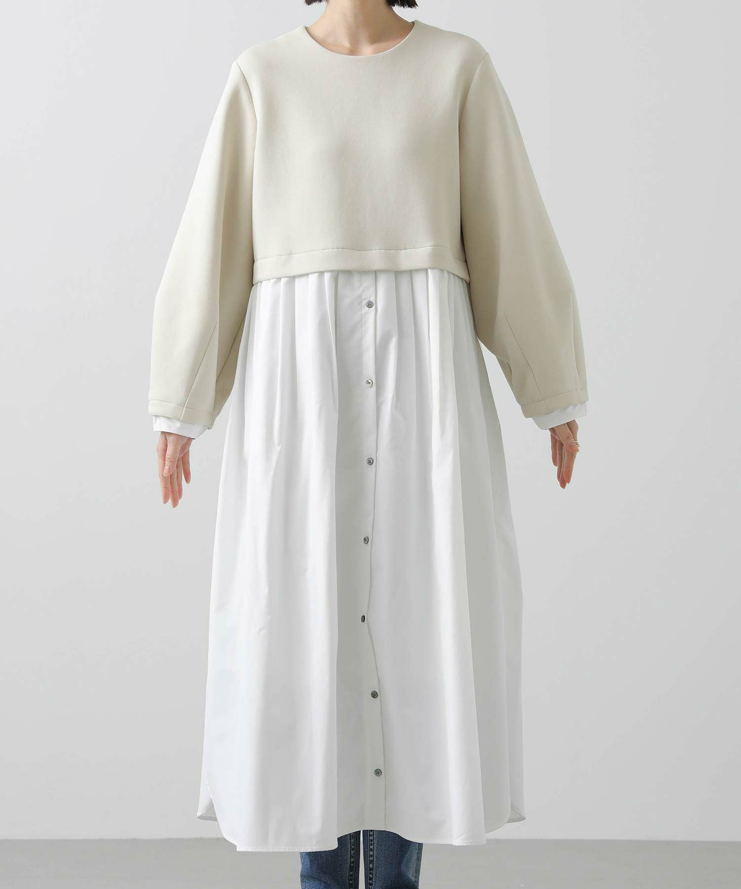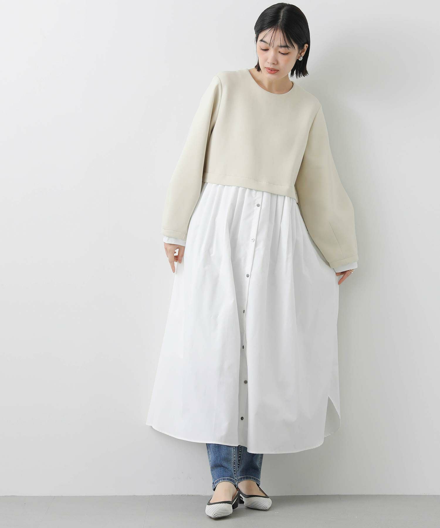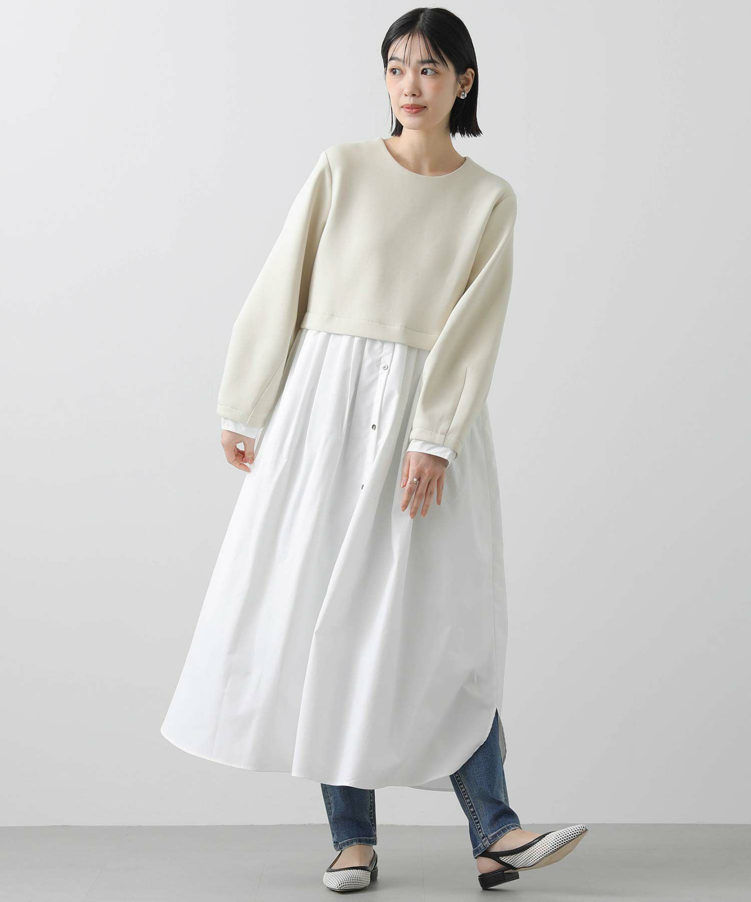 ウエストを少し高めの位置で切り替えて、スタイルアップして見えるバランスに仕上げました。