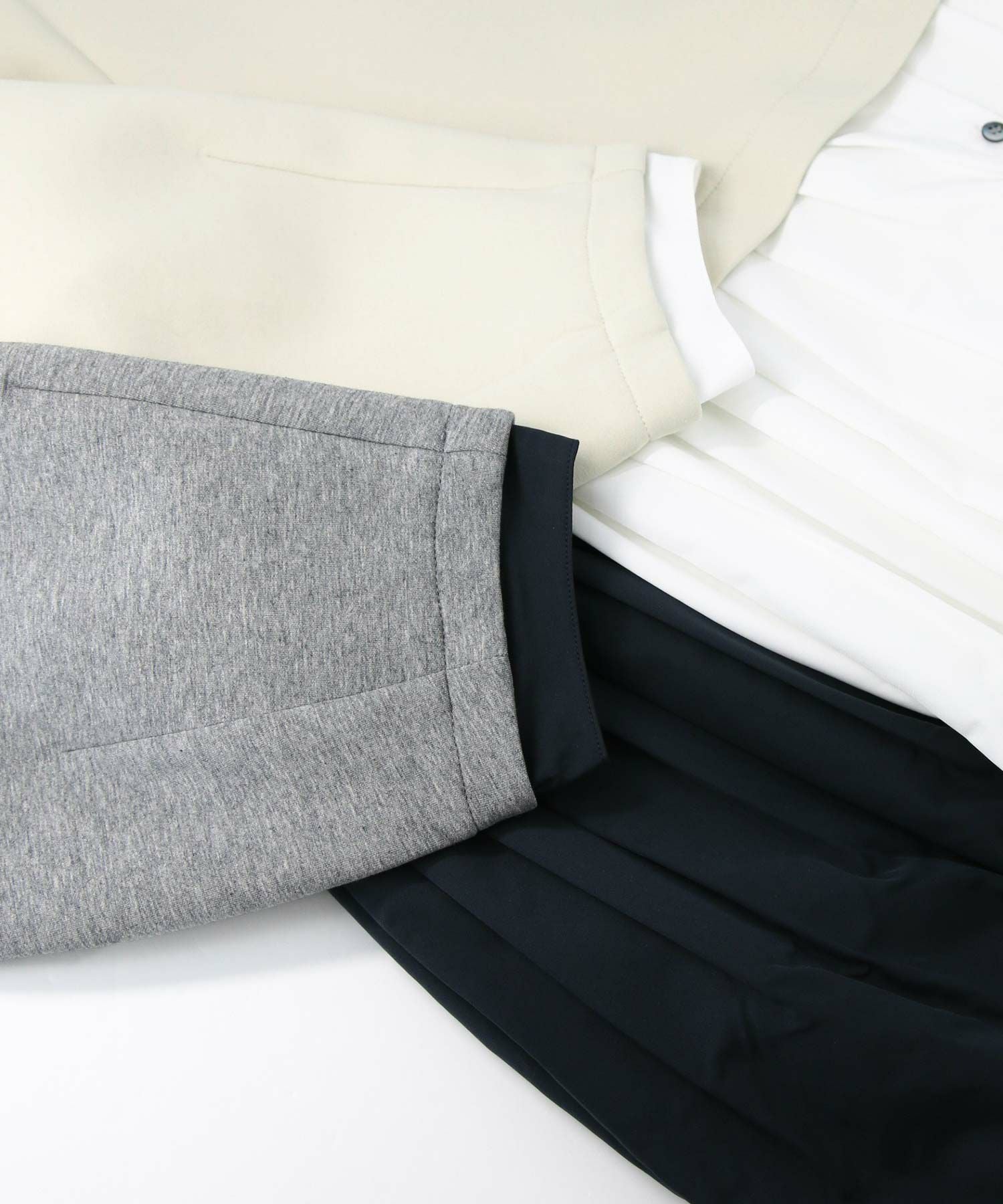 トップスはもっちりしたダンボール素材で着心地良く、ボトムはハリのあるタフタ素材を合わせたフォルム感のあるシルエットが、着るだけで映えるデザイン。