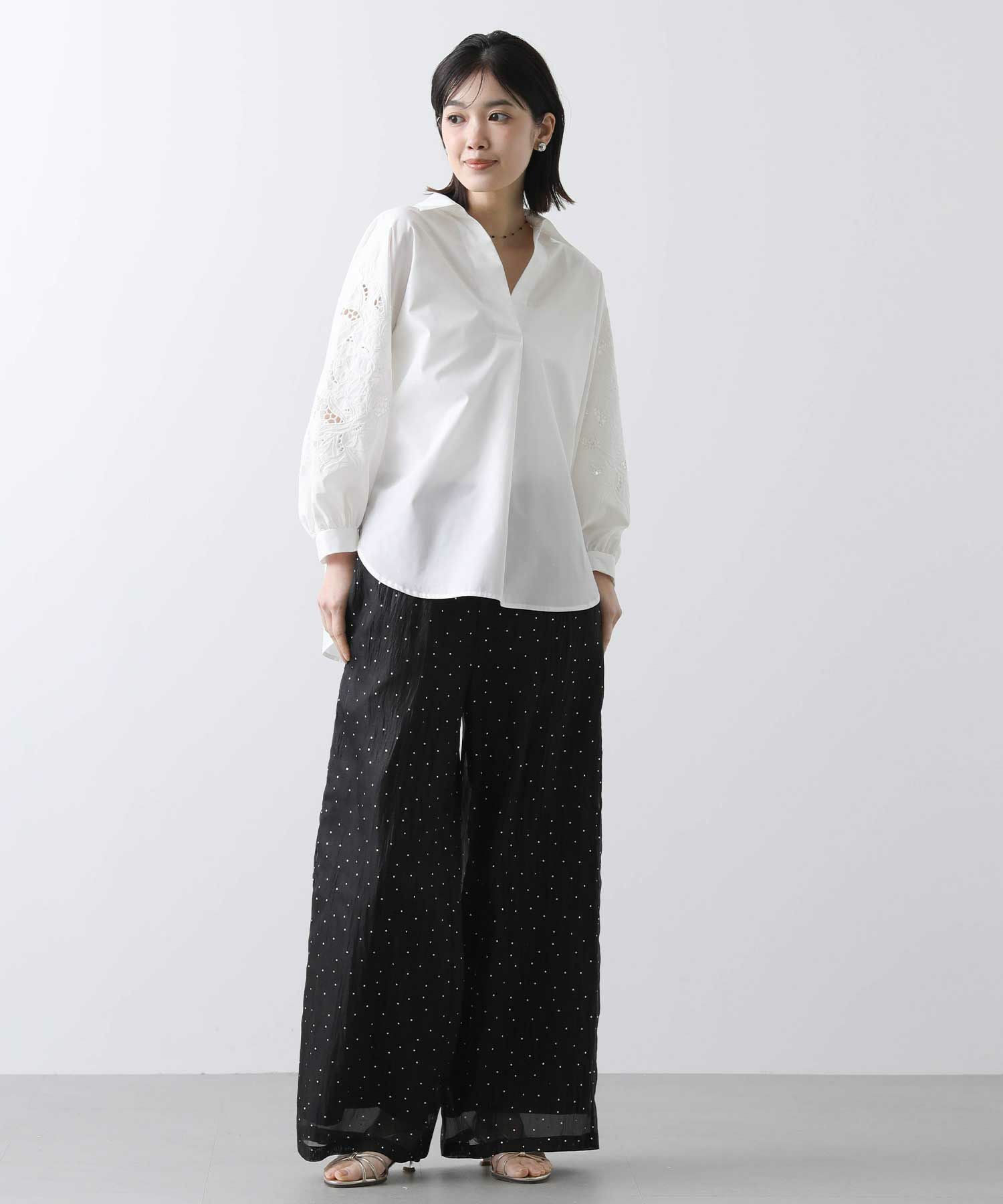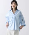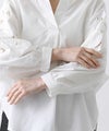 大胆な袖の刺繍が目を惹くエレガントなシャツブラウス。