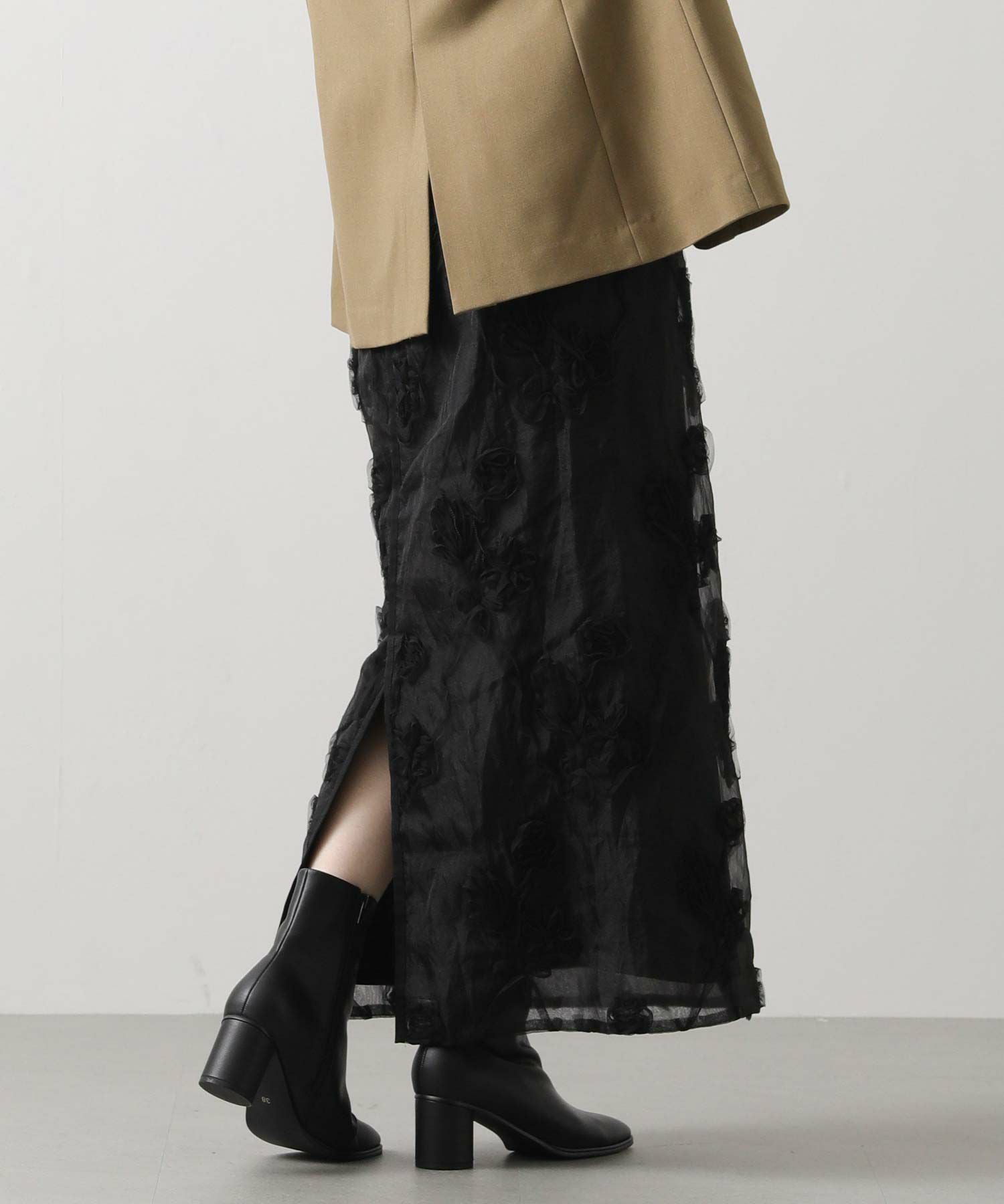 オーガンジーにチュールで刺繍を施した立体感のある素材が、スタイリングにアクセントをつけてくれます。ウエストはグログランテープを使用して、インスタイルも決まるデザインになっています。