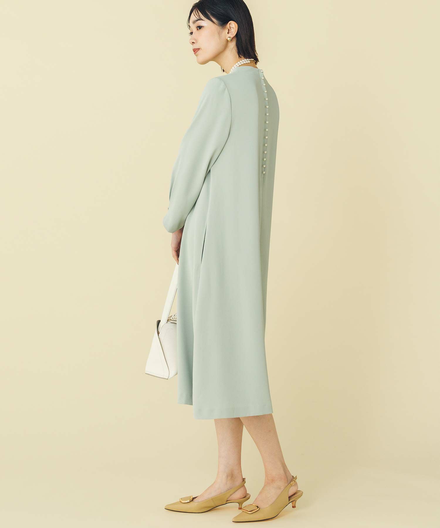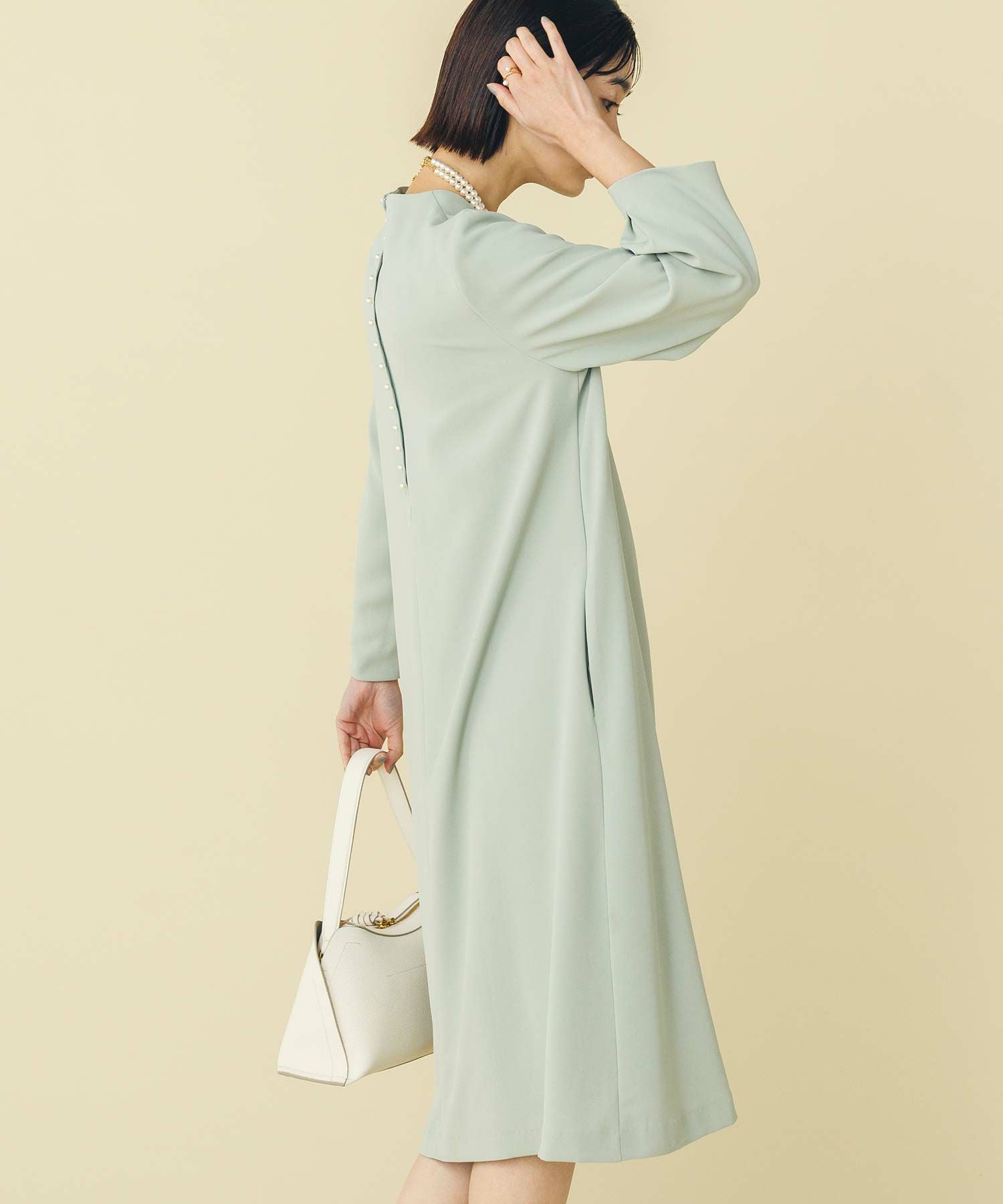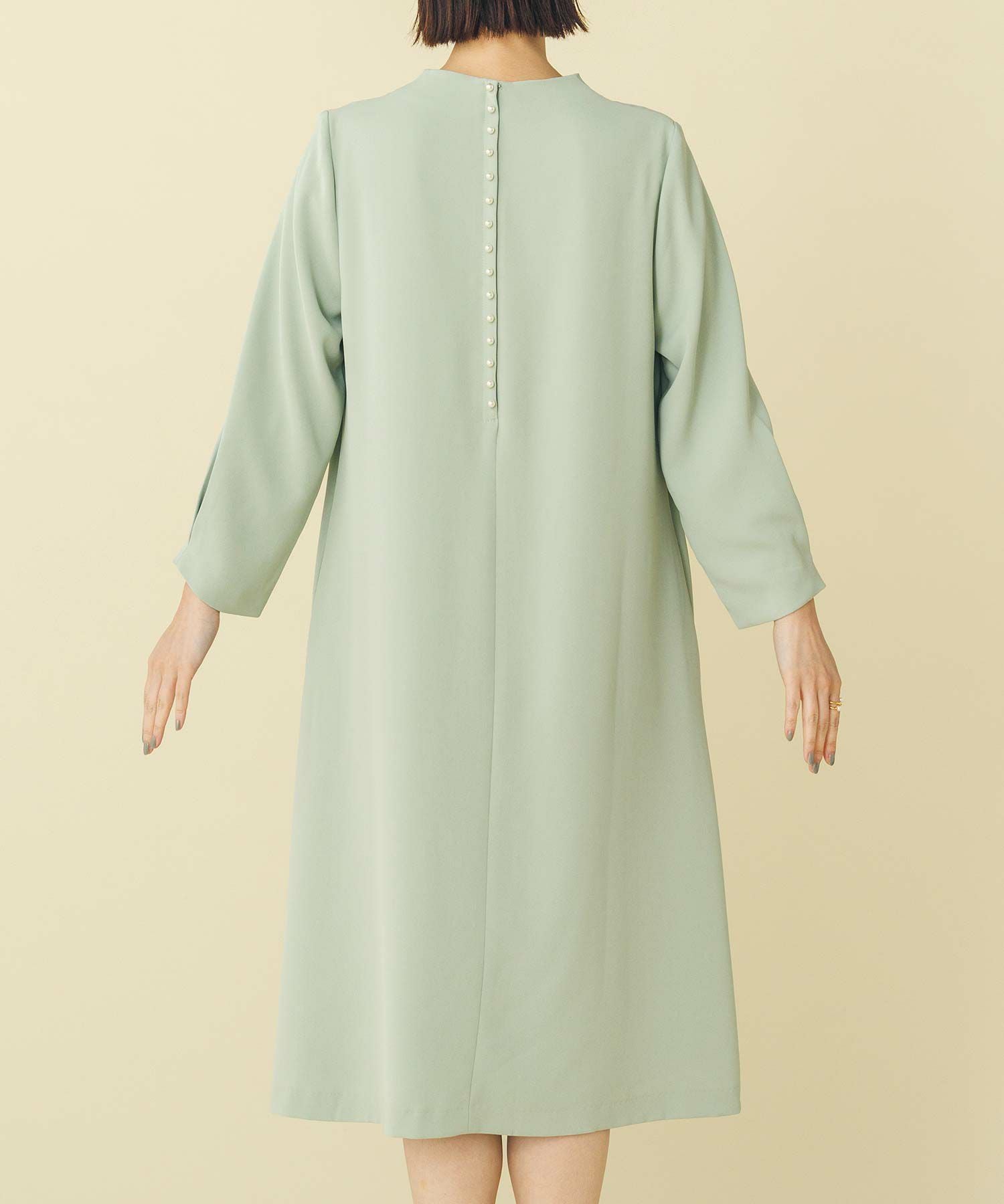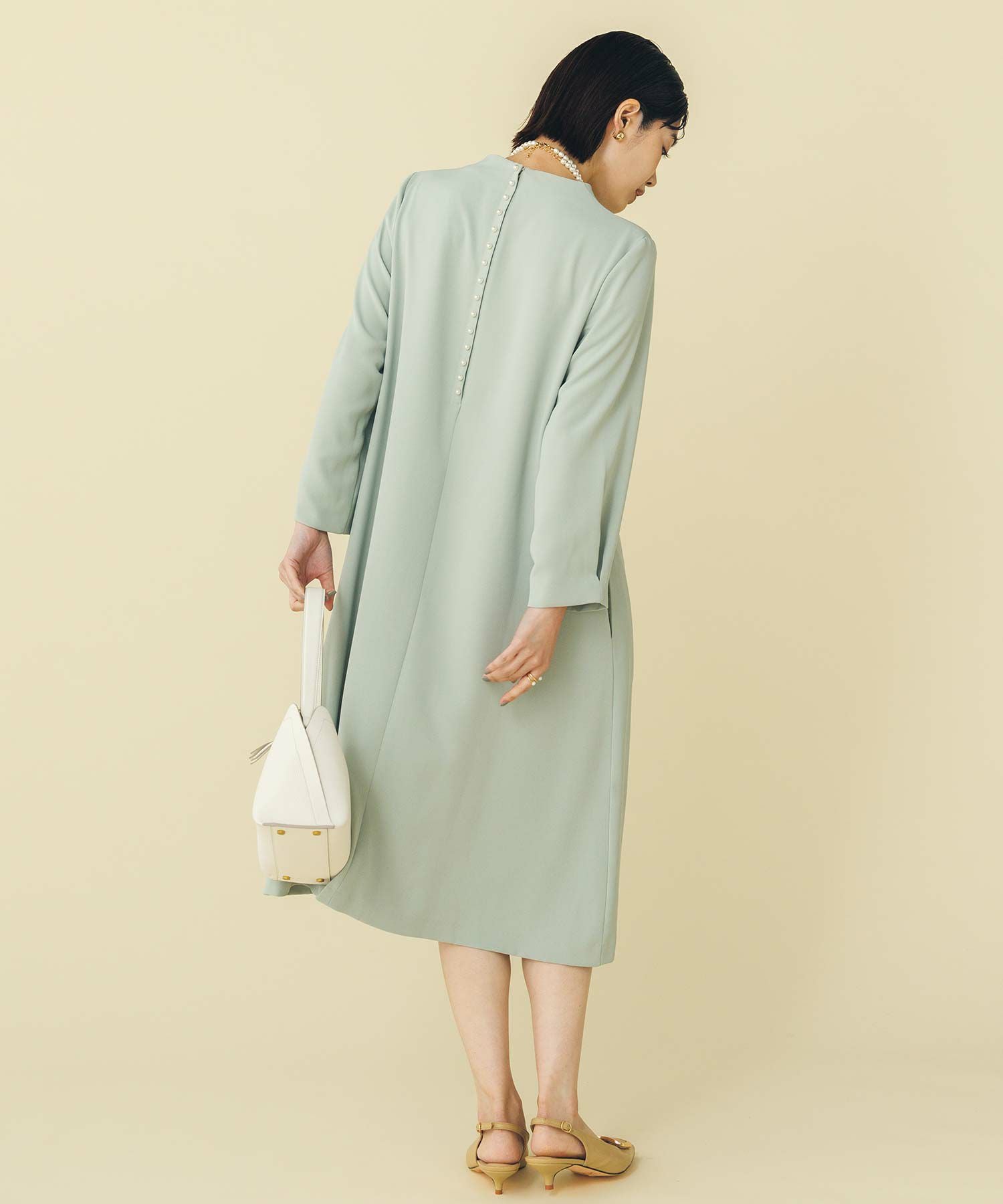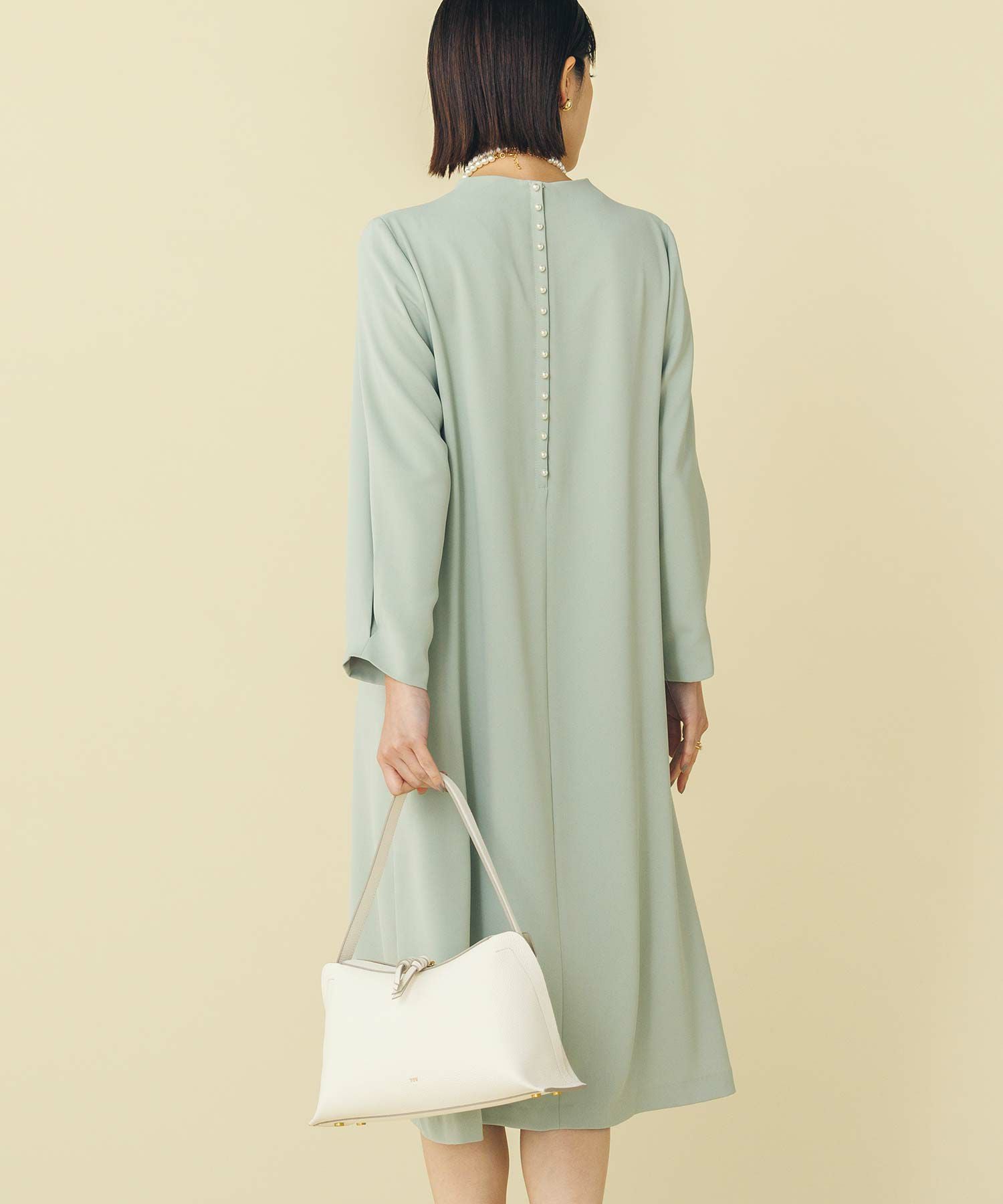 華奢なパールが並ぶバックシャンデザインのワンピース。少し短めの着丈が軽やかな印象で、カジュアル過ぎない大人フェミニンな1枚です。