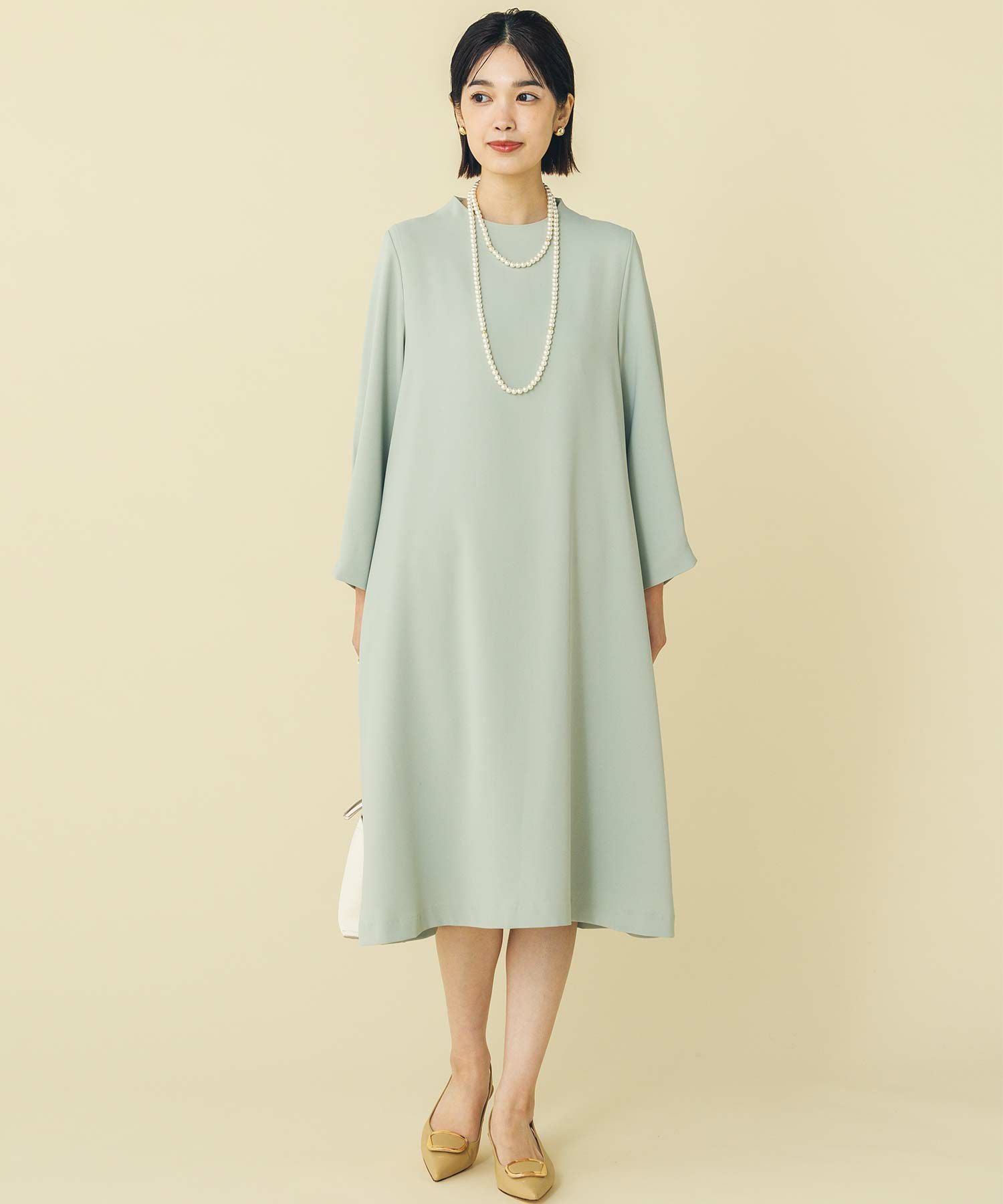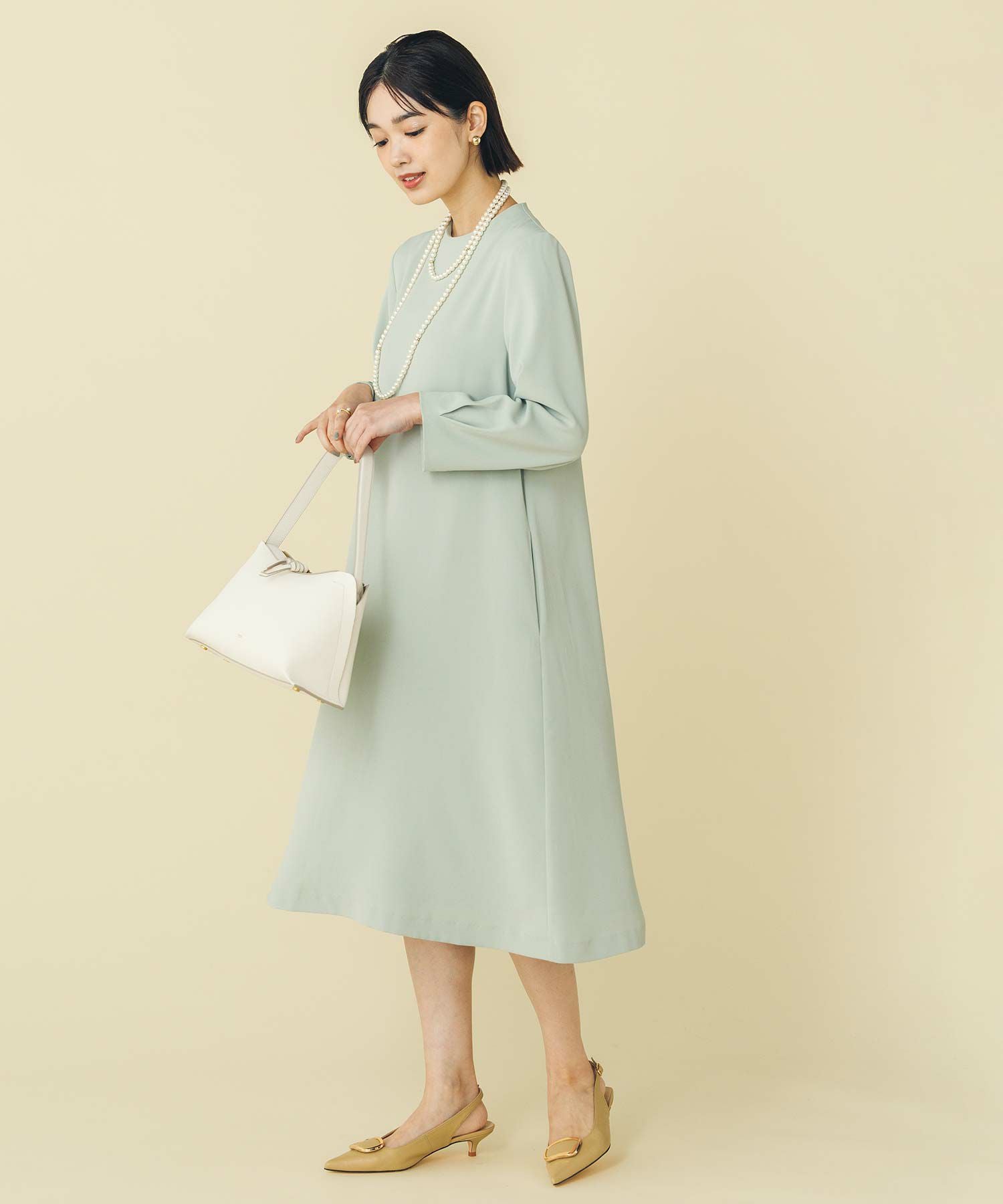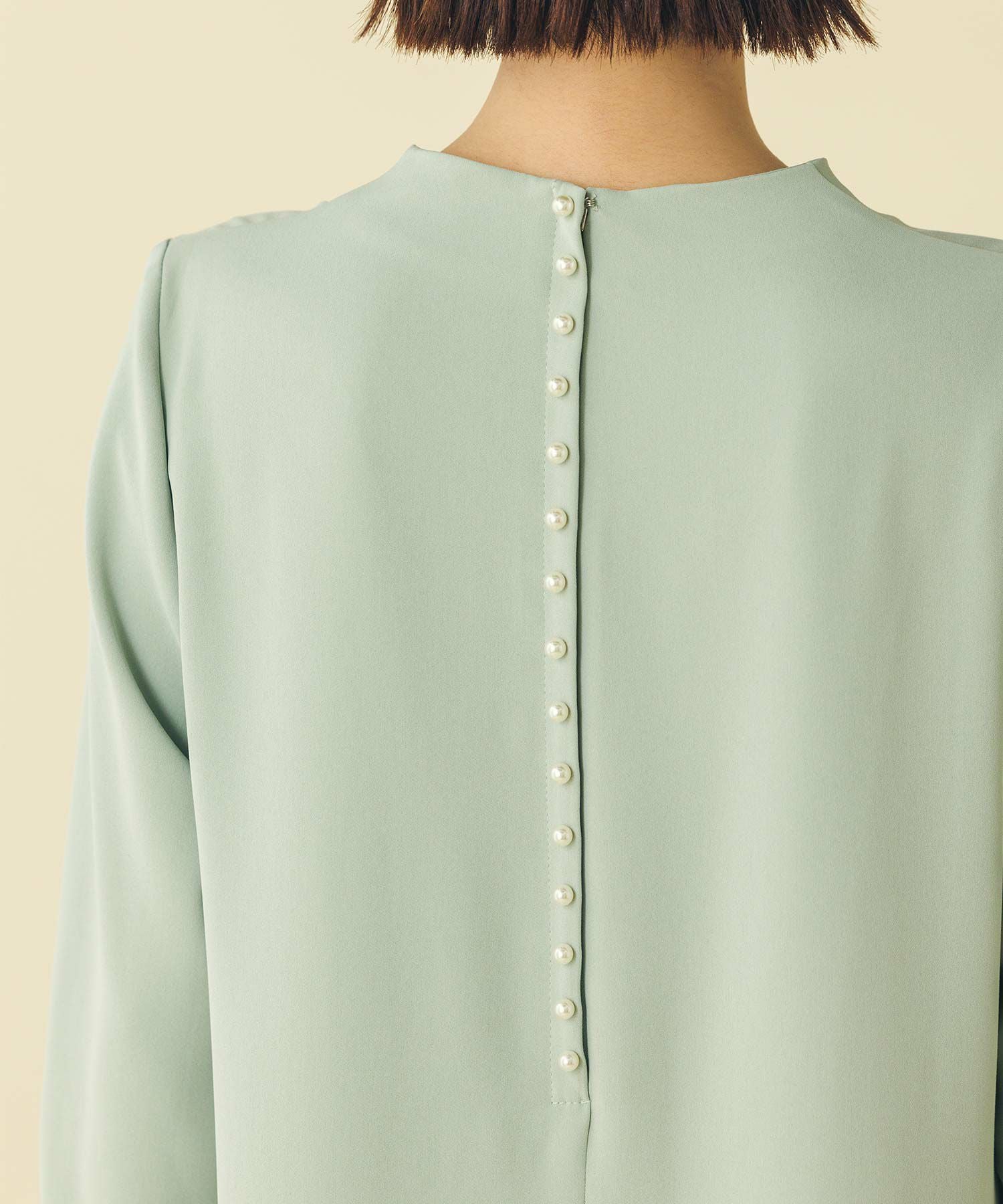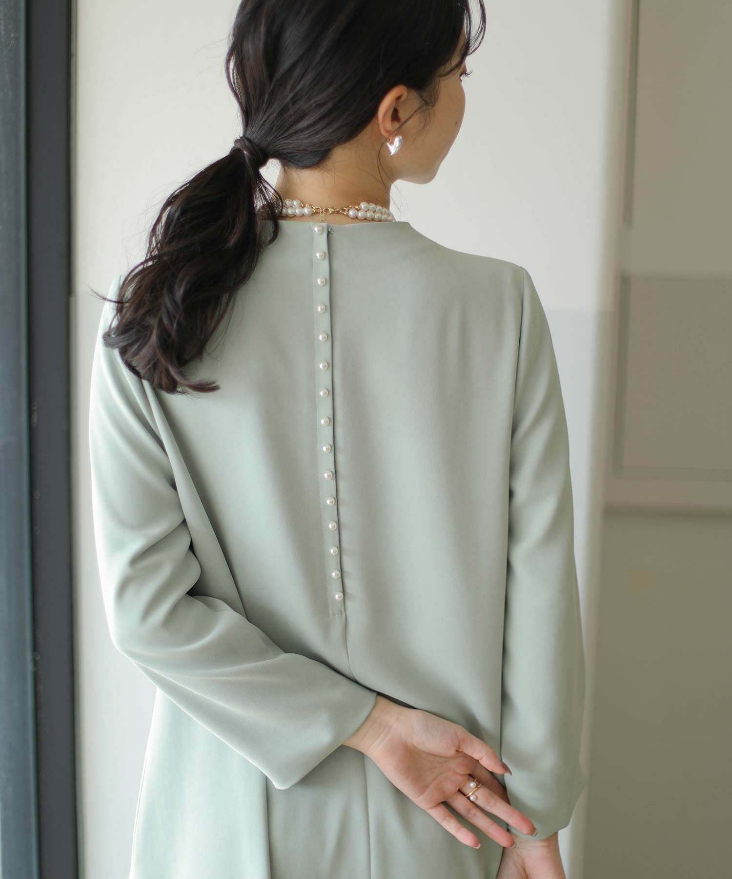 華奢なパールが並ぶバックシャンデザインのワンピース。少し短めの着丈が軽やかな印象で、カジュアル過ぎない大人フェミニンな1枚です。