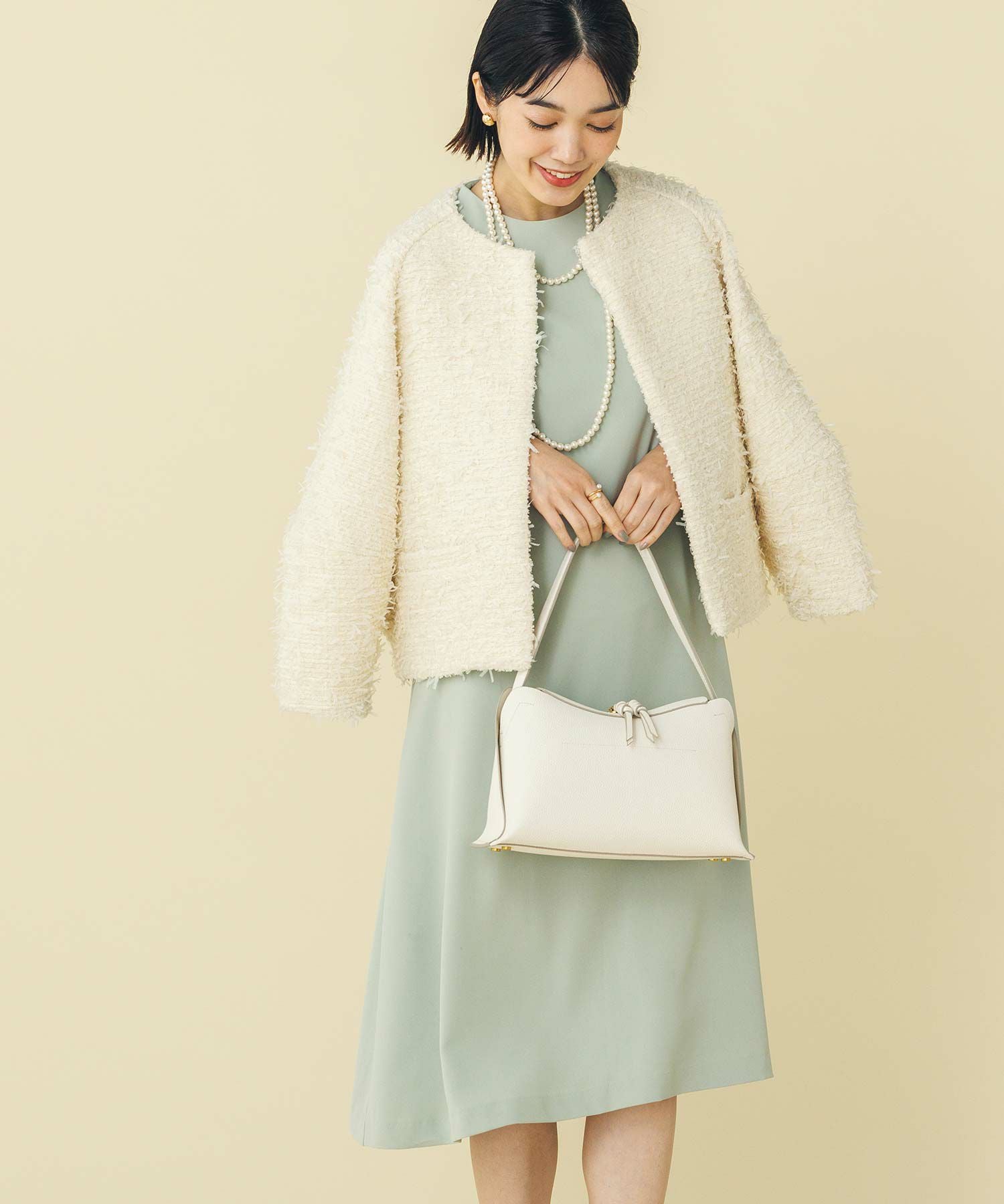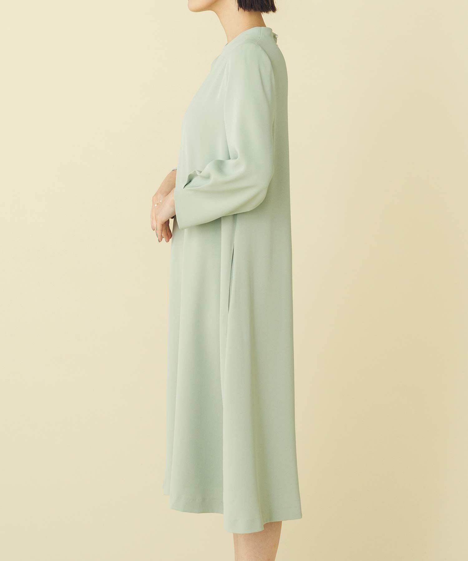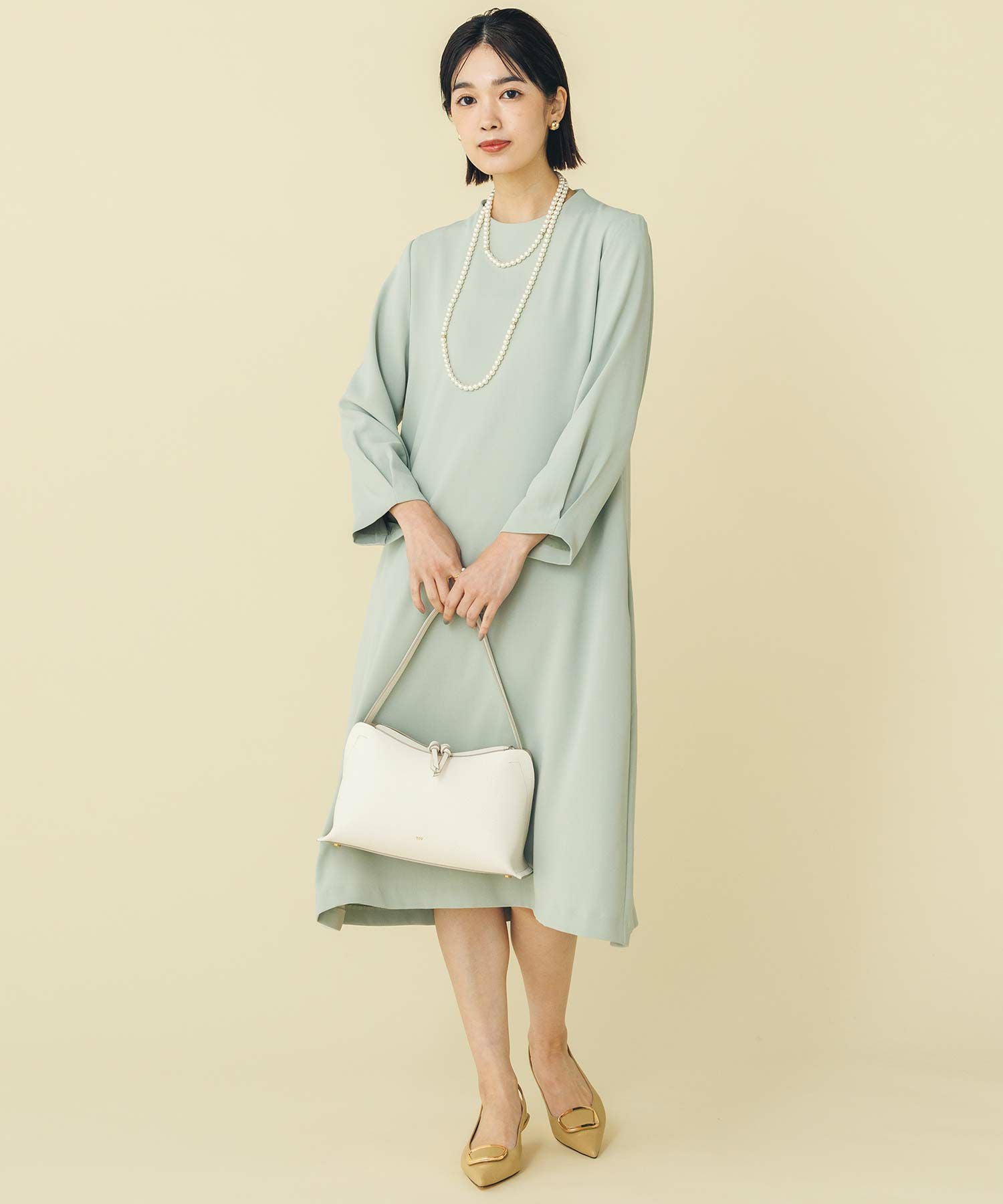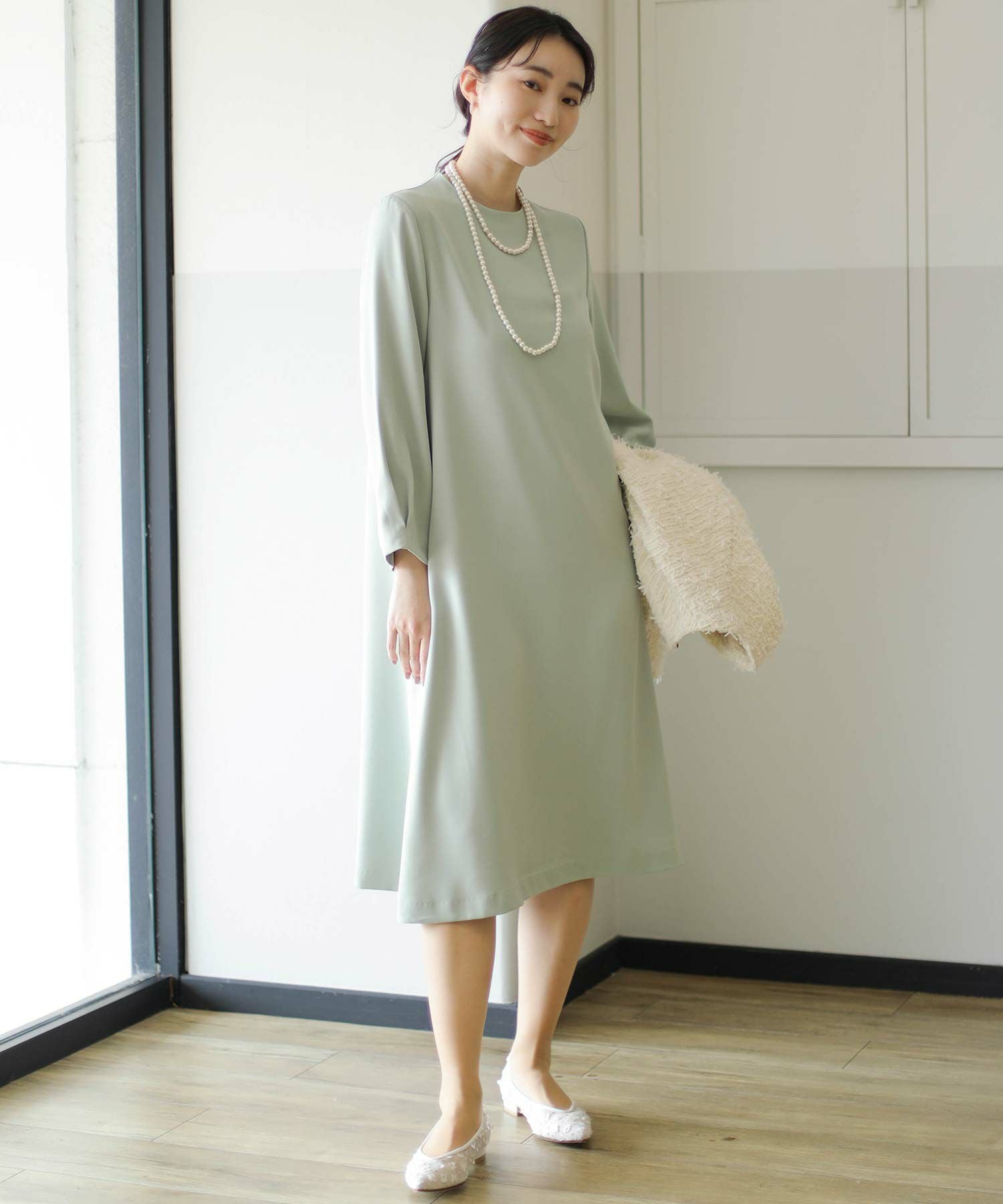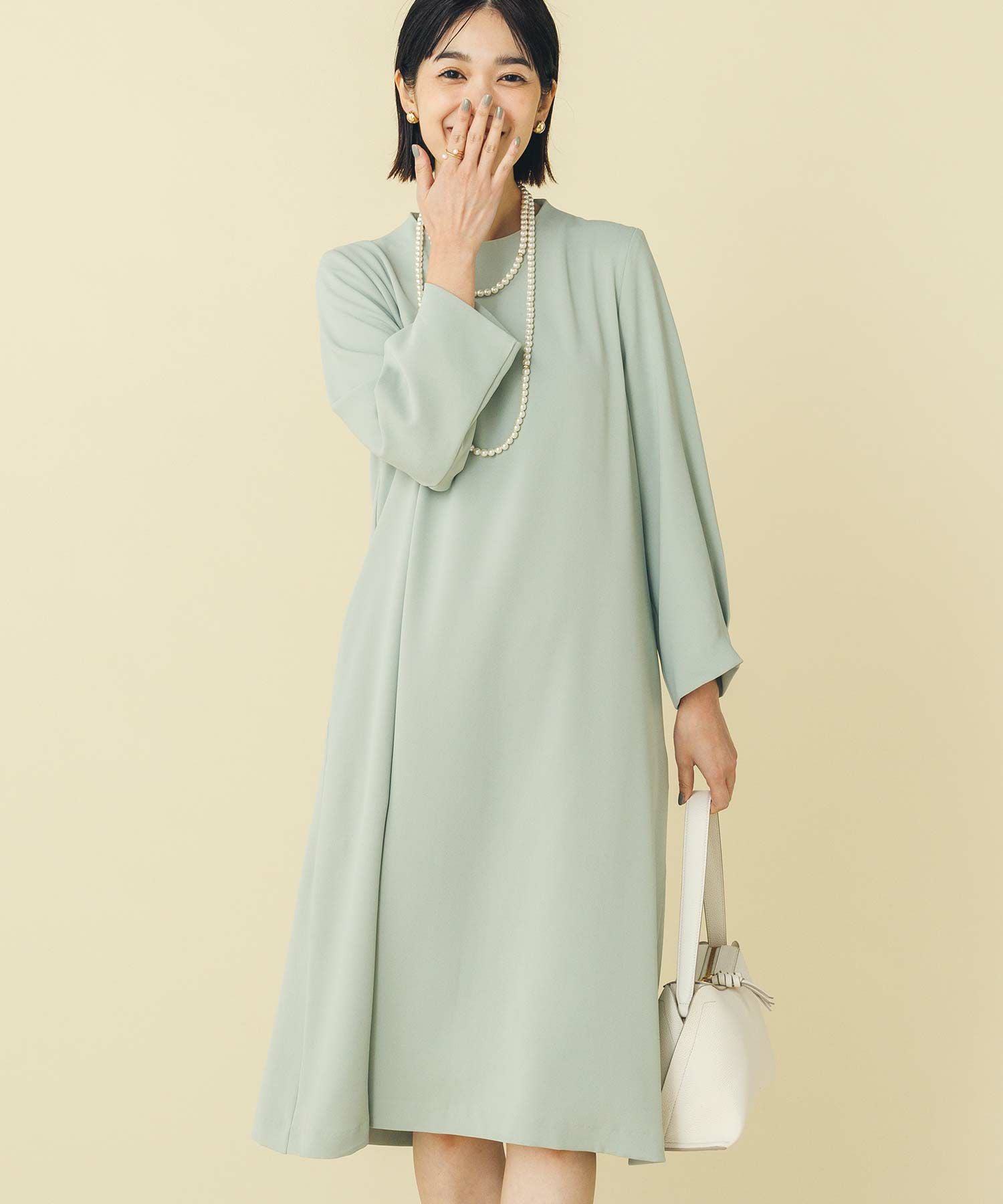 華奢なパールが並ぶバックシャンデザインのワンピース。少し短めの着丈が軽やかな印象で、カジュアル過ぎない大人フェミニンな1枚です。