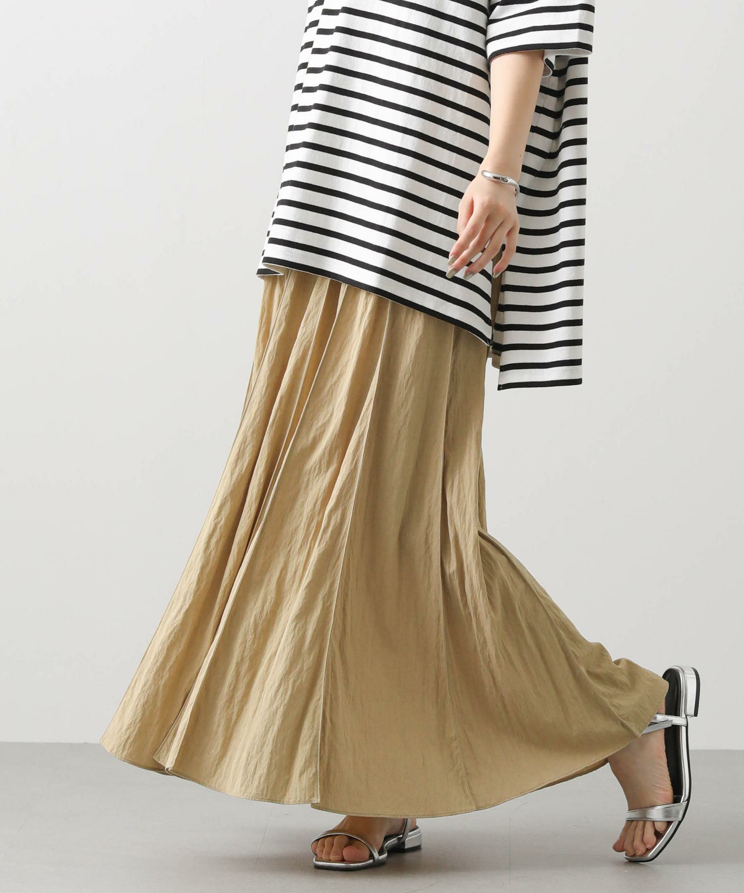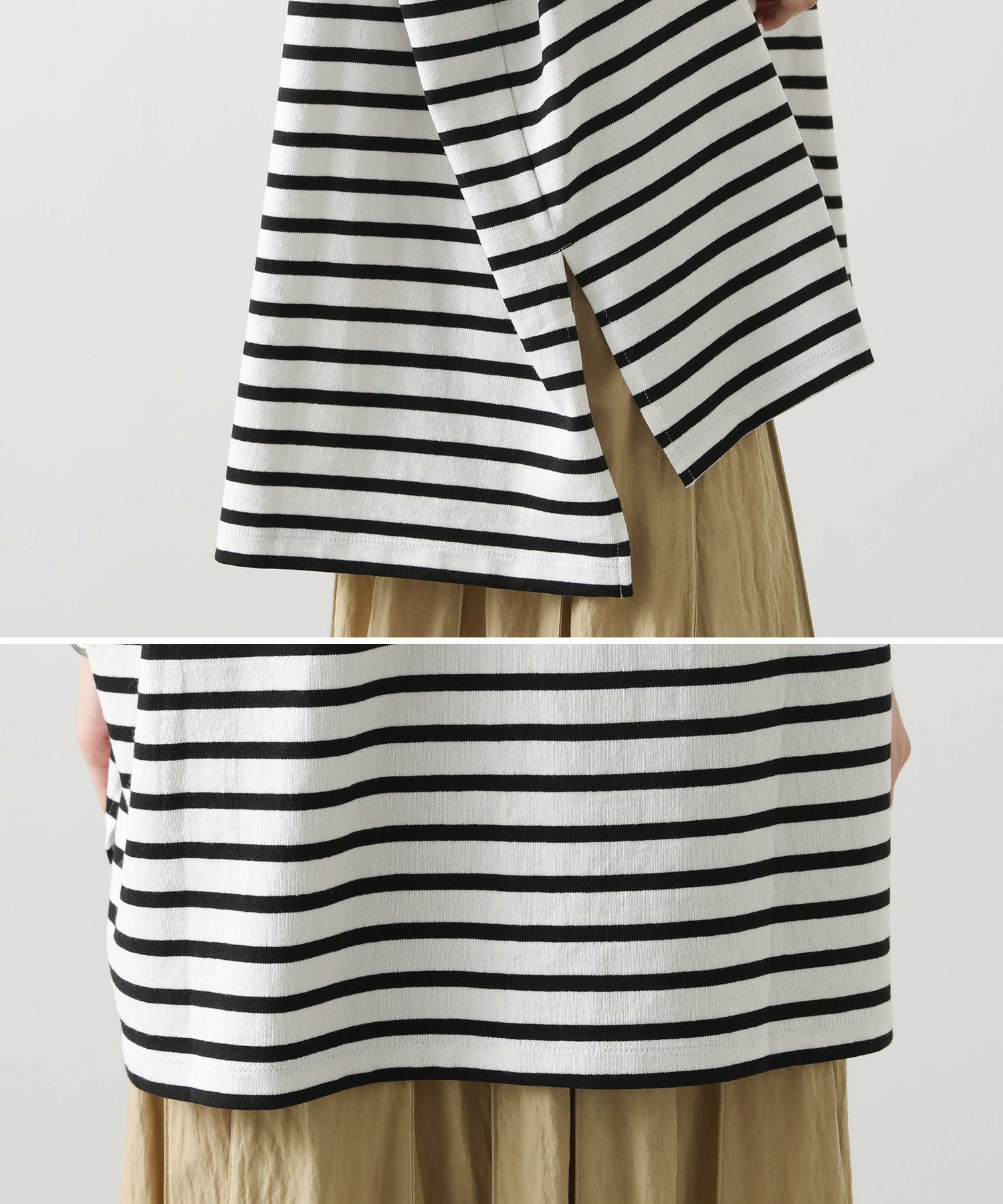 前後差のある長めの着丈感でインしなくてもこなれた印象をあたえてくれます。