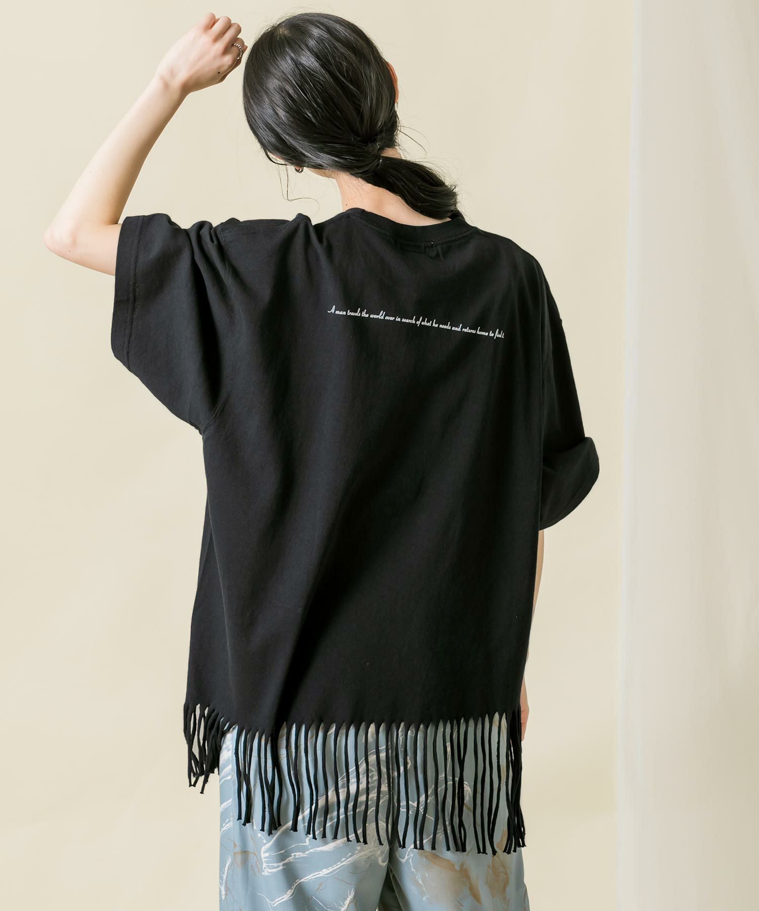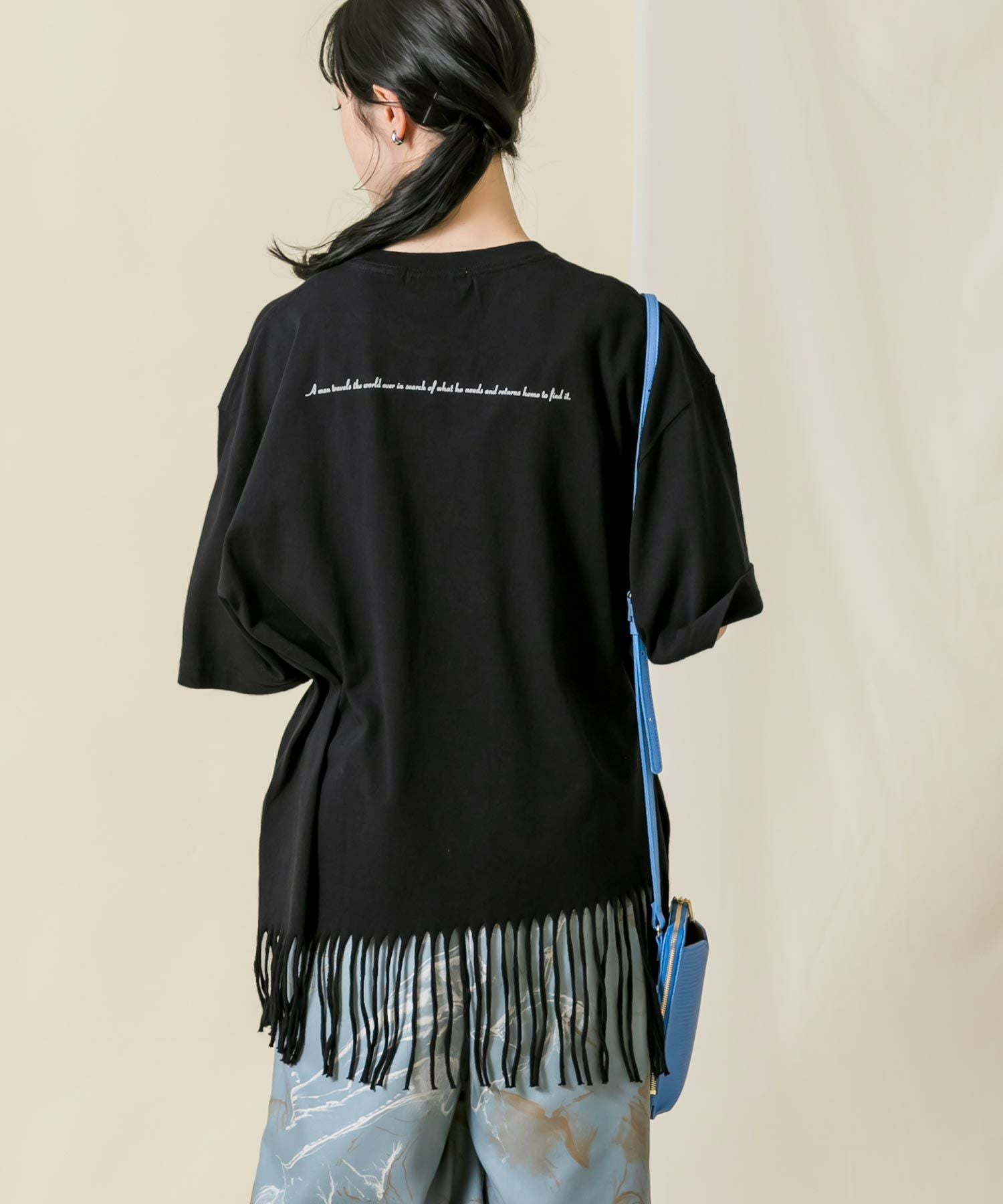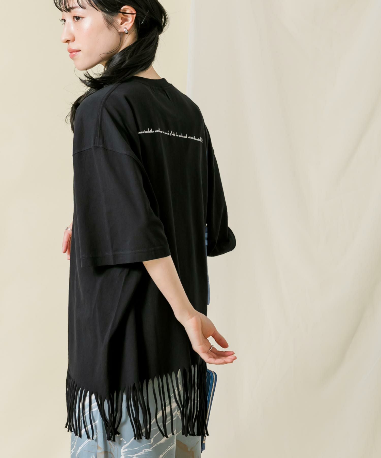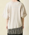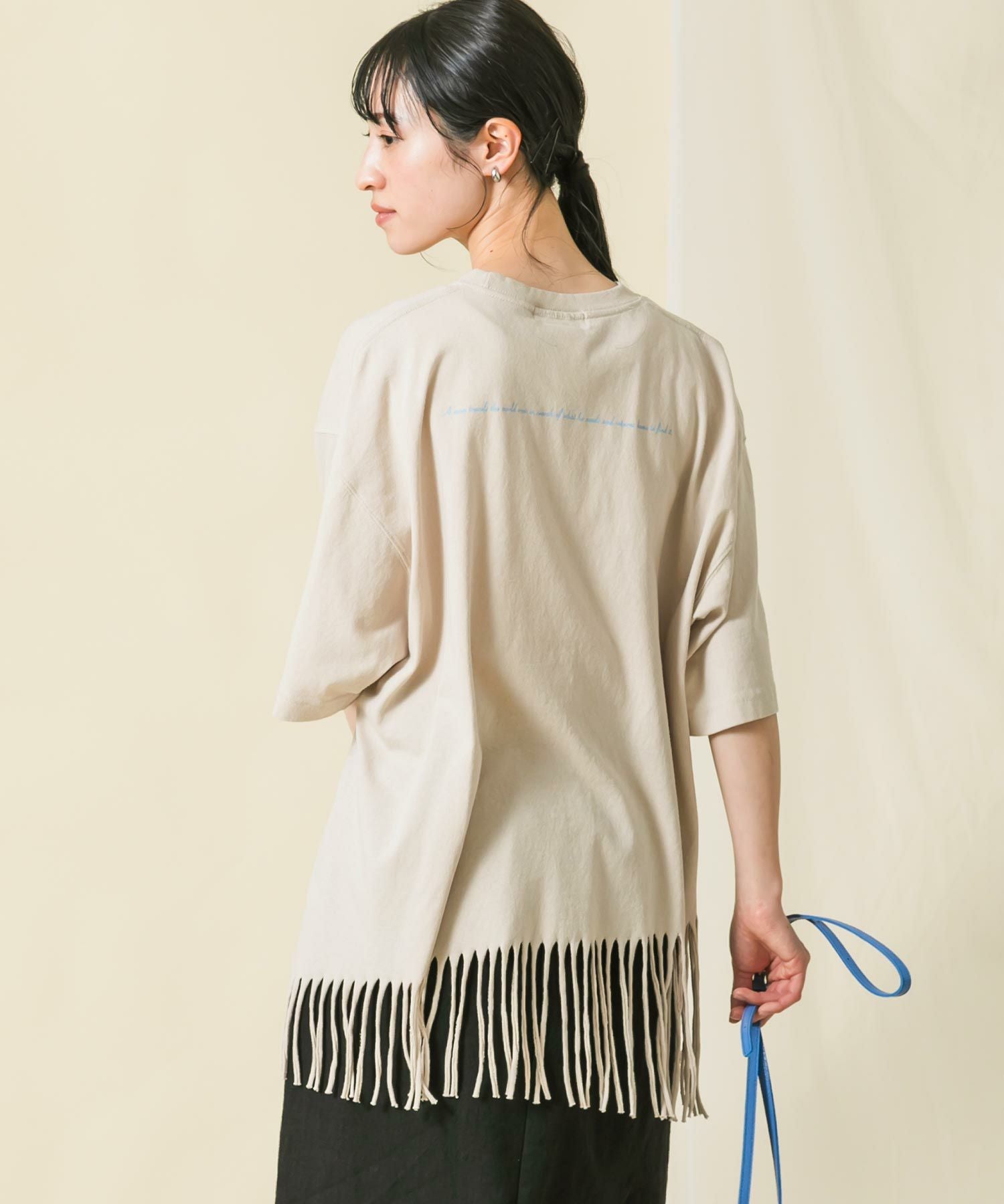 一点一点手作業により表現されたフリンジは動きがあり印象的で、アシンメトリーなバランスもポイントです。背中のタイポプリントもさりげないアクセントに。