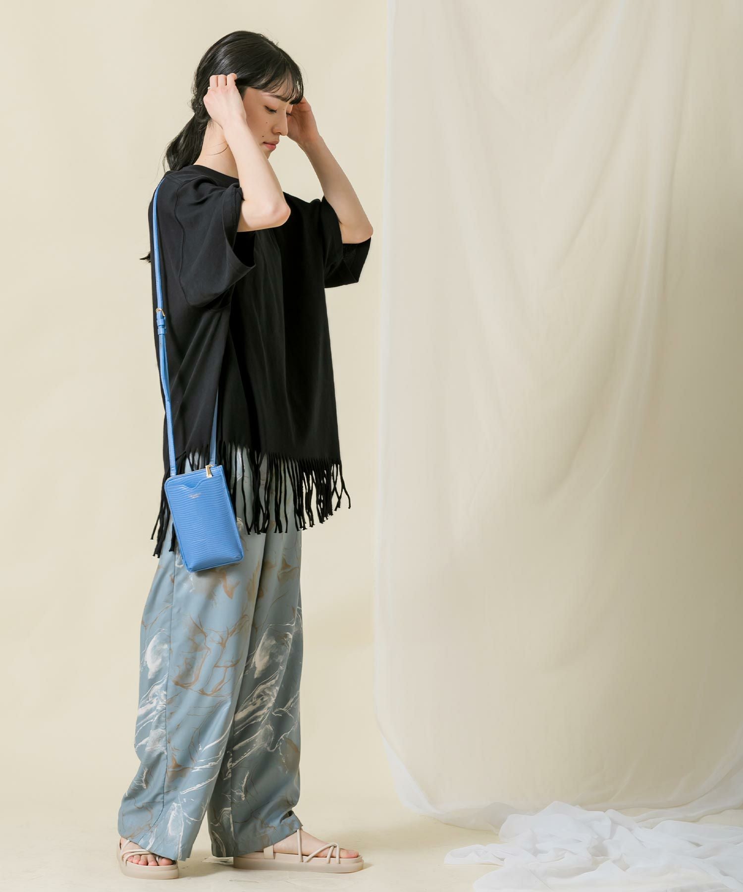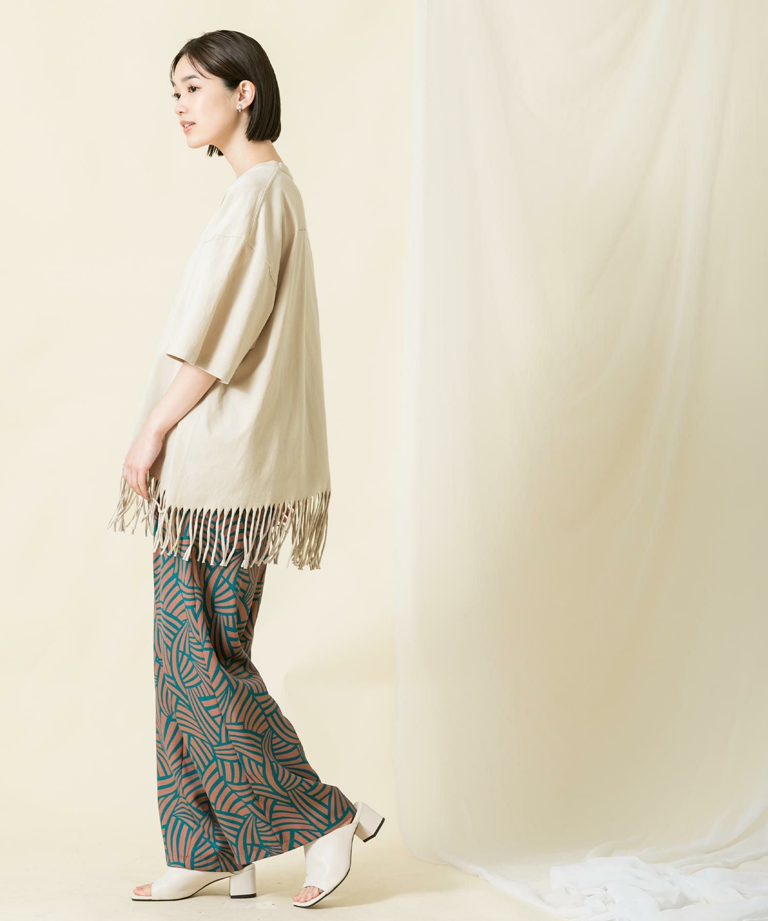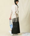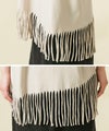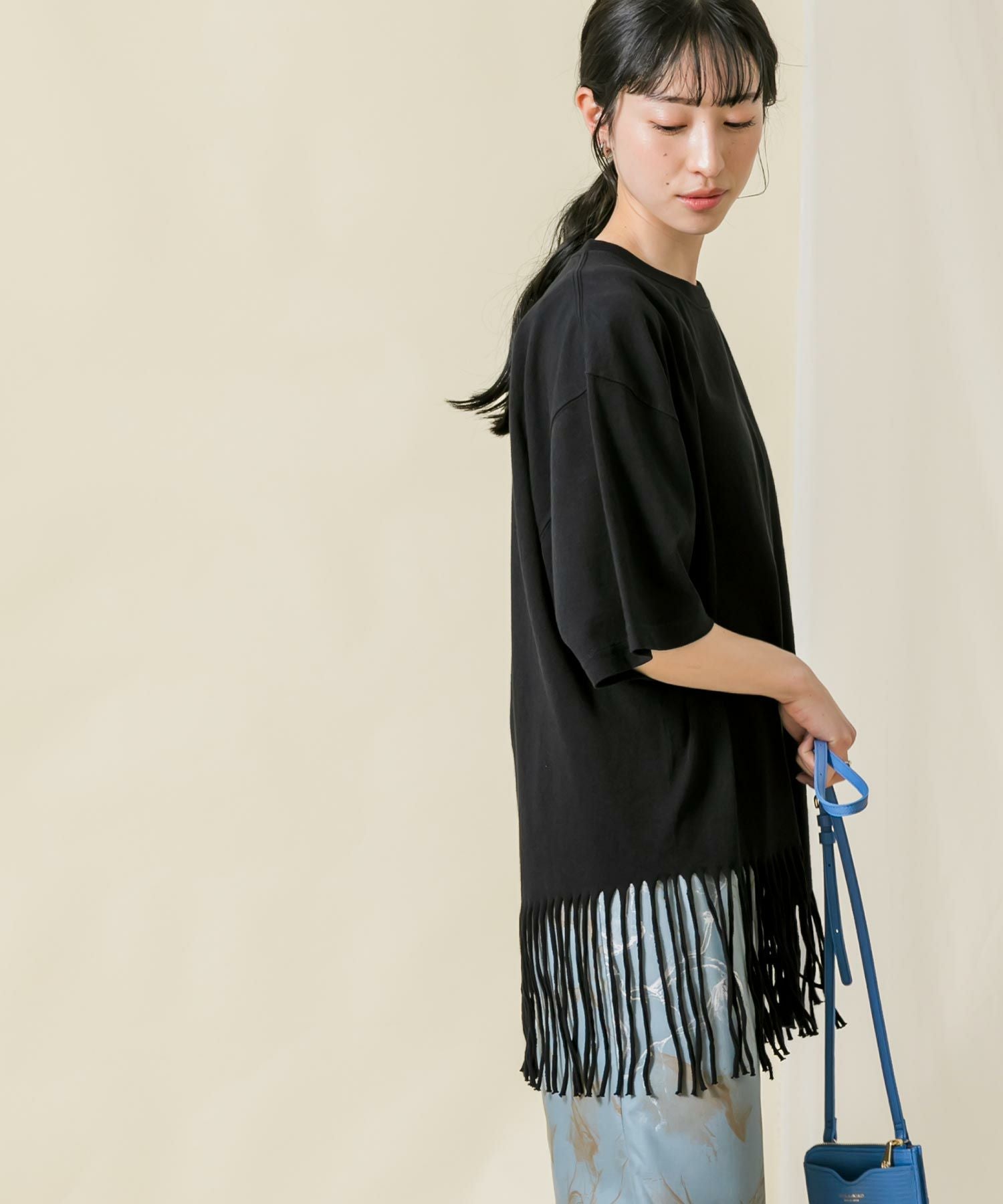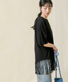 一点一点手作業により表現されたフリンジは動きがあり印象的で、アシンメトリーなバランスもポイントです。背中のタイポプリントもさりげないアクセントに。