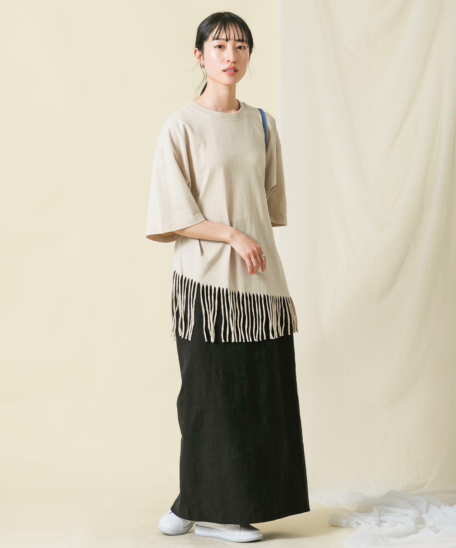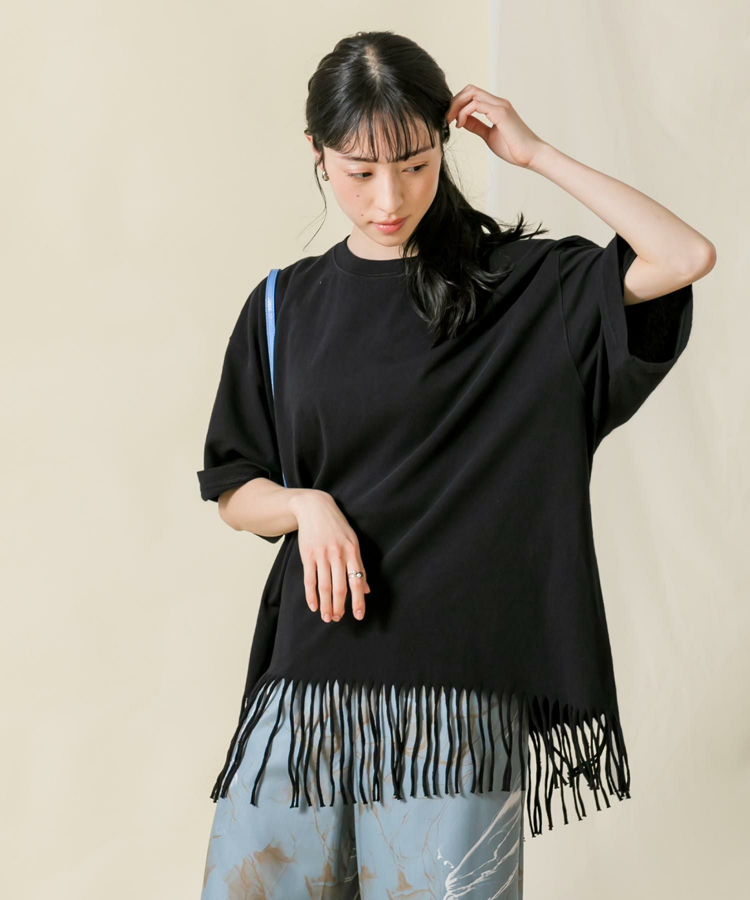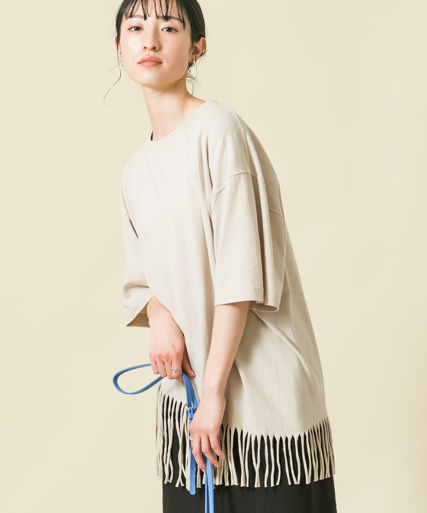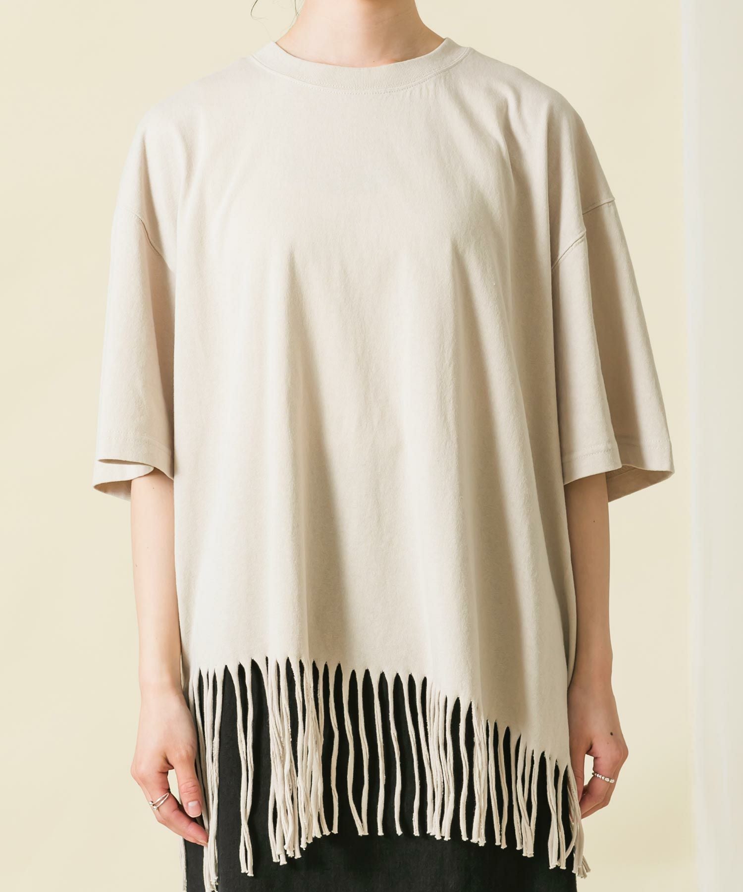 【BoutiqueOrdinary(ブティークオーディナリー】から、裾をフリンジにカットしたリメイク風Tシャツをセレクト。