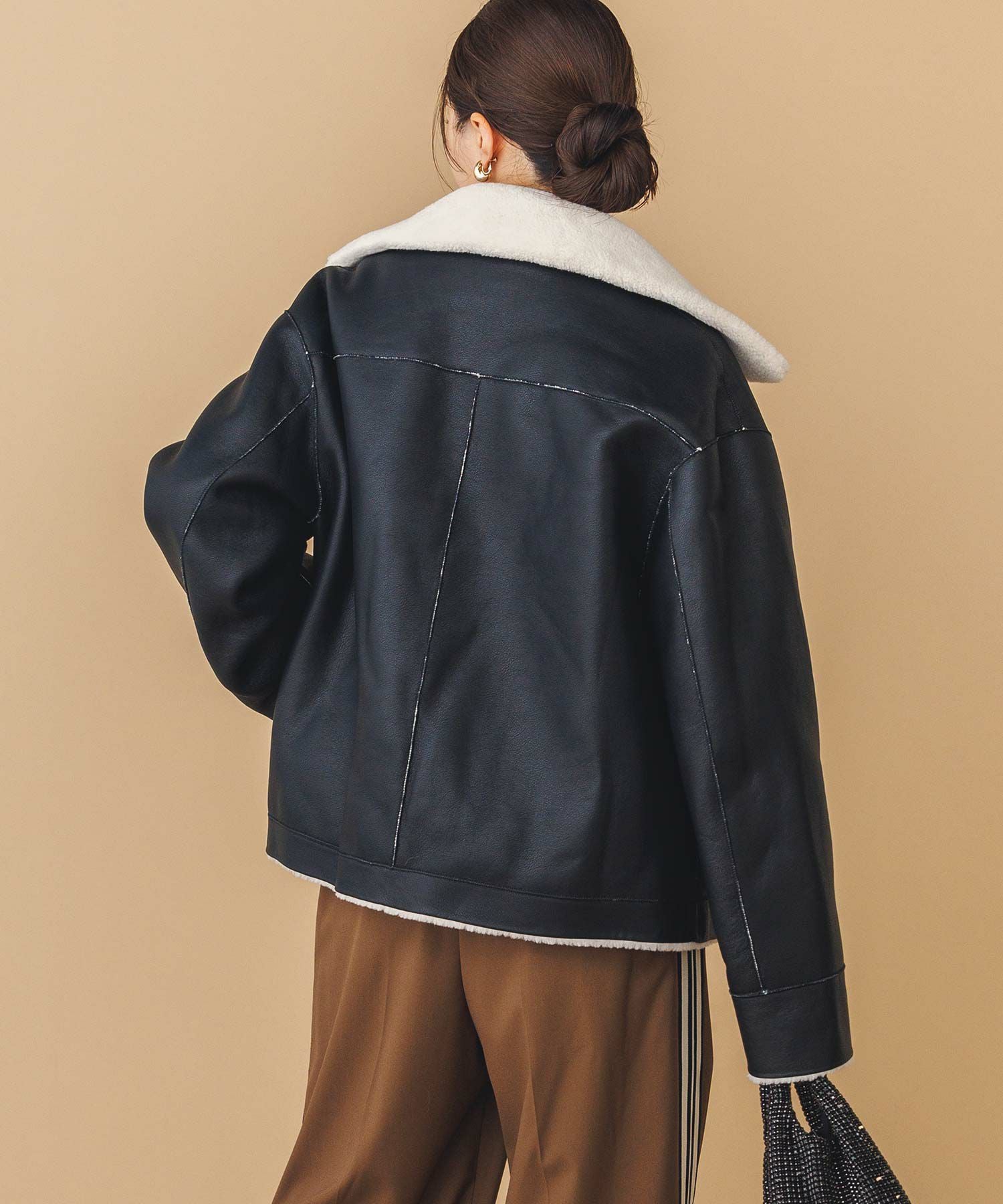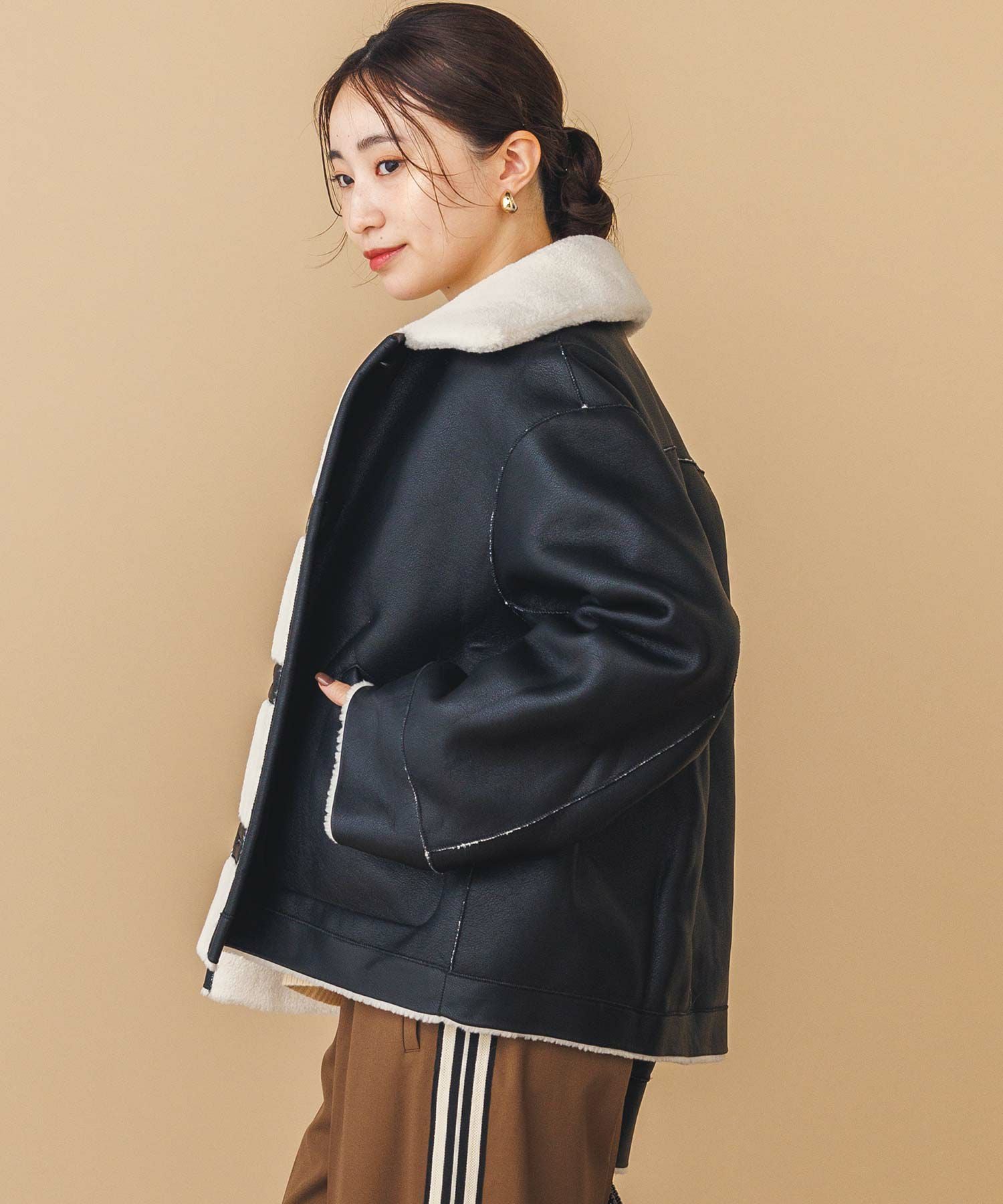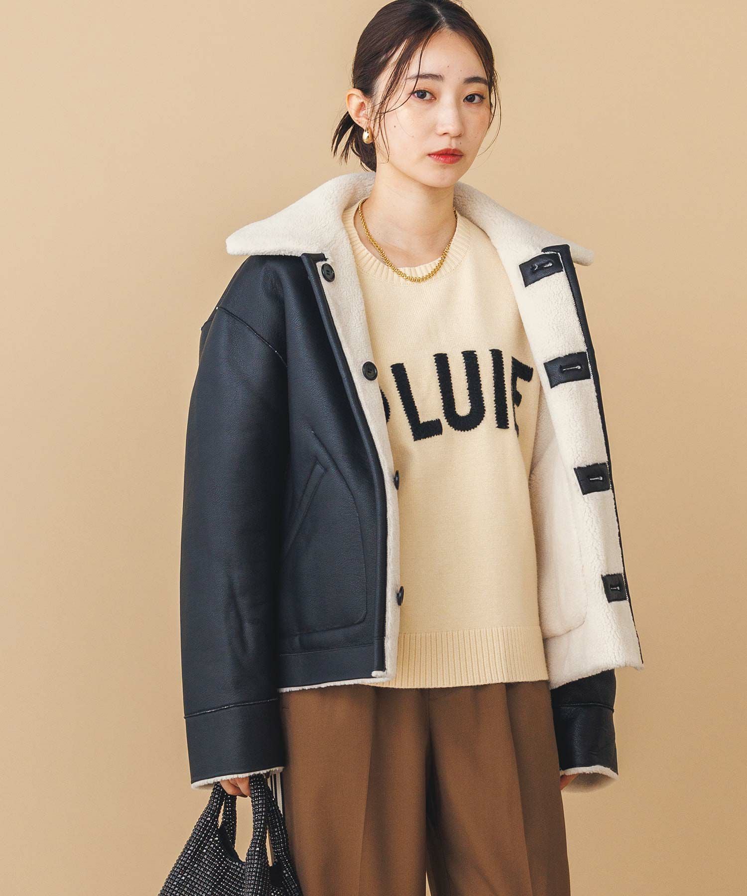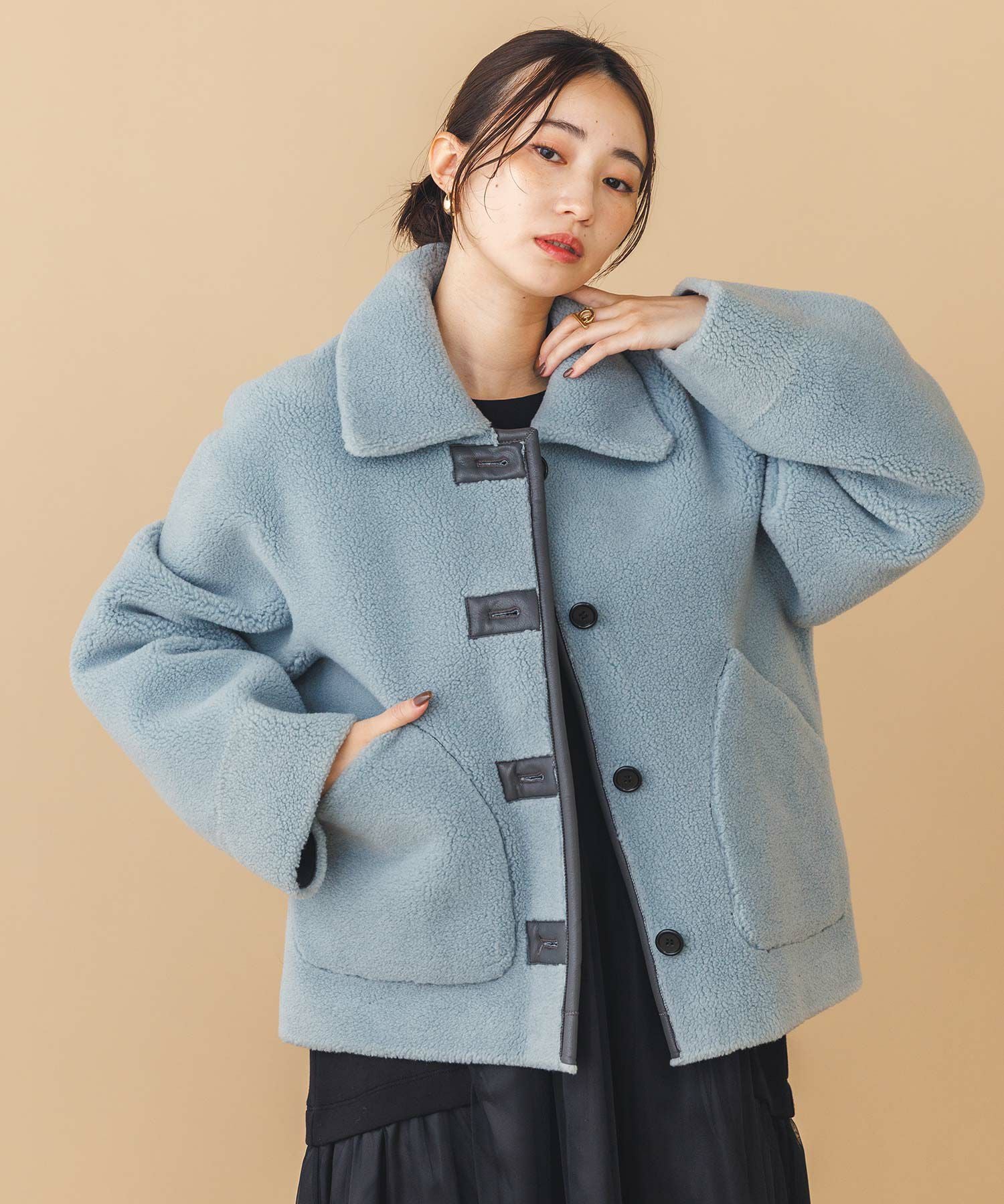 【BoutiqueOrdinary(ブティークオーディナリー)】から、ヴィンテージムートンコートをイメージしたリバーシブルボアブルゾンをセレクト。ホール周りのフェイクレザーの切り替えや革調のボタンなど、ディティールに拘っているのがポイントです。