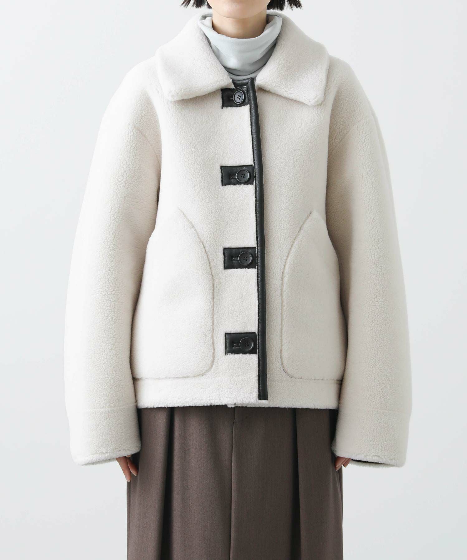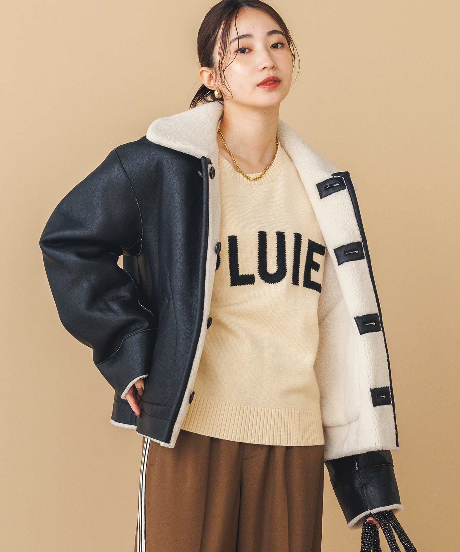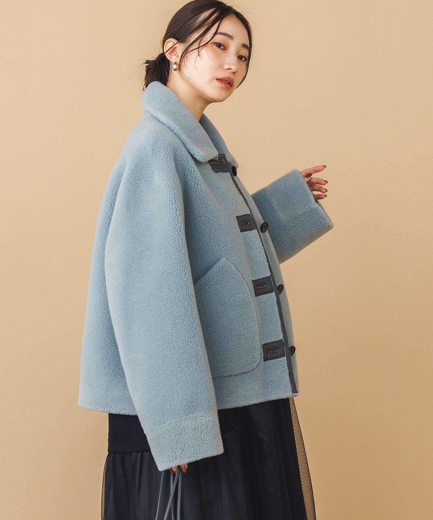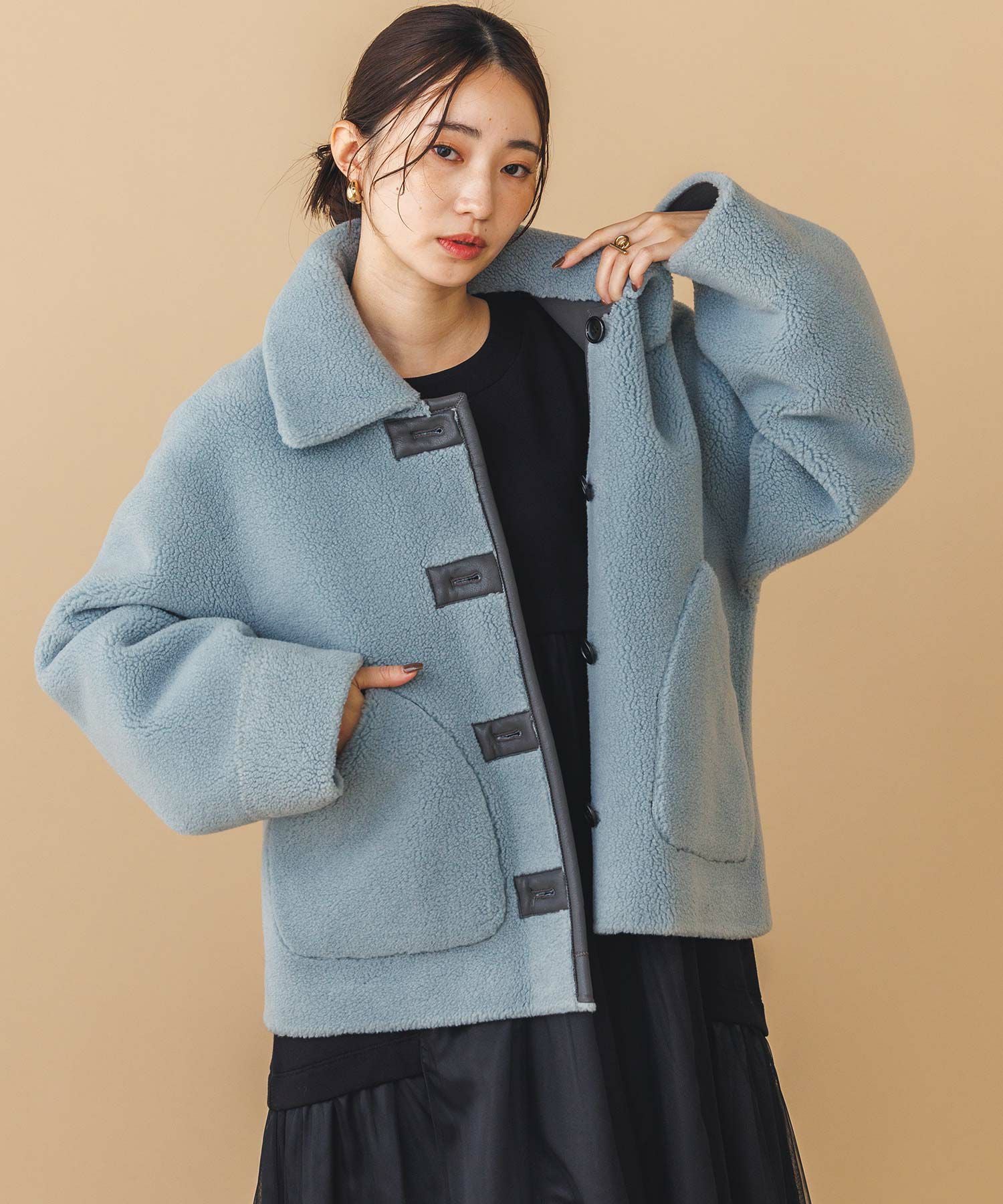 【BoutiqueOrdinary(ブティークオーディナリー)】から、ヴィンテージムートンコートをイメージしたリバーシブルボアブルゾンをセレクト。ホール周りのフェイクレザーの切り替えや革調のボタンなど、ディティールに拘っているのがポイントです。