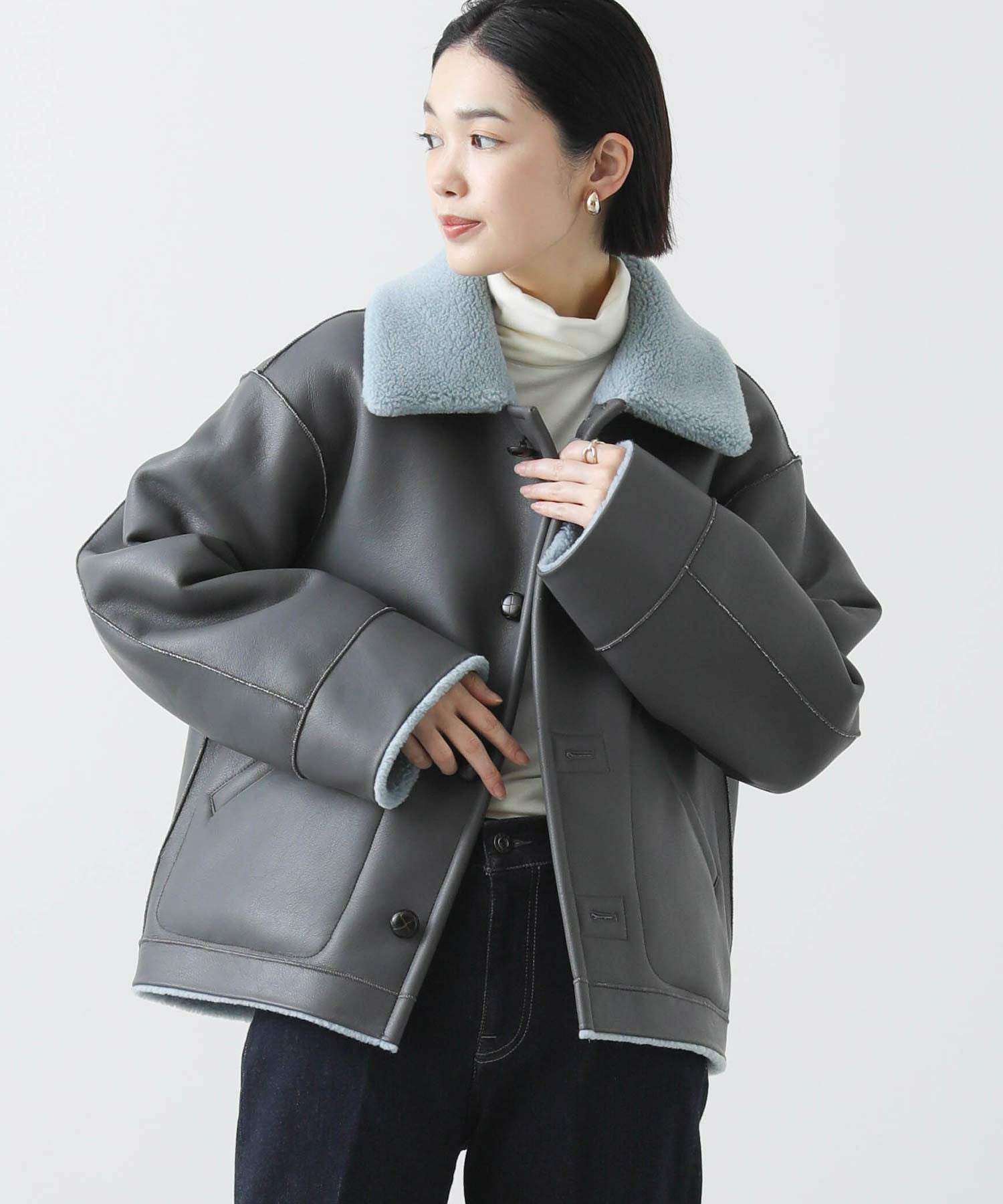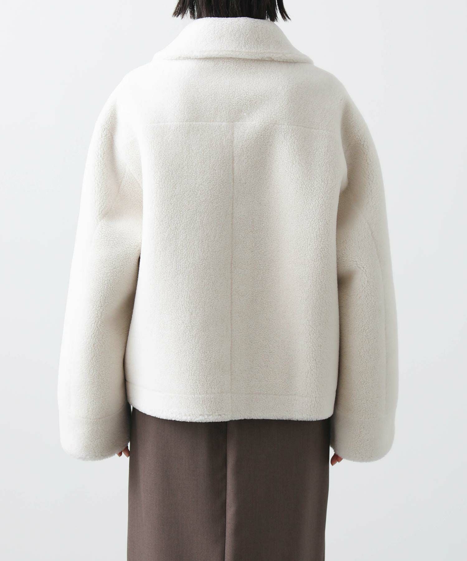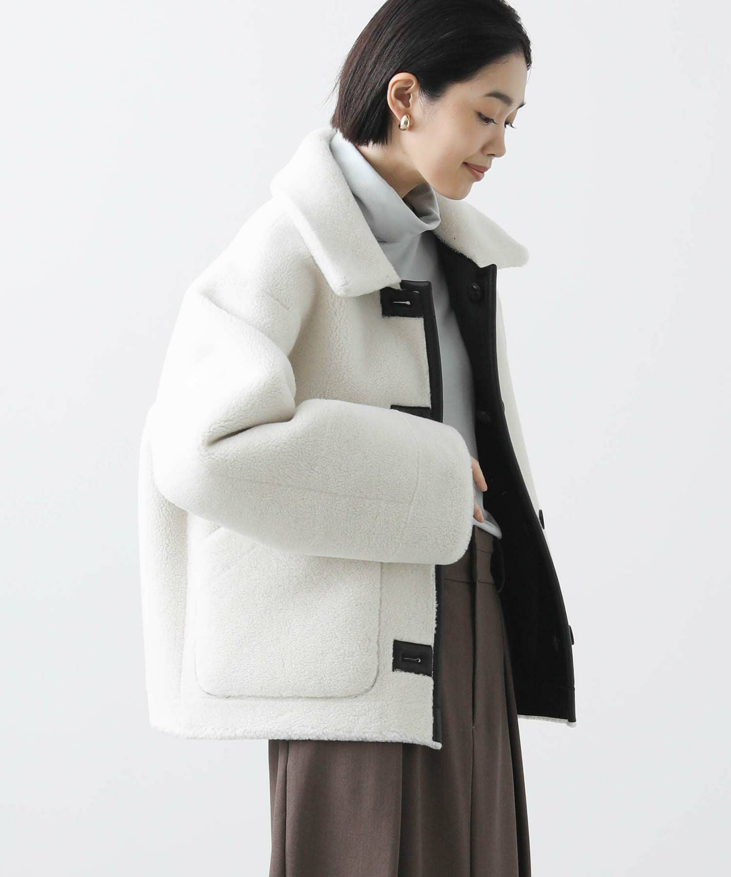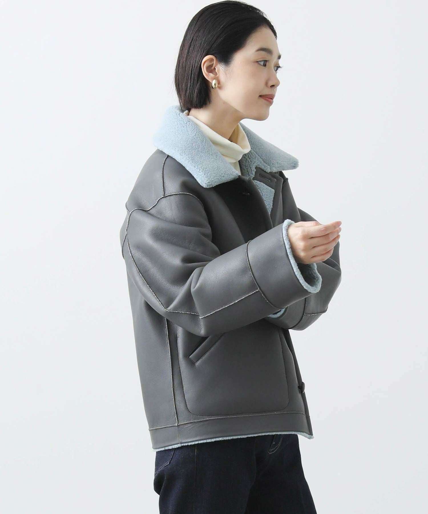 【BoutiqueOrdinary(ブティークオーディナリー)】から、ヴィンテージムートンコートをイメージしたリバーシブルボアブルゾンをセレクト。ホール周りのフェイクレザーの切り替えや革調のボタンなど、ディティールに拘っているのがポイントです。