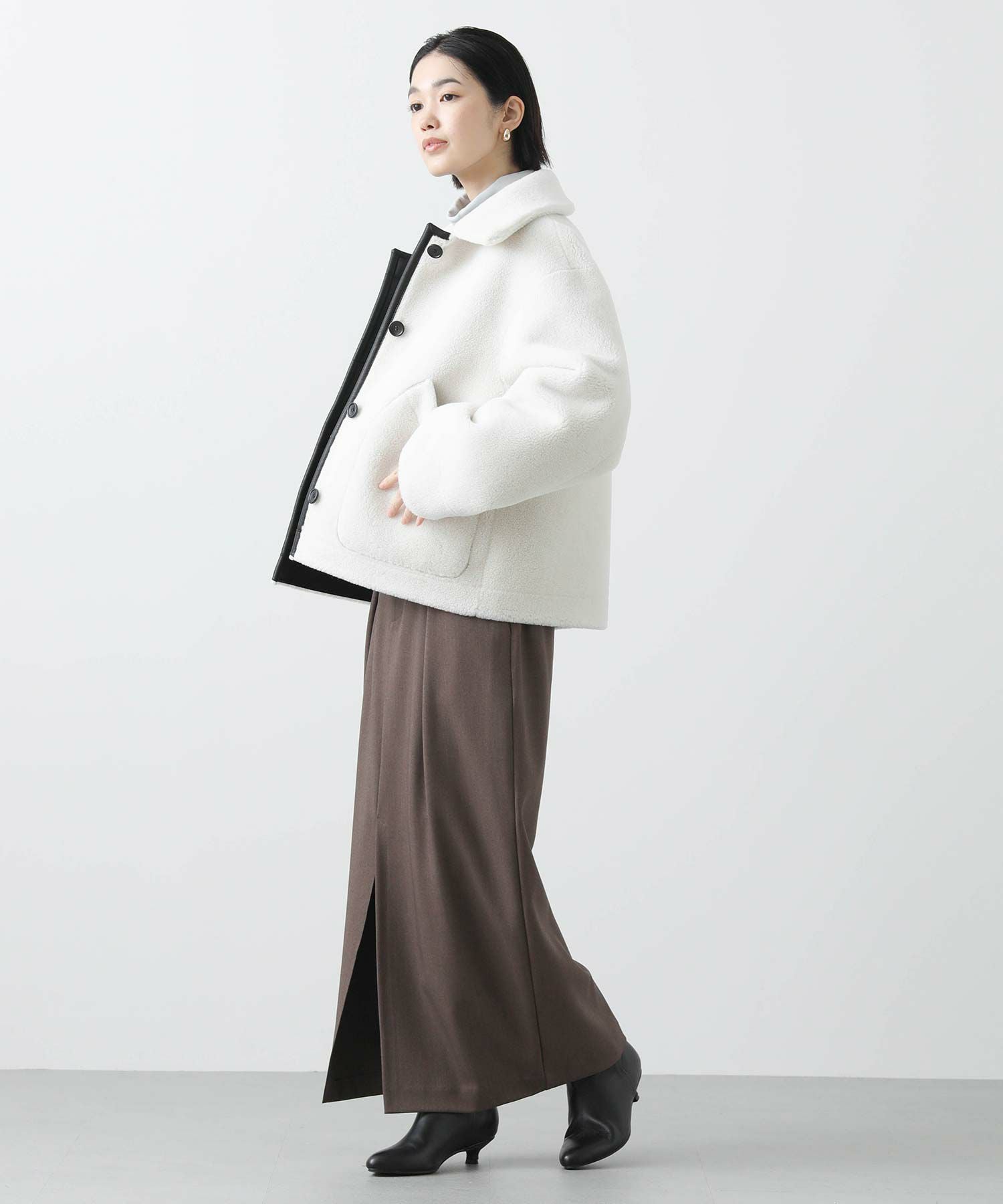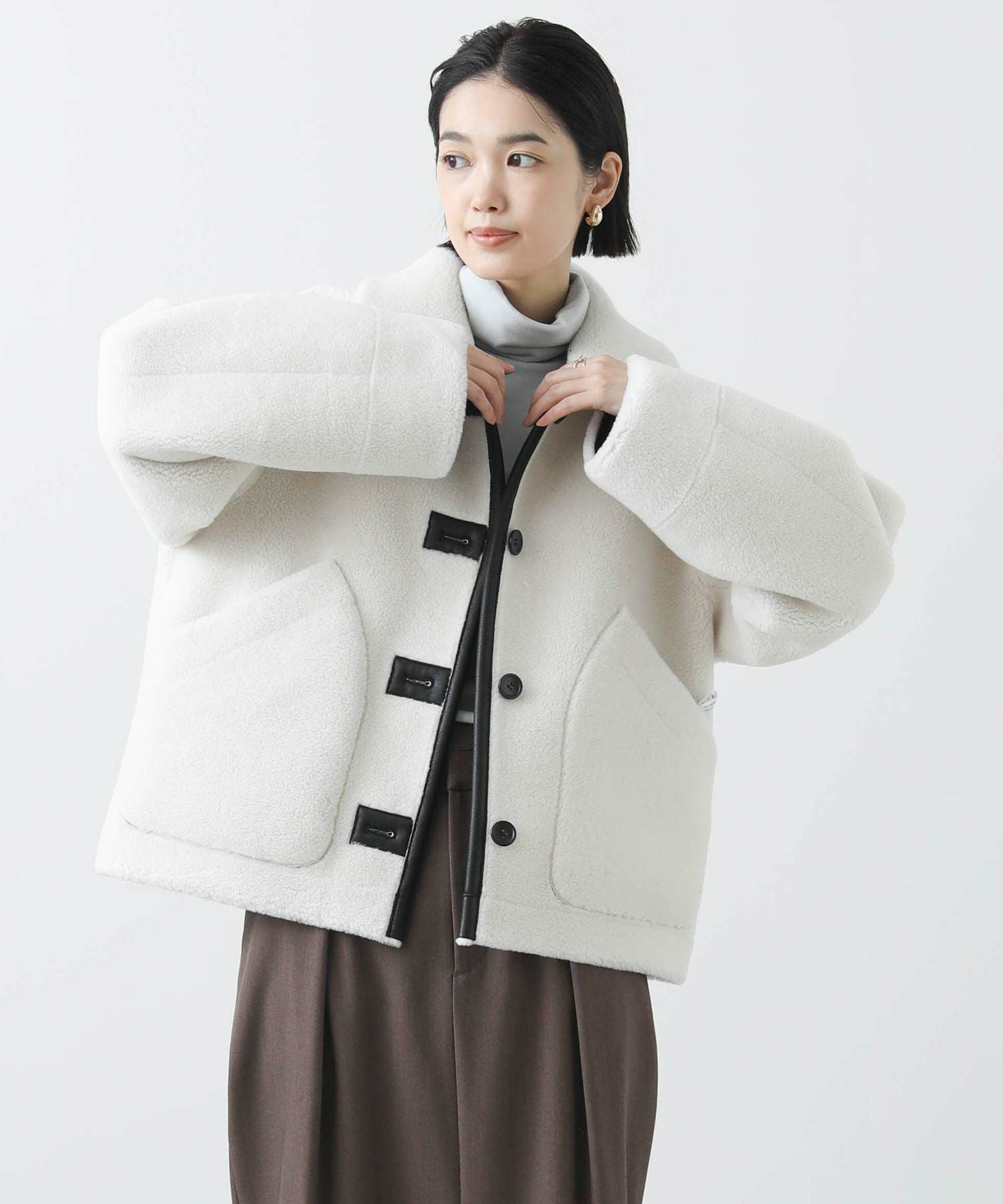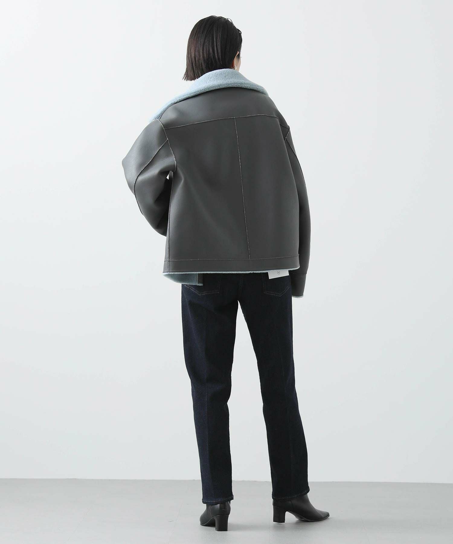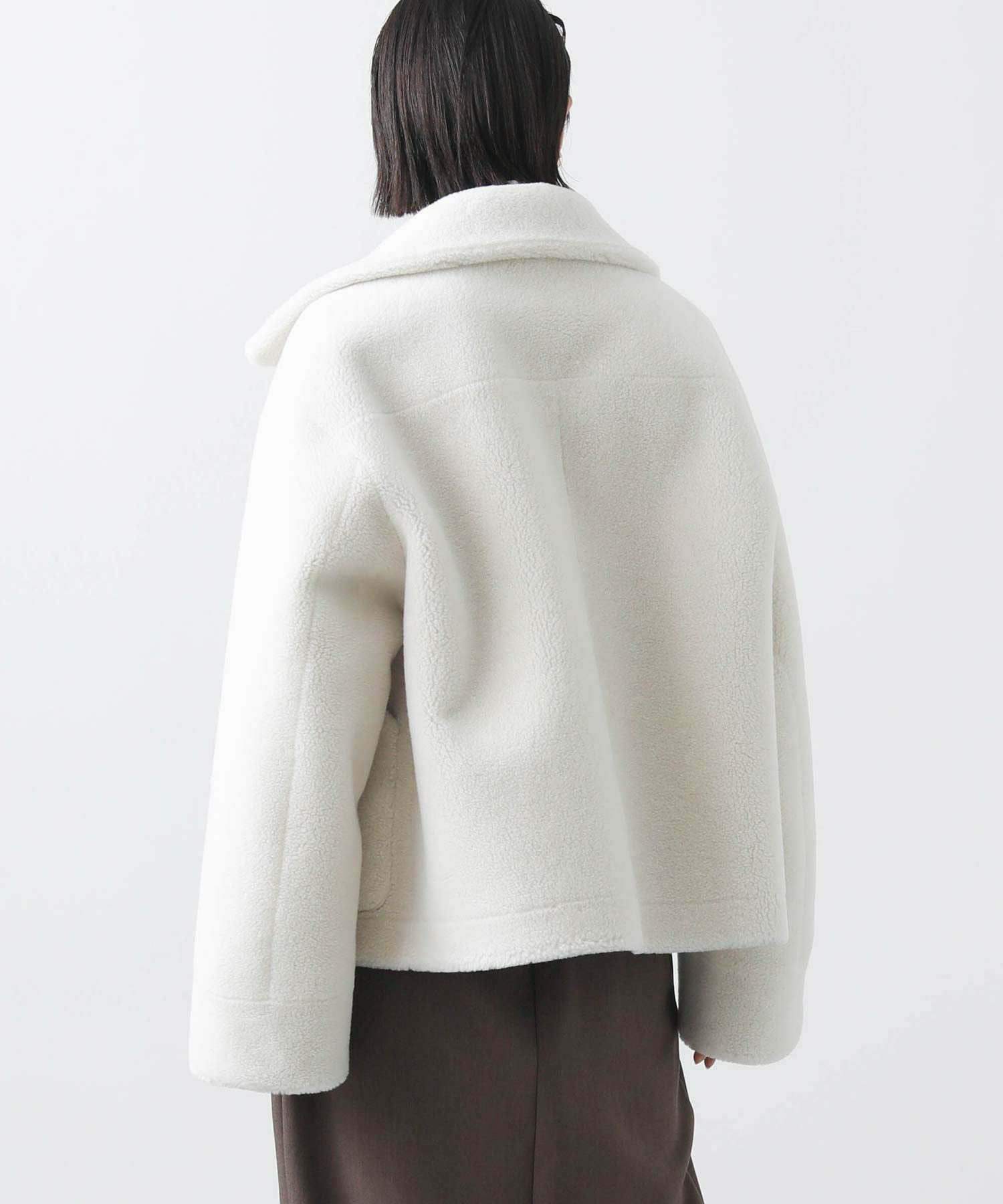 【BoutiqueOrdinary(ブティークオーディナリー)】から、ヴィンテージムートンコートをイメージしたリバーシブルボアブルゾンをセレクト。ホール周りのフェイクレザーの切り替えや革調のボタンなど、ディティールに拘っているのがポイントです。