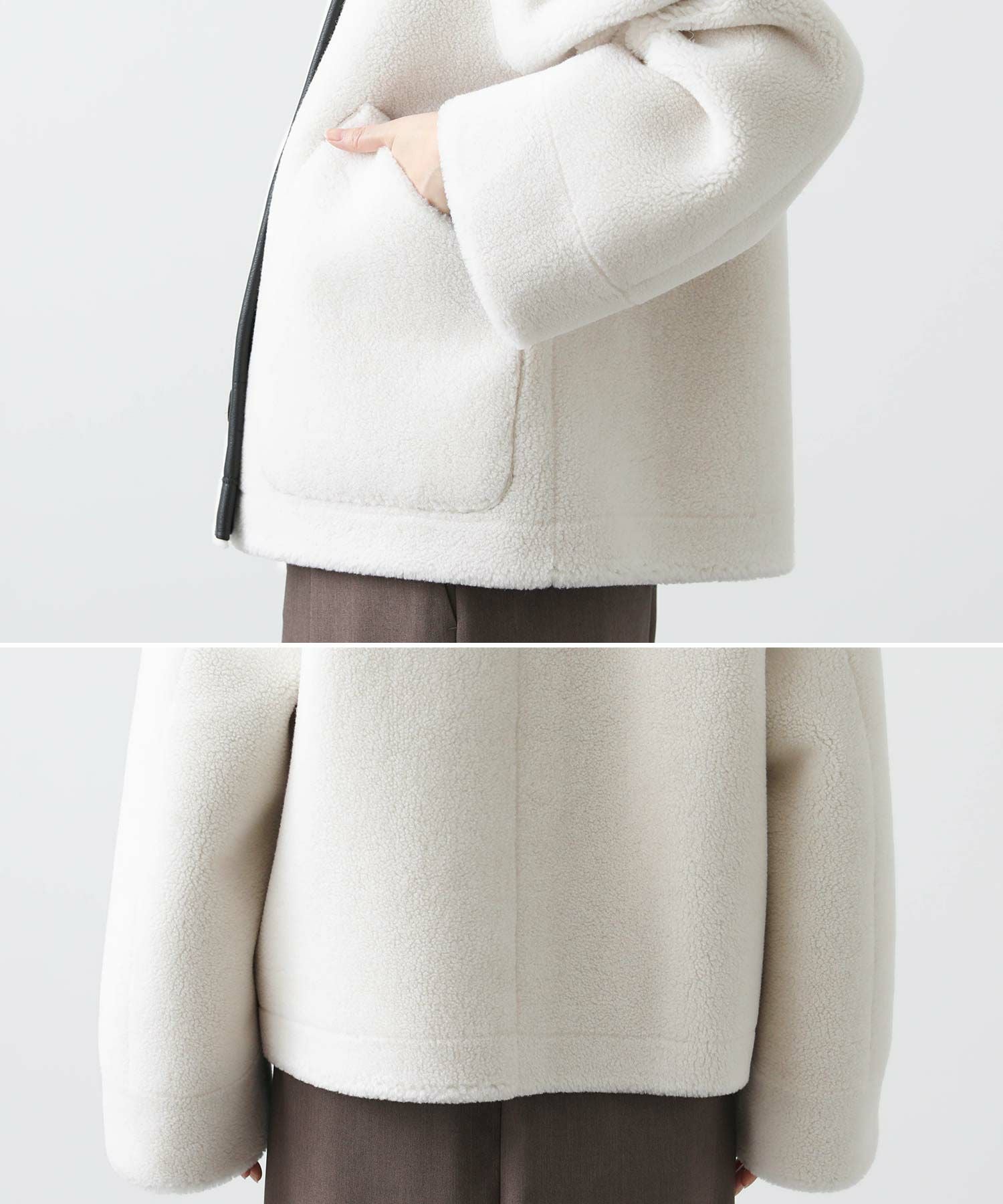 片面はボア素材で暖かさと快適さを提供し、もう片面はヴィンテージムートンの風合いを再現したフェイクレザーで、クラシックな雰囲気を演出。どちらも着用できる表情の異なるリバーシブル仕様なので、スタイルに合わせてアレンジを楽しめます。