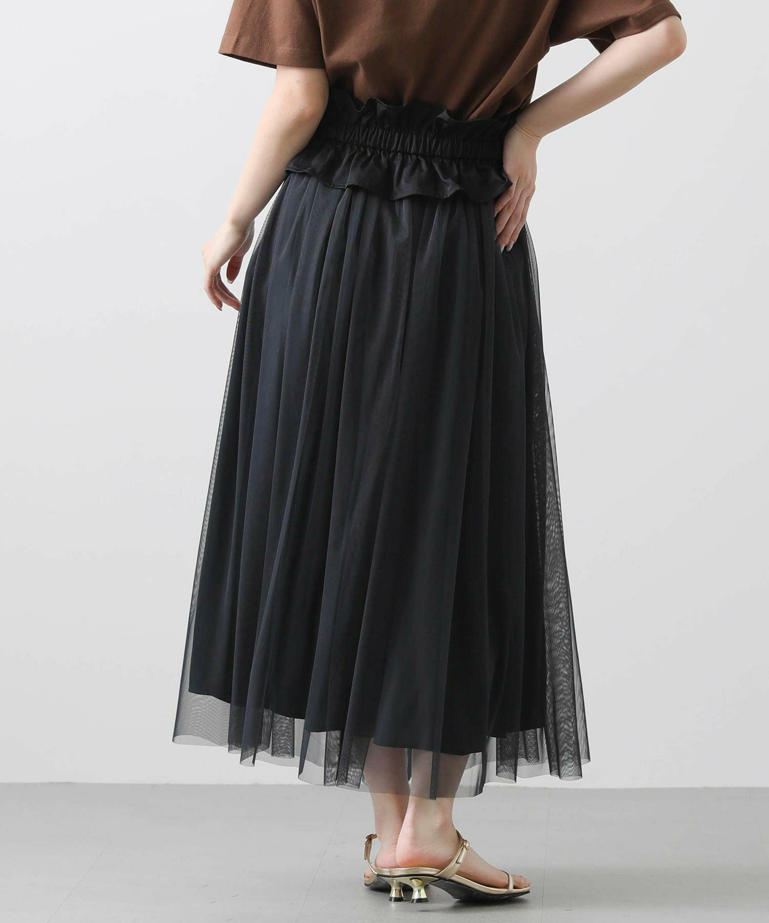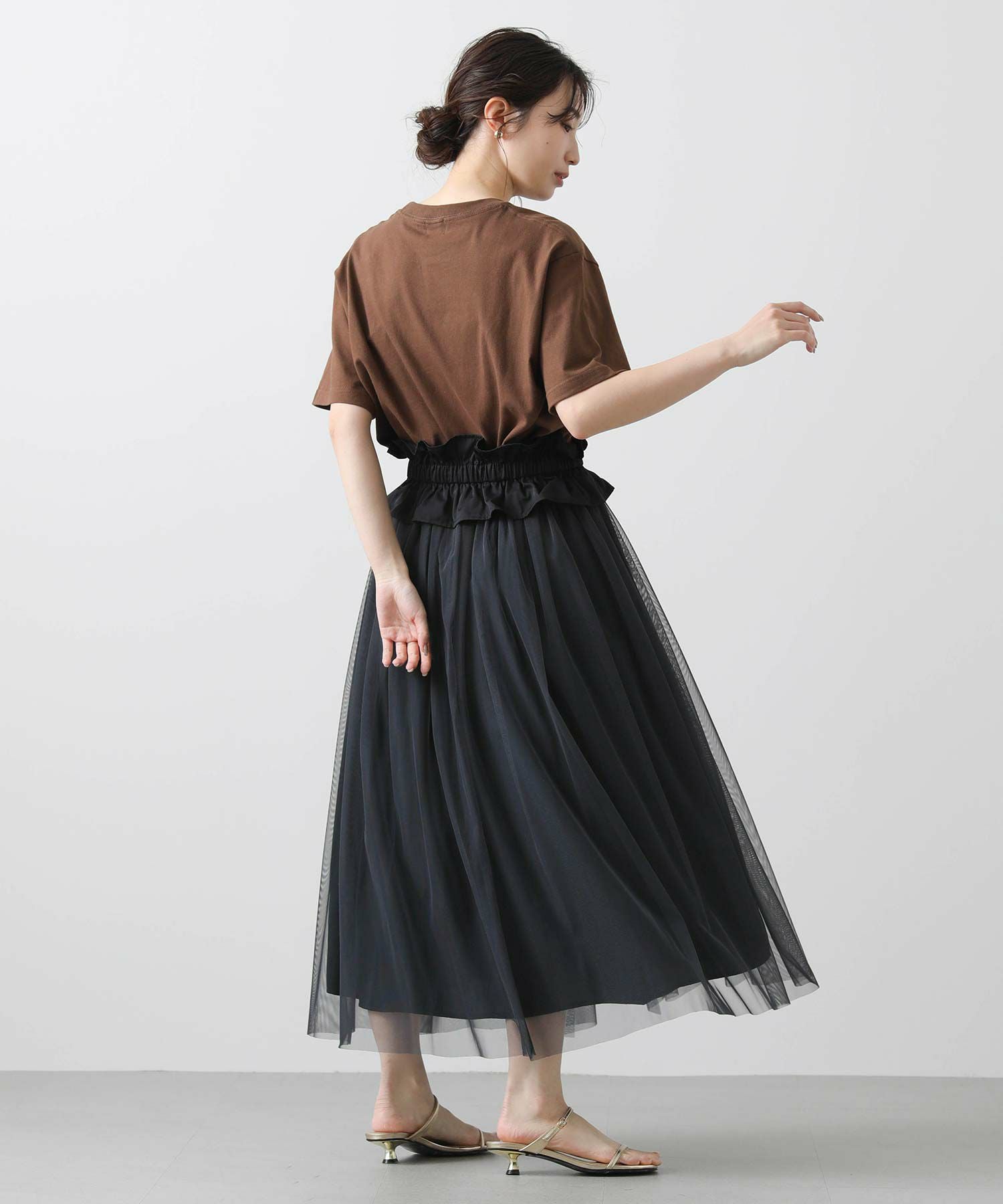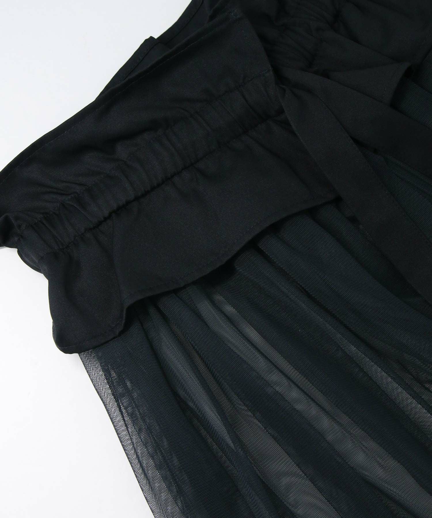 ウエスト部分にデザインされたペプラムベルトがスタイルを引き締め、女性らしいシルエットを強調します。軽やかなチュール素材がスカートに動きとボリュームを与え、エレガントな雰囲気を演出。ペチコートなしでデニムなどに合わせたレイヤードコーディネートもおすすめです。