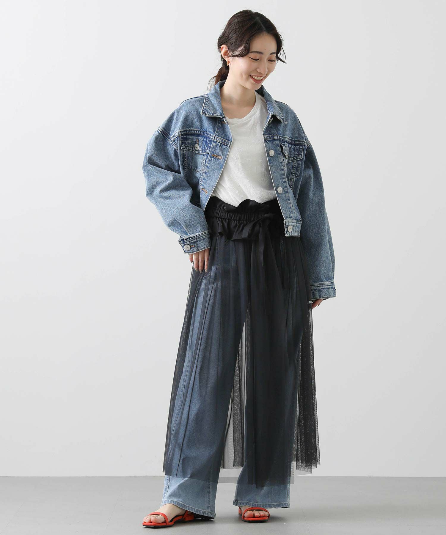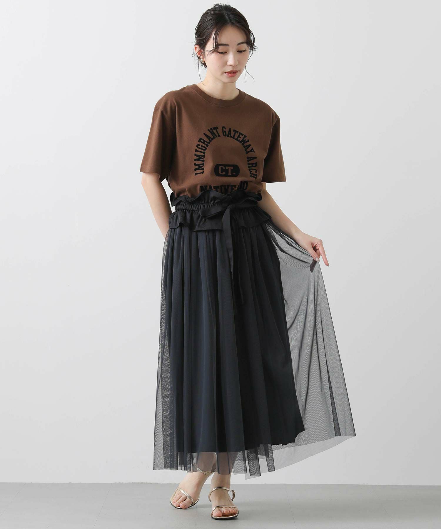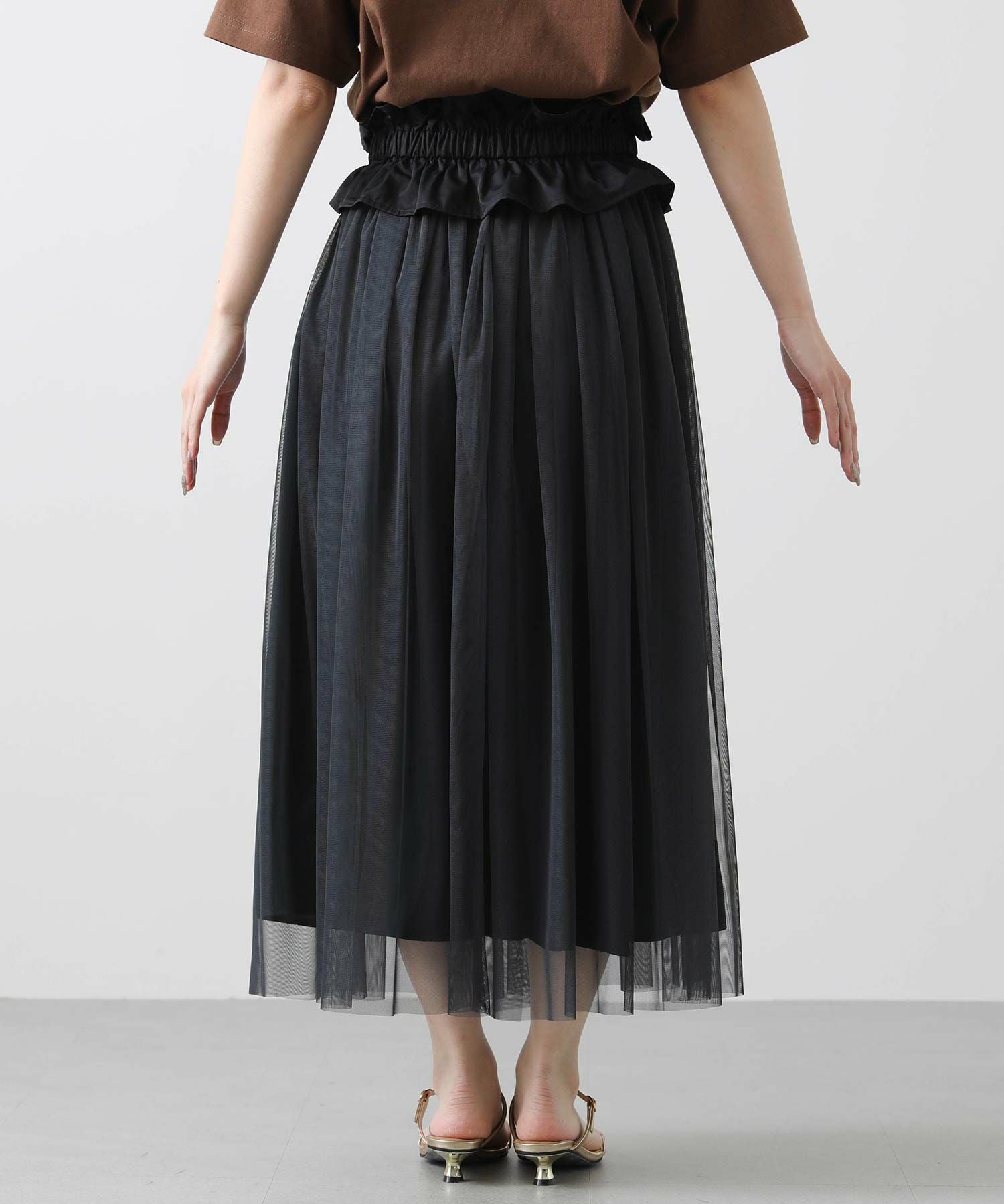 ウエスト部分にデザインされたペプラムベルトがスタイルを引き締め、女性らしいシルエットを強調します。軽やかなチュール素材がスカートに動きとボリュームを与え、エレガントな雰囲気を演出。ペチコートなしでデニムなどに合わせたレイヤードコーディネートもおすすめです。