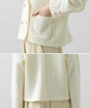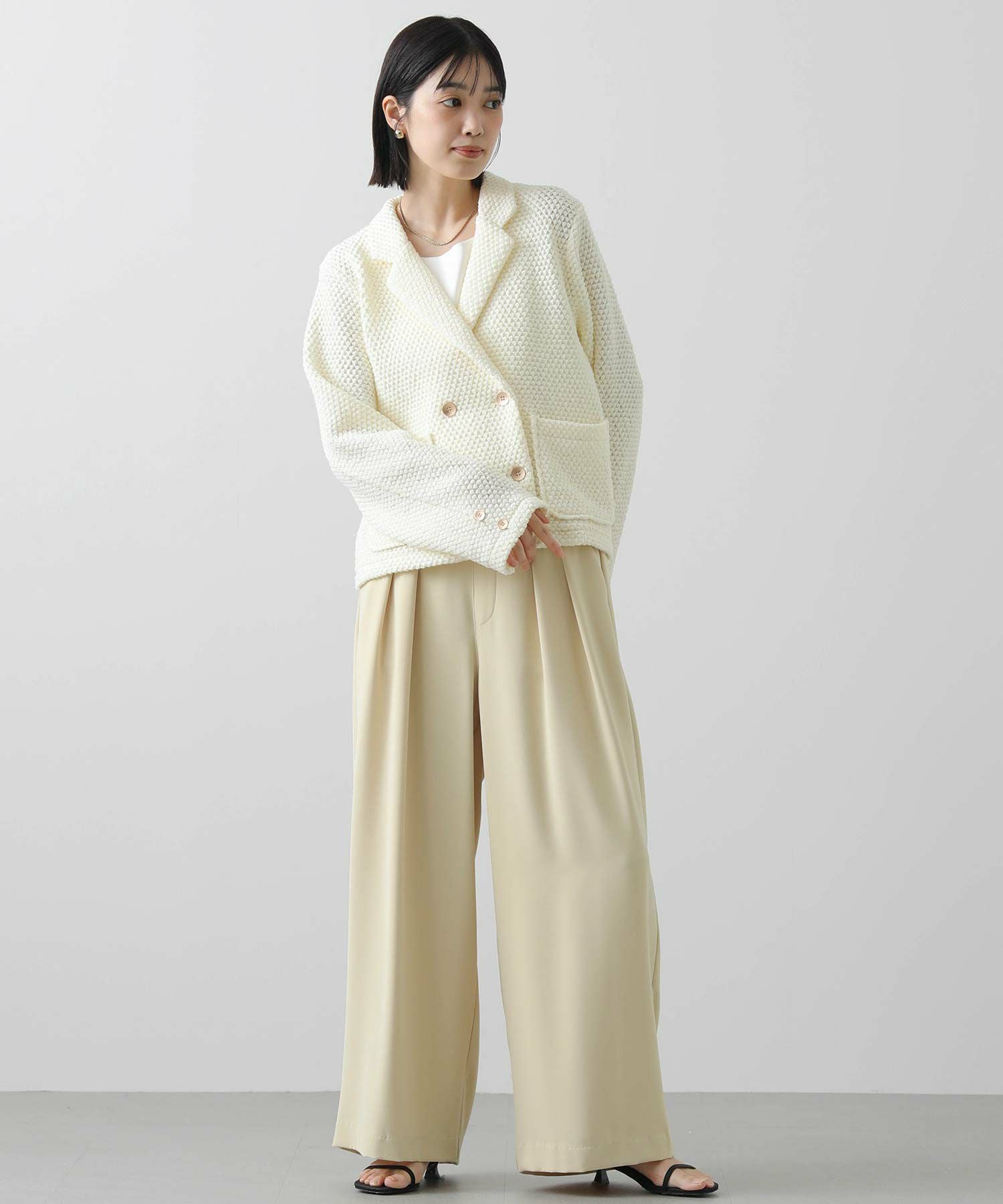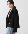 立体感ある生地がしなやかで軽く、着やすい一着です。ダブルボタンの短丈ジャケットでお出かけやオケージョンなどの上品な着こなしから、デニムやジョガーパンツなどのカジュアルなコーデまで、雰囲気を変えながらもしっくりくるとても使えるジャケットです。