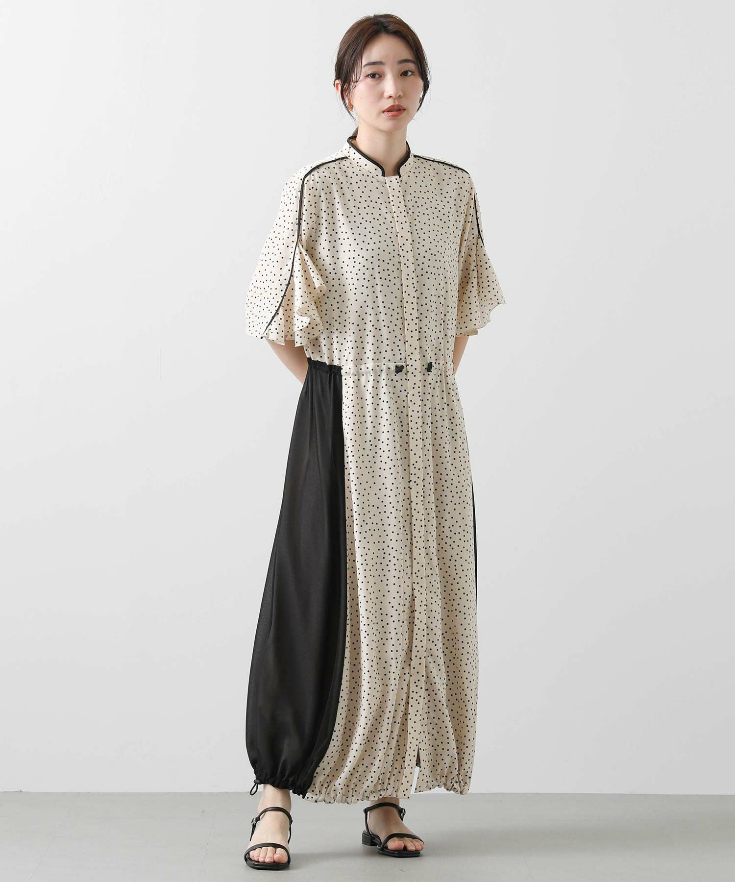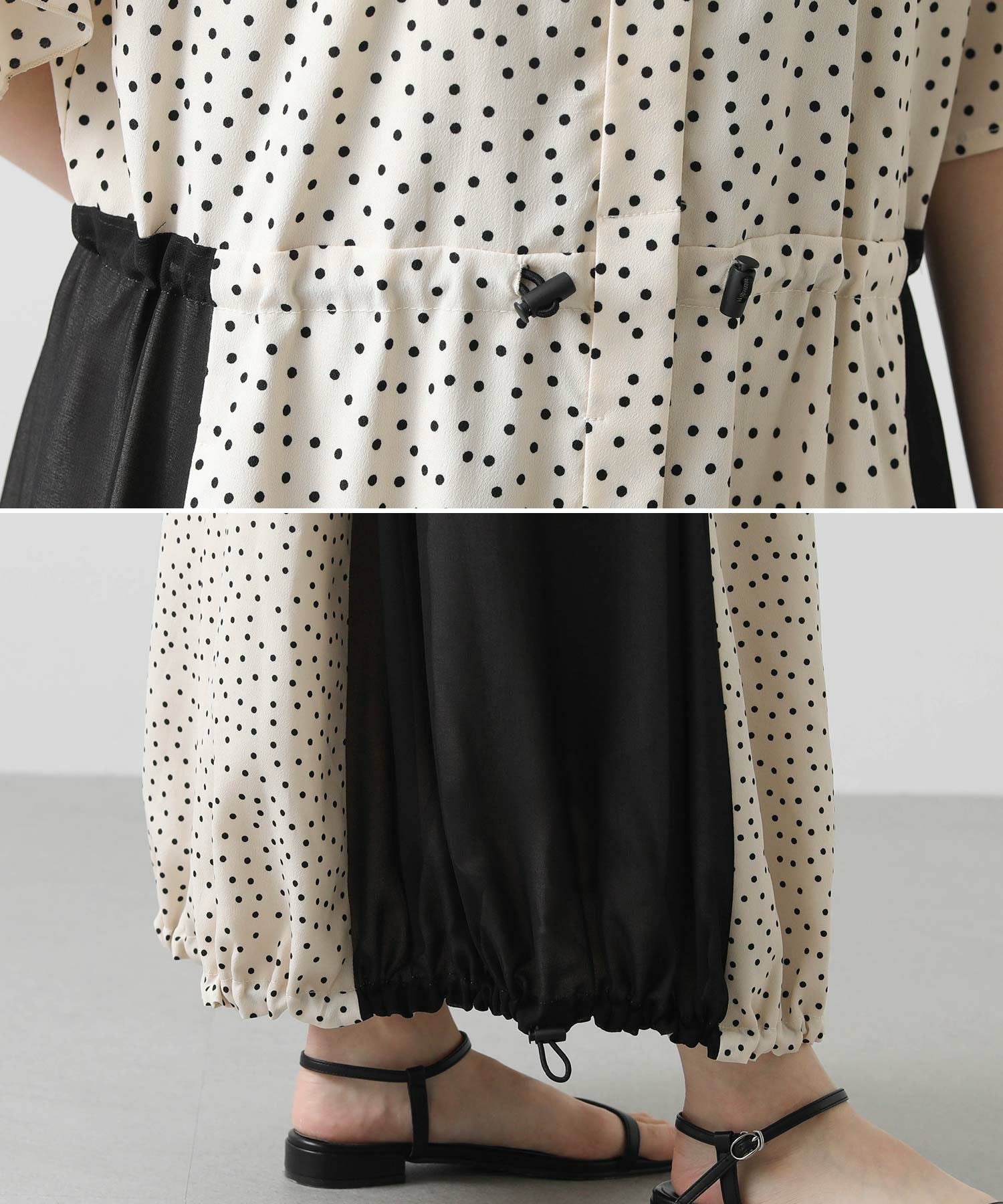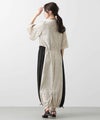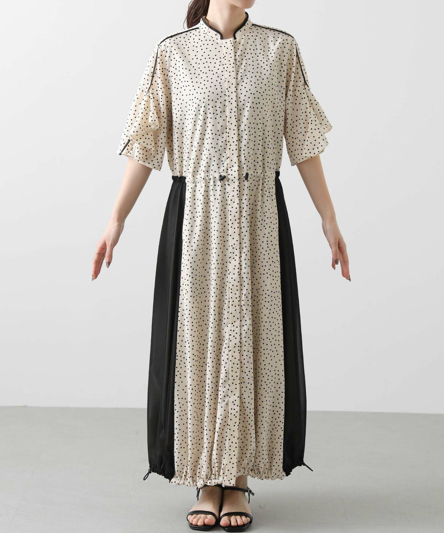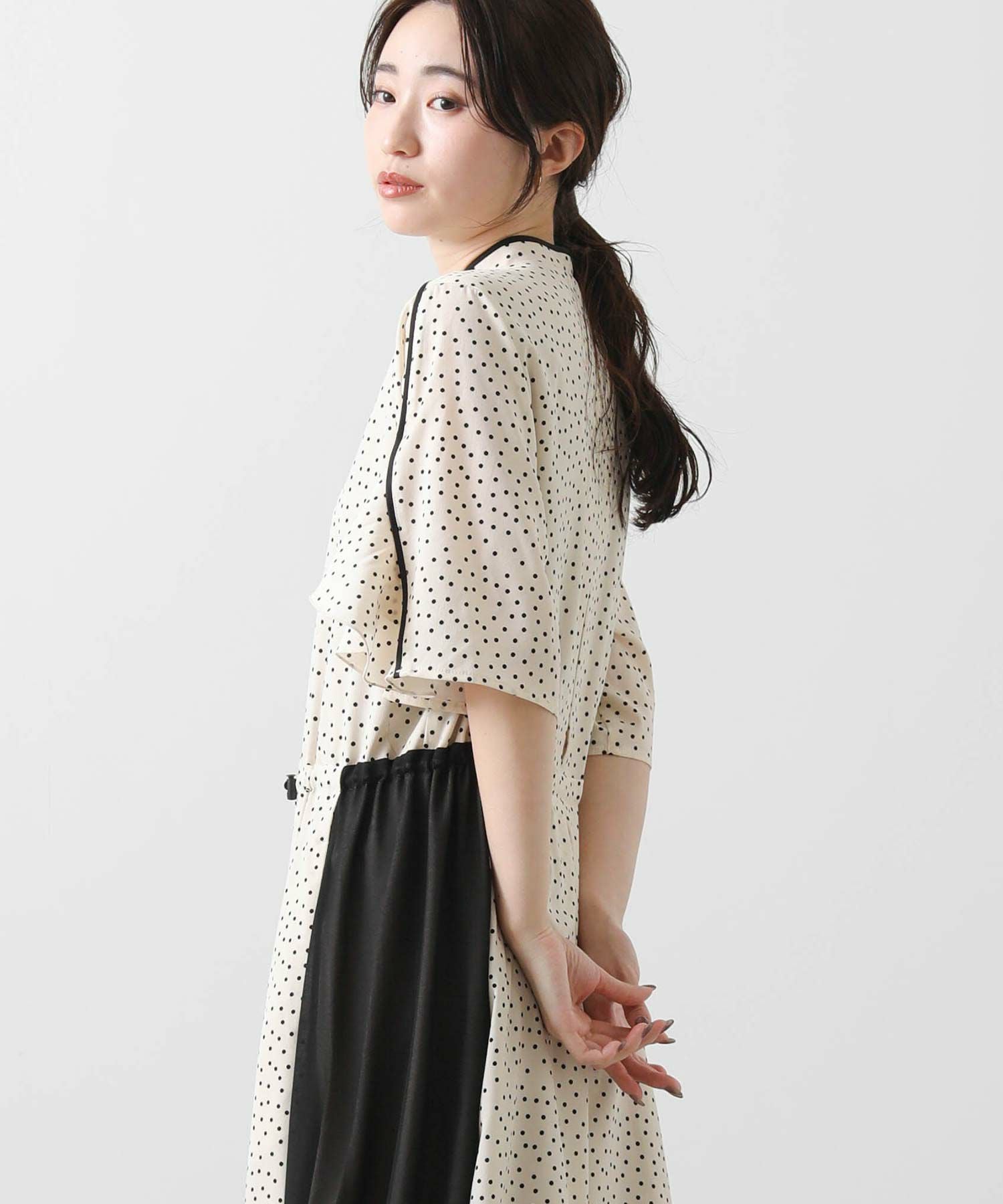 スカート部分の両脇をシフォンで切り替えることで、メリハリをつけ動きのあるデザインポイントに。前が全部開くので羽織りとしても着用可能で、長いシーズンお使いいただけます。