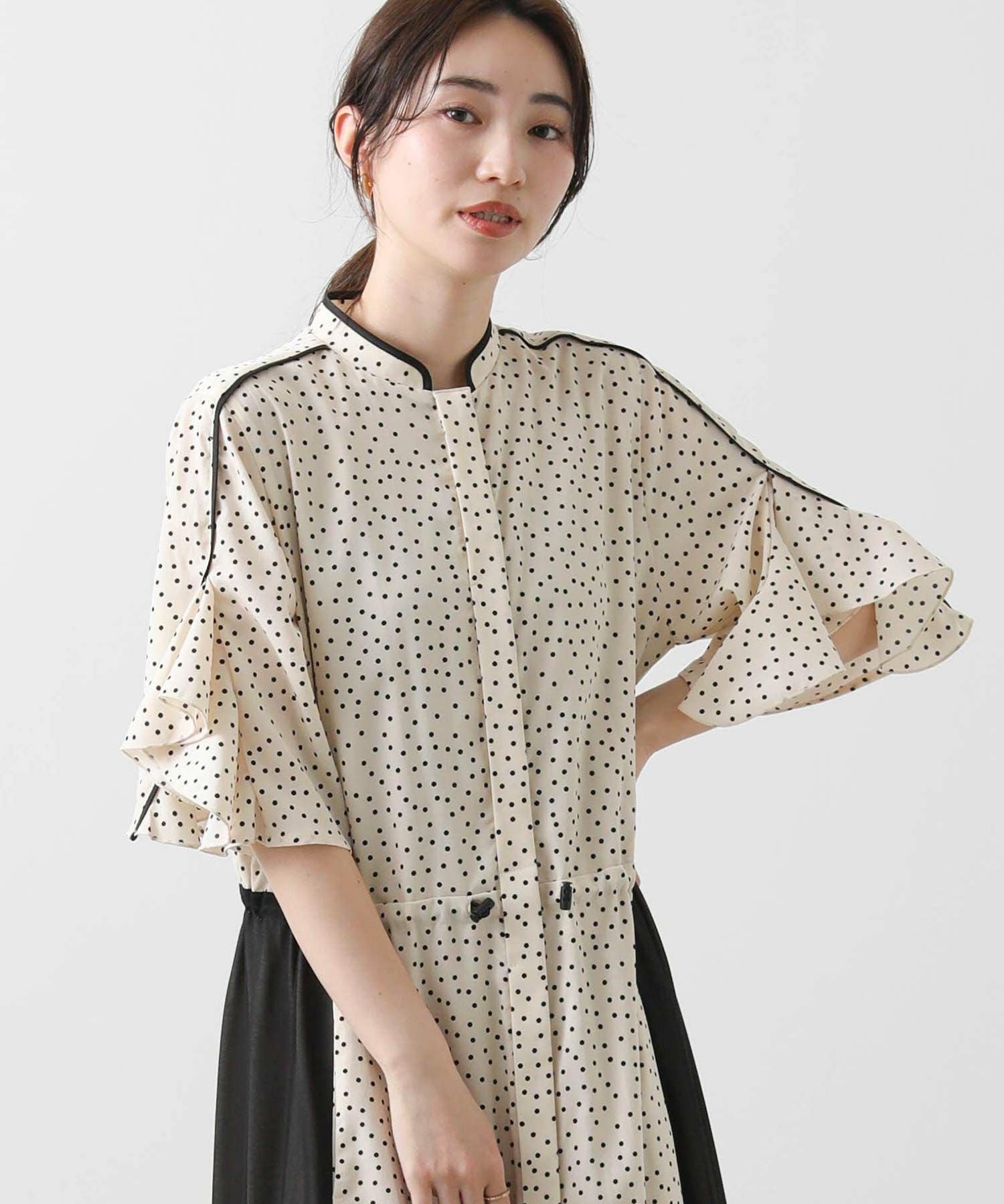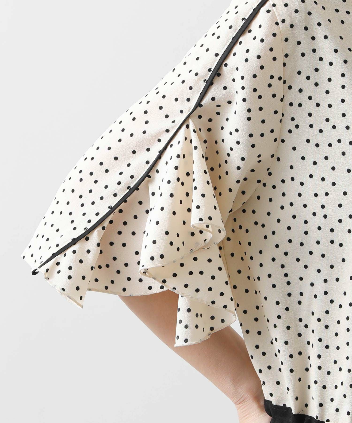袖口がフリルになったフェミニンなシフォンワンピース。襟と肩から袖口にかけて施したパイピングディテールがアクセントになっています。ウエストと裾にストッパーを付けたドロスト仕様なので、フィット&フレアーラインやコクーンシルエットといったデザインの変化も楽しめます。