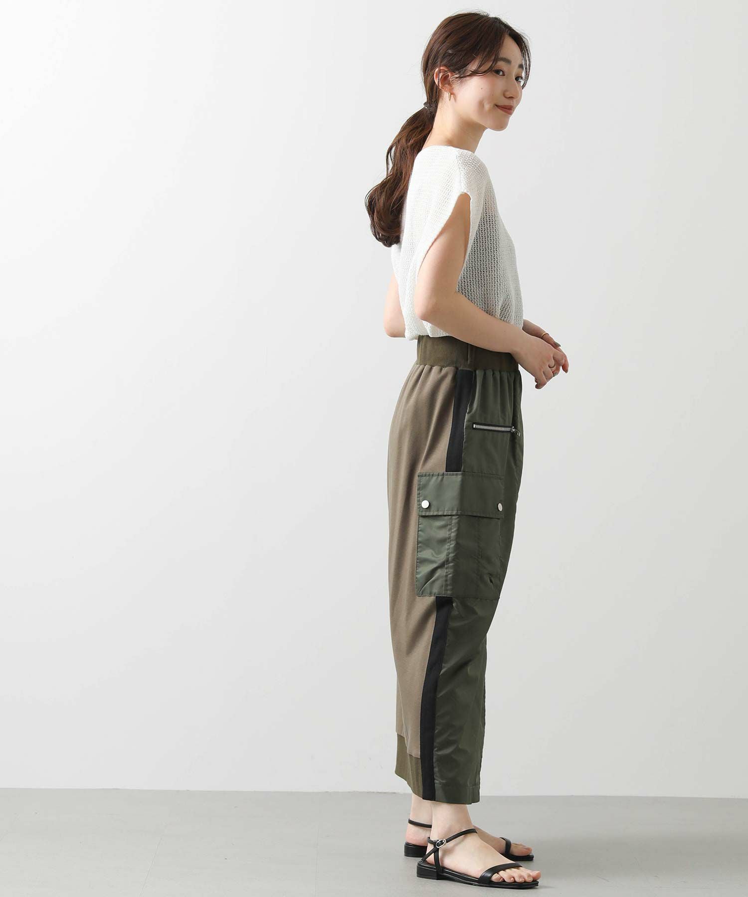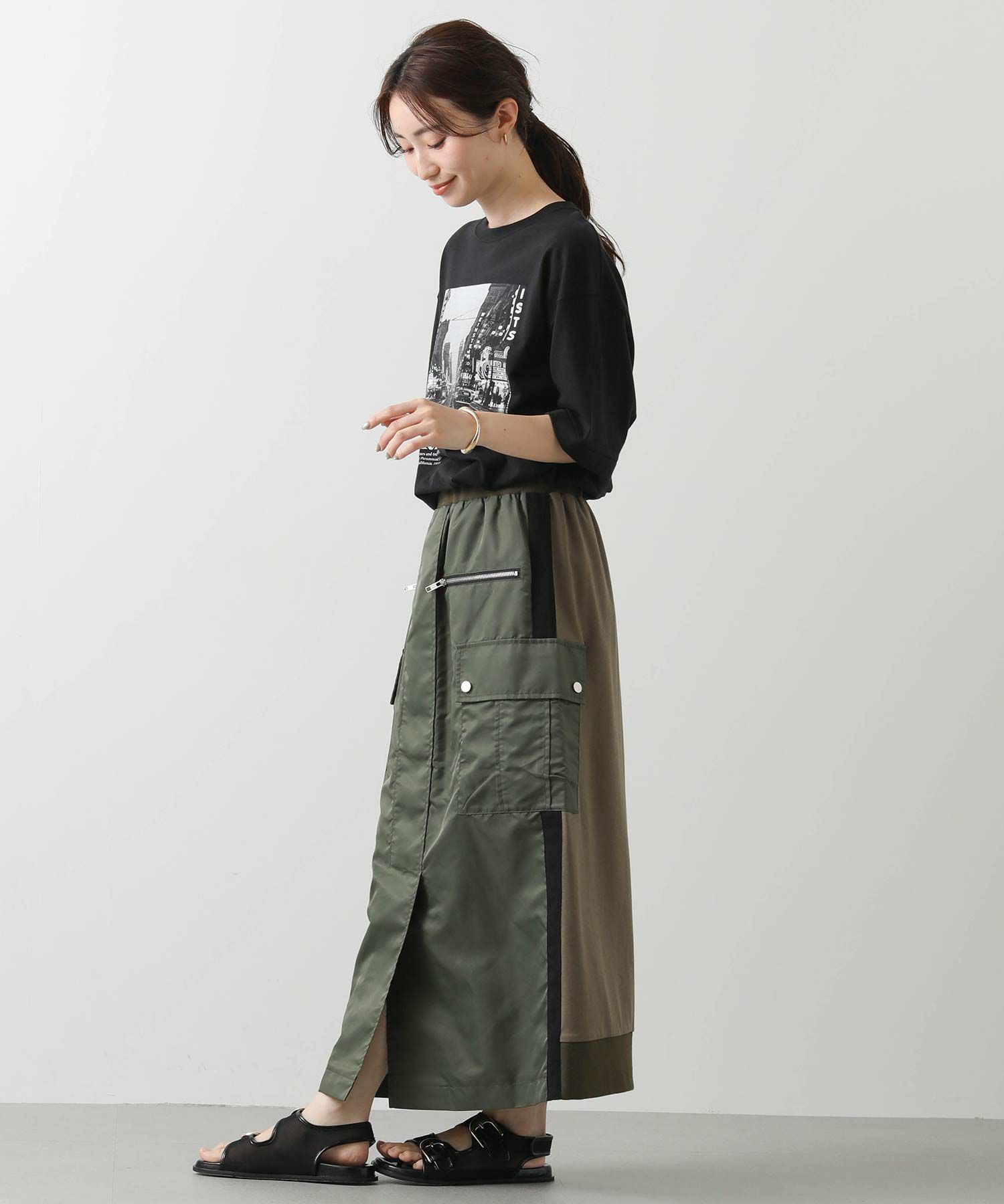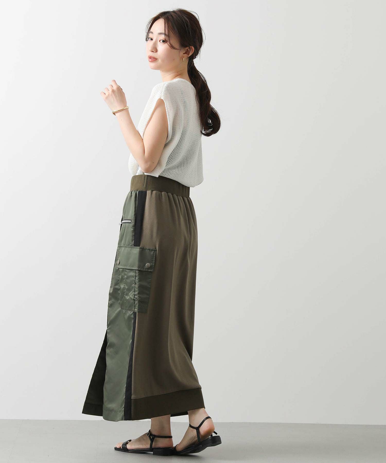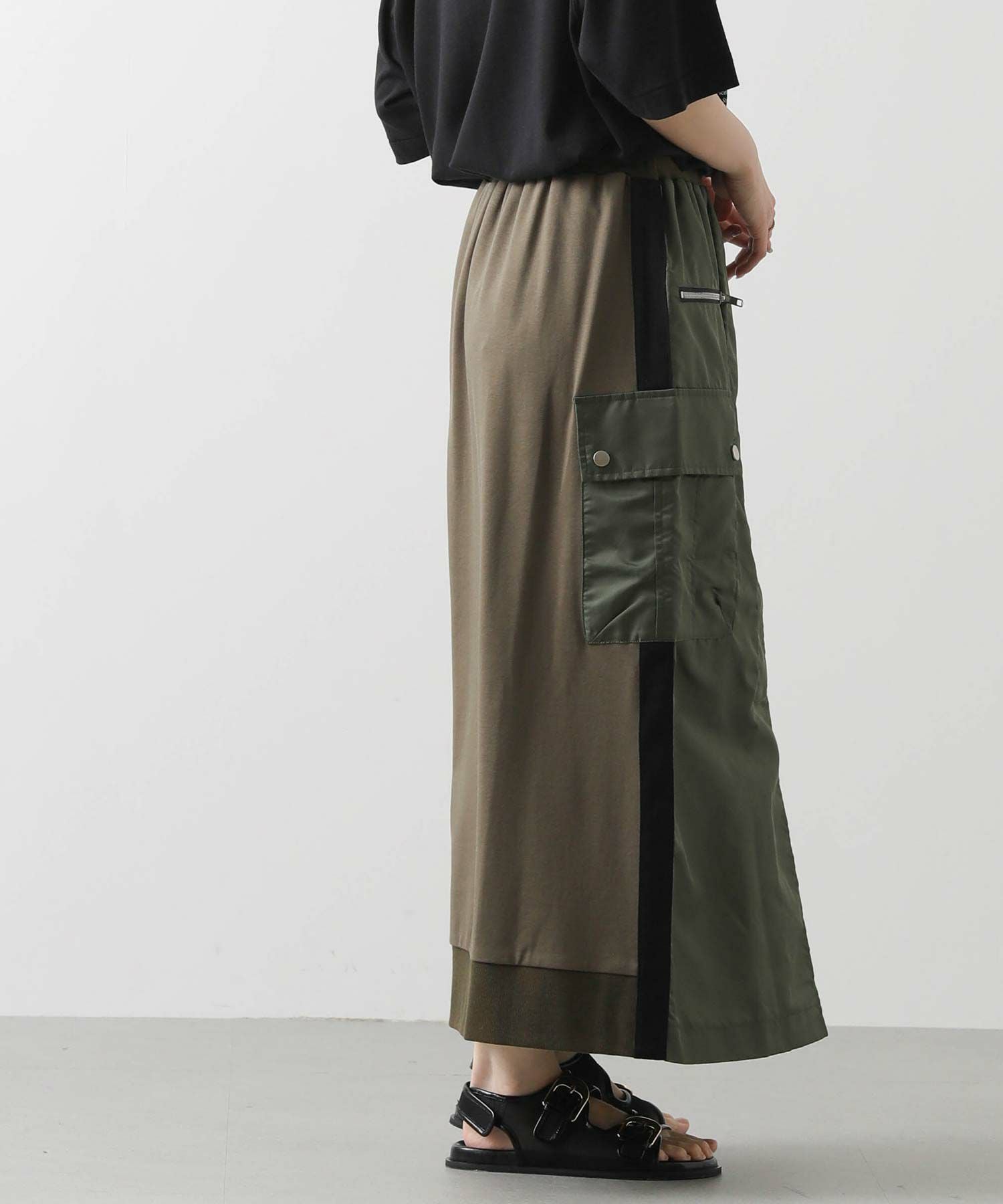 前面は光沢感のあるナイロン素材、背面はマットで伸縮性の高いコットンスムースを使用し、異素材の切り替えが個性的なアクセントに。動くたびに表情が変わるので、シンプルなトップスと合わせてもこなれた雰囲気に仕上がります。