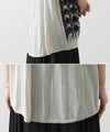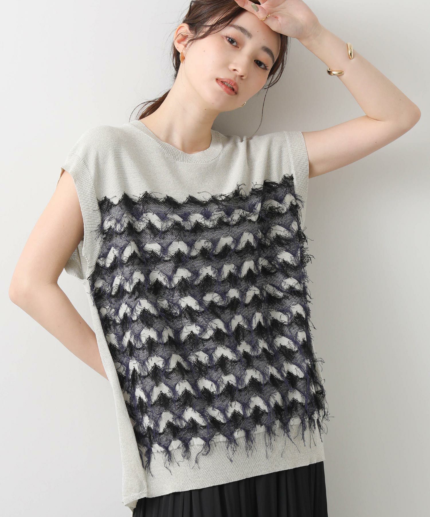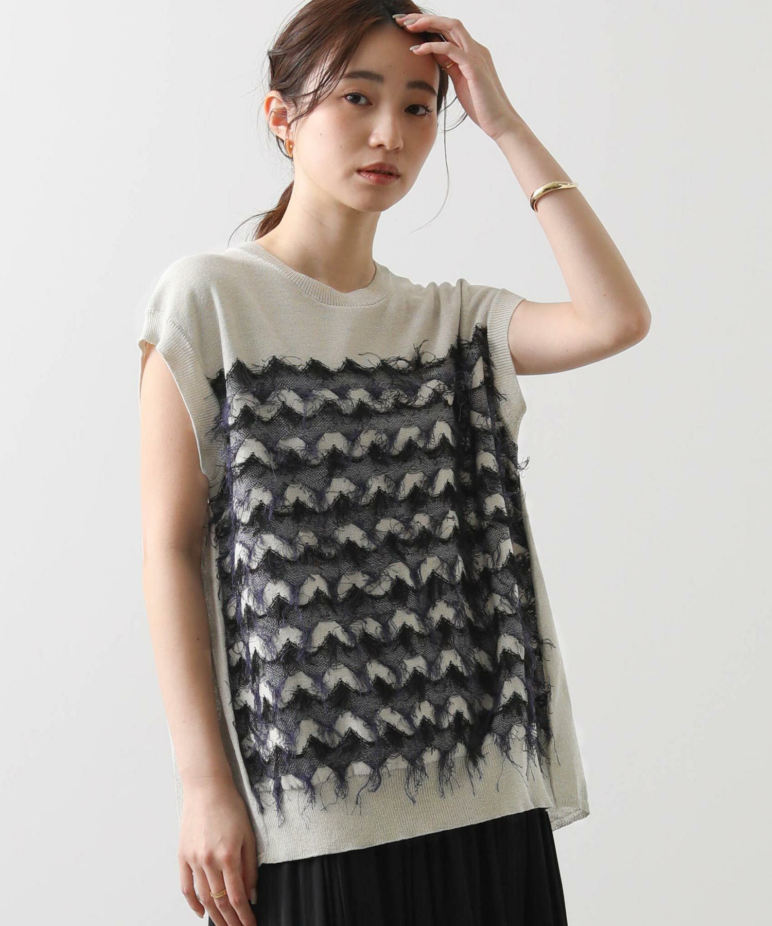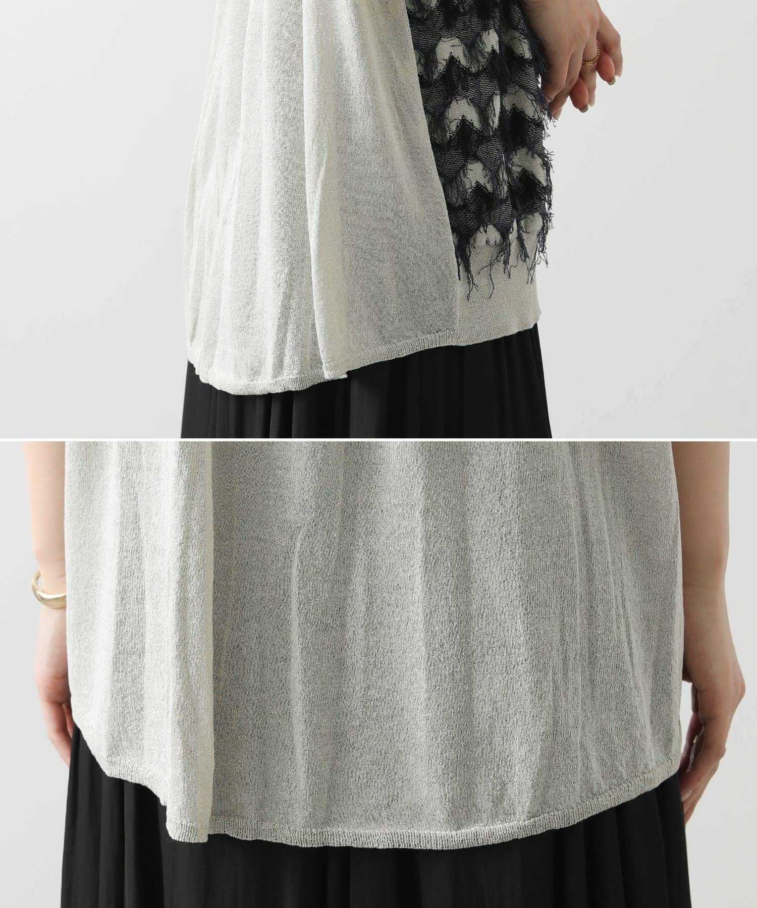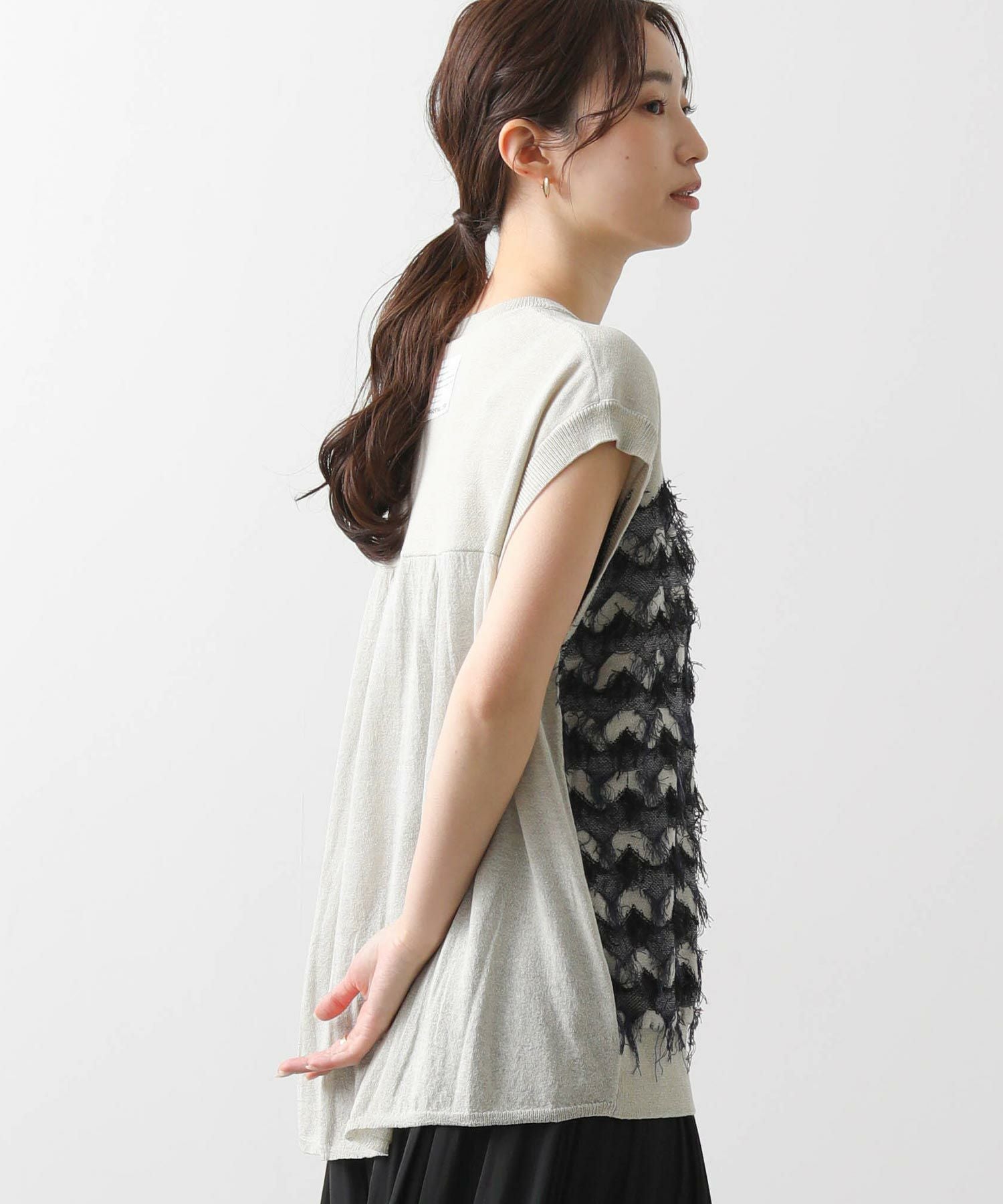 前身頃はジグザグのジャガード編みに。上下2配色仕様で、それぞれ端始末を糸フリンジにしています。後身頃は同色を甘く天竺編みにして、シアー感のあるデザインにギャザーを入れ、裾に向けてフレアが広がるAラインシルエットに仕上げました。抜け感を作り出すゆとりのあるサイジングながら、強撚糸のため甘めに編んでもダラっとせずに、しっかりした編地に仕上がっています。シャリっとしたドライ感が涼し気で、夏にピッタリなニットです。