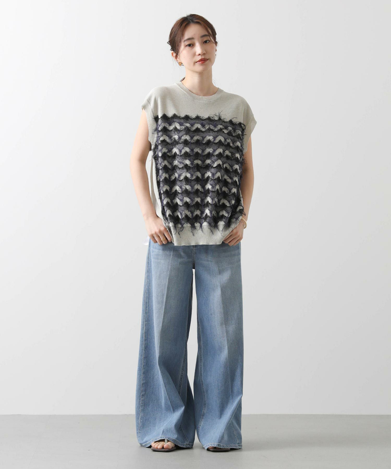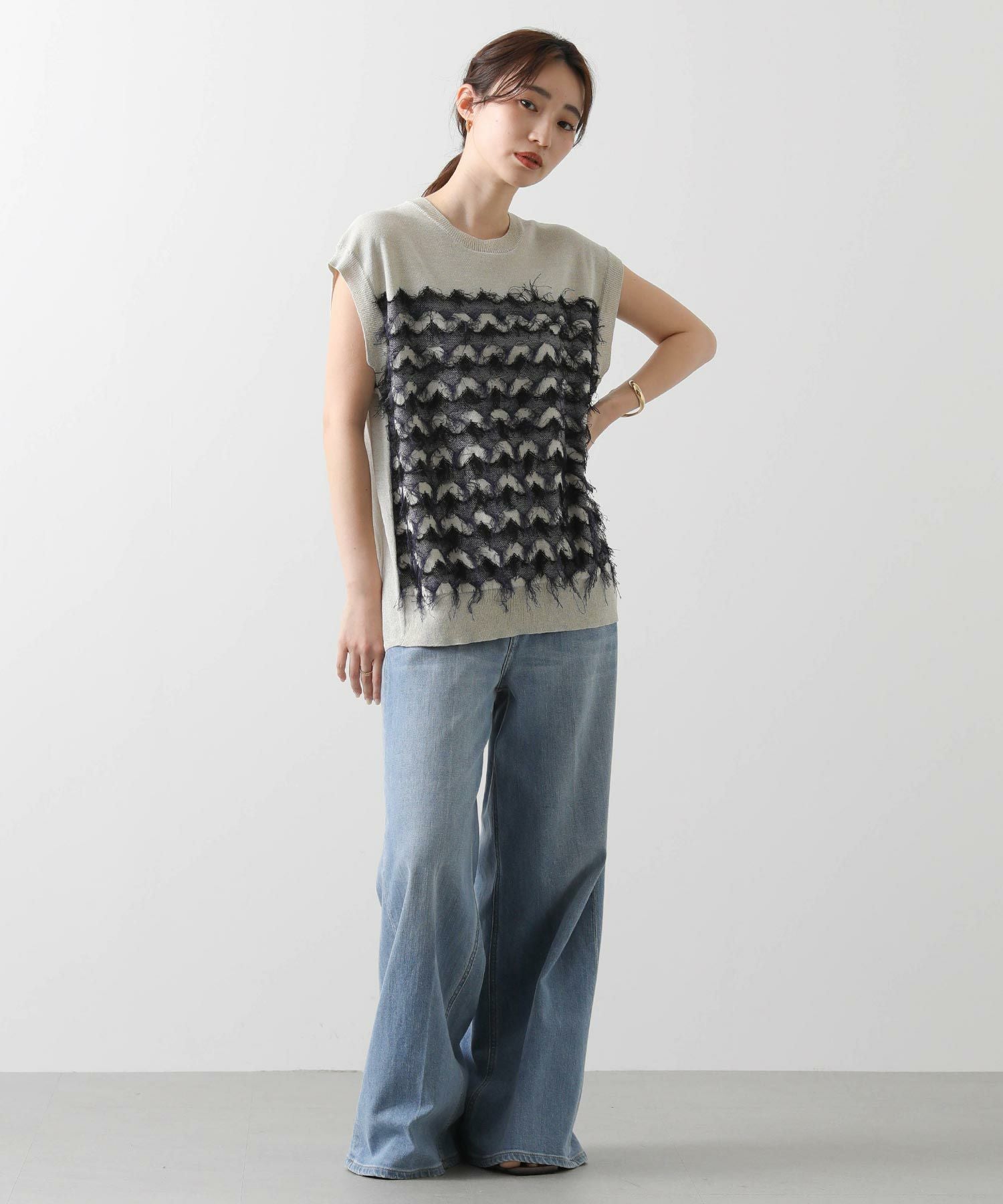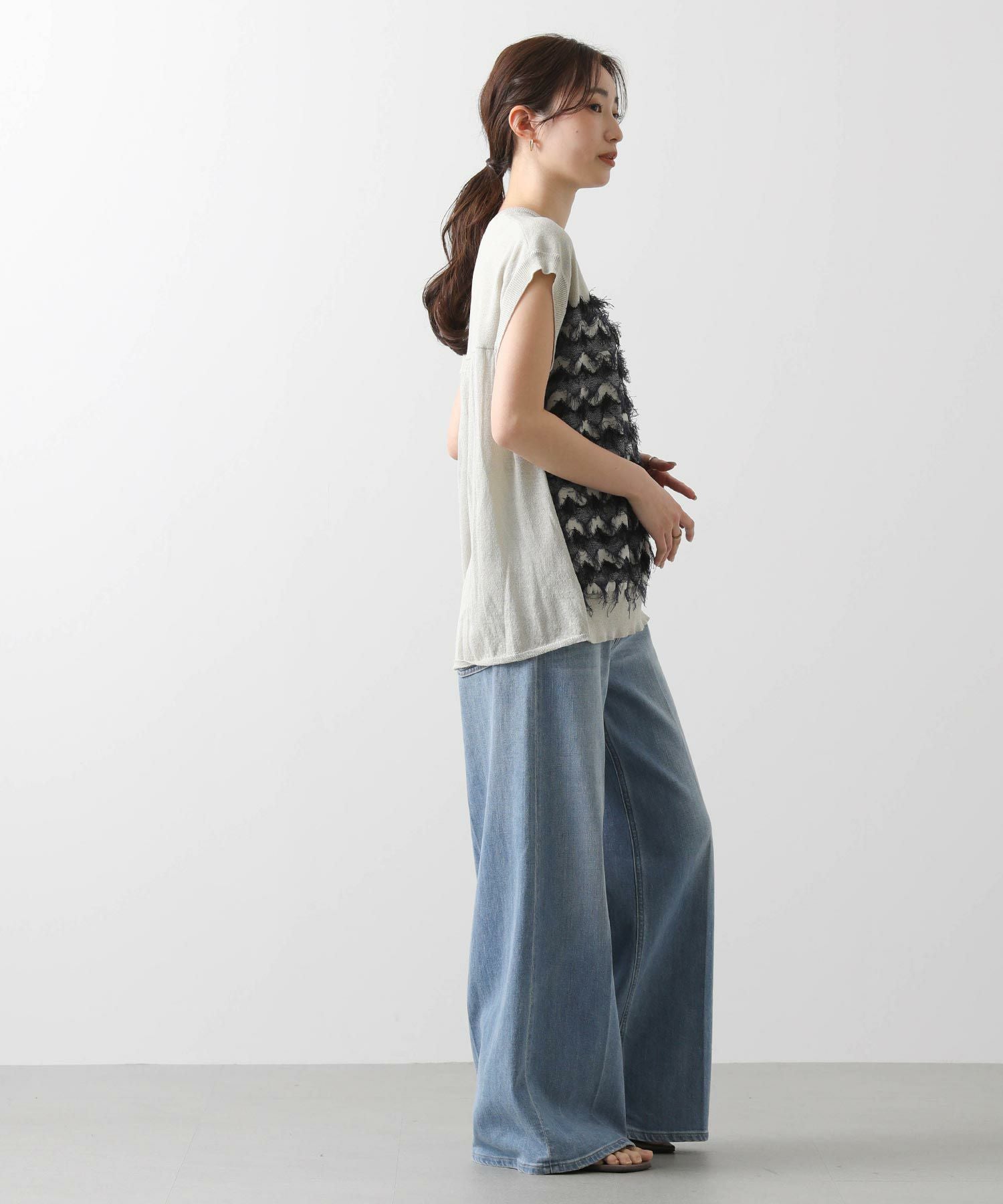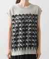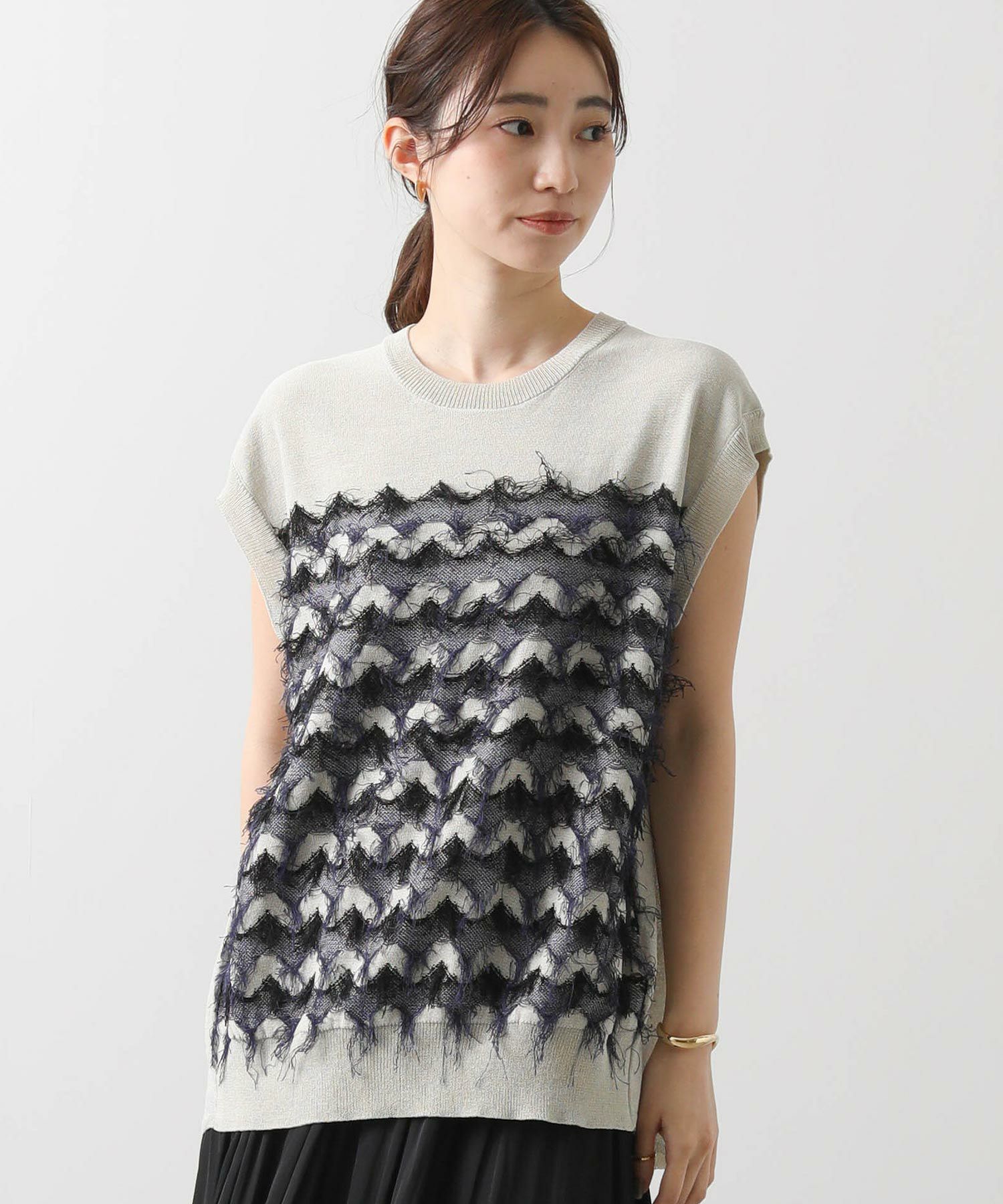 前身頃はジグザグのジャガード編みに。上下2配色仕様で、それぞれ端始末を糸フリンジにしています。後身頃は同色を甘く天竺編みにして、シアー感のあるデザインにギャザーを入れ、裾に向けてフレアが広がるAラインシルエットに仕上げました。抜け感を作り出すゆとりのあるサイジングながら、強撚糸のため甘めに編んでもダラっとせずに、しっかりした編地に仕上がっています。シャリっとしたドライ感が涼し気で、夏にピッタリなニットです。