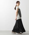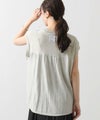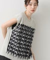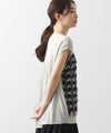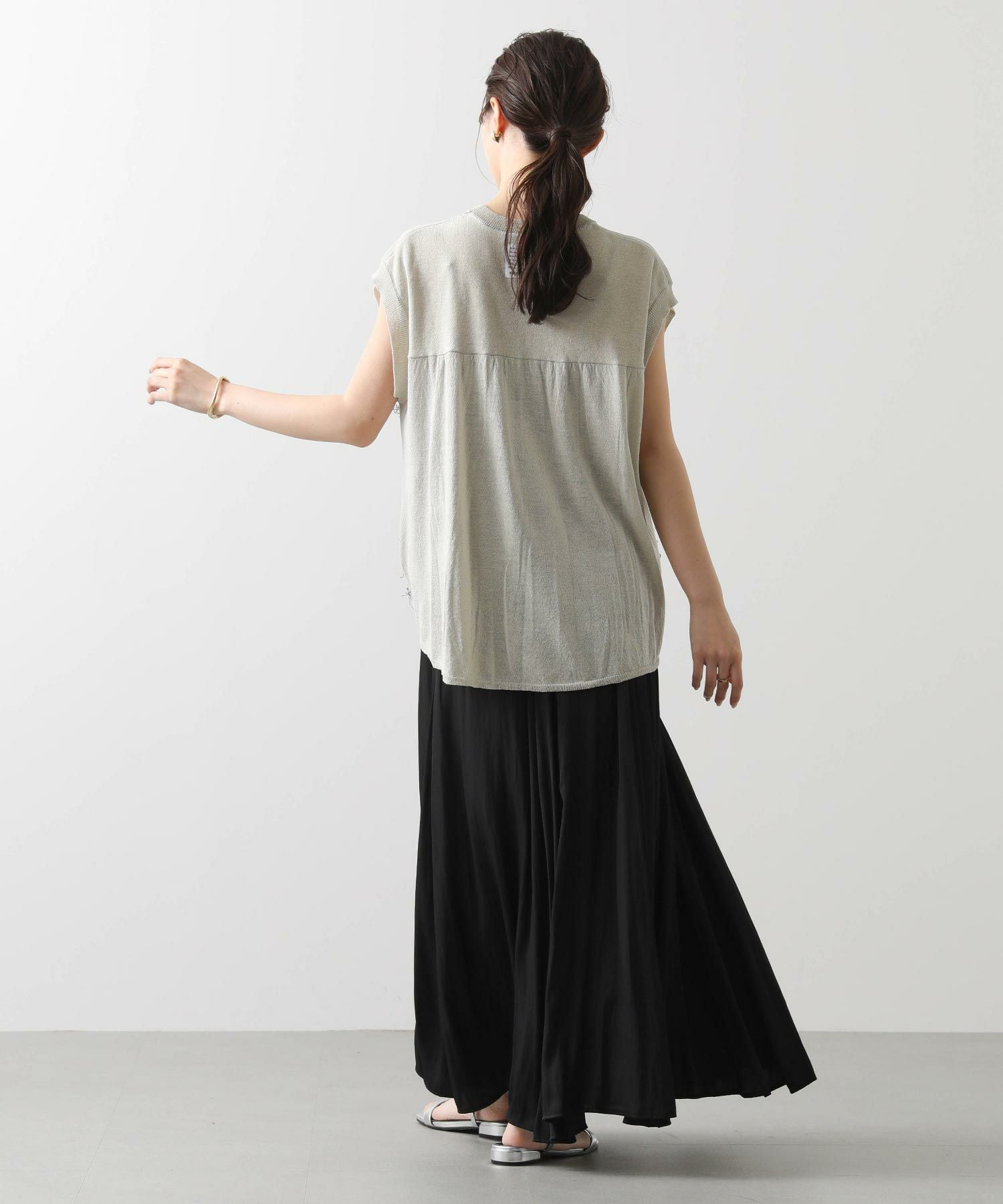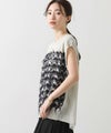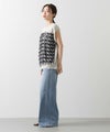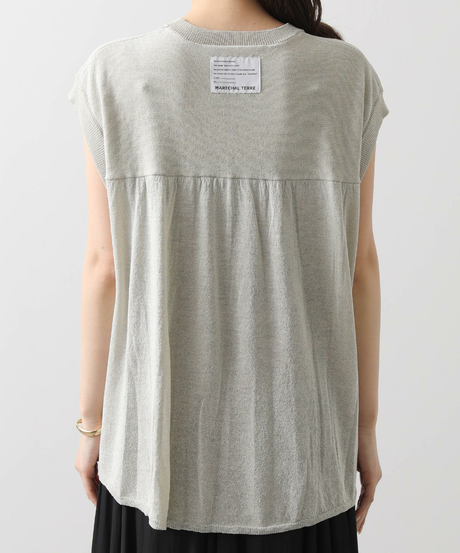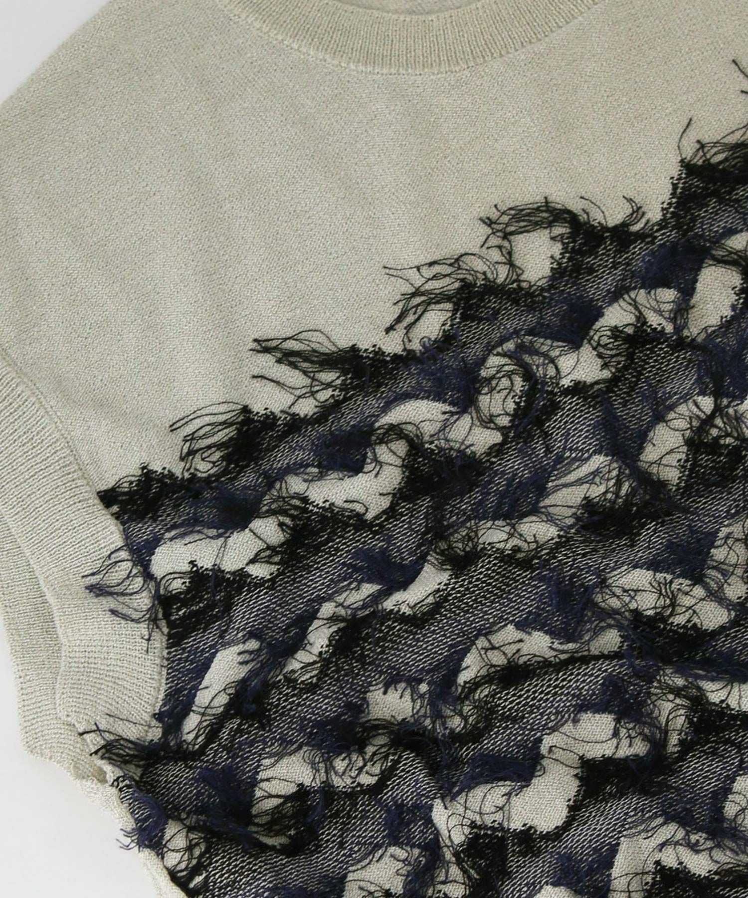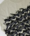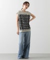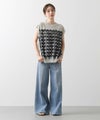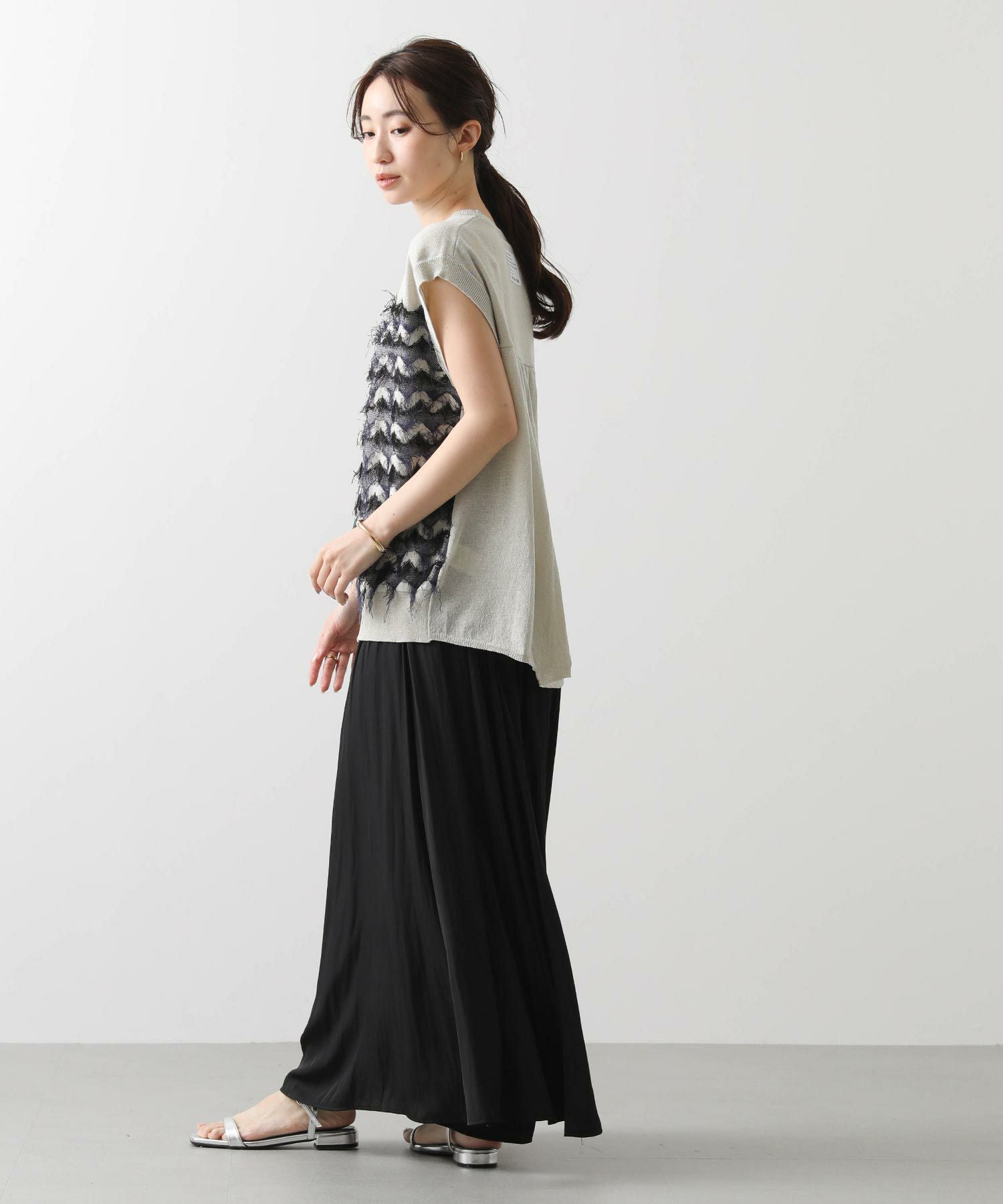 前身頃はジグザグのジャガード編みに。上下2配色仕様で、それぞれ端始末を糸フリンジにしています。後身頃は同色を甘く天竺編みにして、シアー感のあるデザインにギャザーを入れ、裾に向けてフレアが広がるAラインシルエットに仕上げました。抜け感を作り出すゆとりのあるサイジングながら、強撚糸のため甘めに編んでもダラっとせずに、しっかりした編地に仕上がっています。シャリっとしたドライ感が涼し気で、夏にピッタリなニットです。