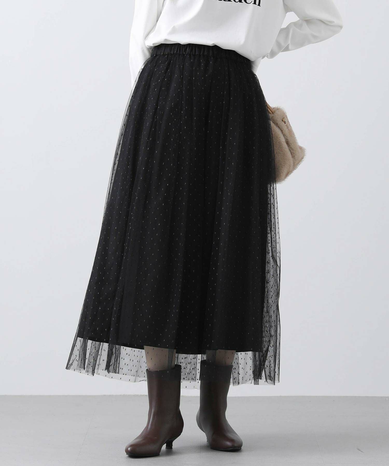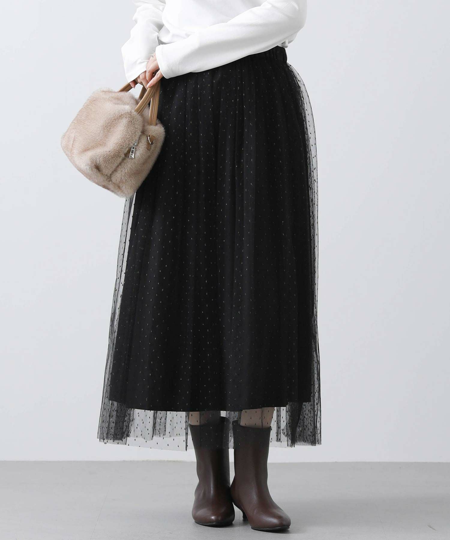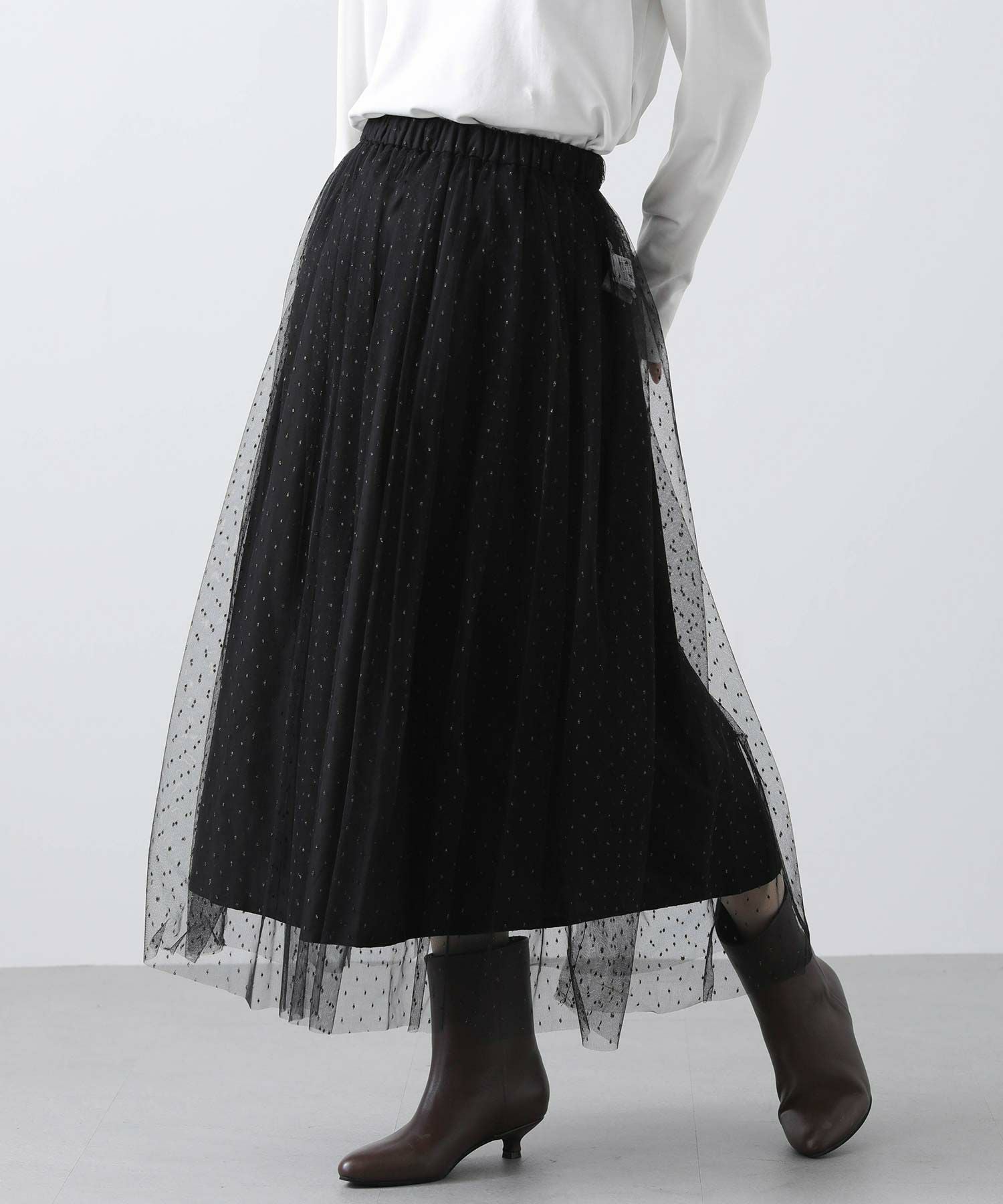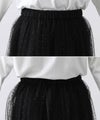チュールにラメ糸のドット刺繍を施したスカート。