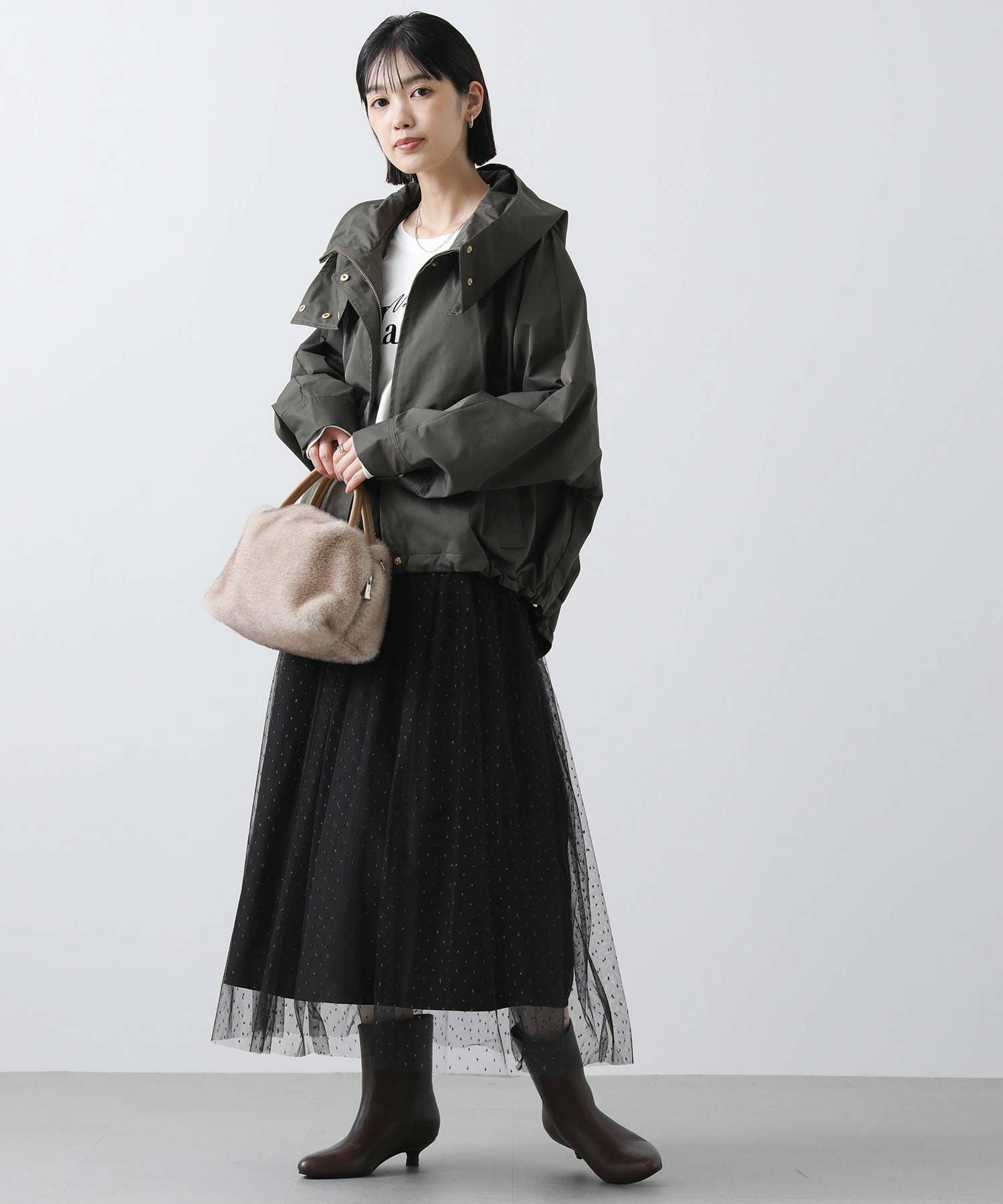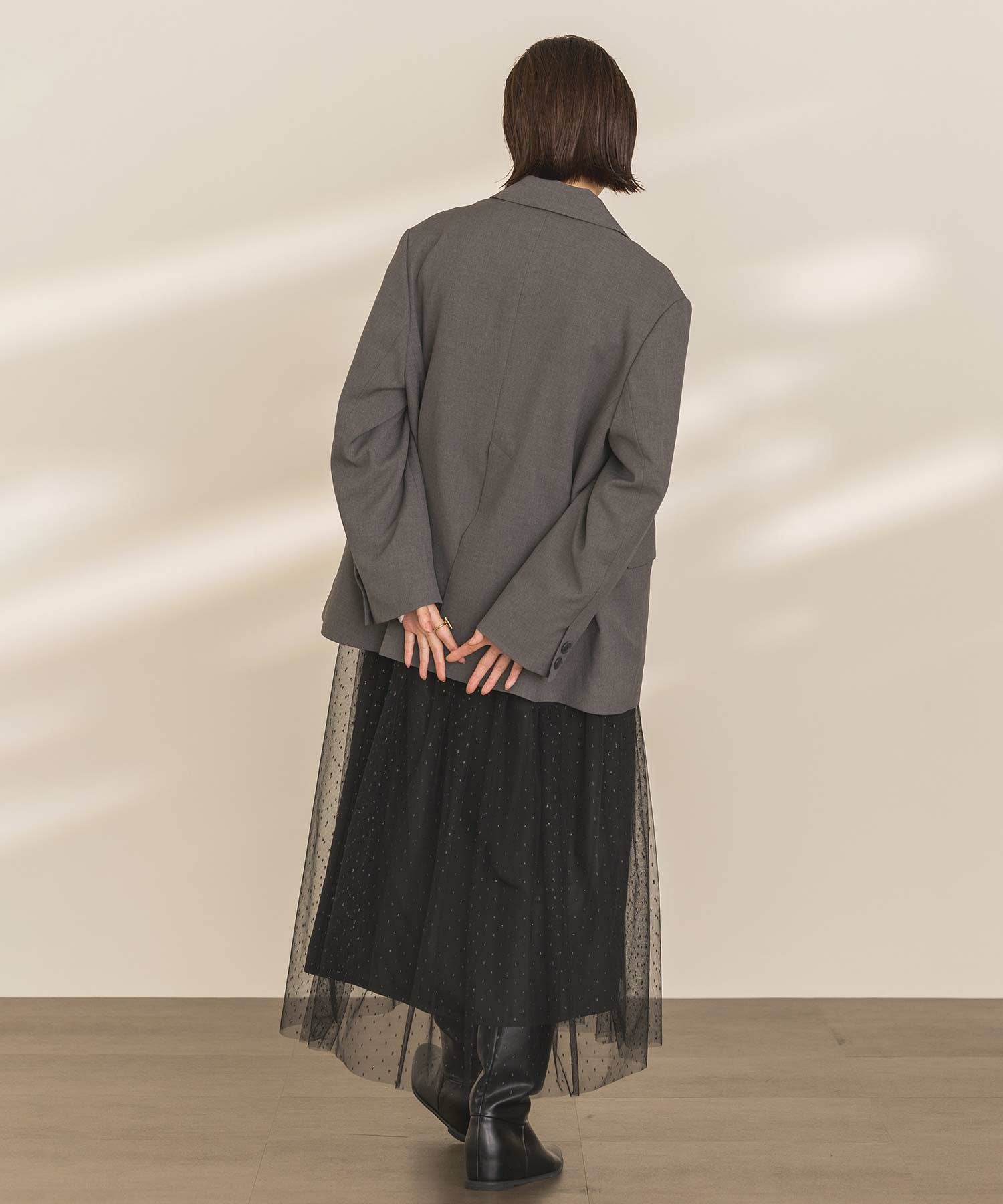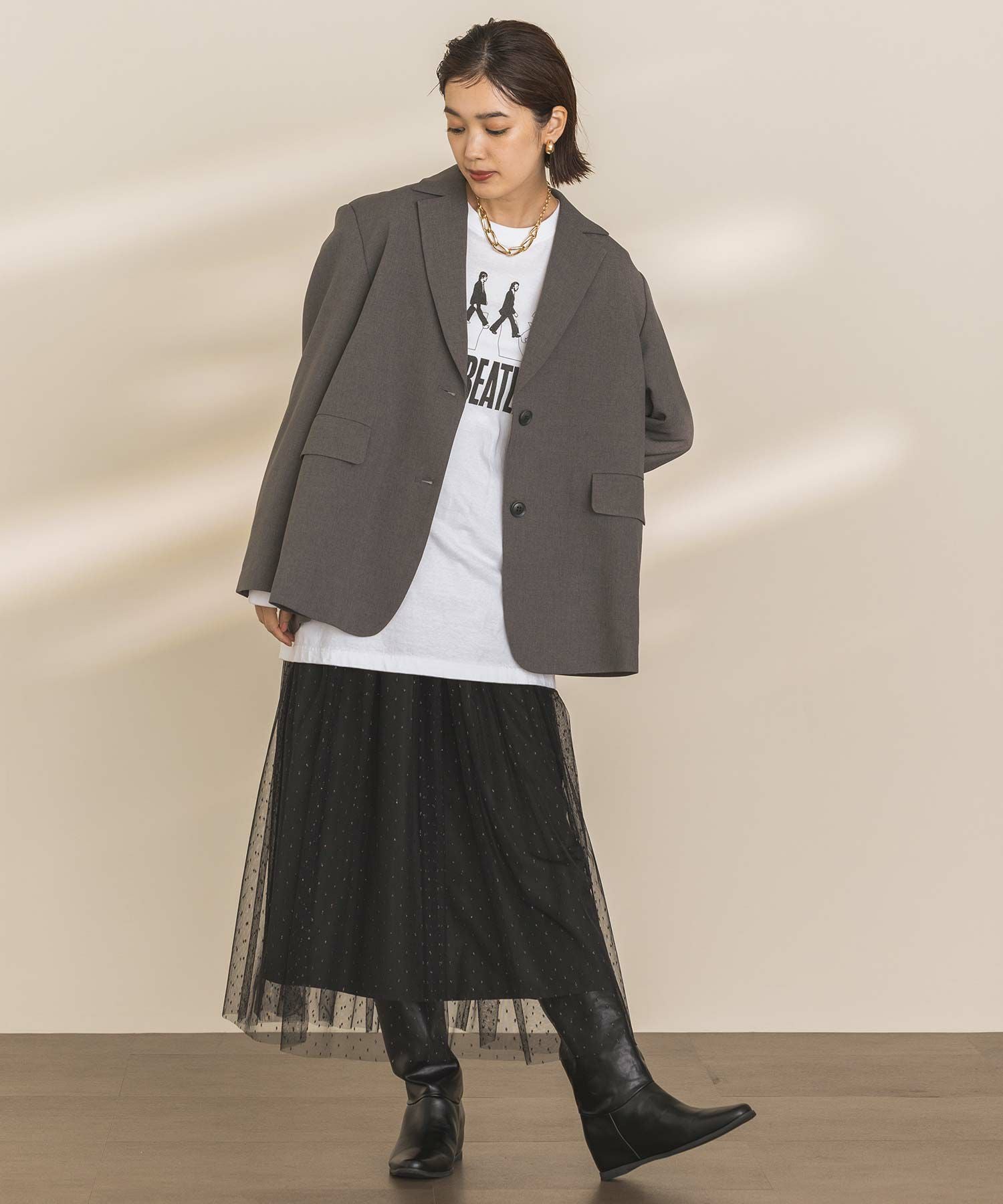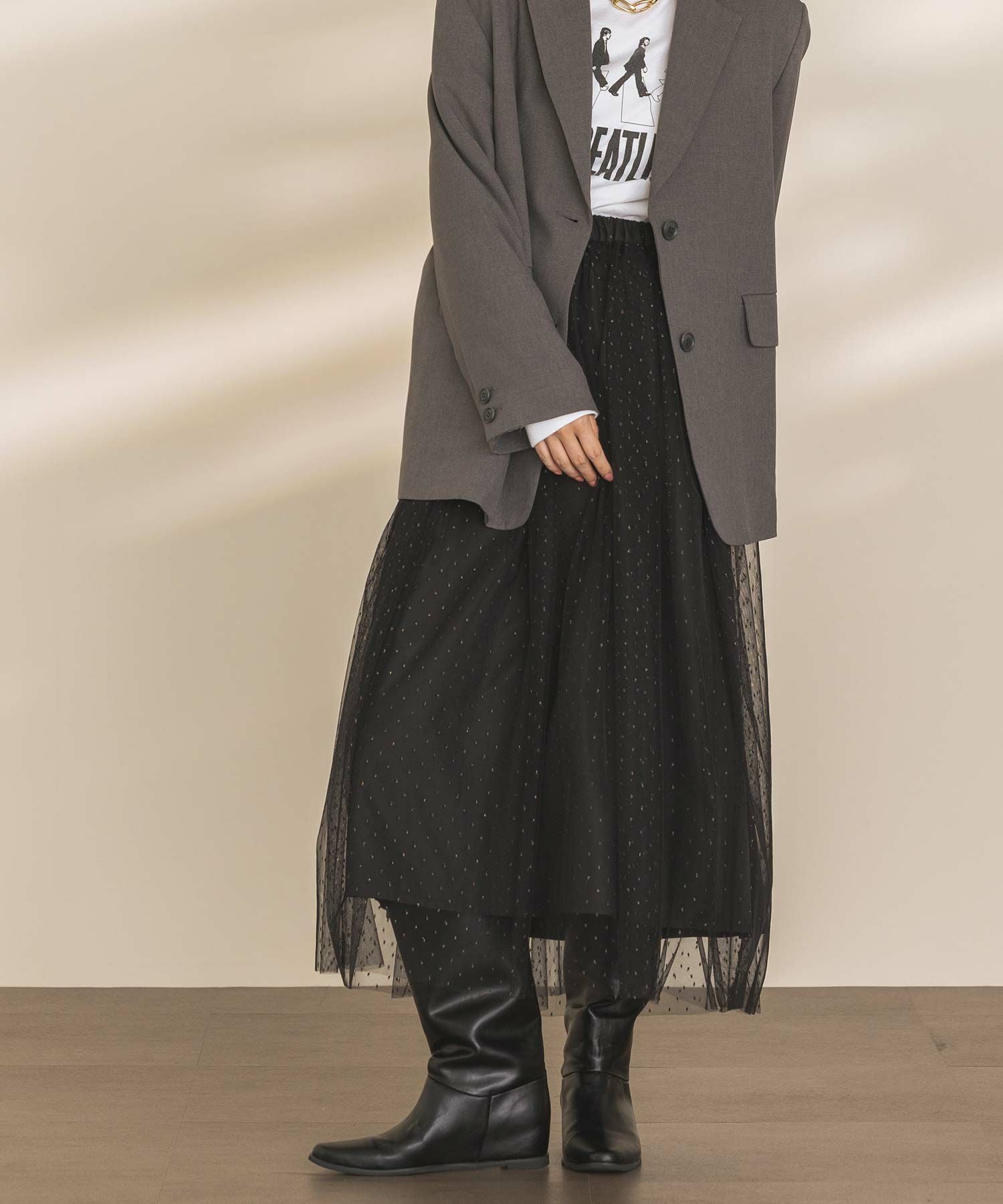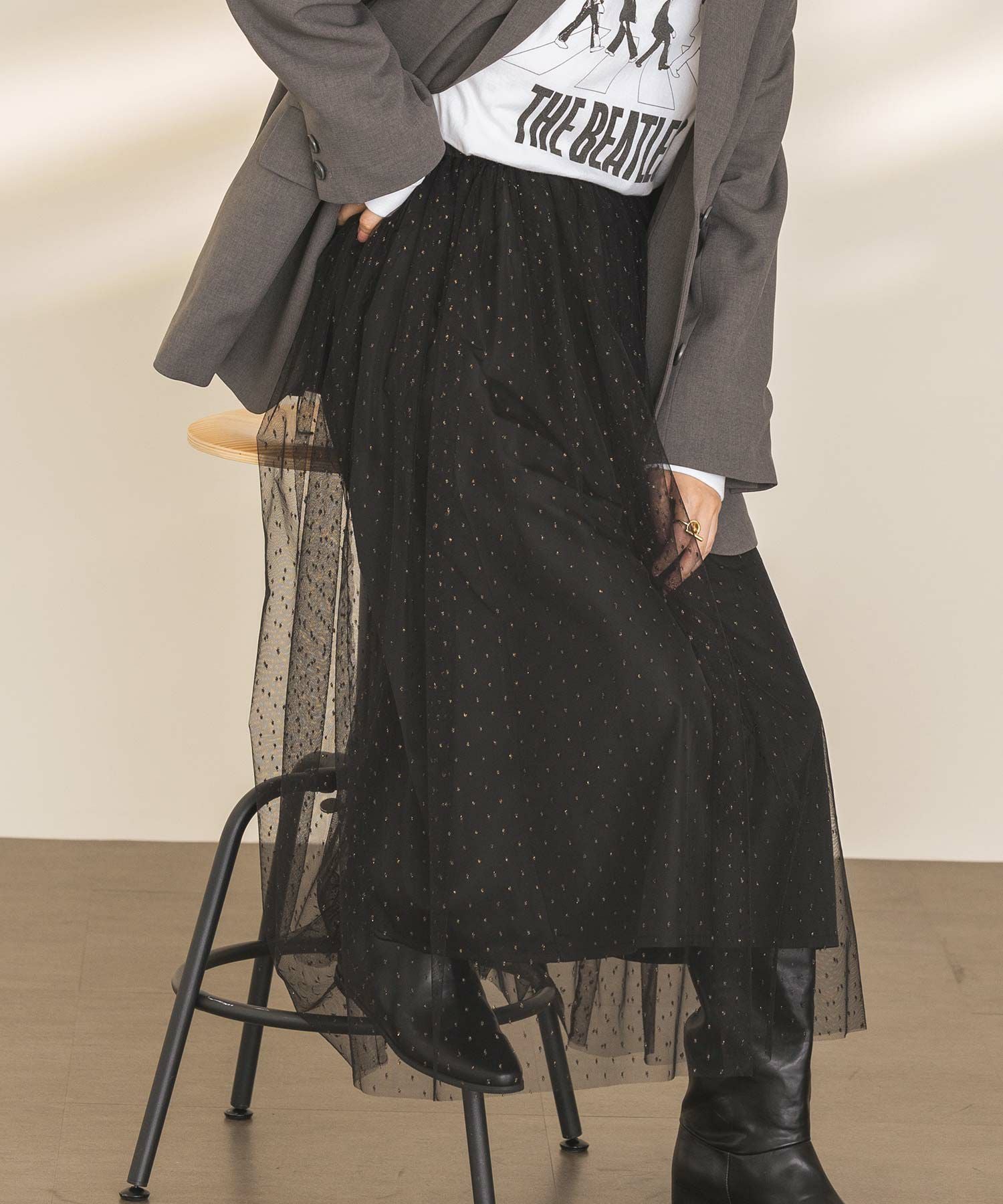 キラキラとチュールのエアリーなシアー感がコーディネートのポイントになってくれる一枚。